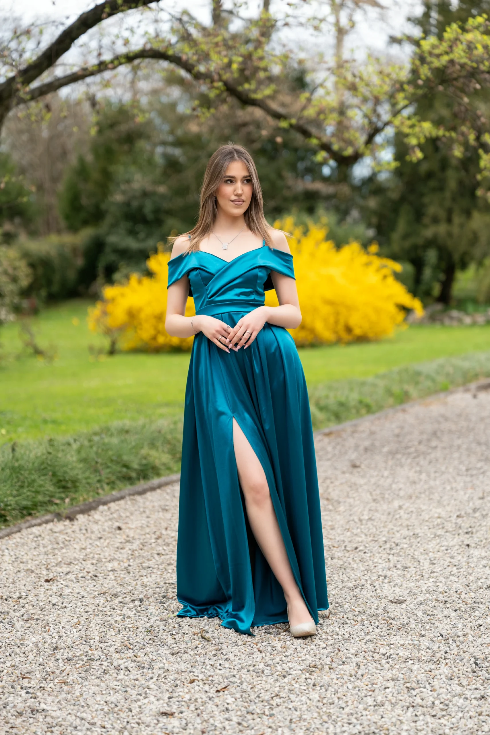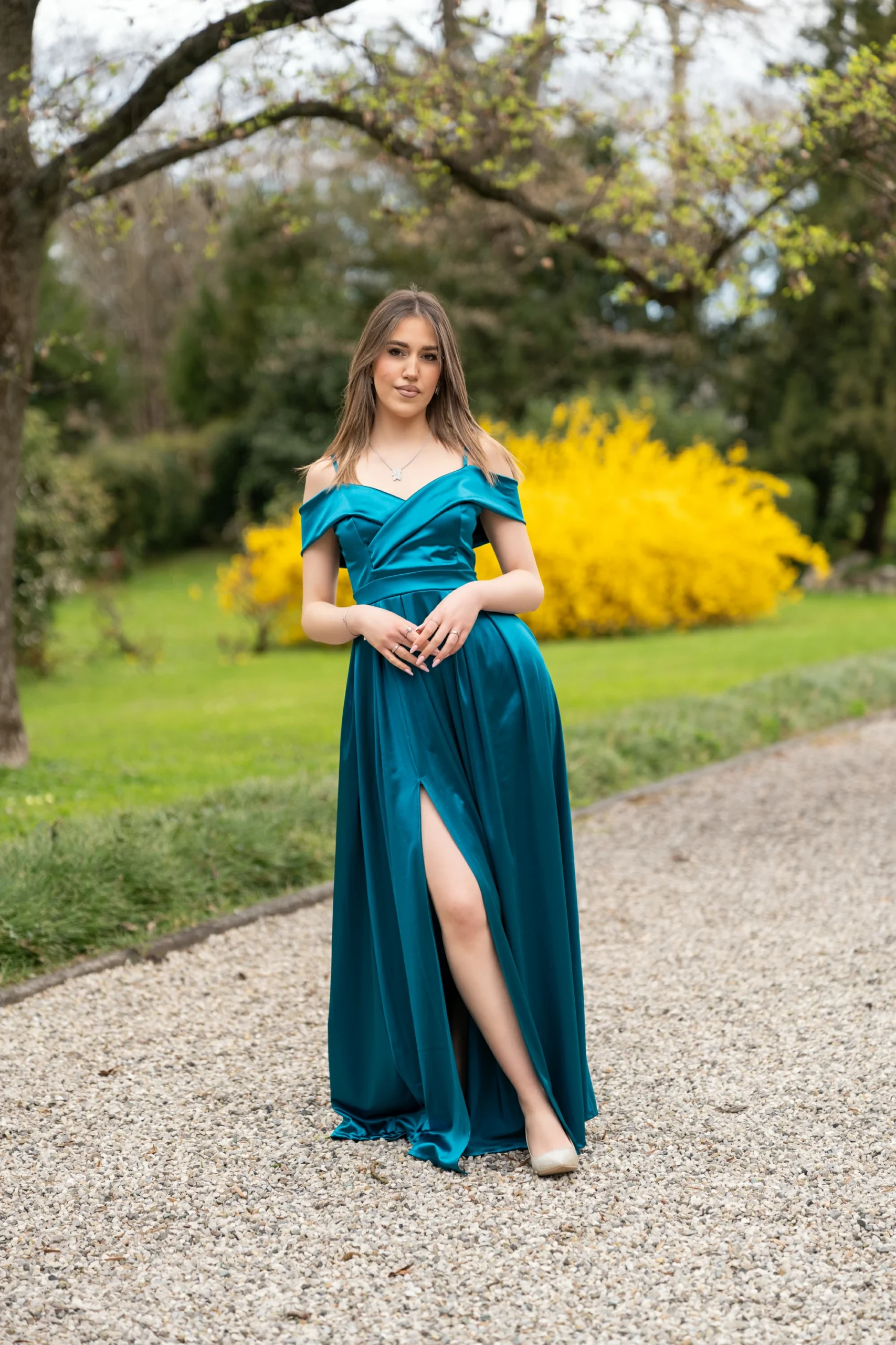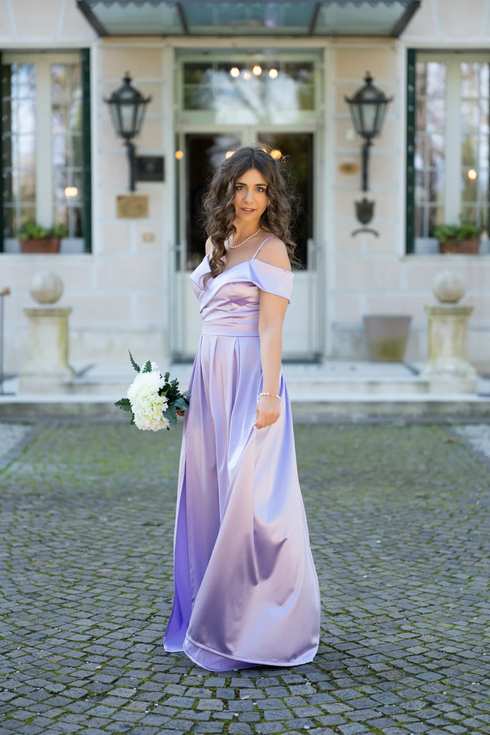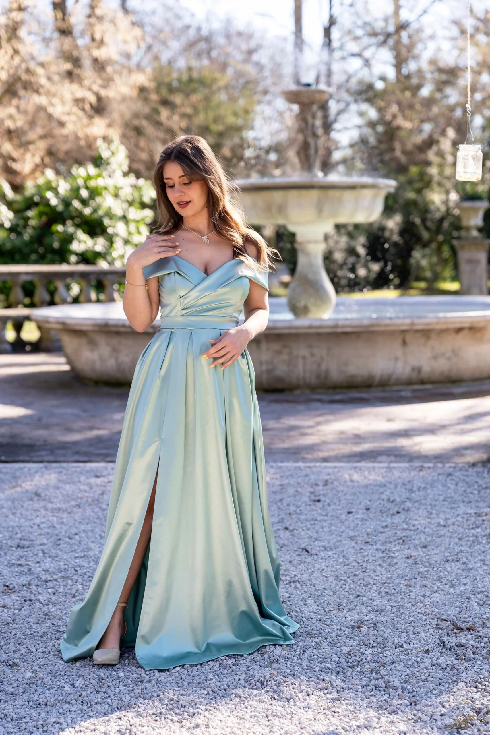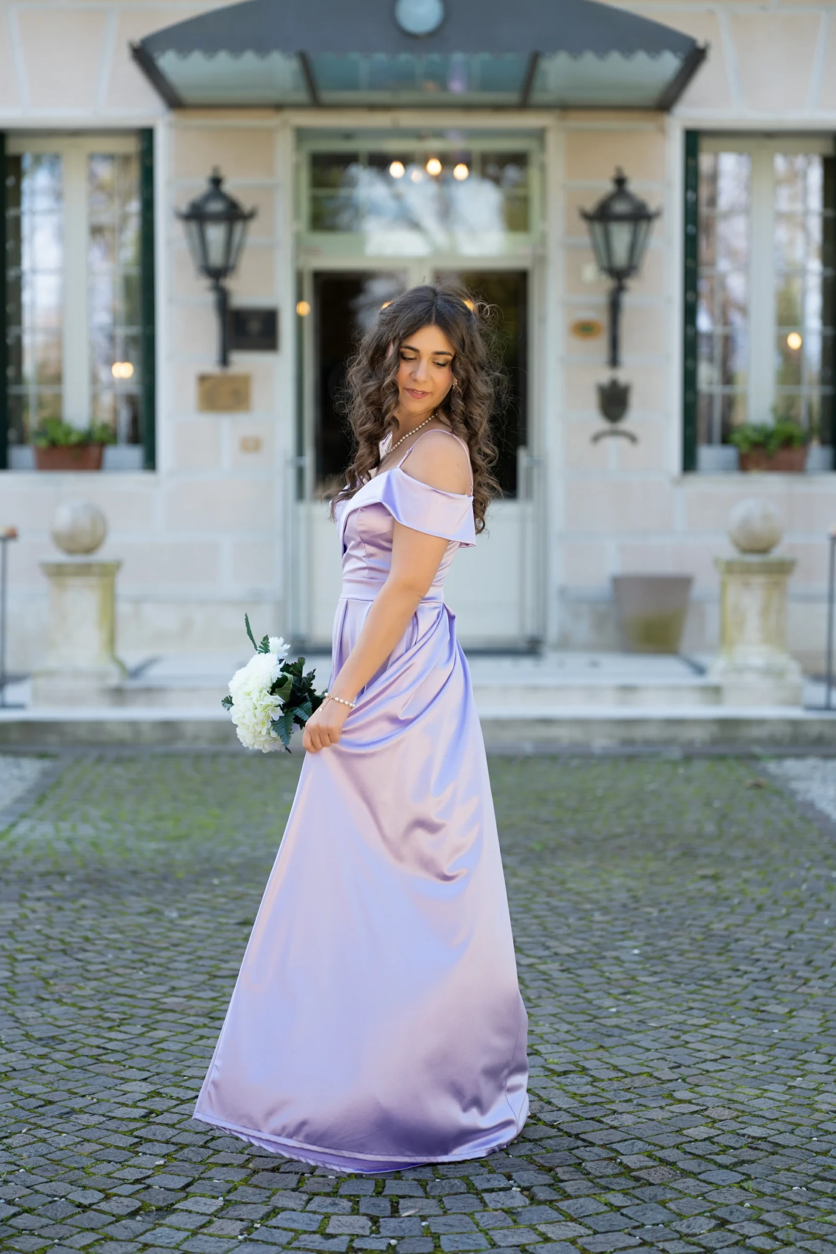 Descrizione: Abito da cerimonia con ampia e svolazzante gonna in raso