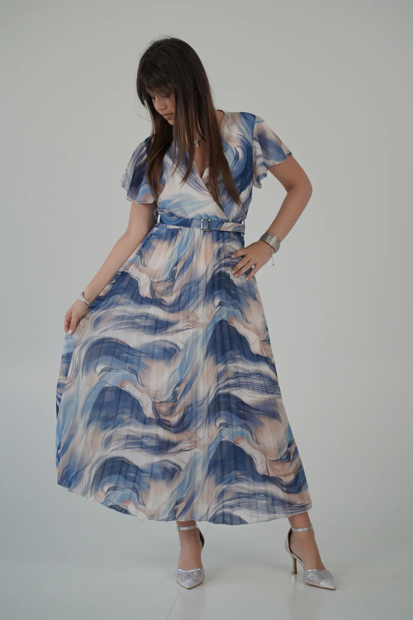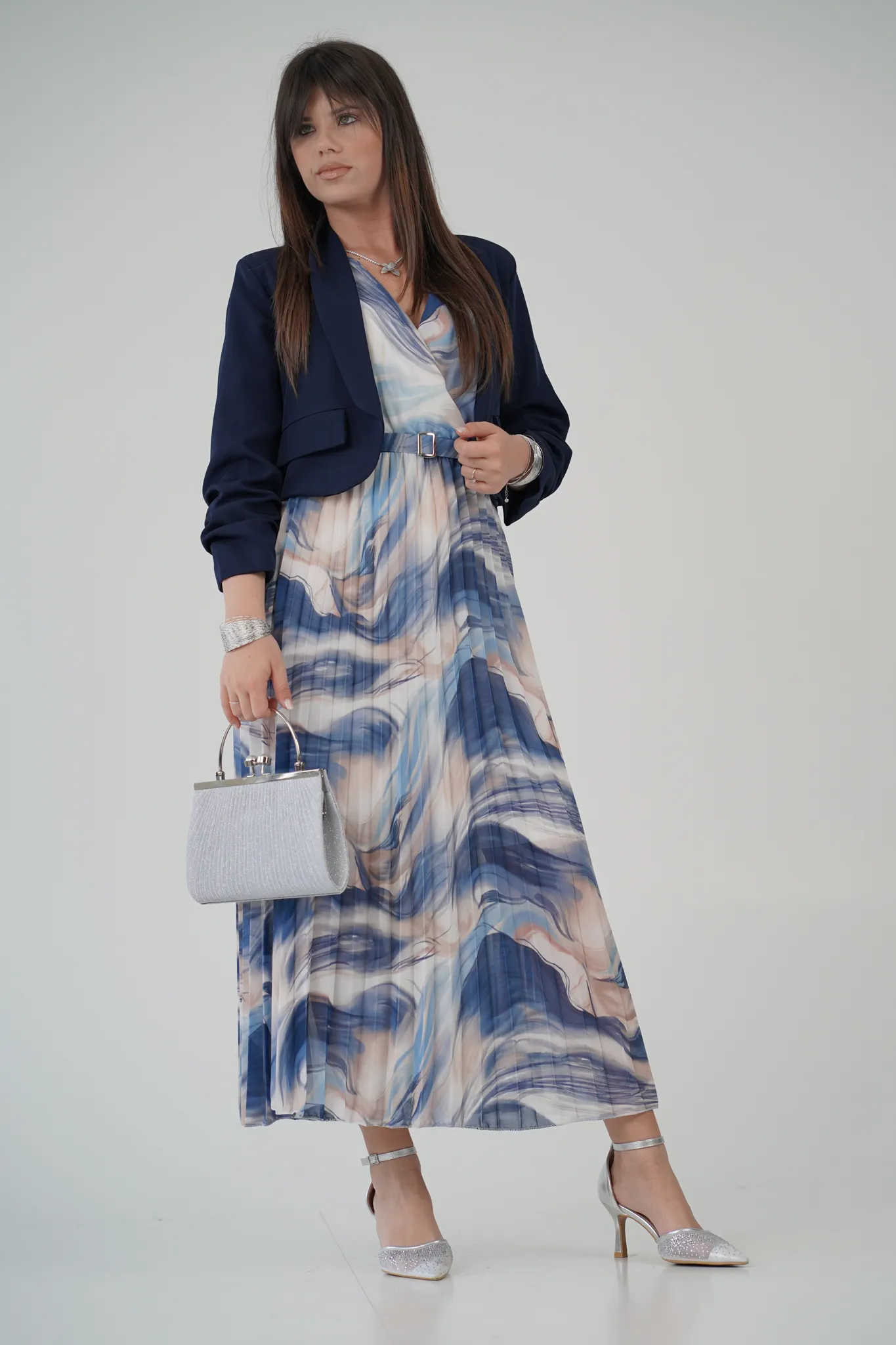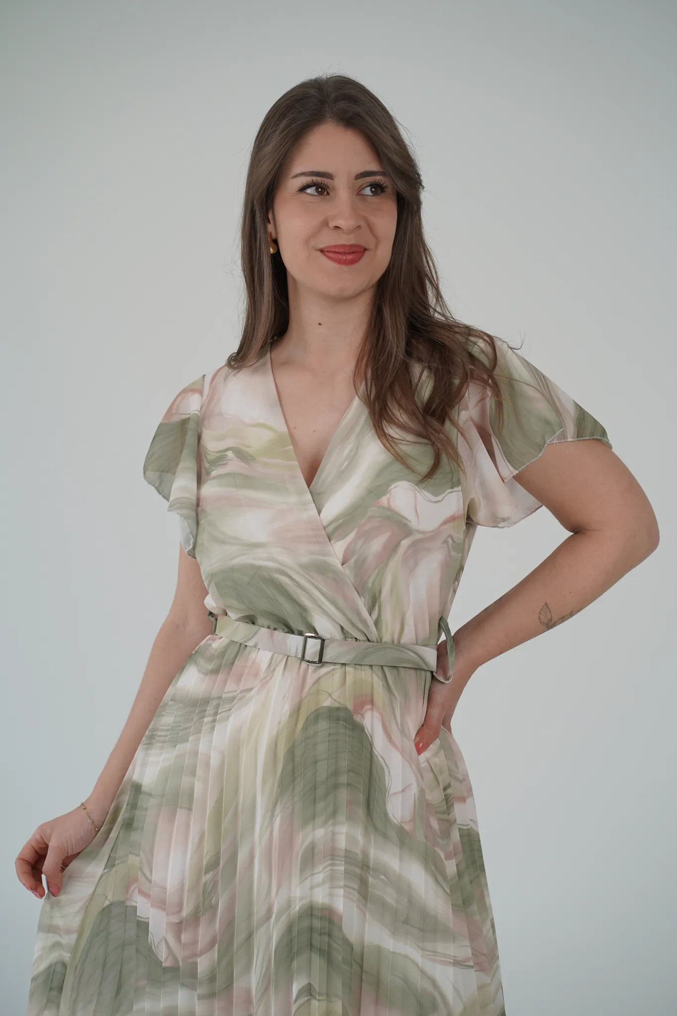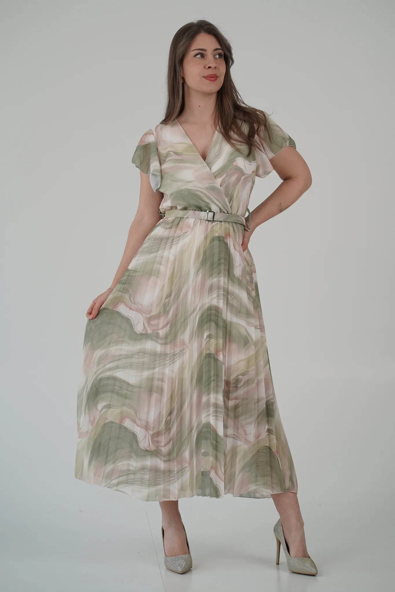 Descrizione: Questo abito lungo con gonna plissettata conquista con il suo movimento leggero e la silhouette armoniosa. Lo scollo a V valorizza il décolleté, mentre le maniche corte lo rendono perfetto per ogni occasione. Il cinturino tono su tono definisce delicatamente il punto vita per un look equilibrato e super femminile.