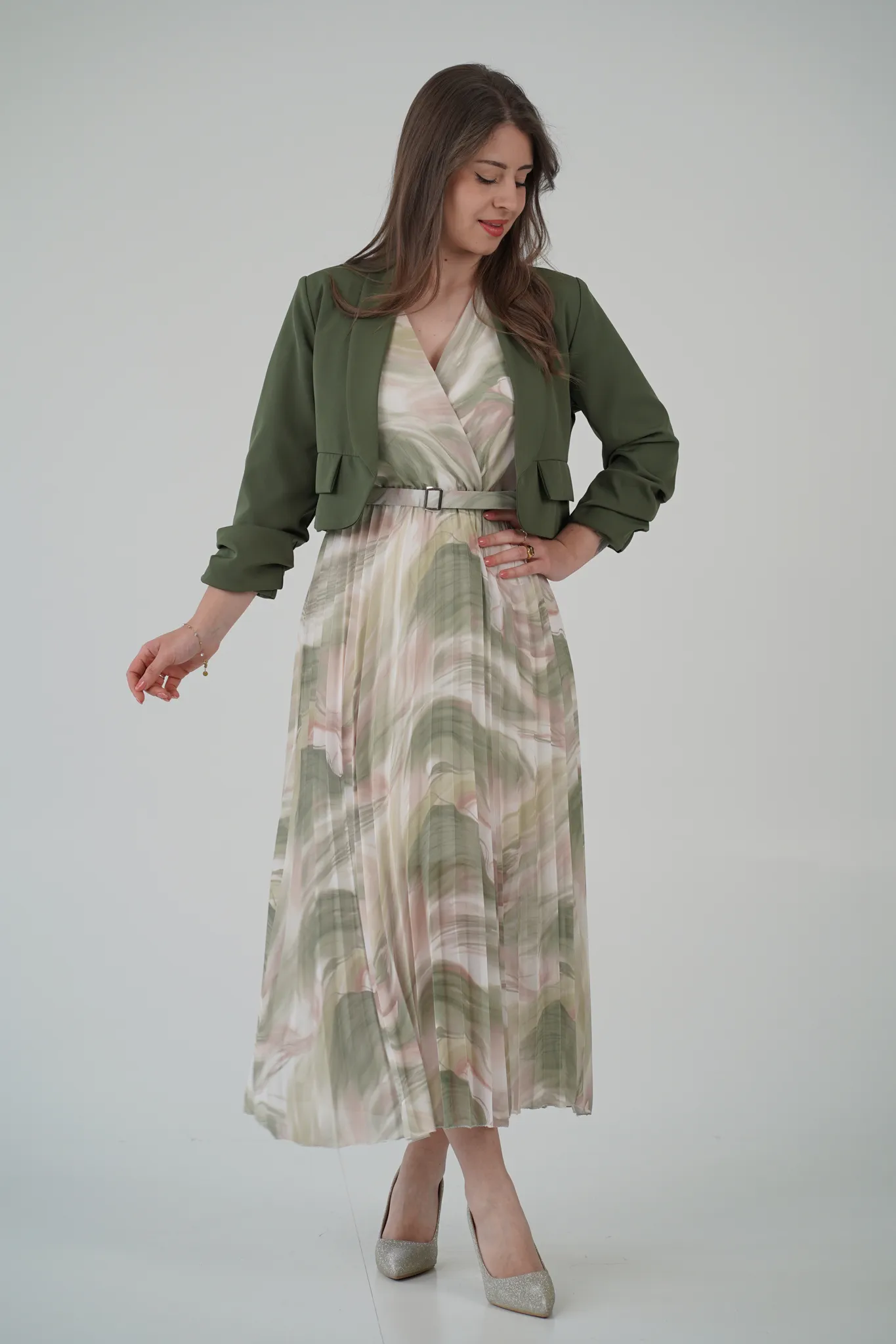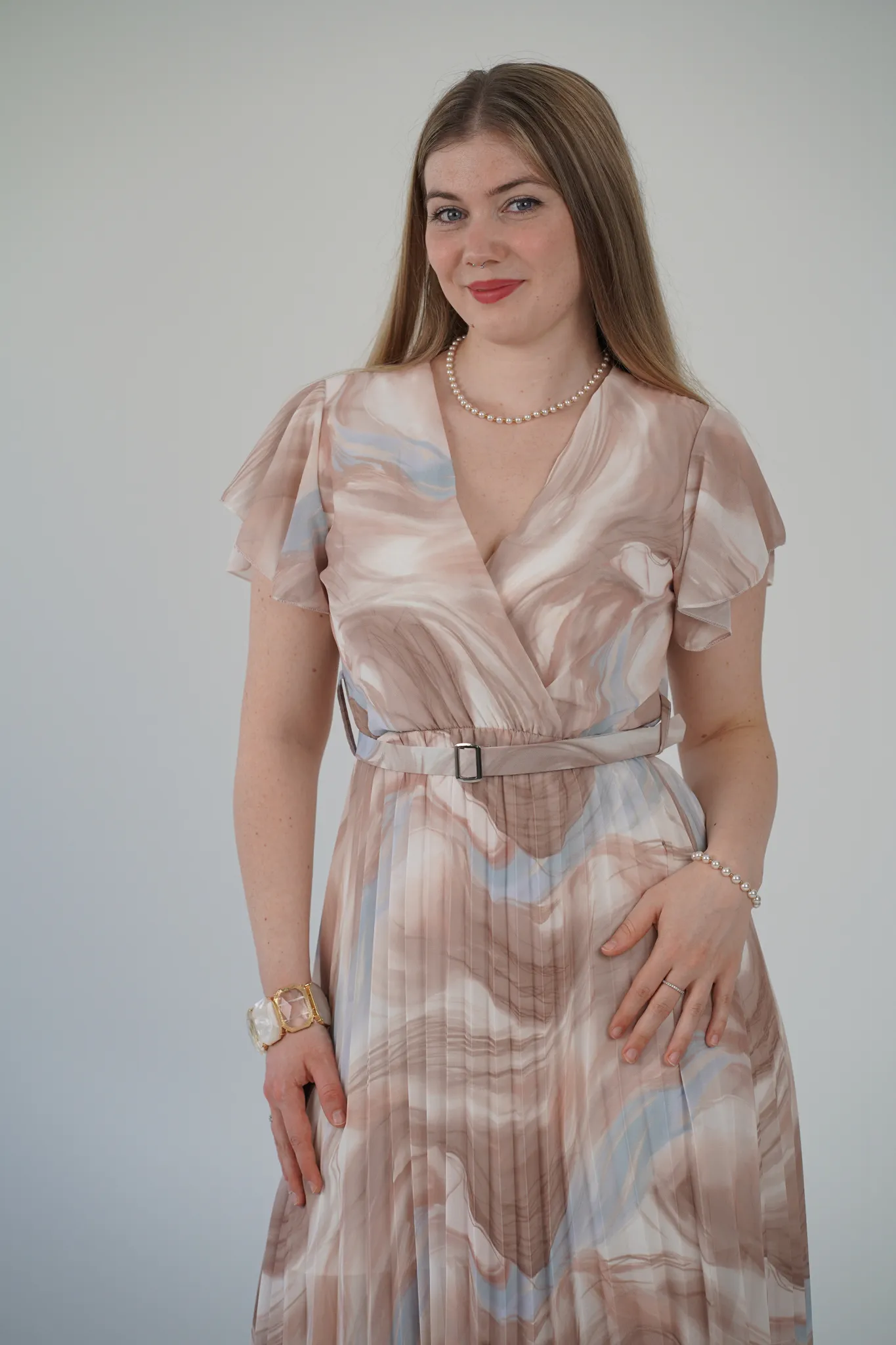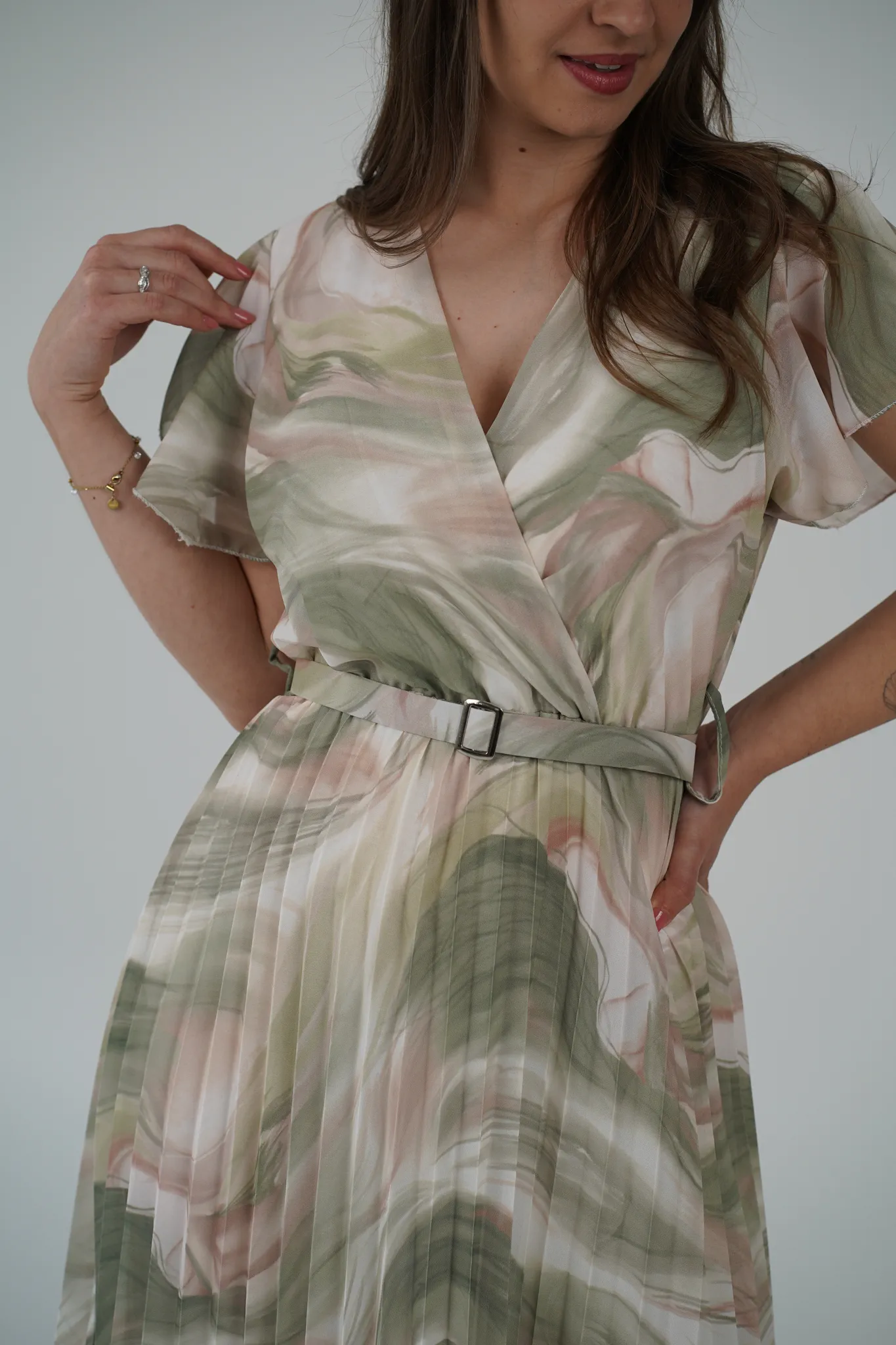 Descrizione: Questo abito lungo con gonna plissettata conquista con il suo movimento leggero e la silhouette armoniosa. Lo scollo a V valorizza il décolleté, mentre le maniche corte lo rendono perfetto per ogni occasione. Il cinturino tono su tono definisce delicatamente il punto vita per un look equilibrato e super femminile.
