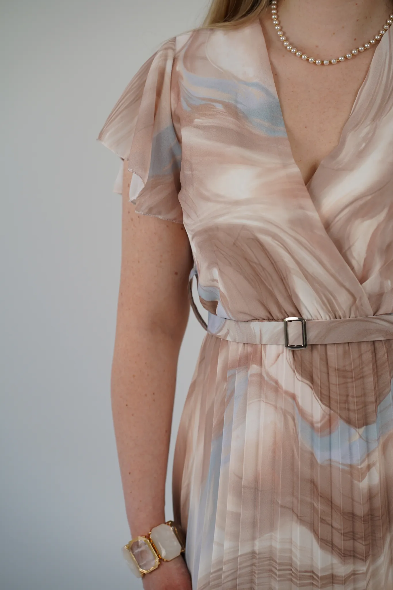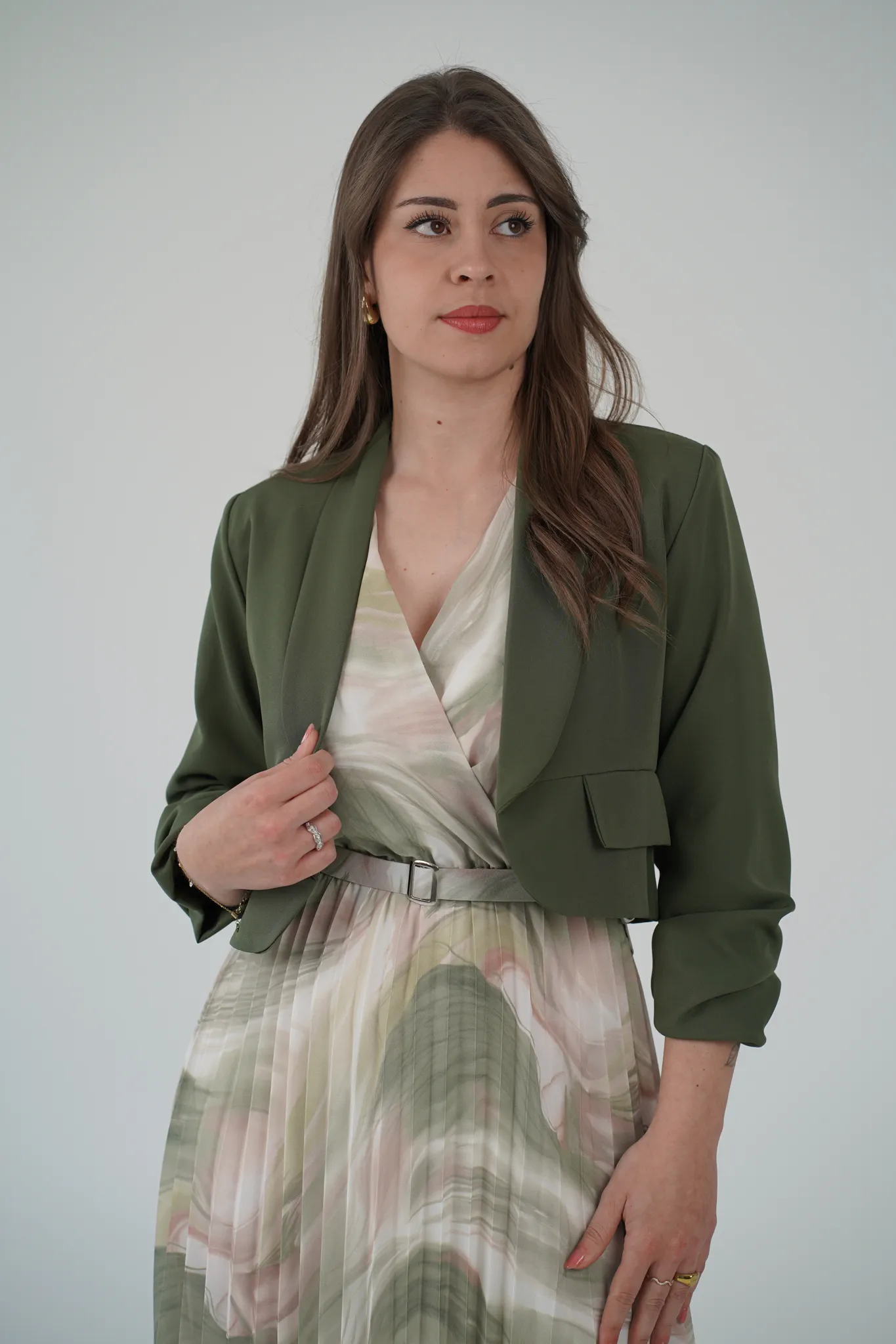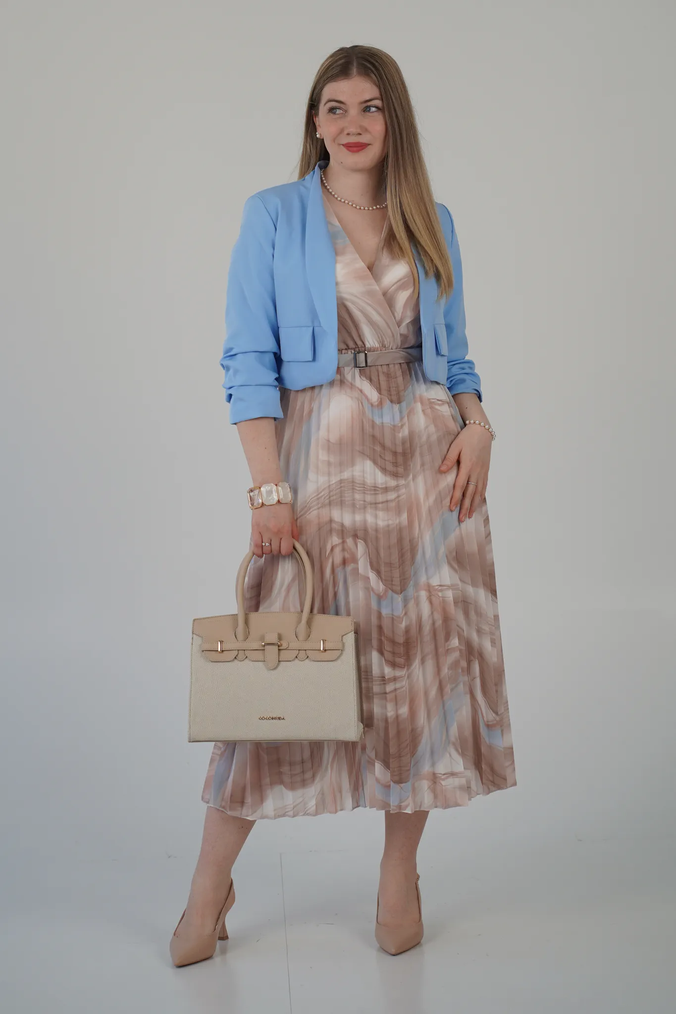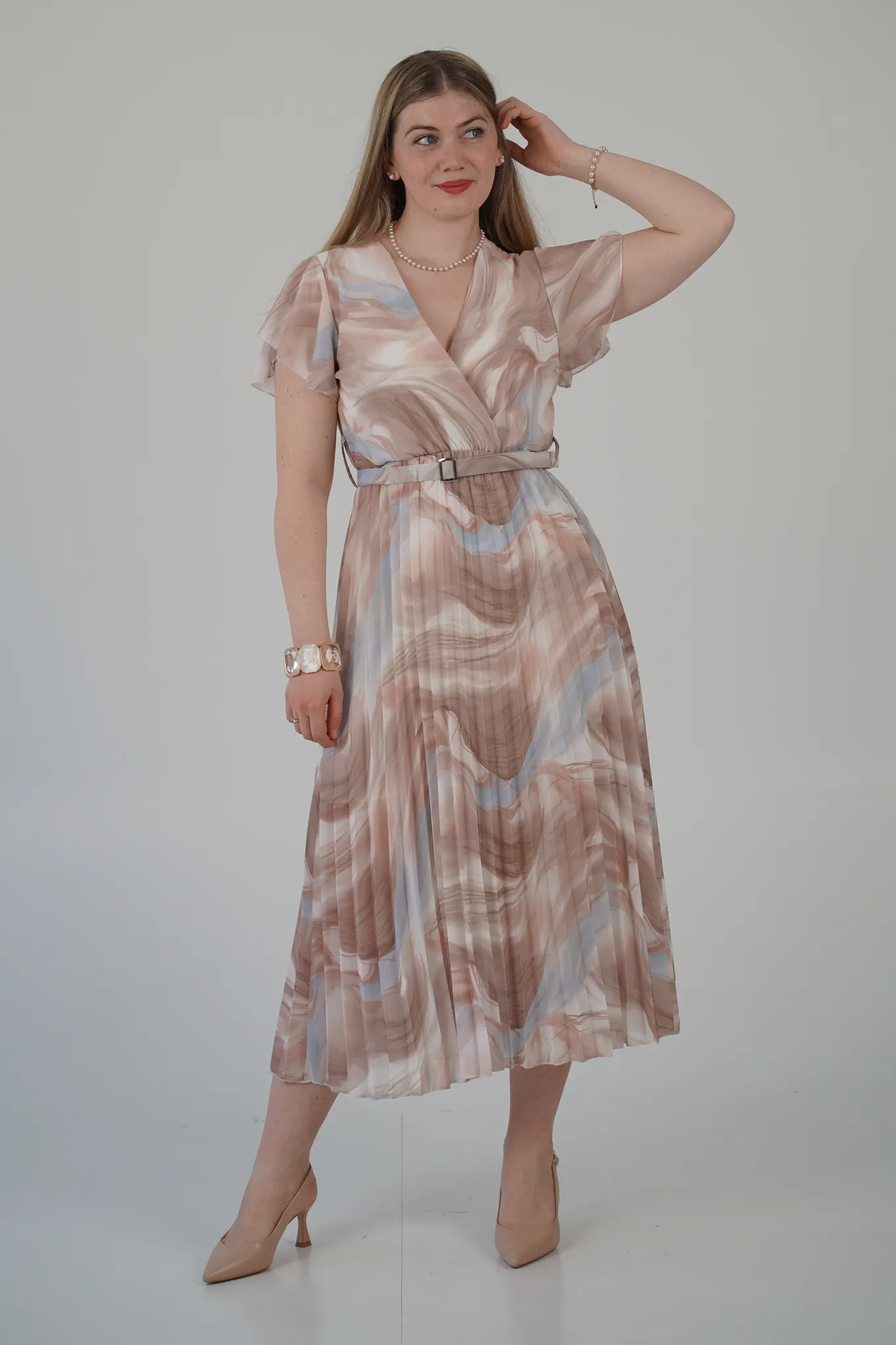Descrizione: Questo abito lungo con gonna plissettata conquista con il suo movimento leggero e la silhouette armoniosa. Lo scollo a V valorizza il décolleté, mentre le maniche corte lo rendono perfetto per ogni occasione. Il cinturino tono su tono definisce delicatamente il punto vita per un look equilibrato e super femminile.