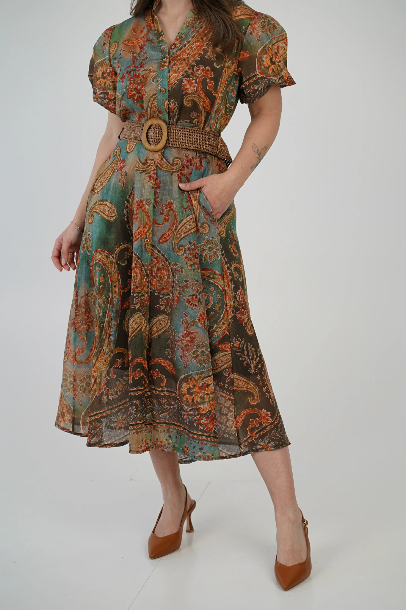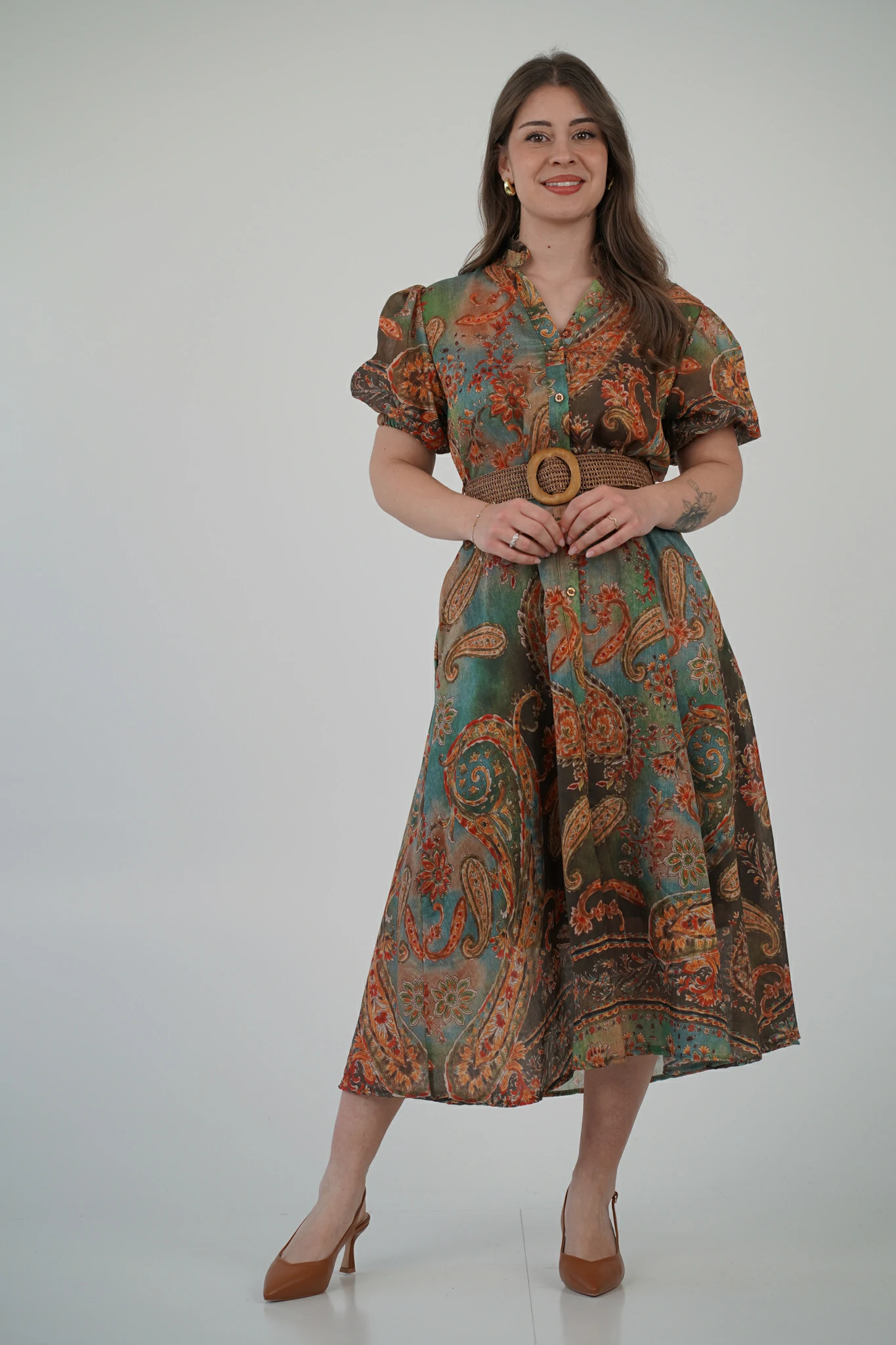 La linea è morbida e fluida, pensata per accompagnare i movimenti con leggerezza, mentre le maniche donano un tocco romantico e attuale. Il punto vita è enfatizzato dalla cintura con fibbia effetto naturale, che definisce le forme senza costringere, rendendolo comodo ma incredibilmente femminile. La lunghezza midi completa il look con equilibrio, perfetta per chi vuole sentirsi curata in ogni momento della giornata.