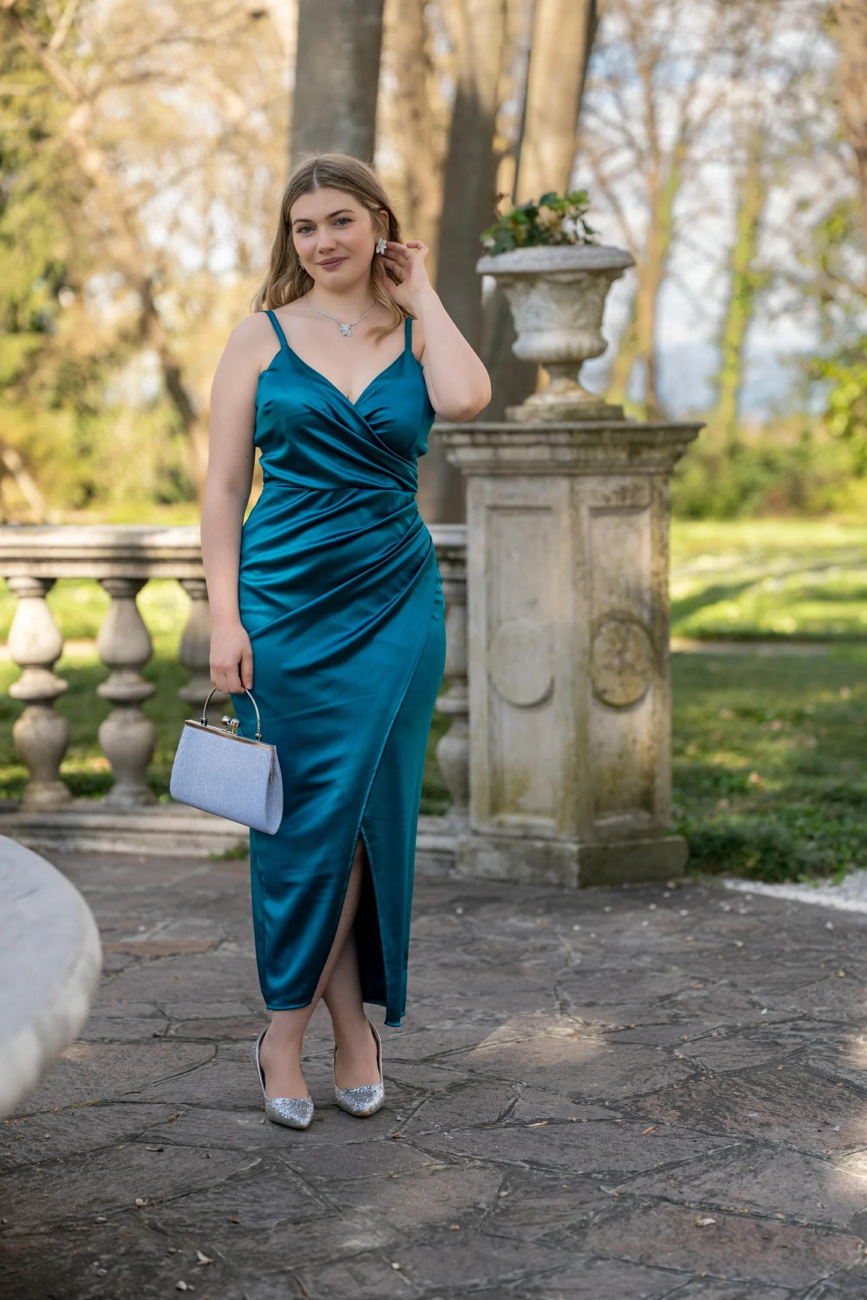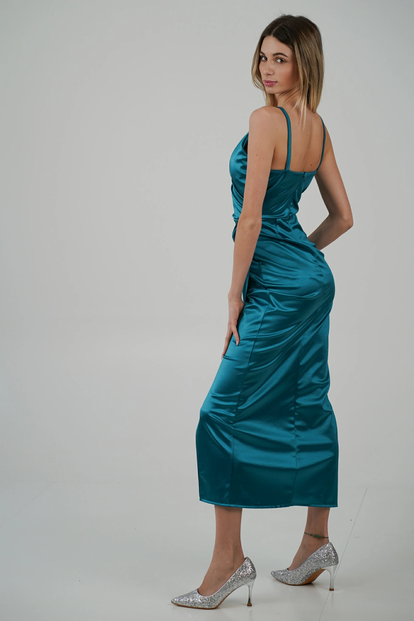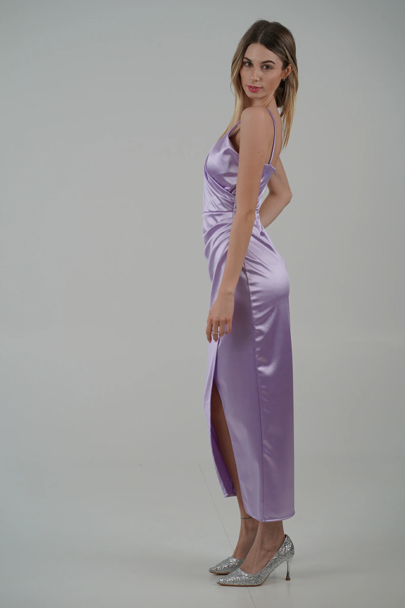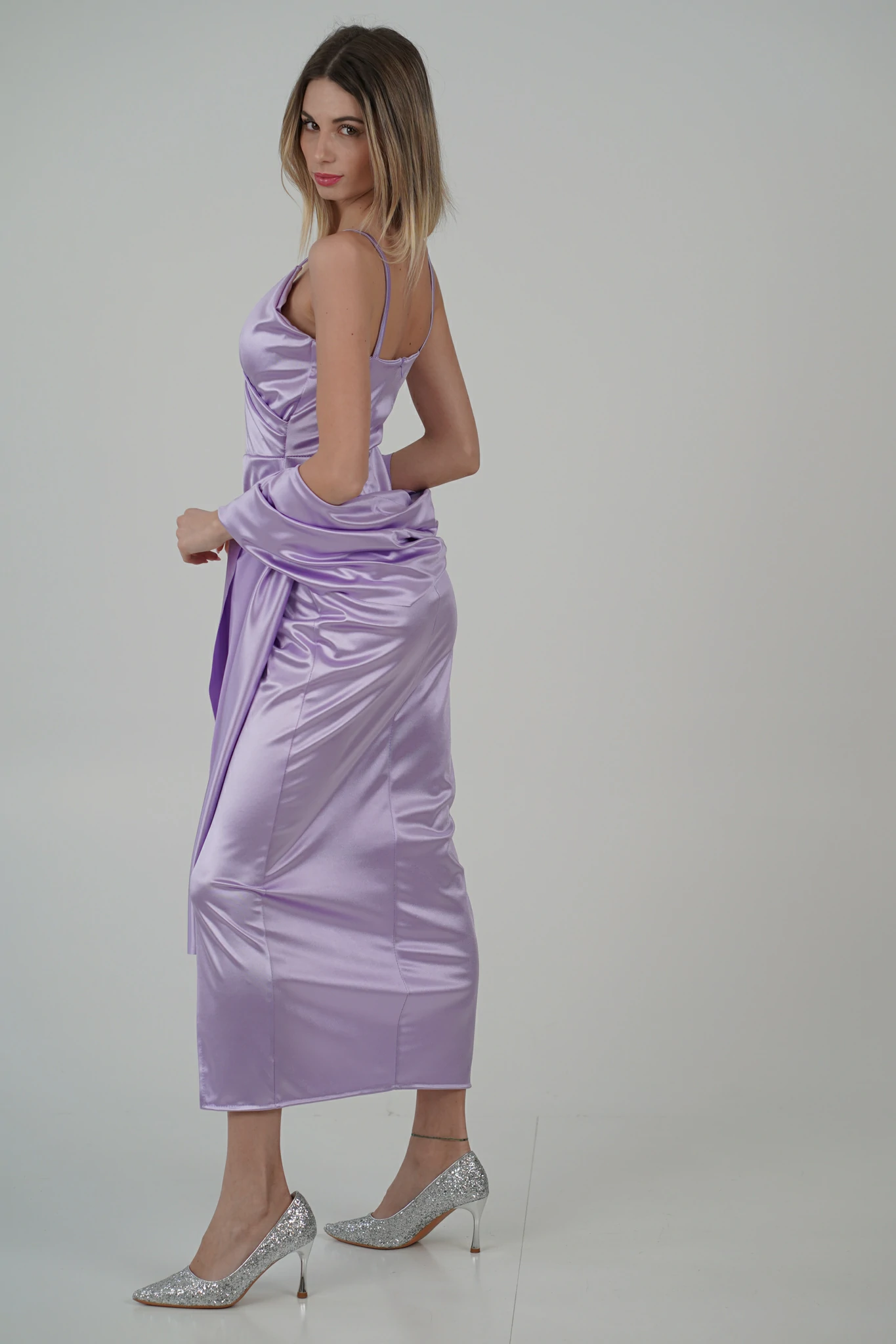 Questo abito segue le linee naturali del corpo, mettendo in evidenza la figura. La gonna a portafoglio arricciata sul fianco crea una silhouette che enfatizza le curve in modo delicato e naturale. L’arricciatura sul fianco può anche nascondere piccole imperfezioni, creando una linea più fluida e bilanciata