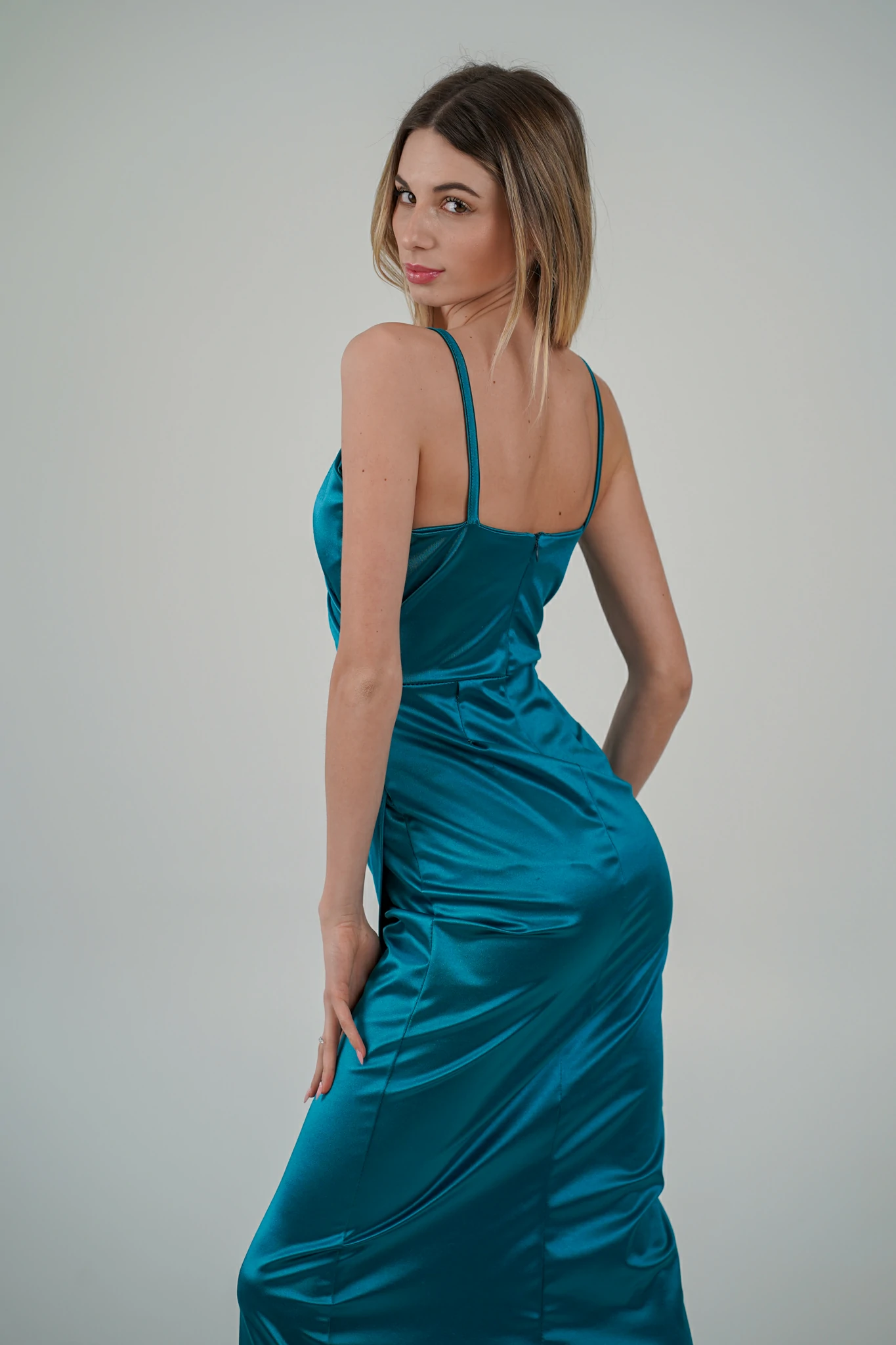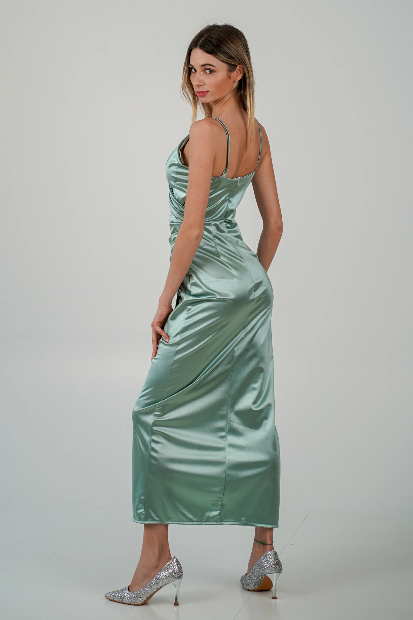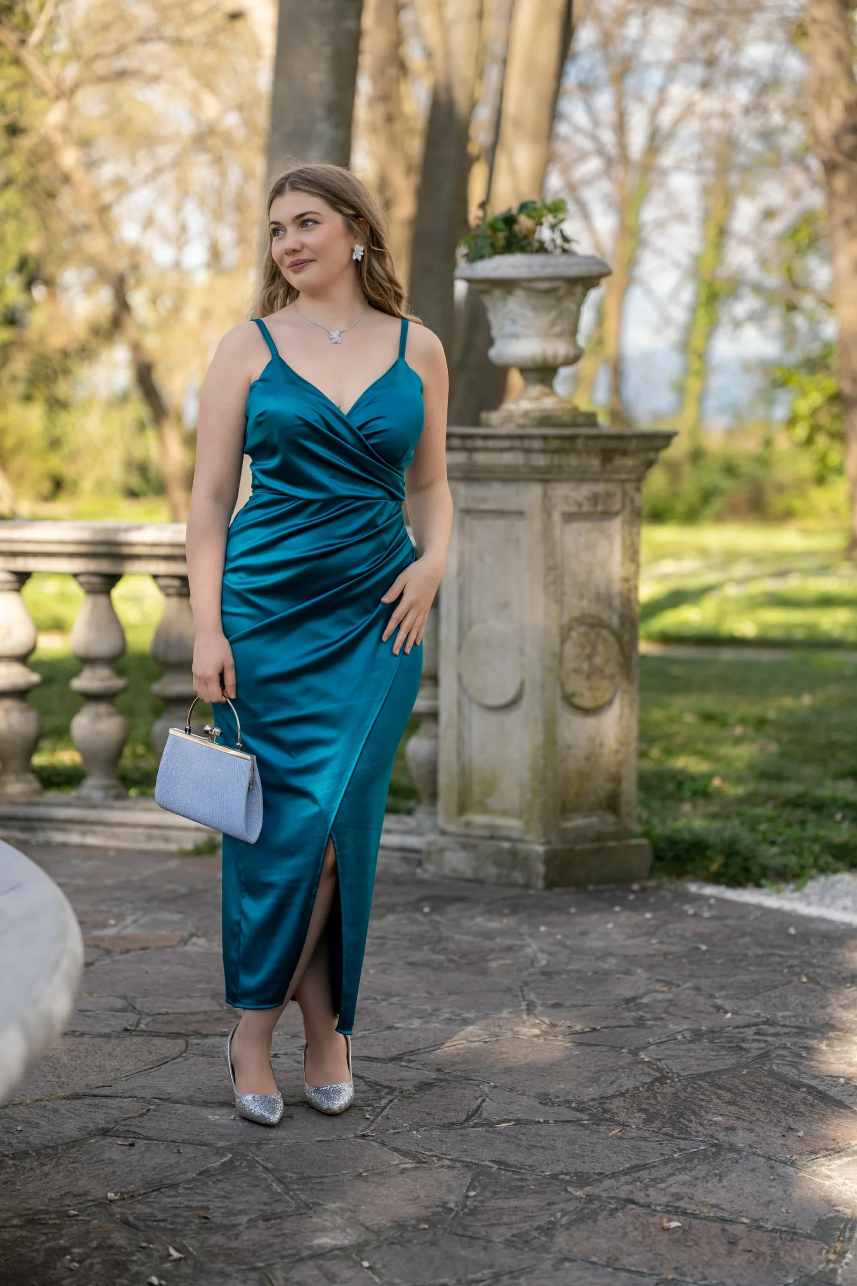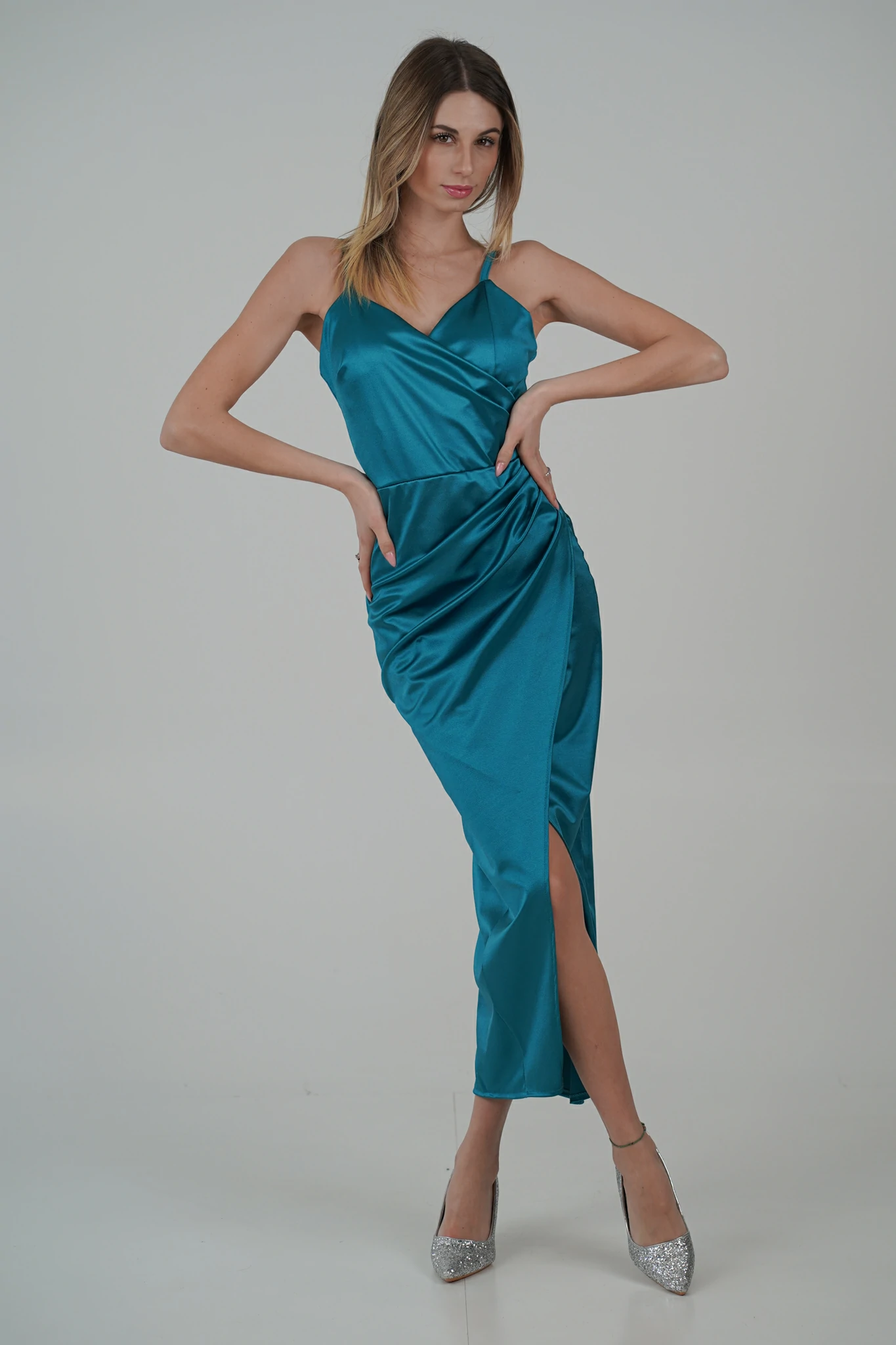 Questo abito segue le linee naturali del corpo, mettendo in evidenza la figura. La gonna a portafoglio arricciata sul fianco crea una silhouette che enfatizza le curve in modo delicato e naturale. L’arricciatura sul fianco può anche nascondere piccole imperfezioni, creando una linea più fluida e bilanciata