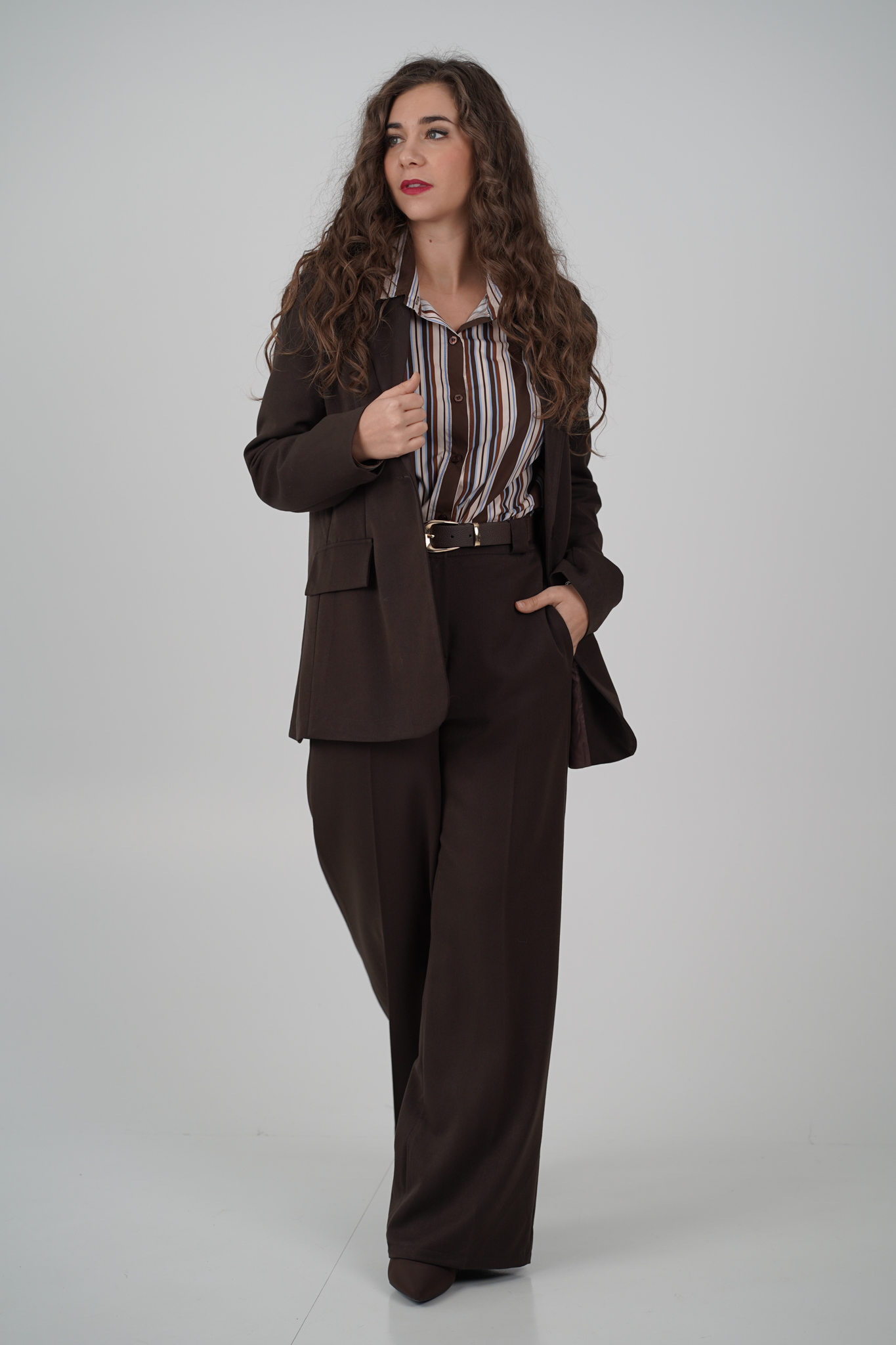 • Il disegno a righe verticali dai colori neutri valorizza la silhouette, regalando una linea più slanciata e armoniosa