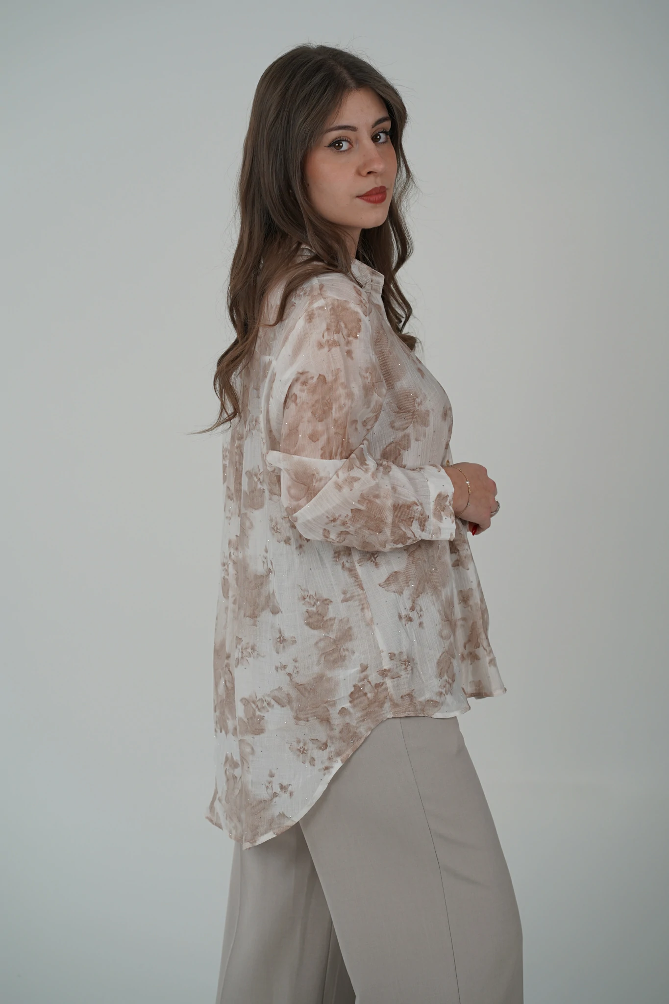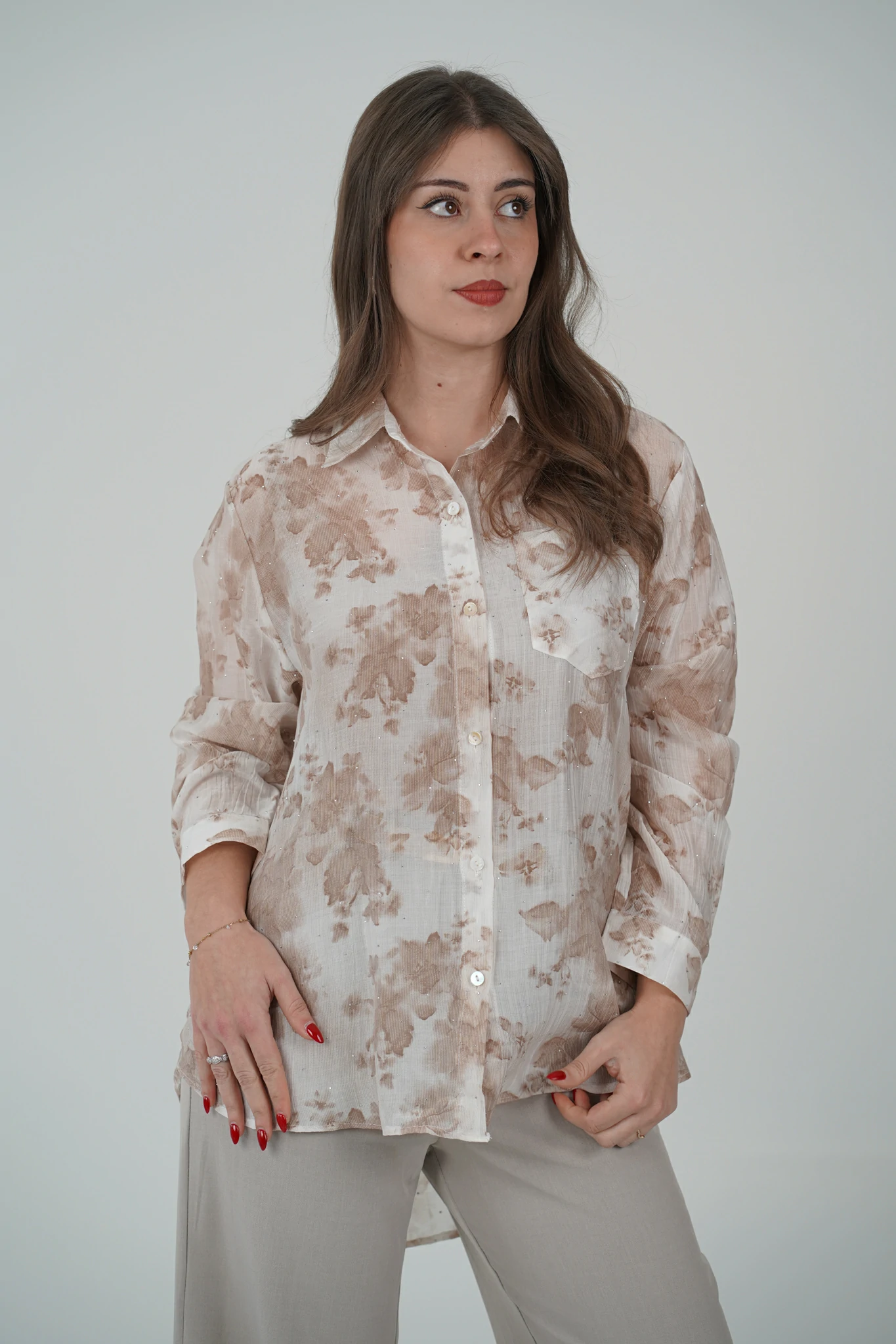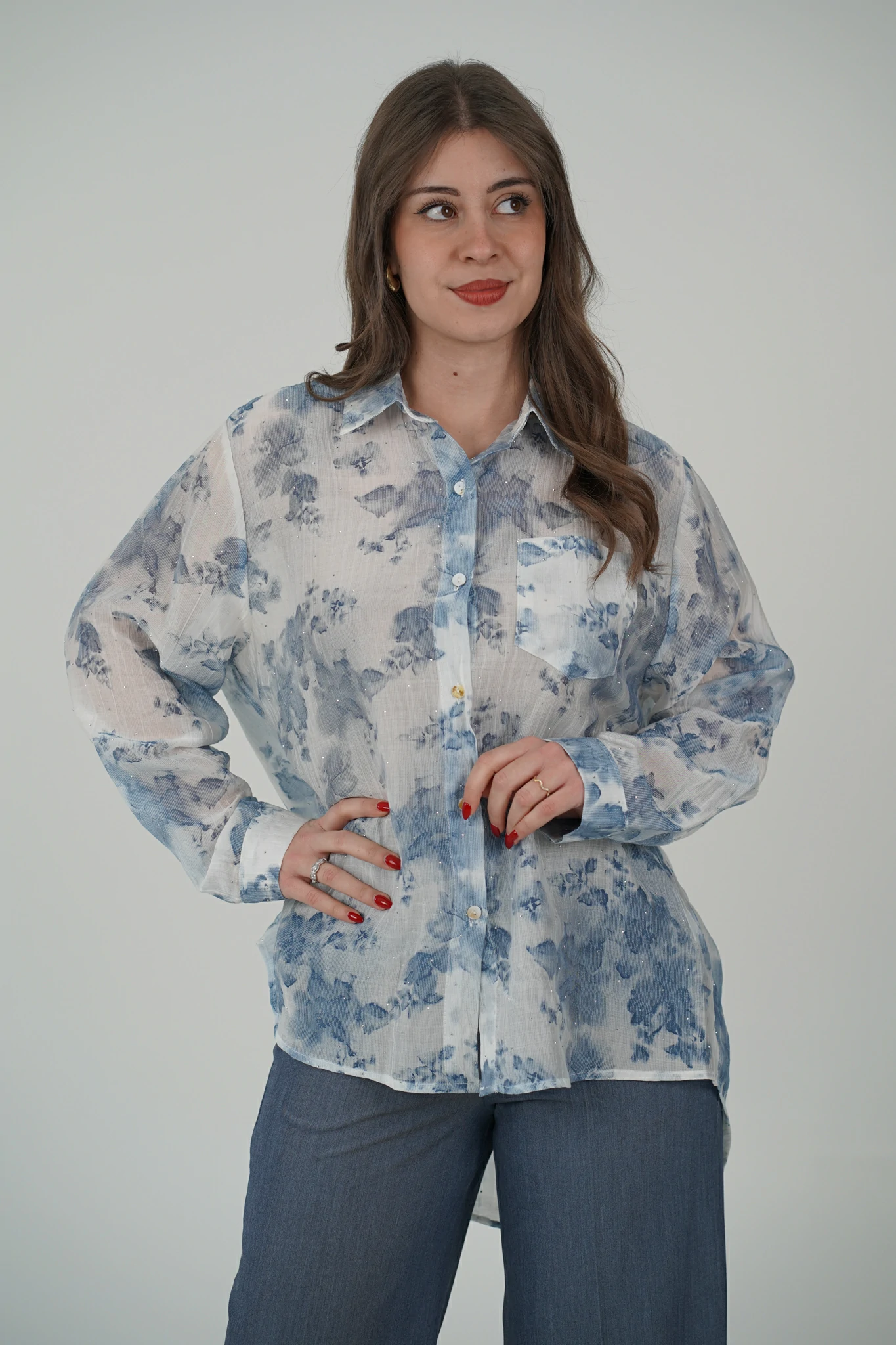Delicata, femminile e incredibilmente chic: questa camicia è il capo perfetto per illuminare i tuoi look con eleganza. Il tessuto semi trasparente, arricchito dai punti luce, incontra una raffinata fantasia floreale che dona movimento e personalità