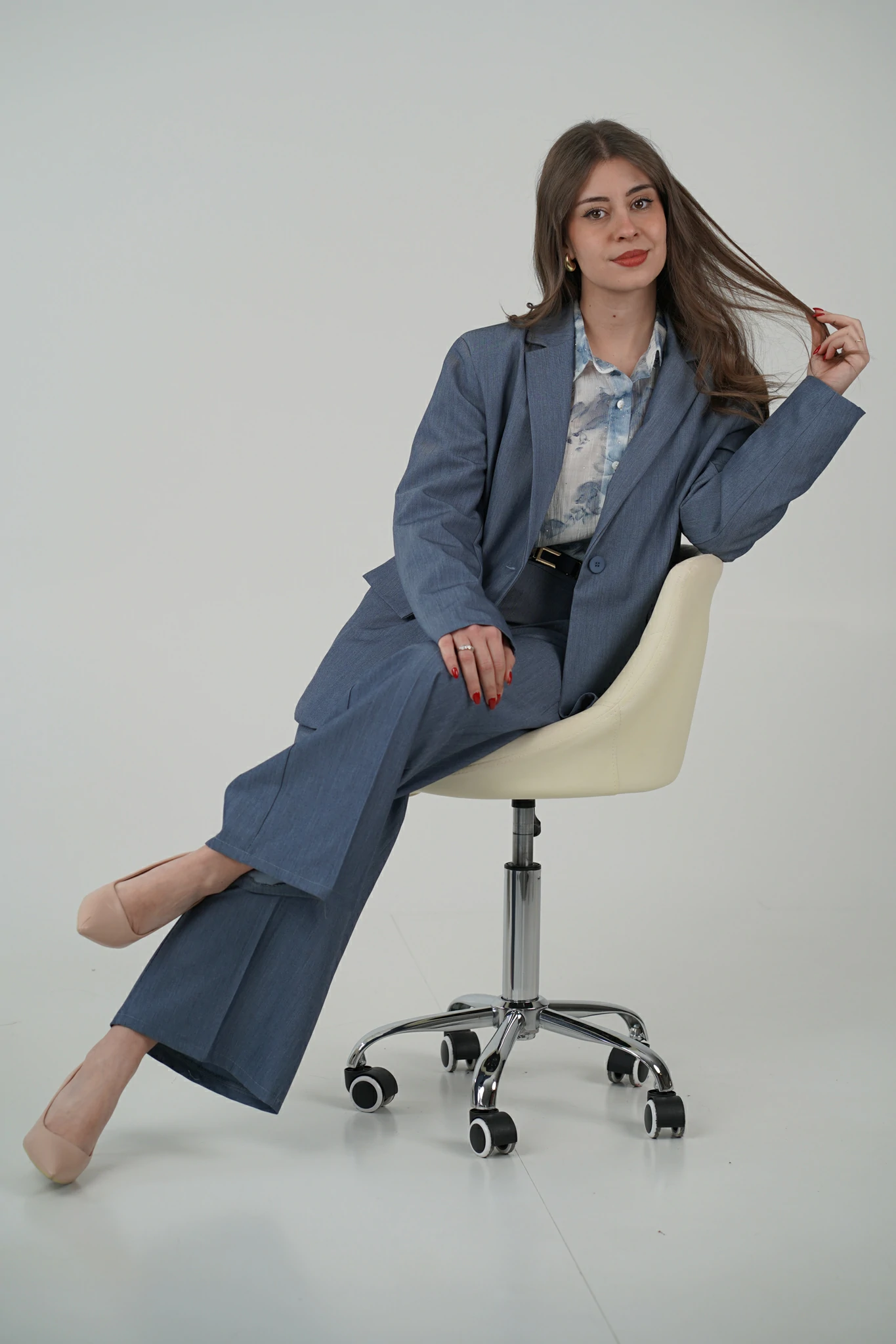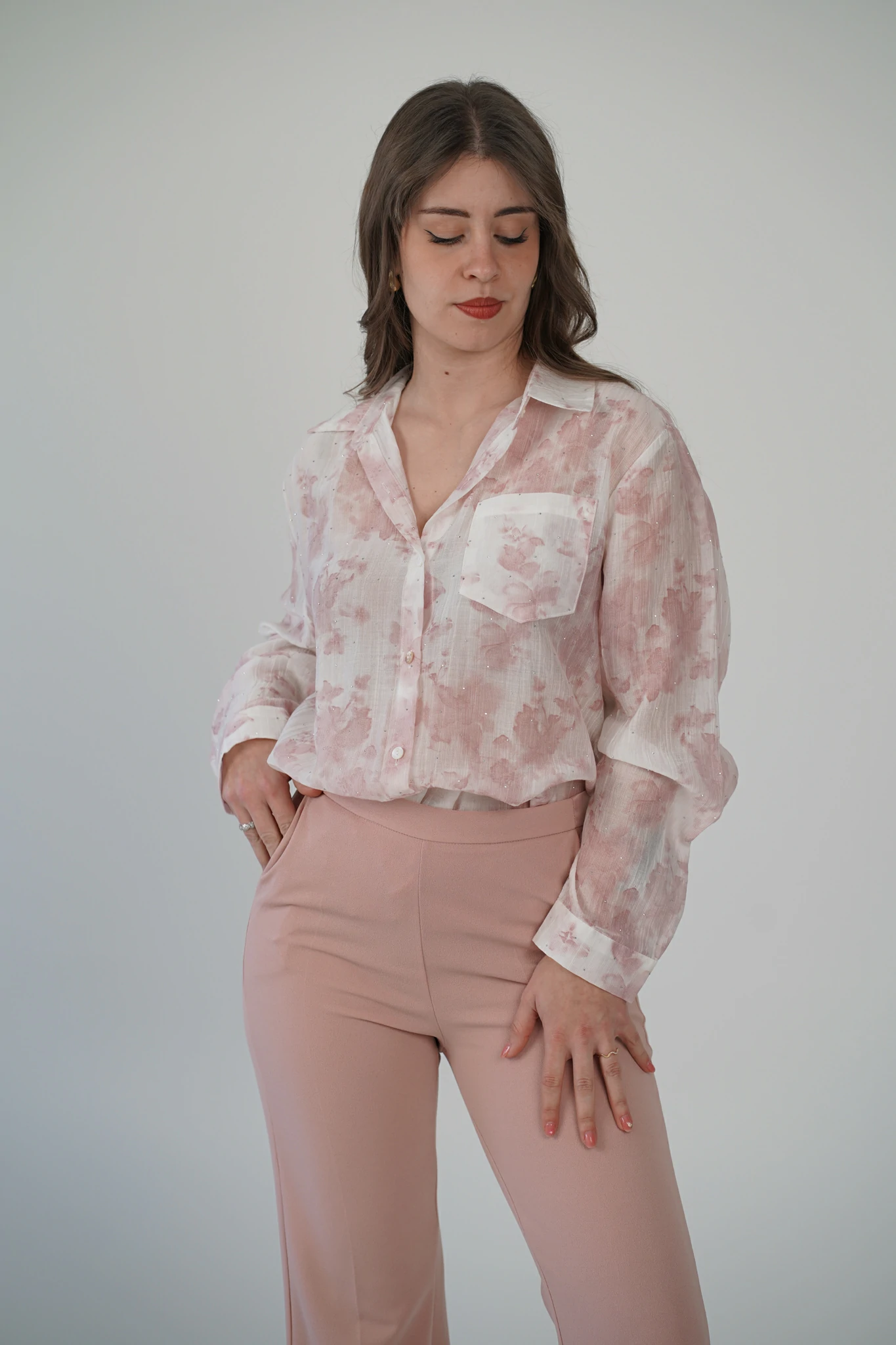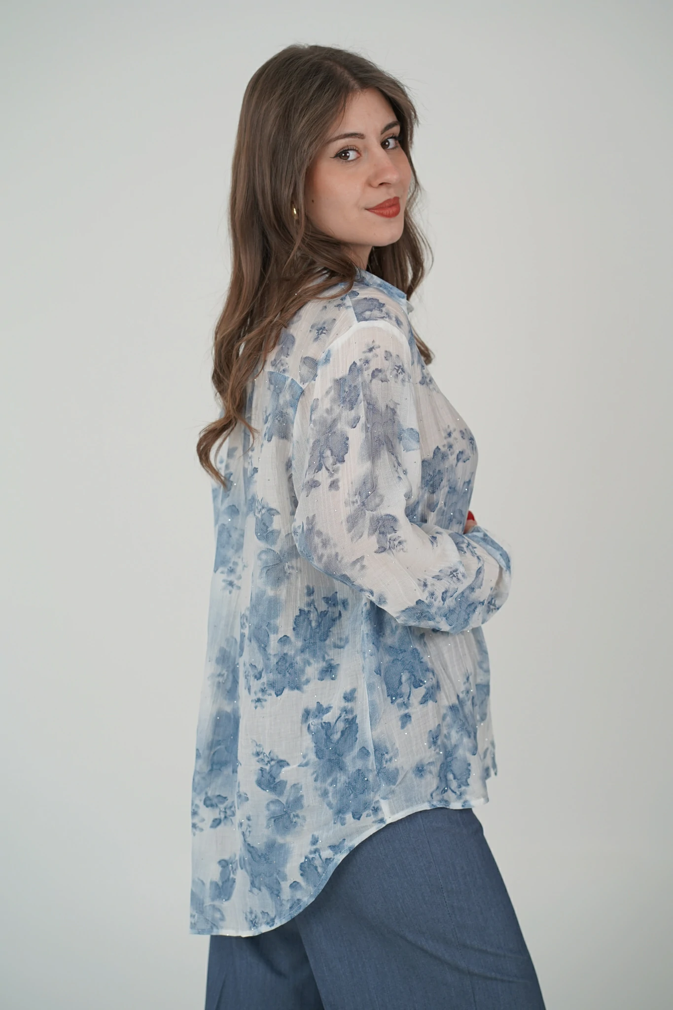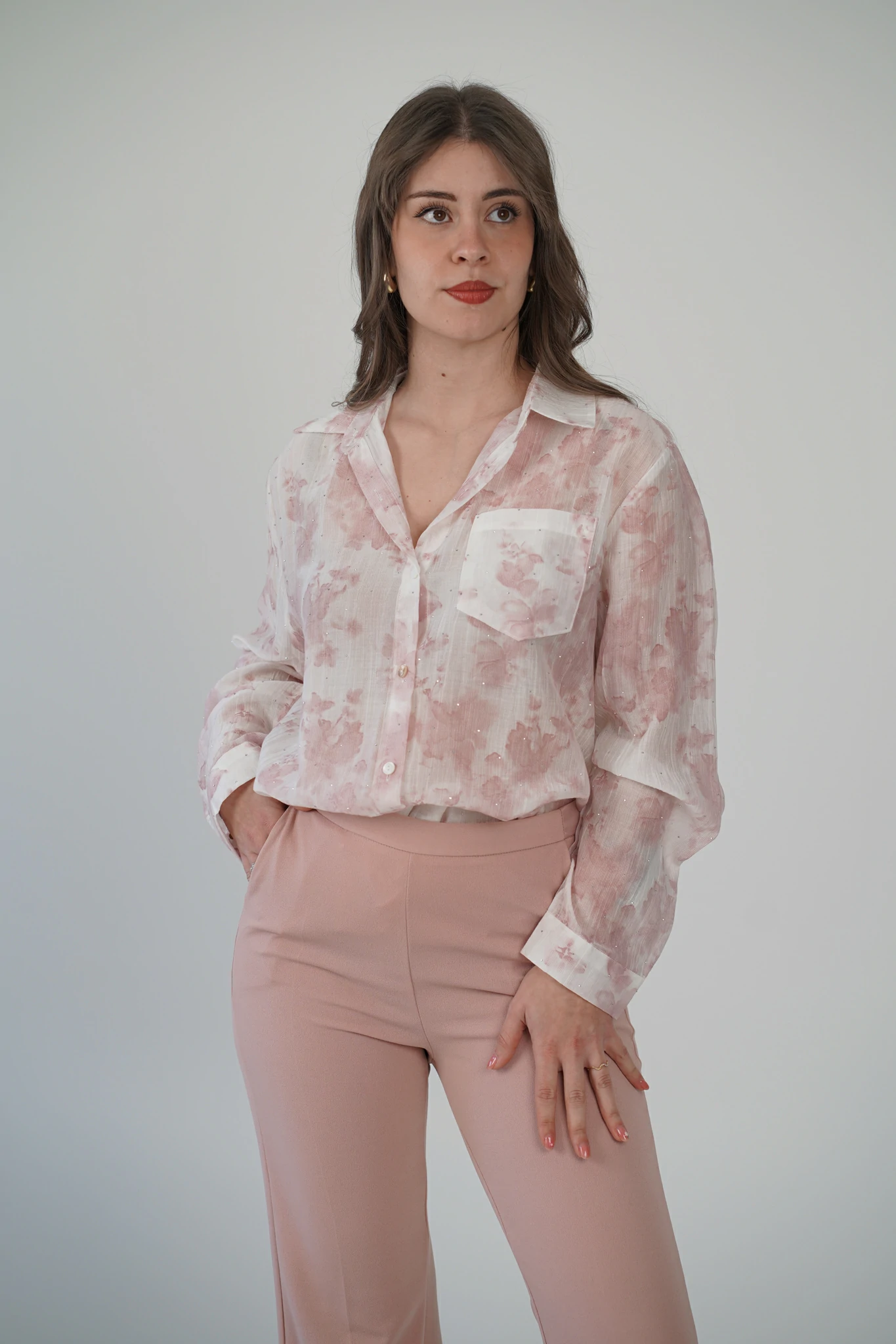 Il taglio morbido assicura comfort e una vestibilità fluida, mentre i dettagli sartoriali – colletto classico, polsini con bottoncino e taschino – aggiungono un tocco sofisticato 🌸✨