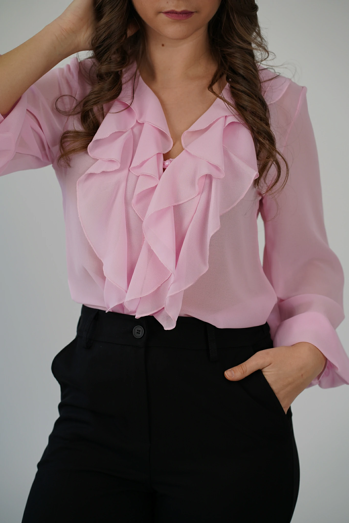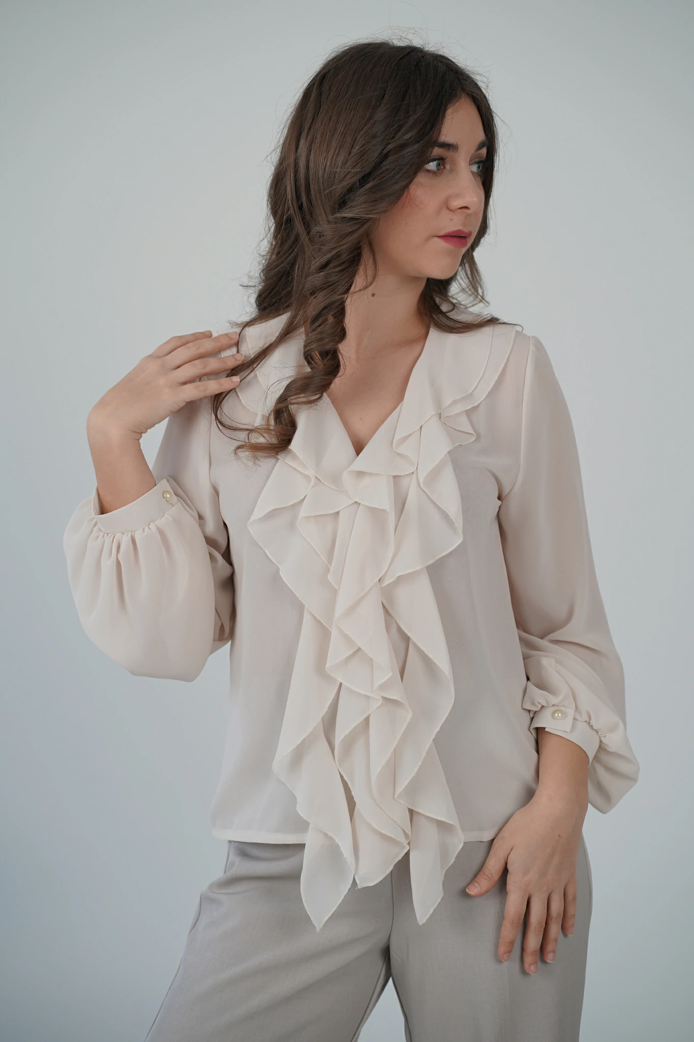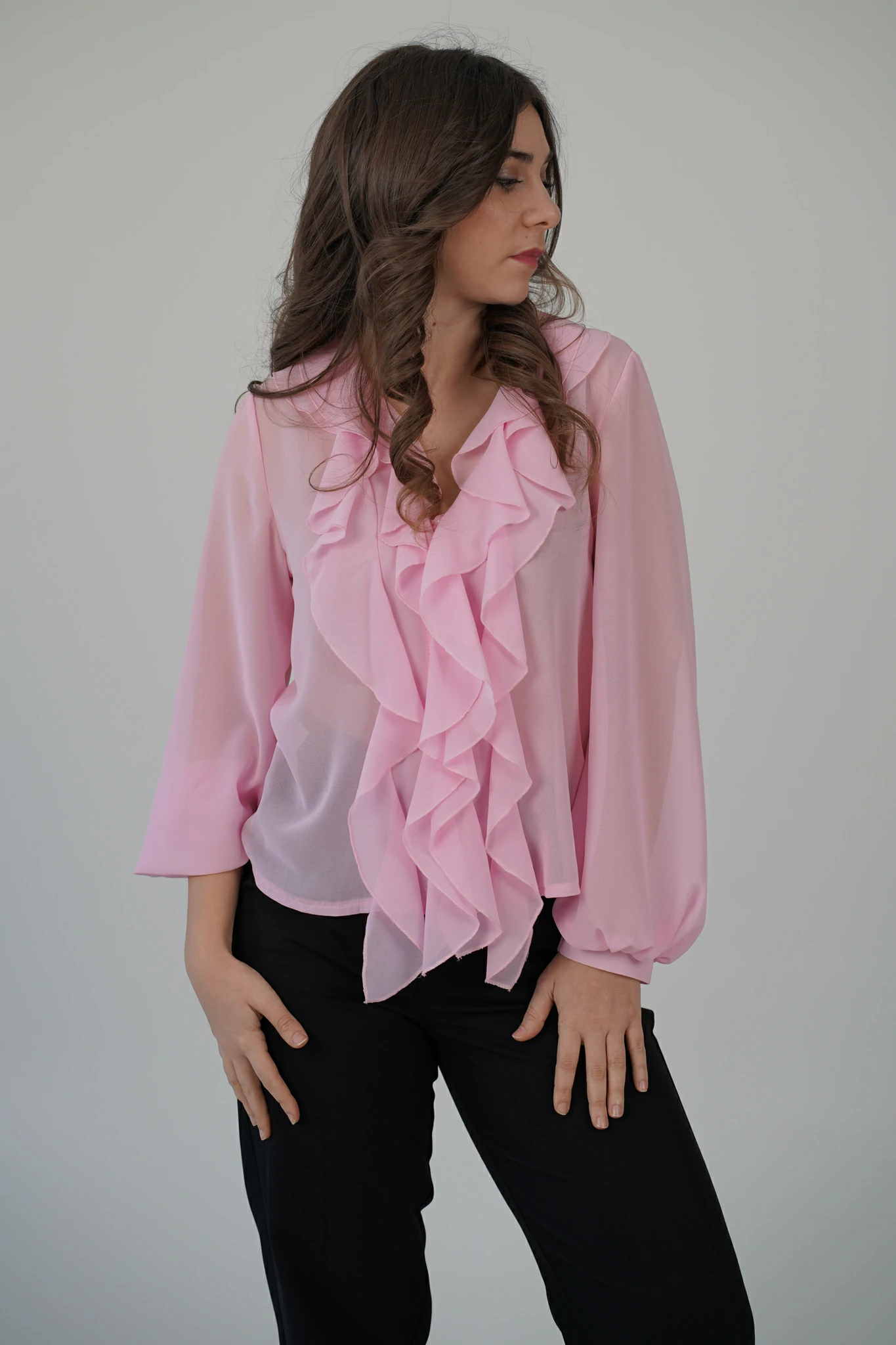 Descrizione: Camicetta in voile con volant sul davanti, scollo a V e chiusura a bottoncini.