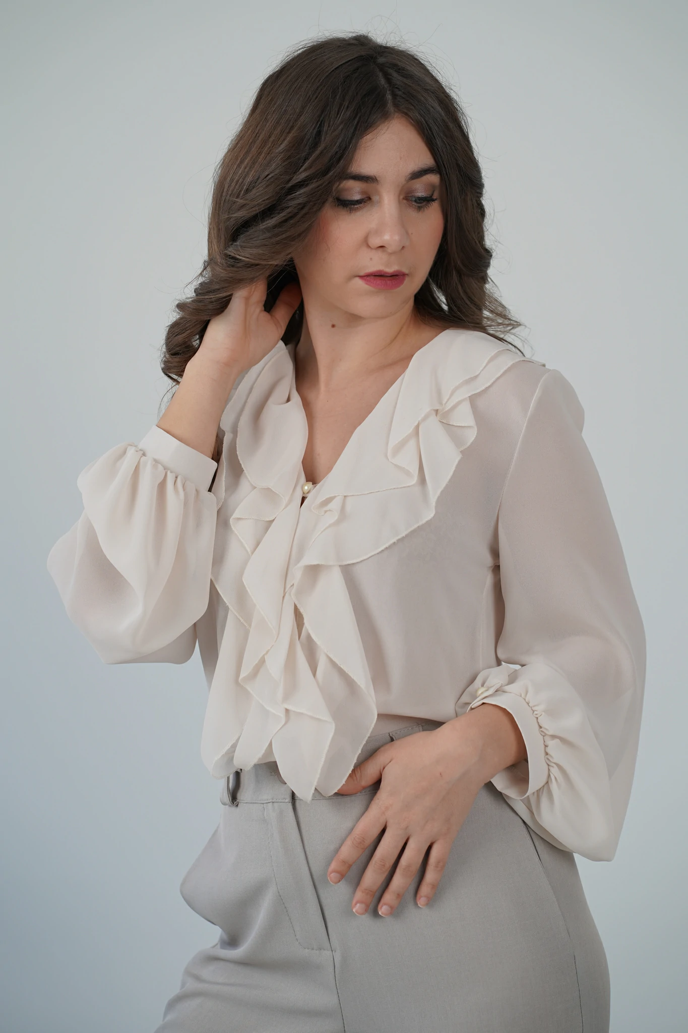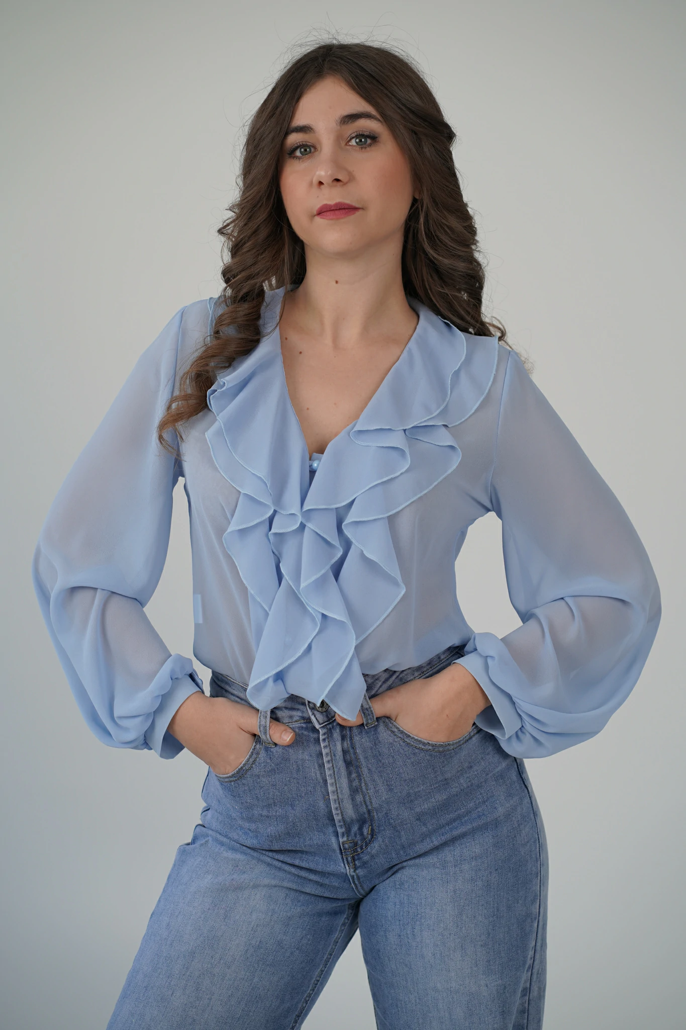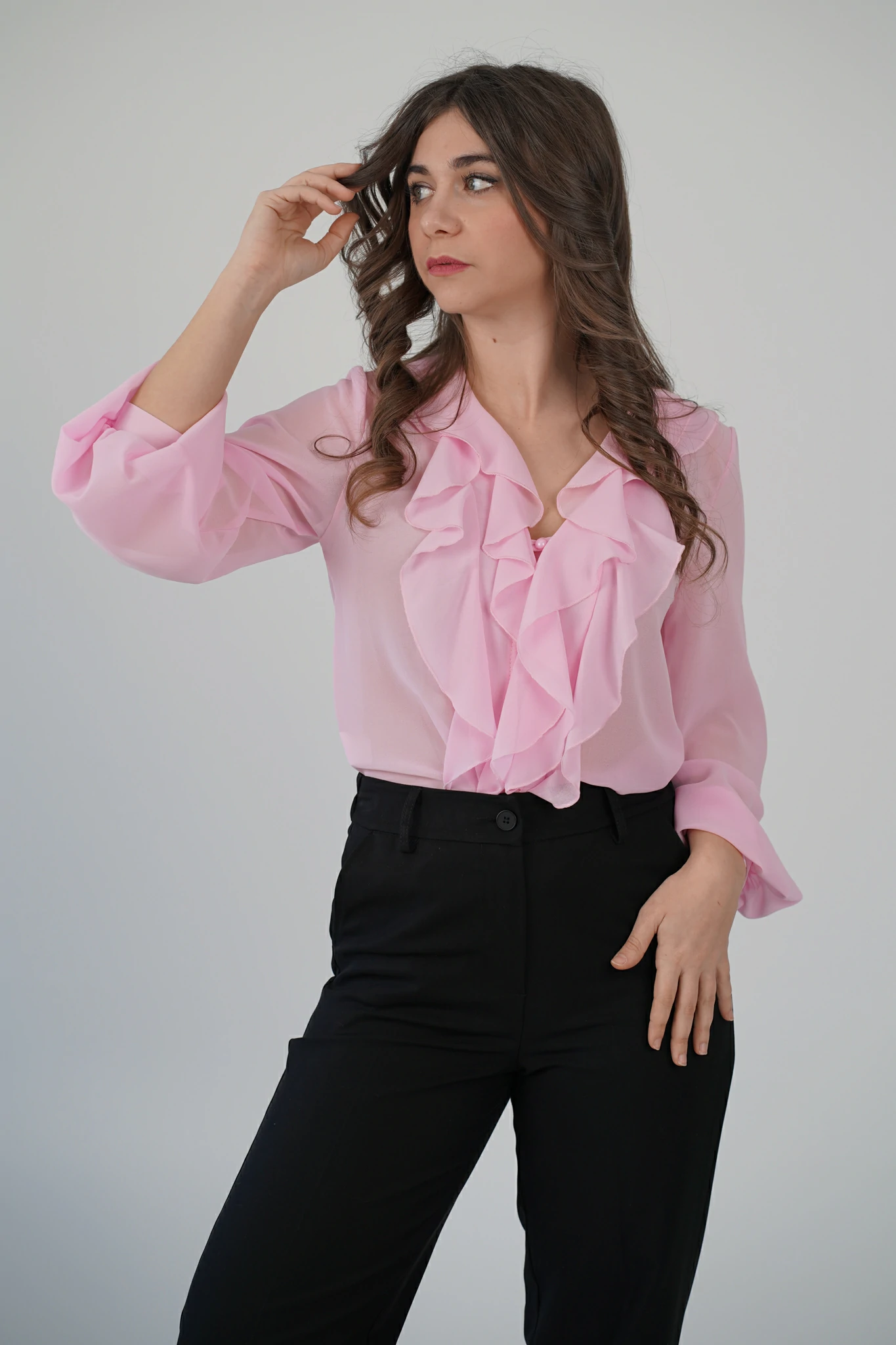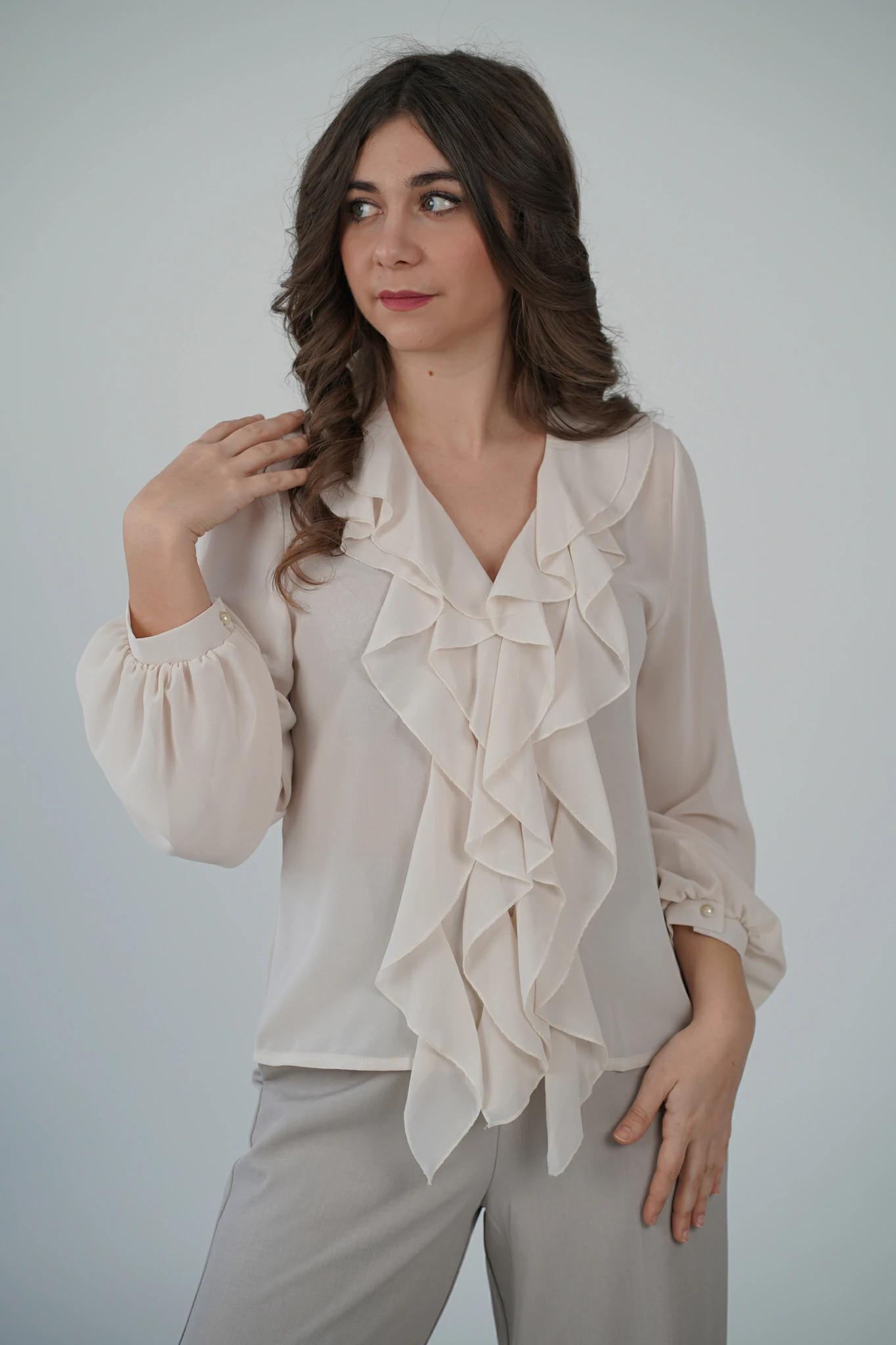 Descrizione: Camicetta in voile con volant sul davanti, scollo a V e chiusura a bottoncini.