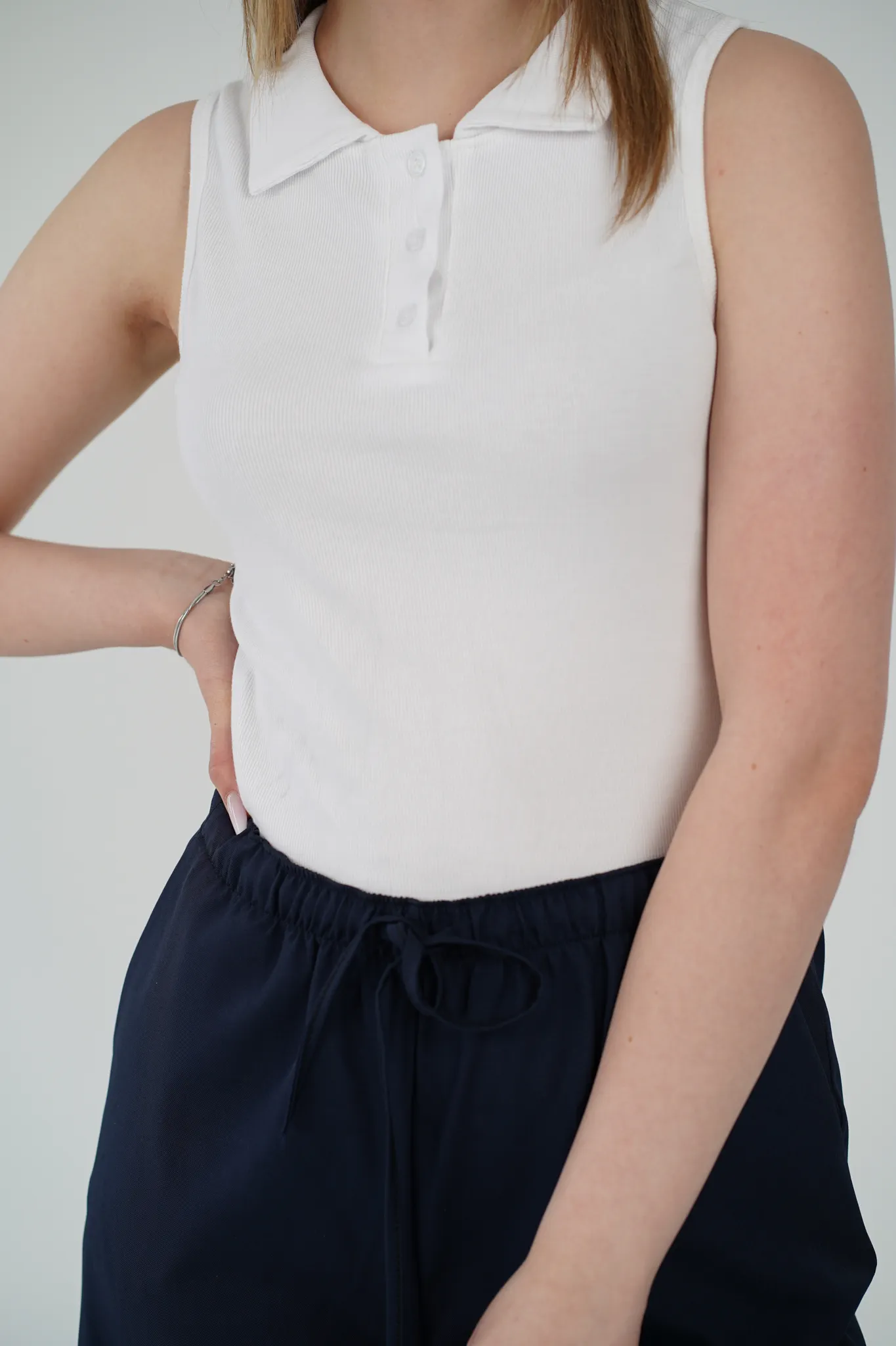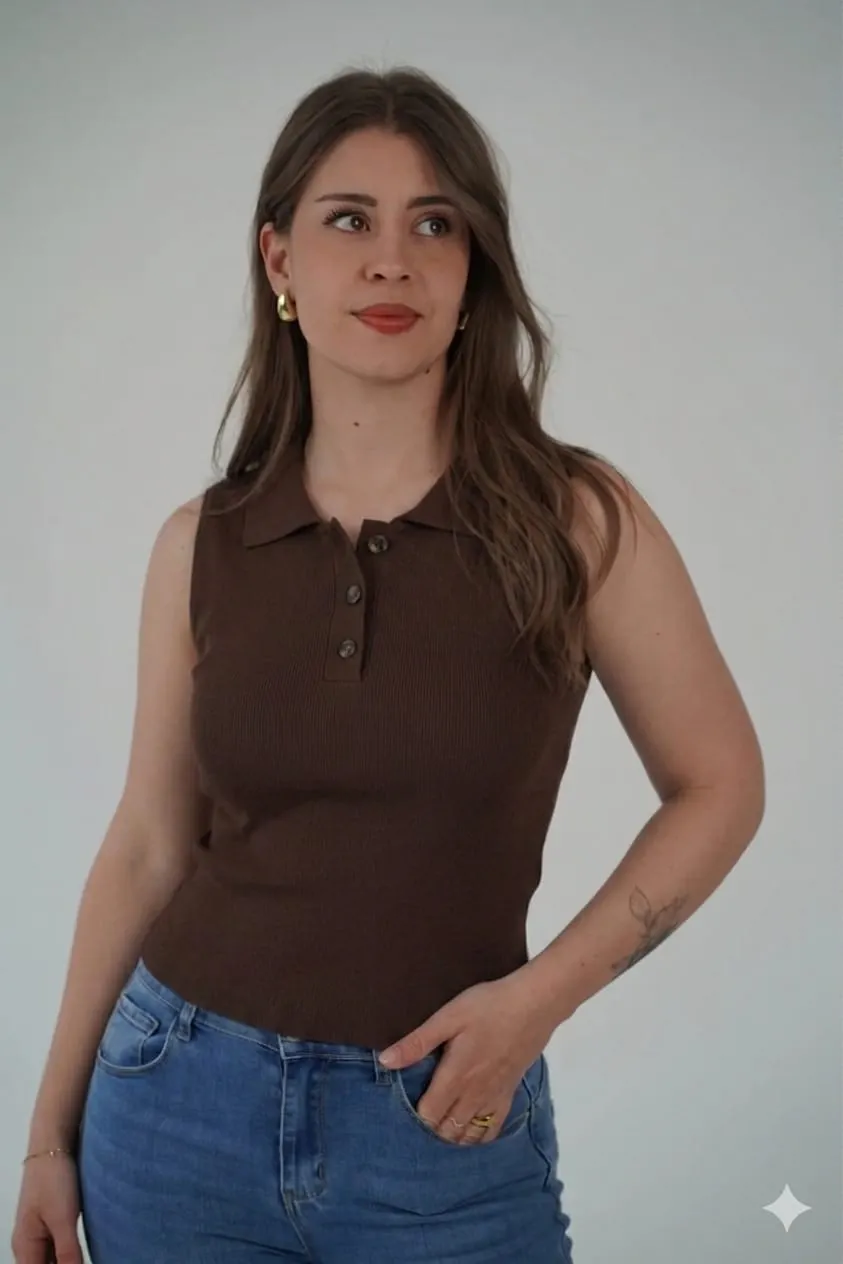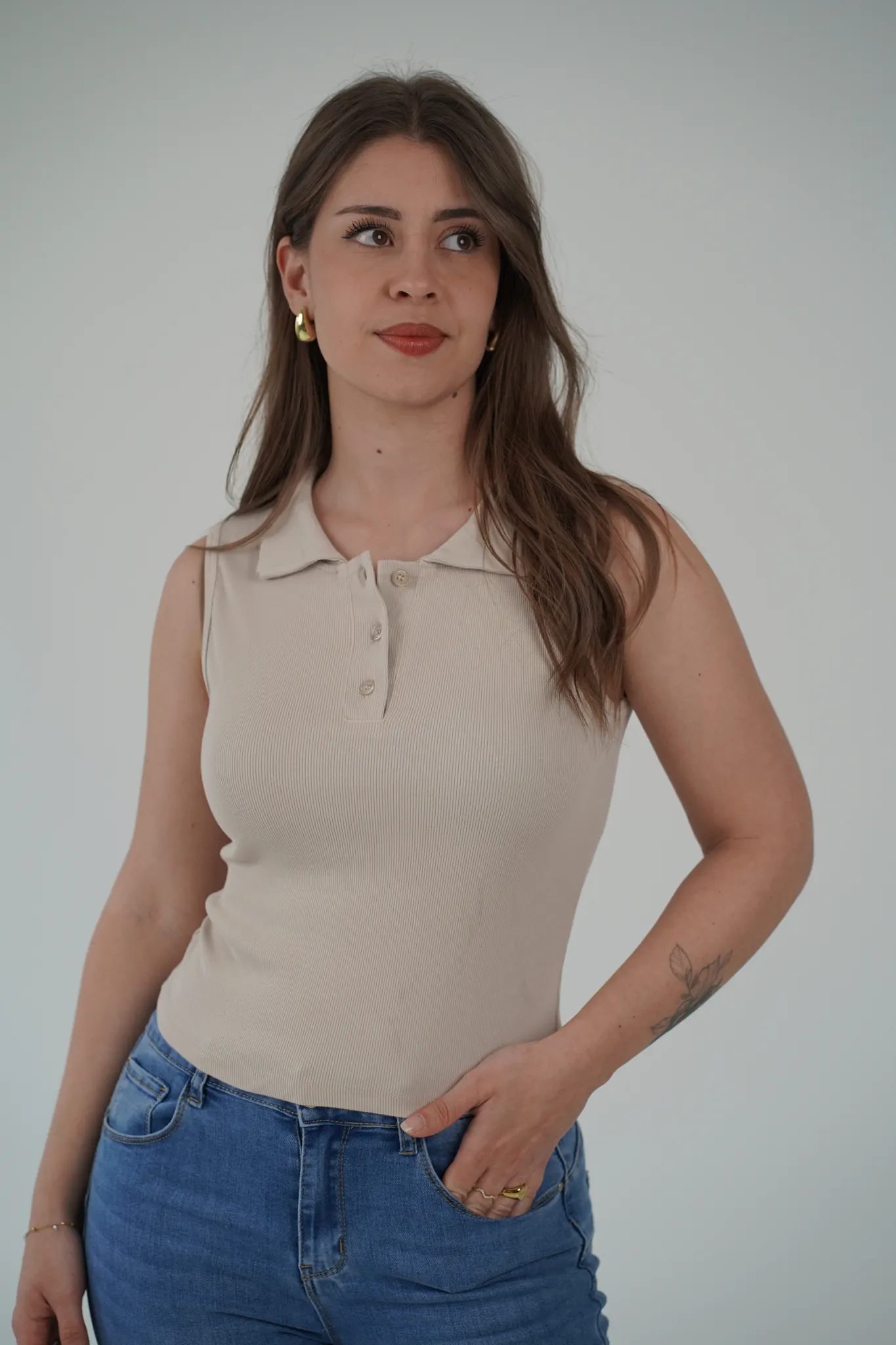 Descrizione: Canotta a costine sottili con colletto a camicia e tre bottoncini dal design sofisticato e curato nei dettagli ✨