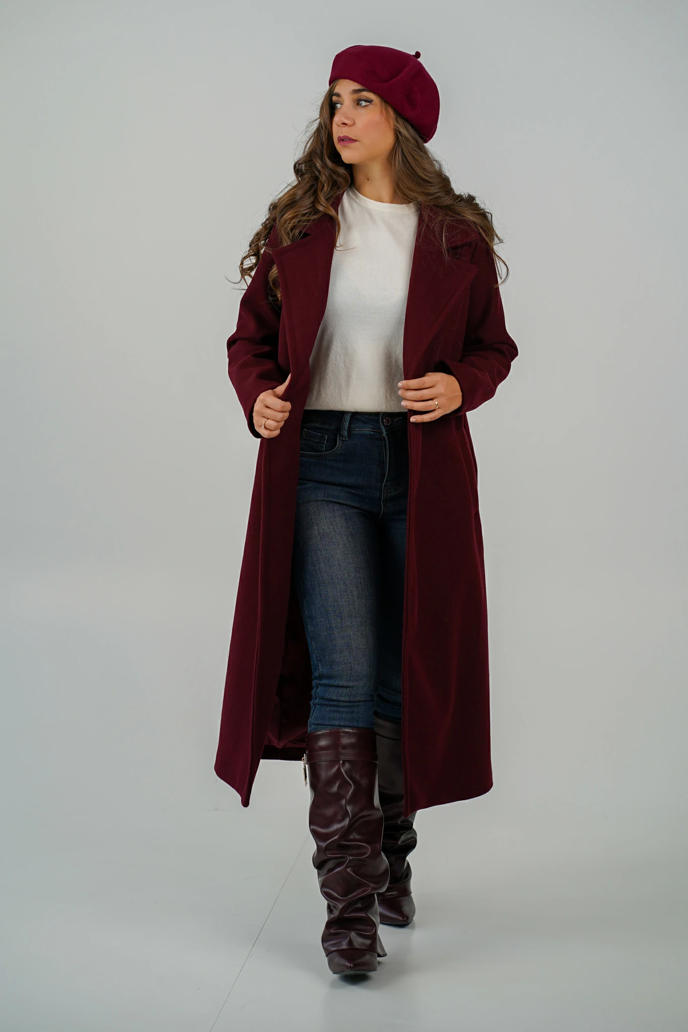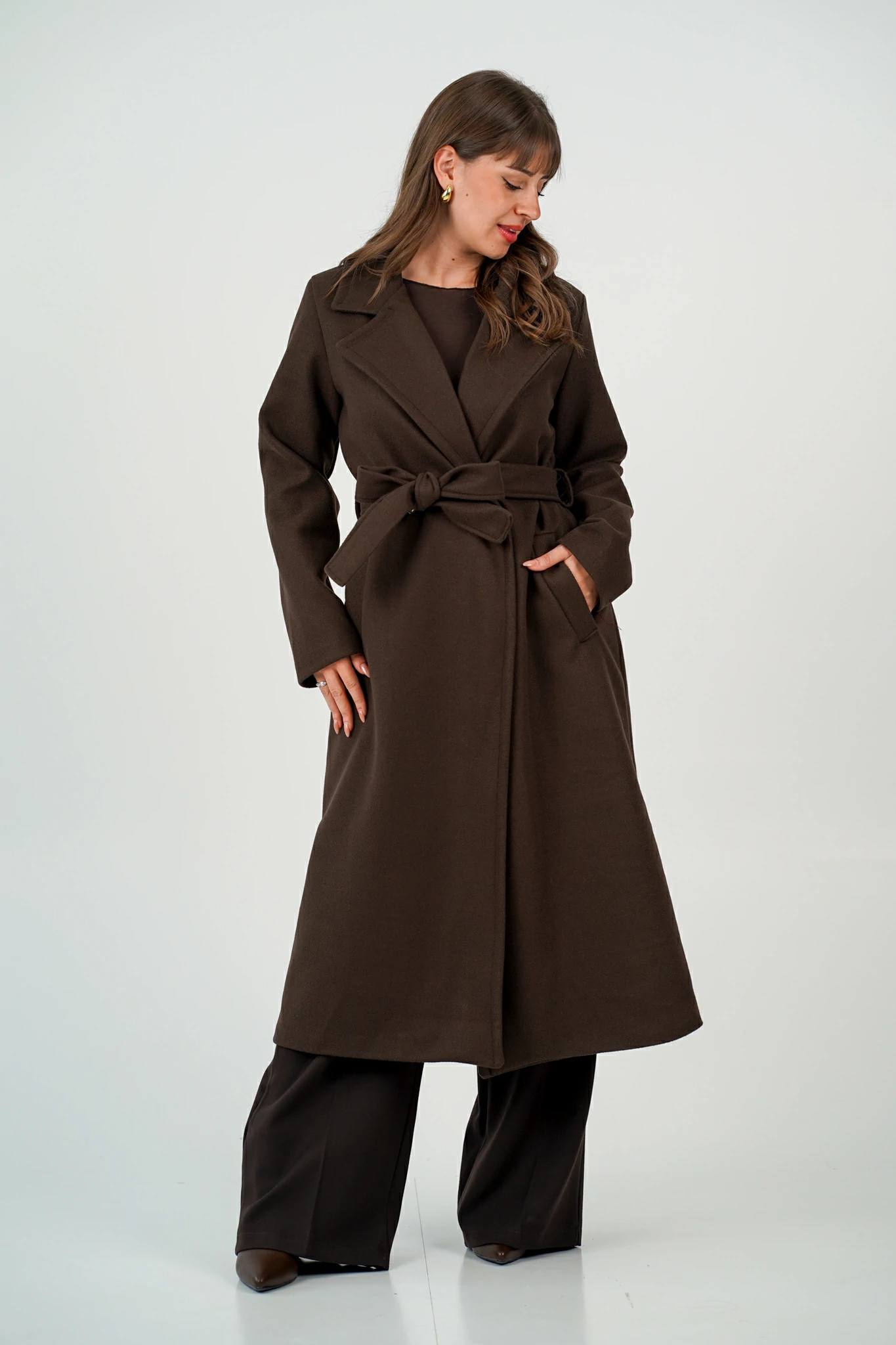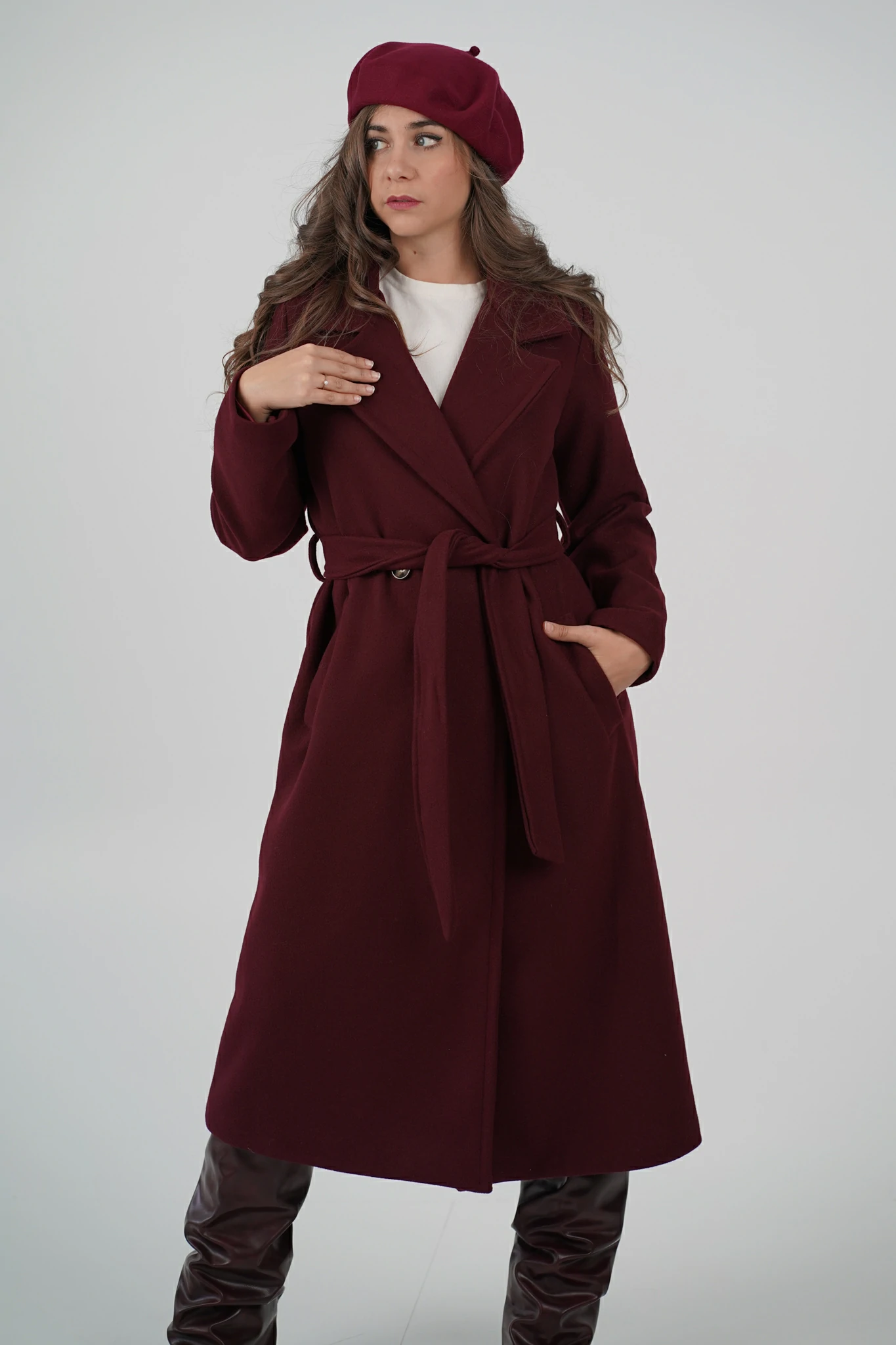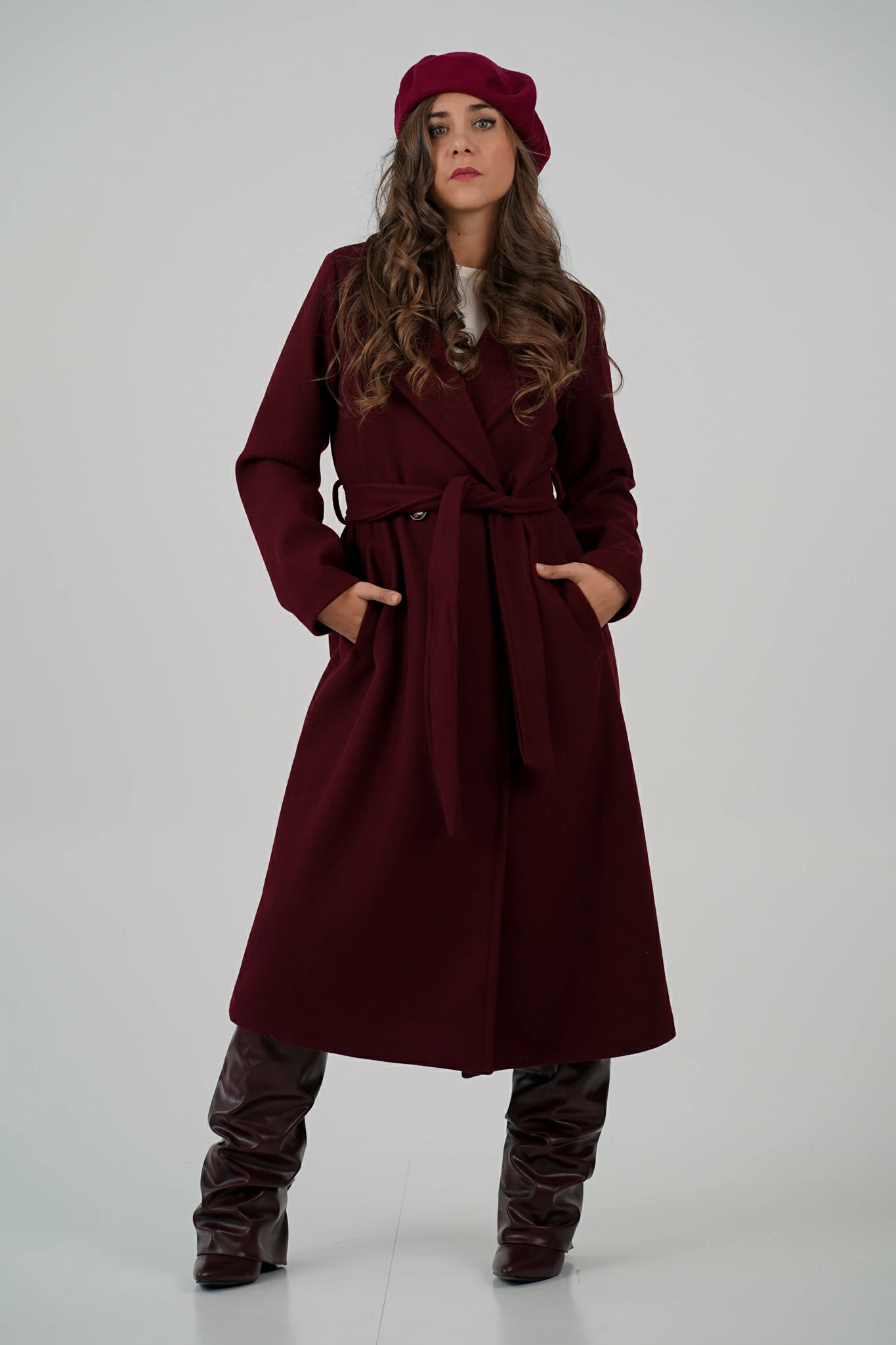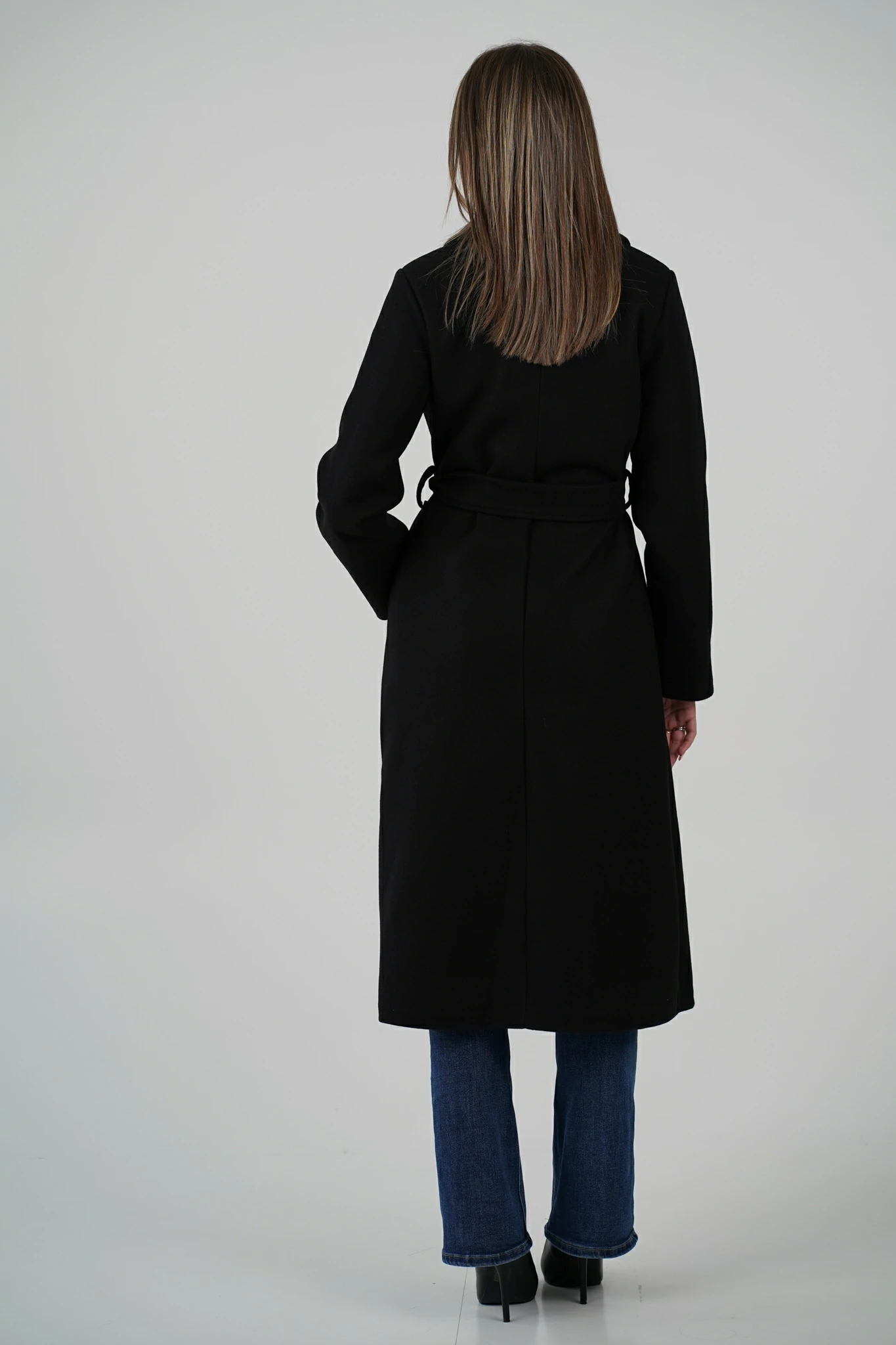 Modello con scollo revers, chiusura a doppio petto con bottoni, cintura in panno tono su tono da stringere sul punto vita e spallina leggermente imbottita