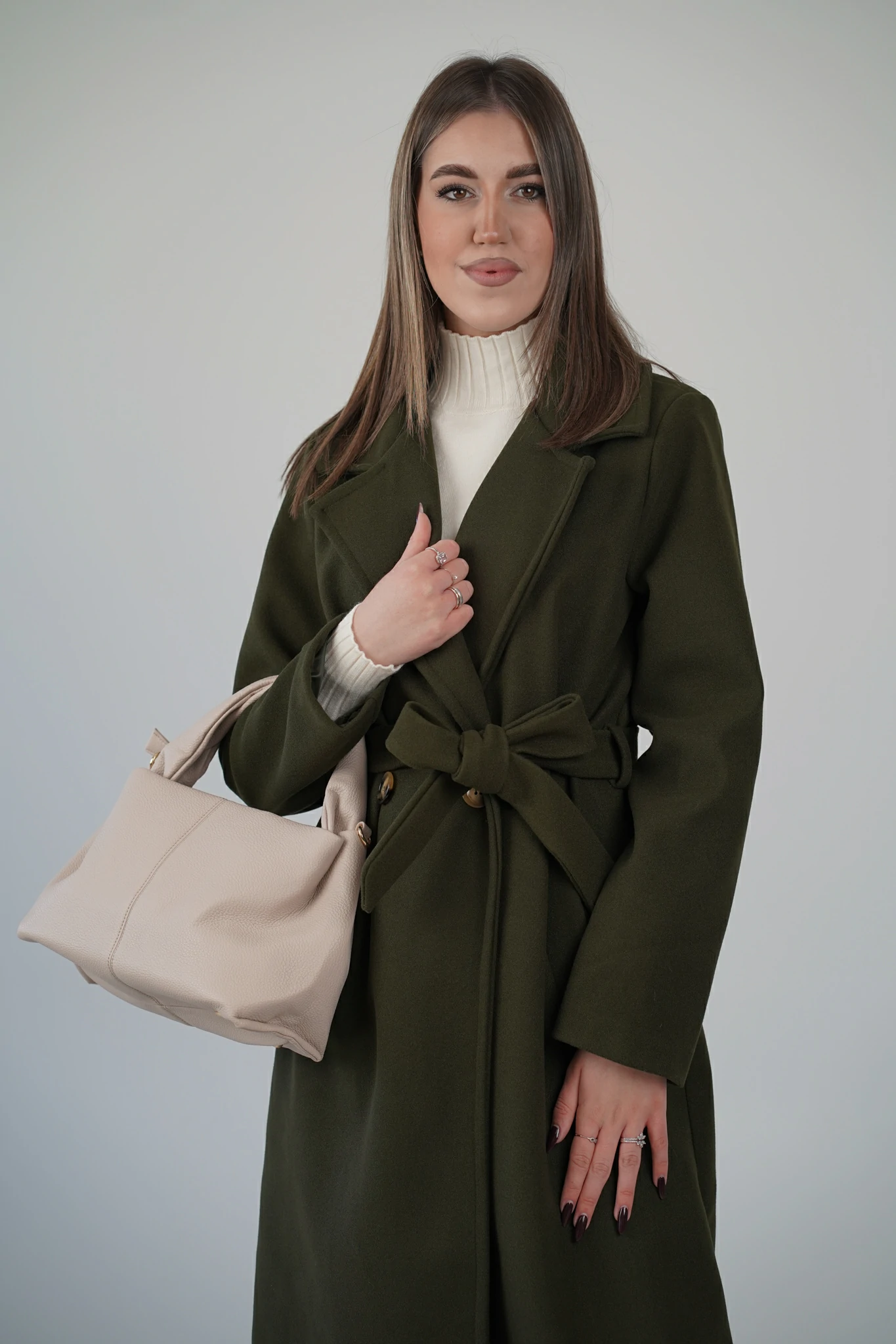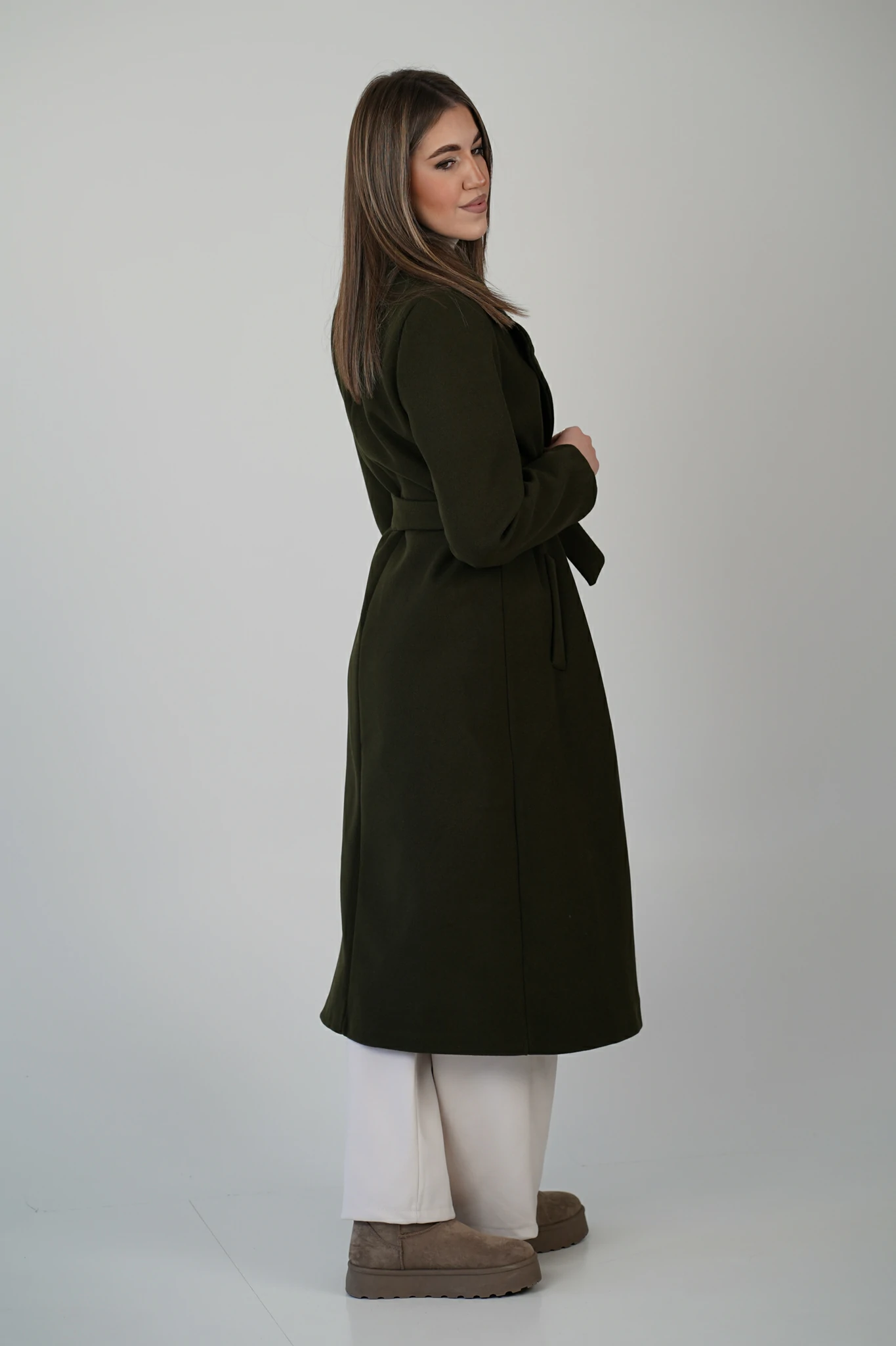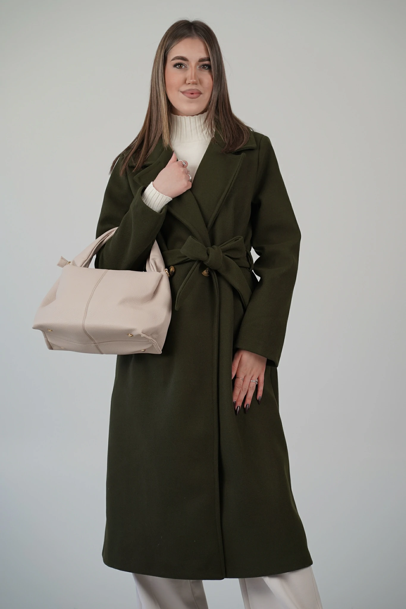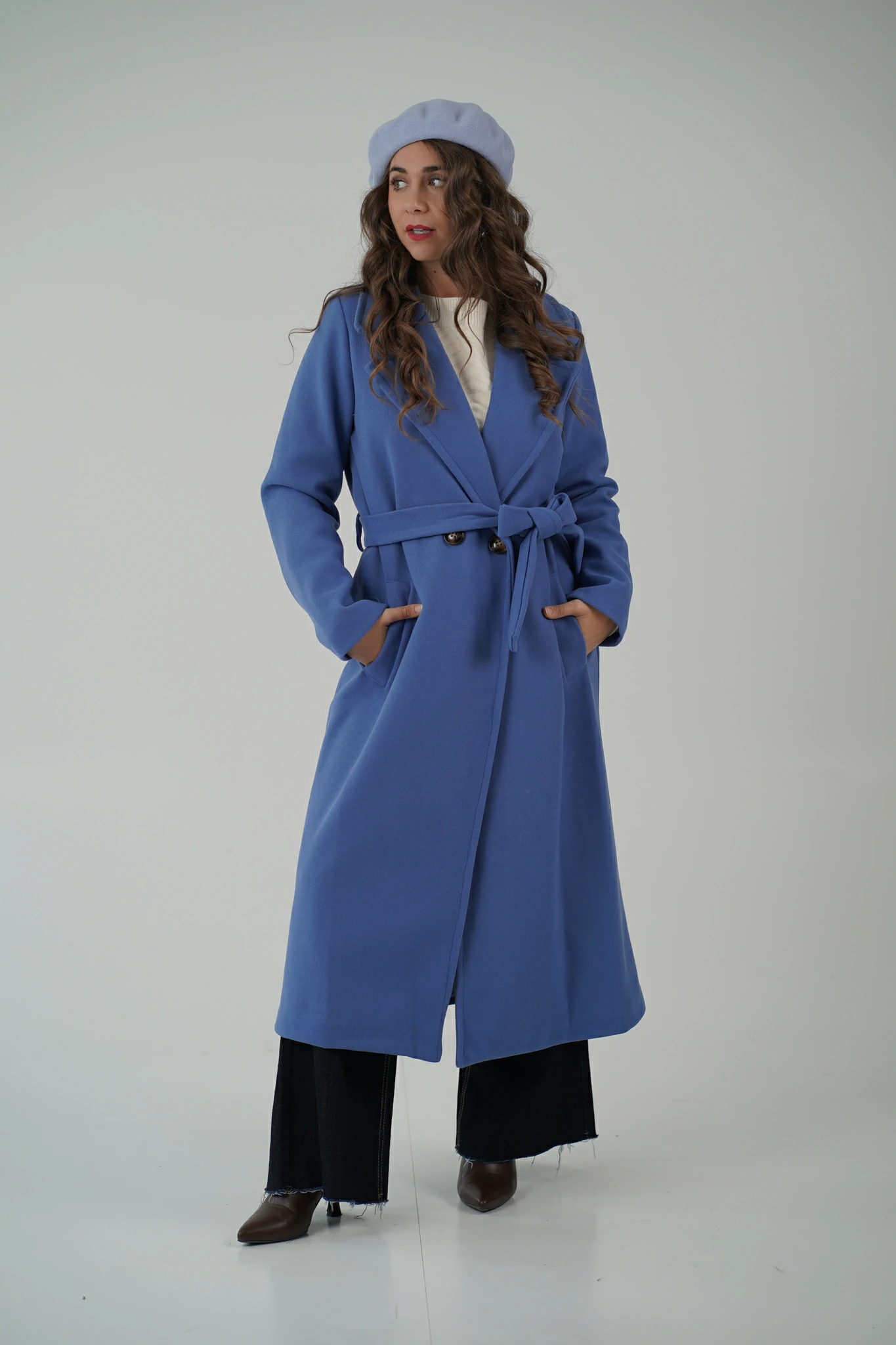 Modello con scollo revers, chiusura a doppio petto con bottoni, cintura in panno tono su tono da stringere sul punto vita e spallina leggermente imbottita