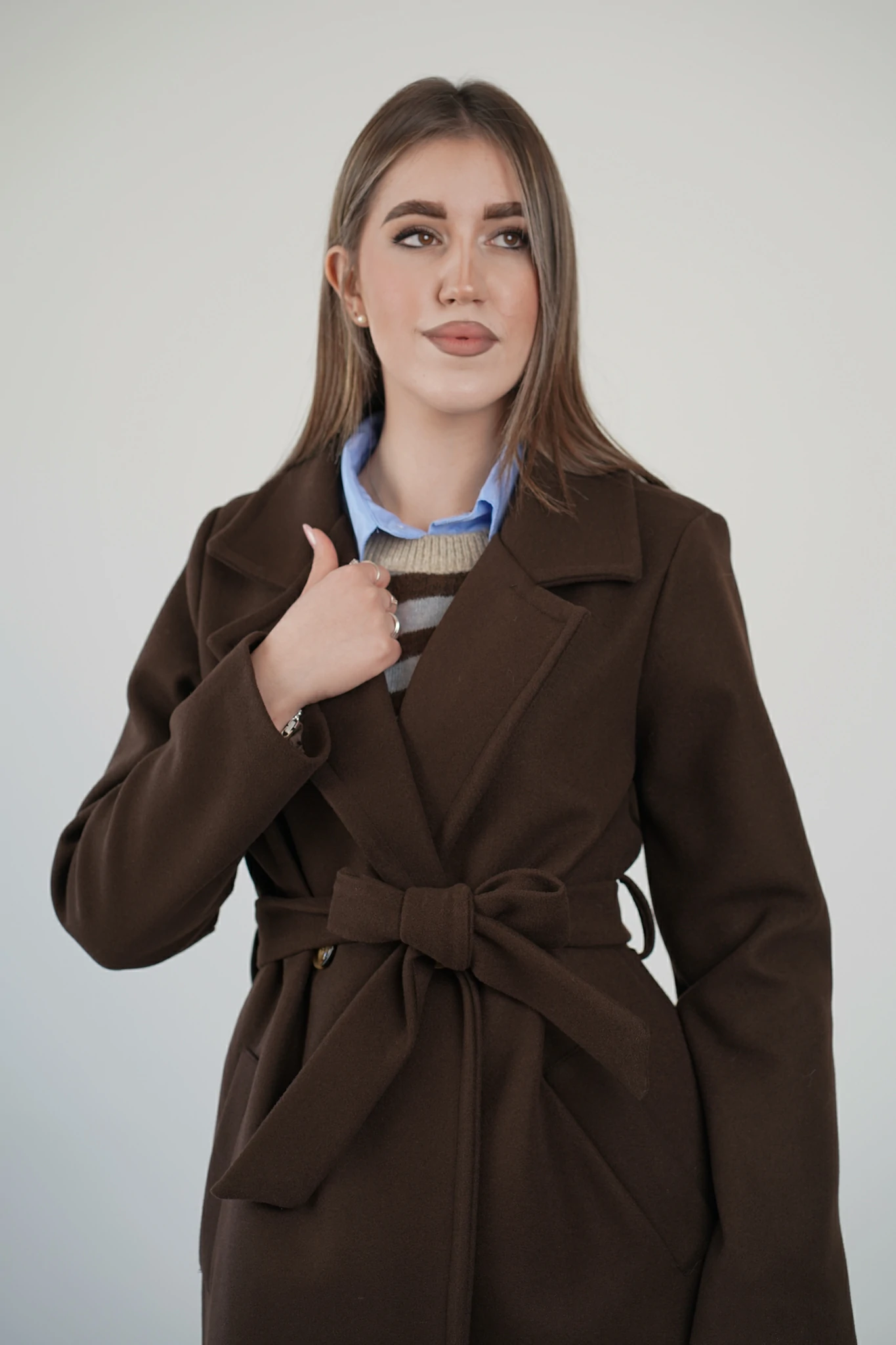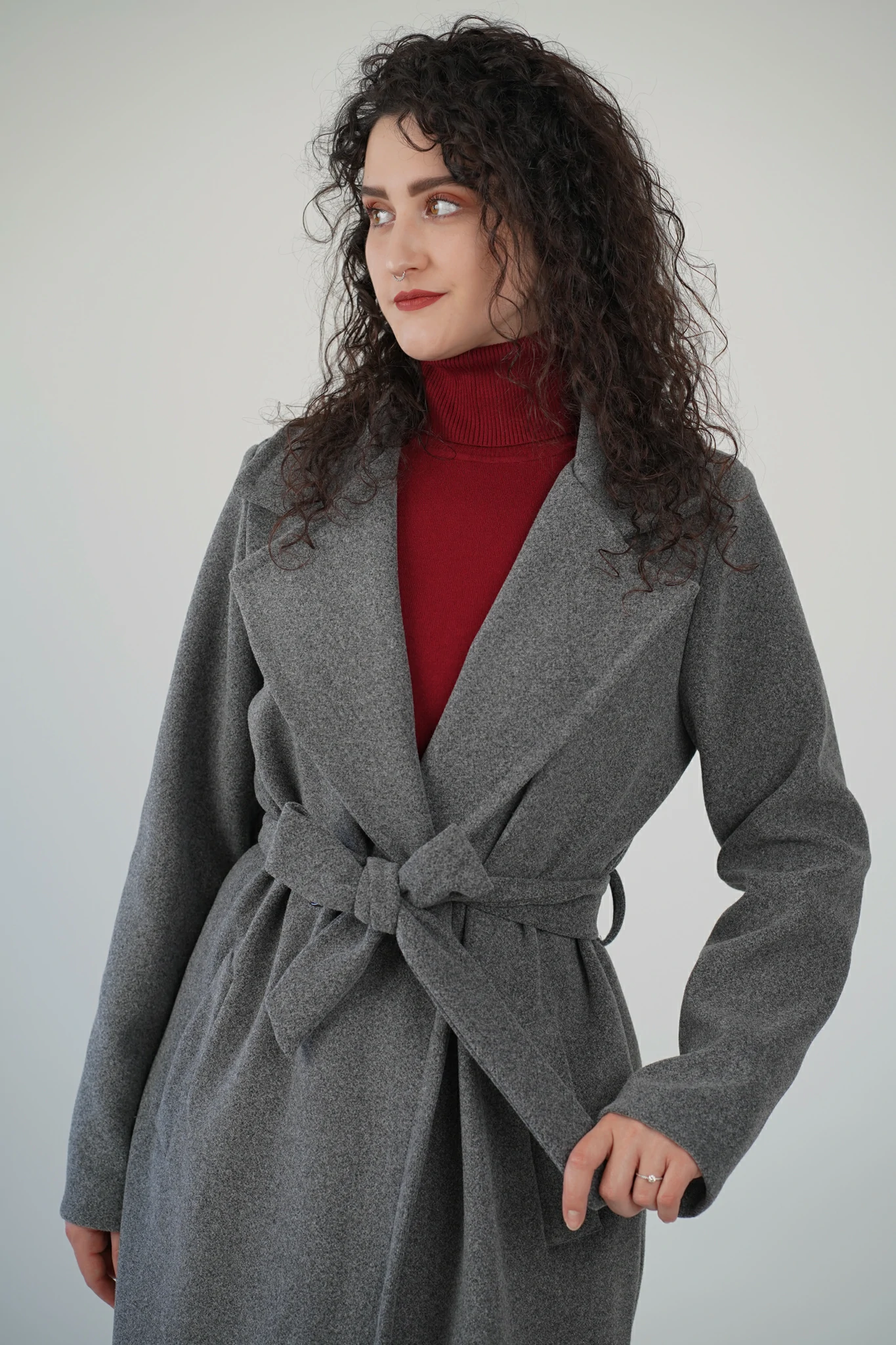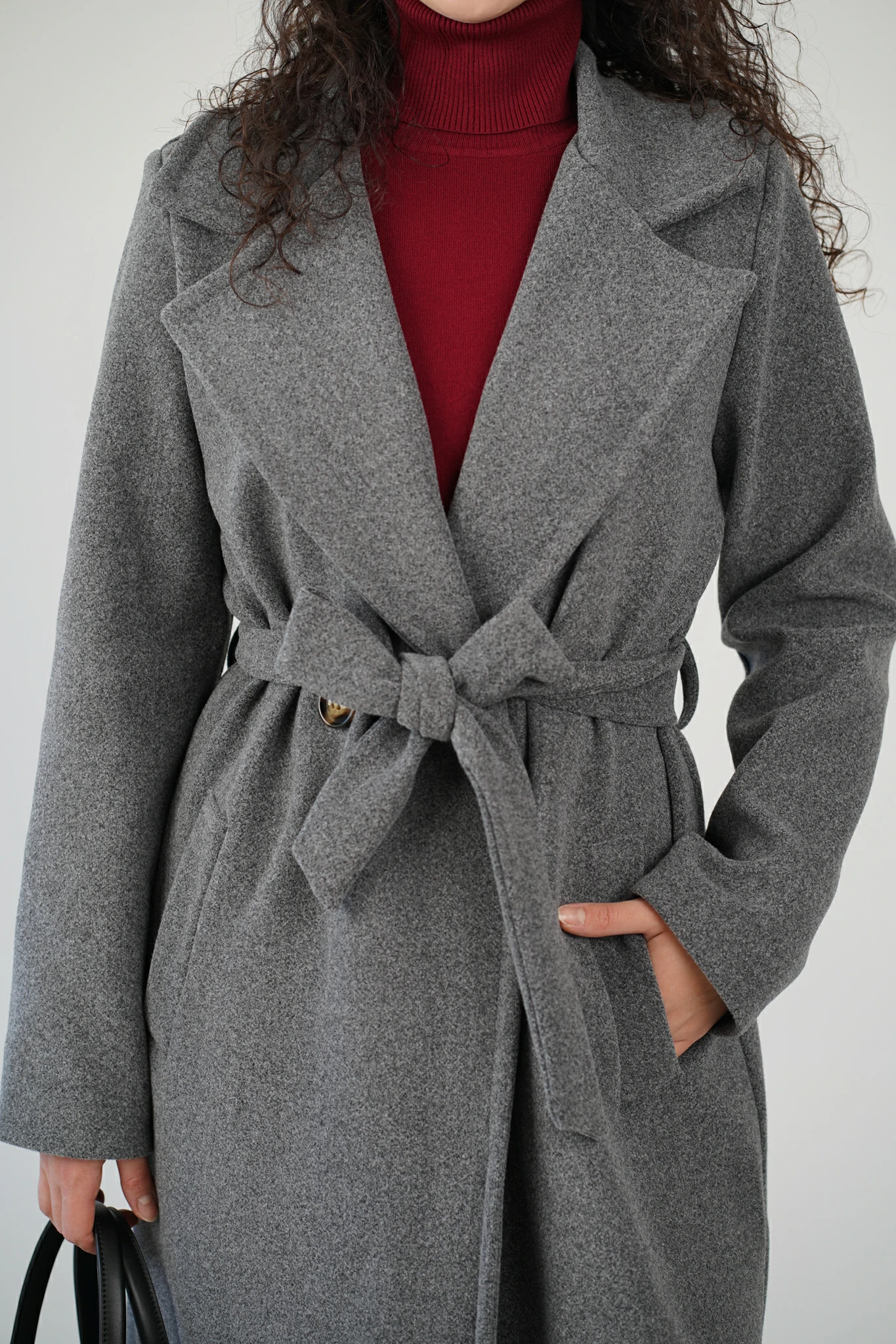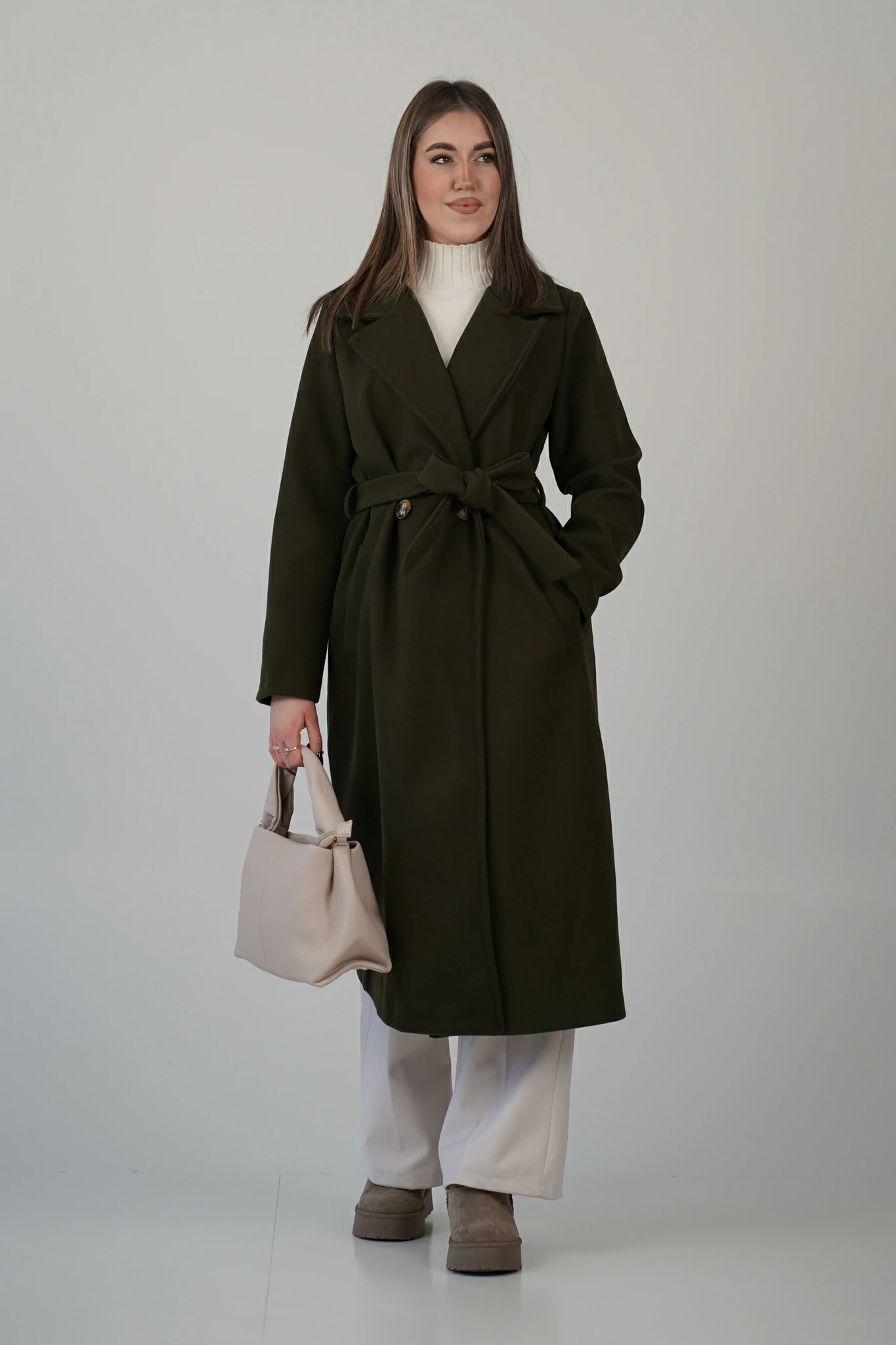 Modello con scollo revers, chiusura a doppio petto con bottoni, cintura in panno tono su tono da stringere sul punto vita e spallina leggermente imbottita