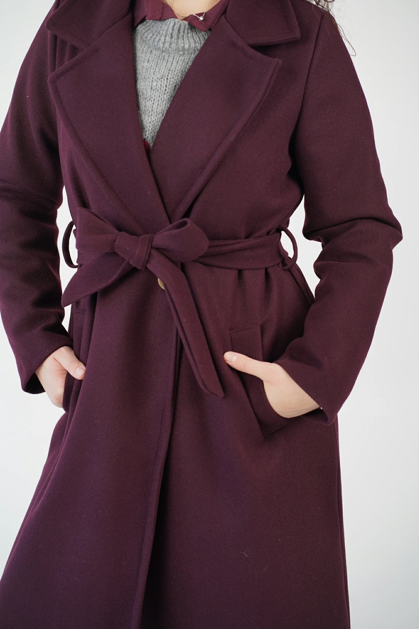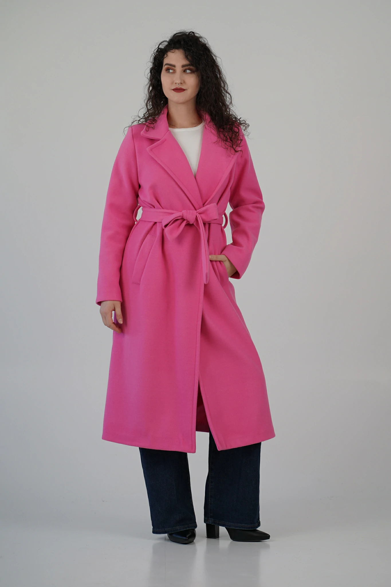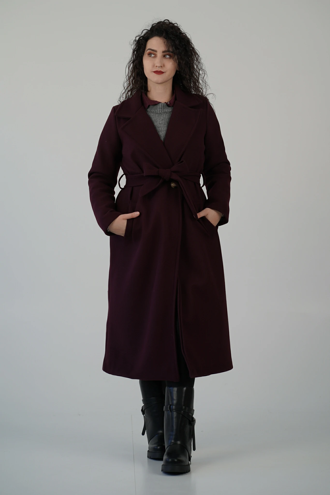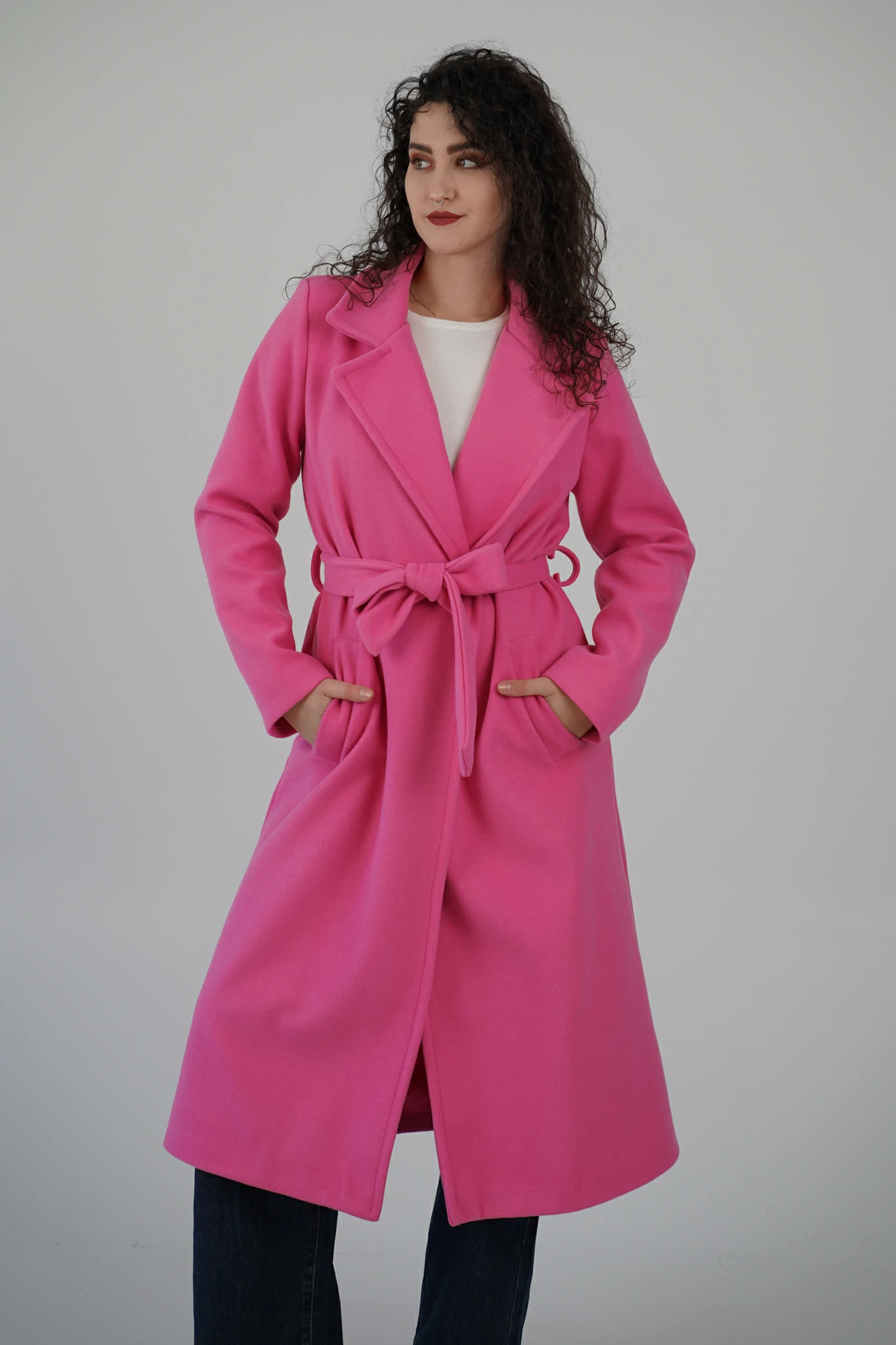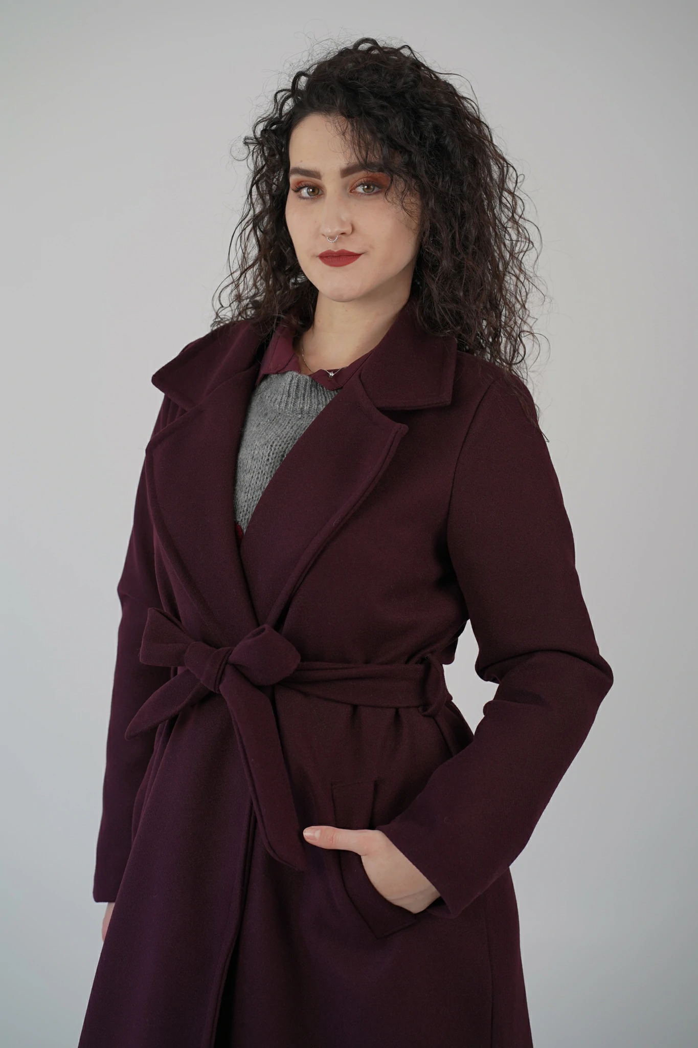 Modello con scollo revers, chiusura a doppio petto con bottoni, cintura in panno tono su tono da stringere sul punto vita e spallina leggermente imbottita
