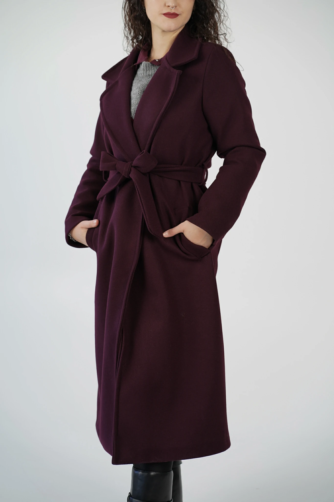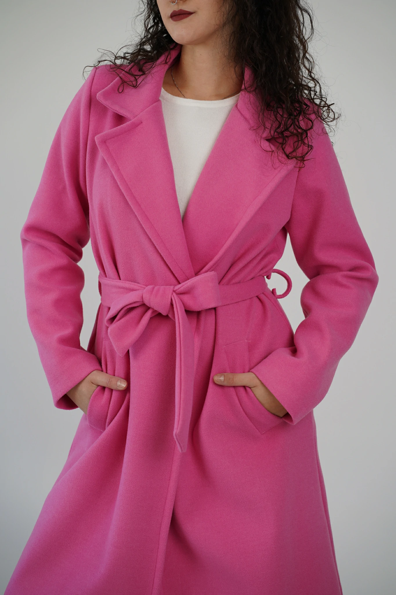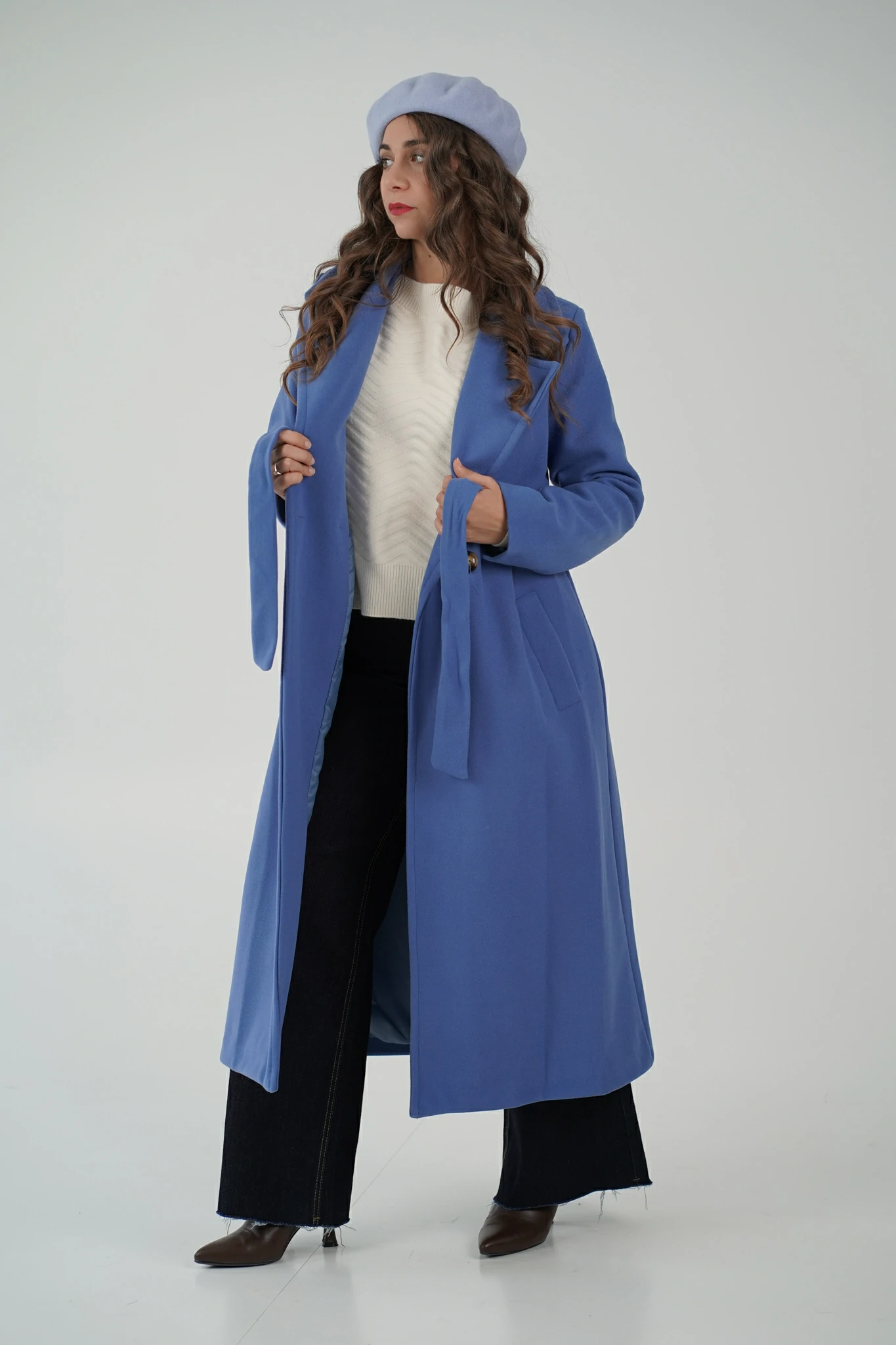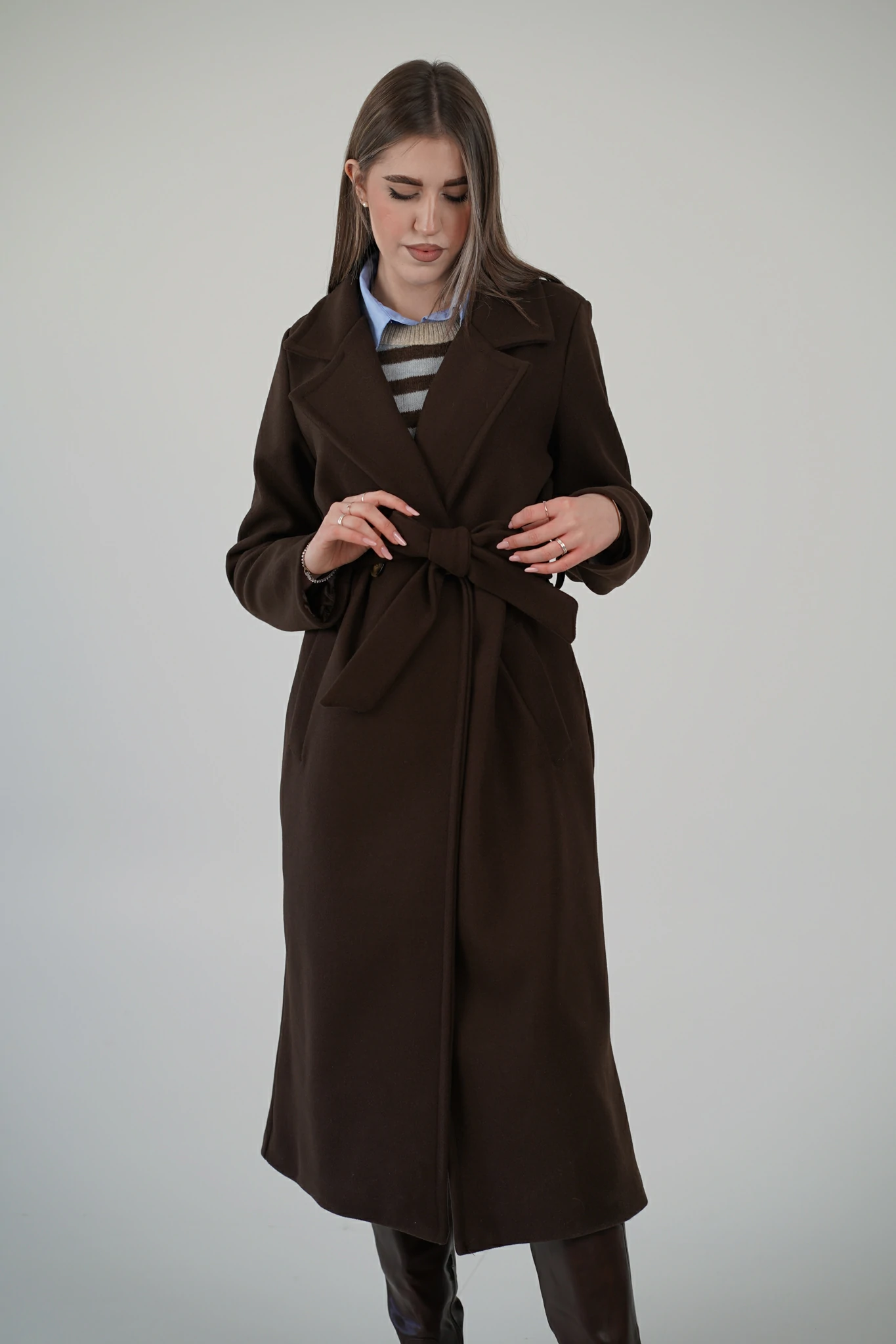 Modello con scollo revers, chiusura a doppio petto con bottoni, cintura in panno tono su tono da stringere sul punto vita e spallina leggermente imbottita