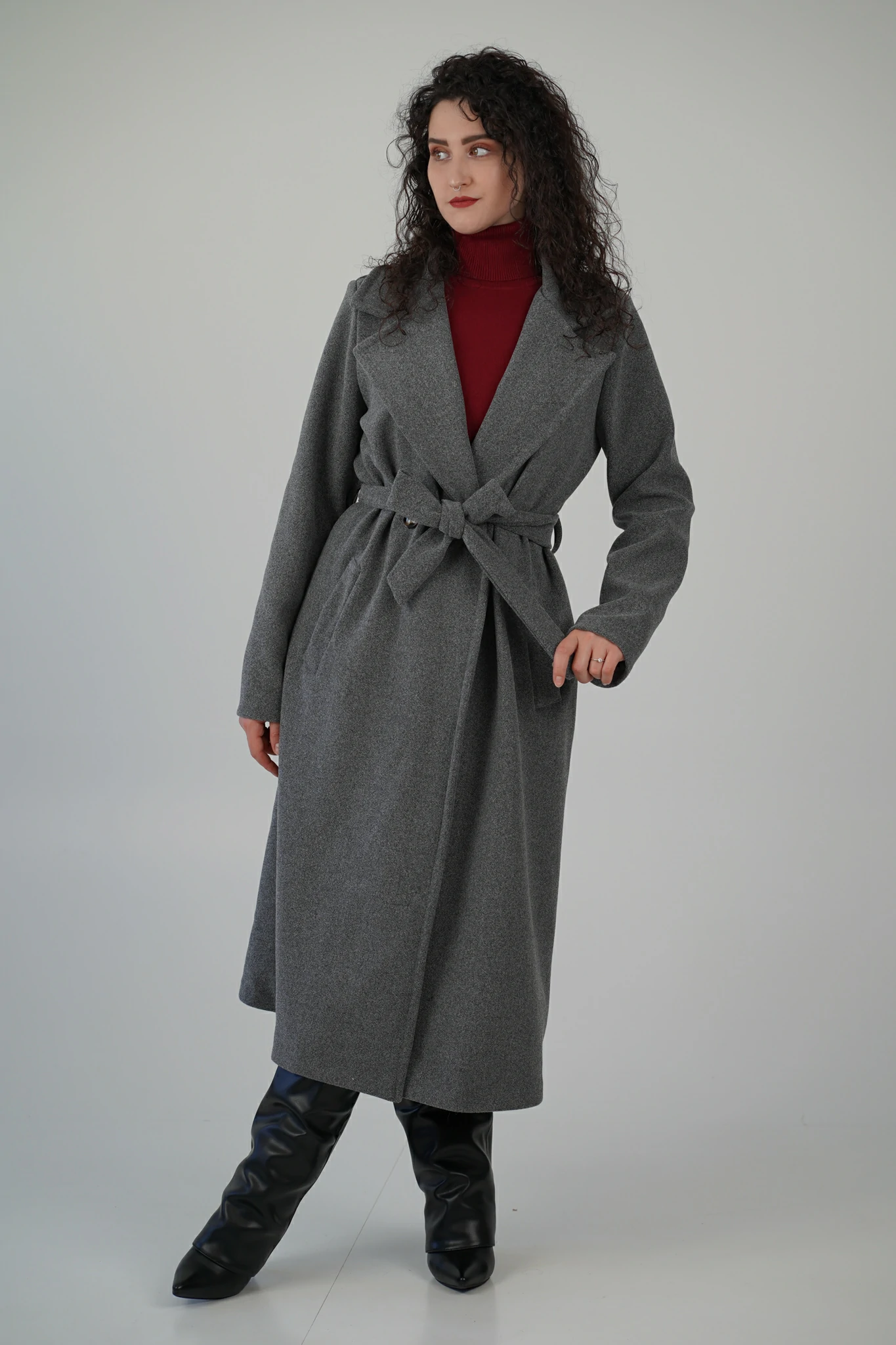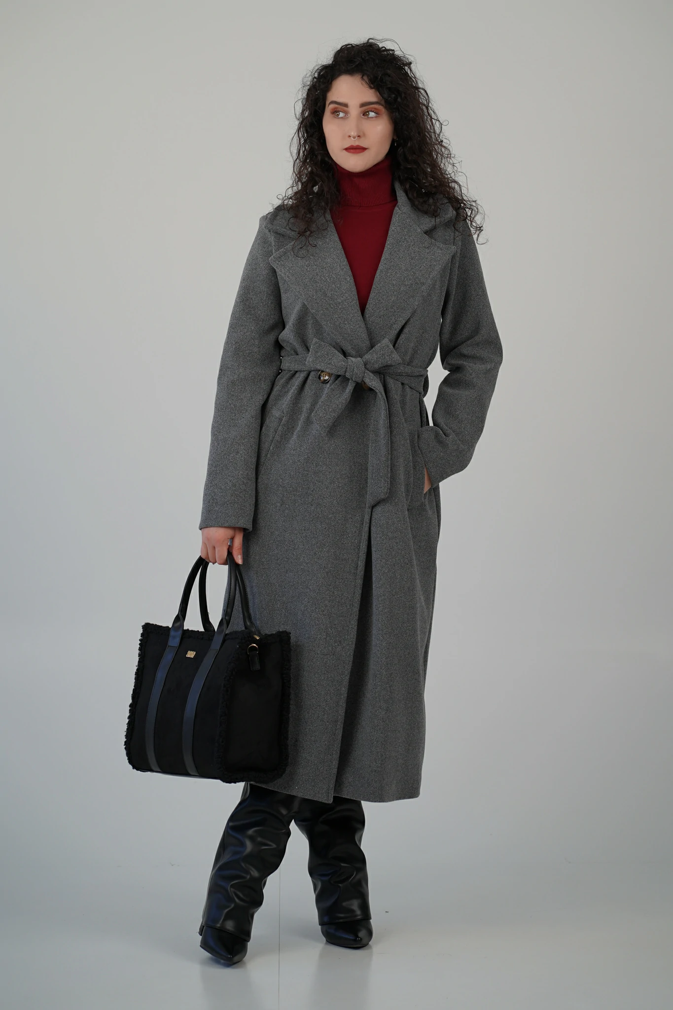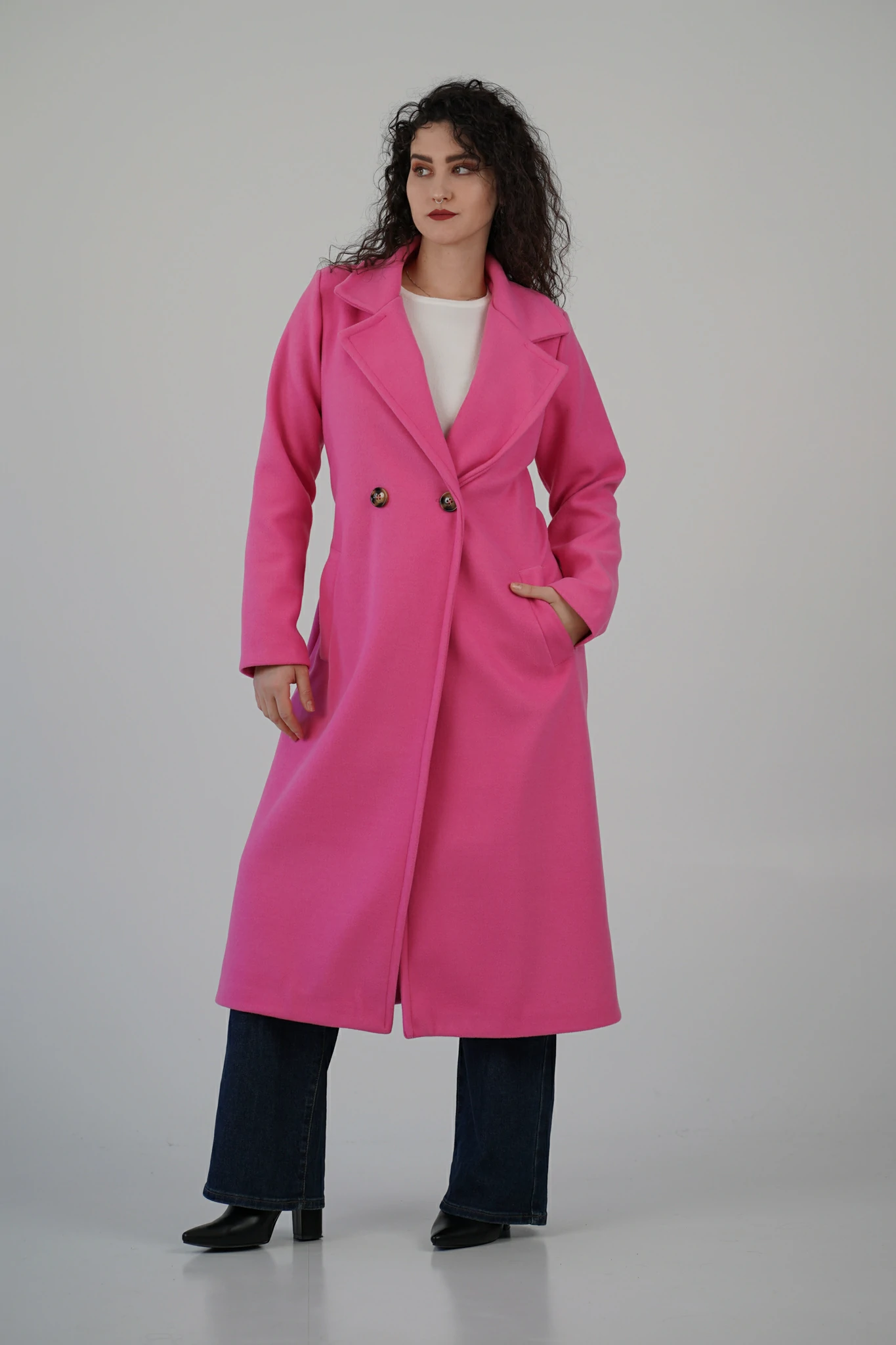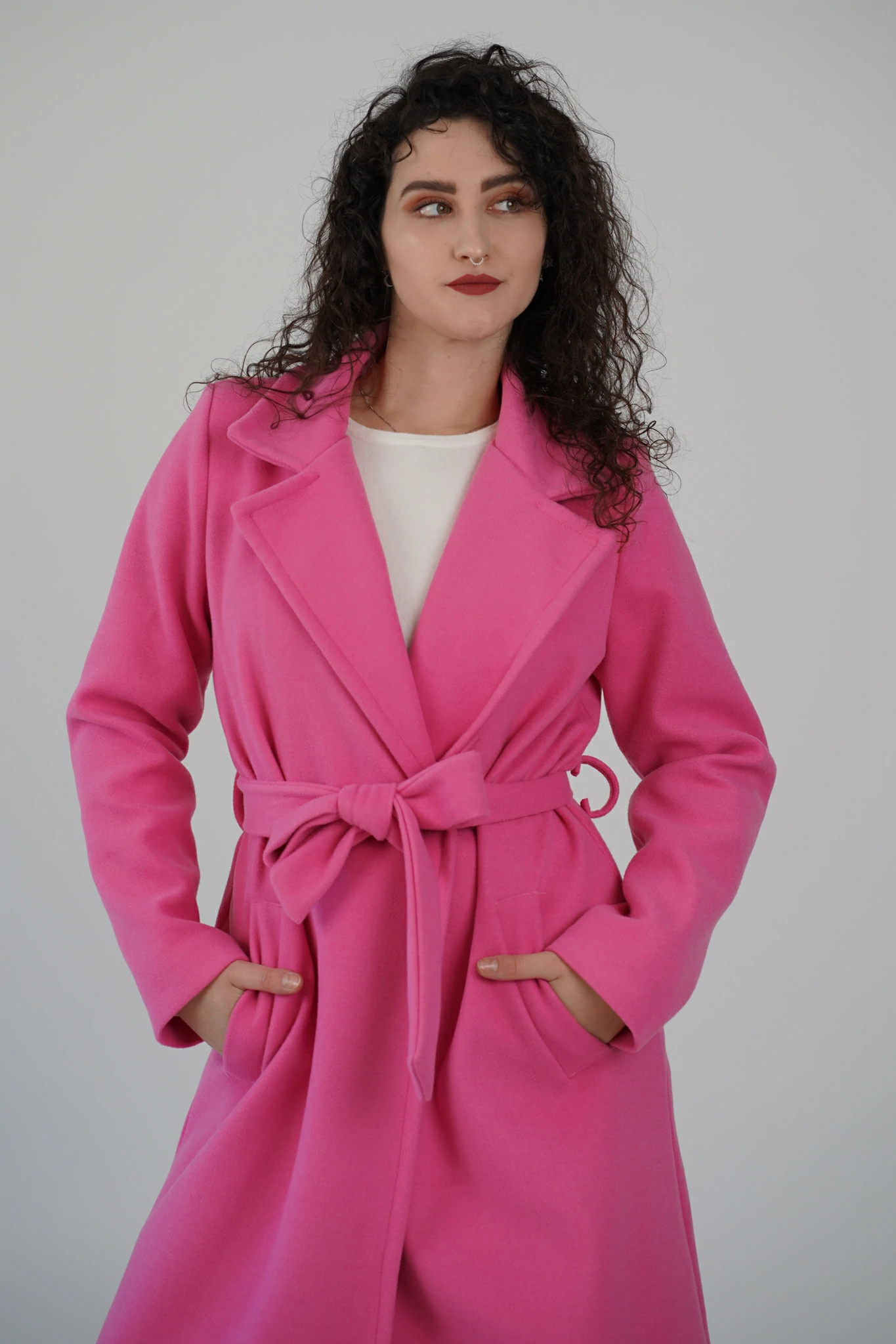 Modello con scollo revers, chiusura a doppio petto con bottoni, cintura in panno tono su tono da stringere sul punto vita e spallina leggermente imbottita