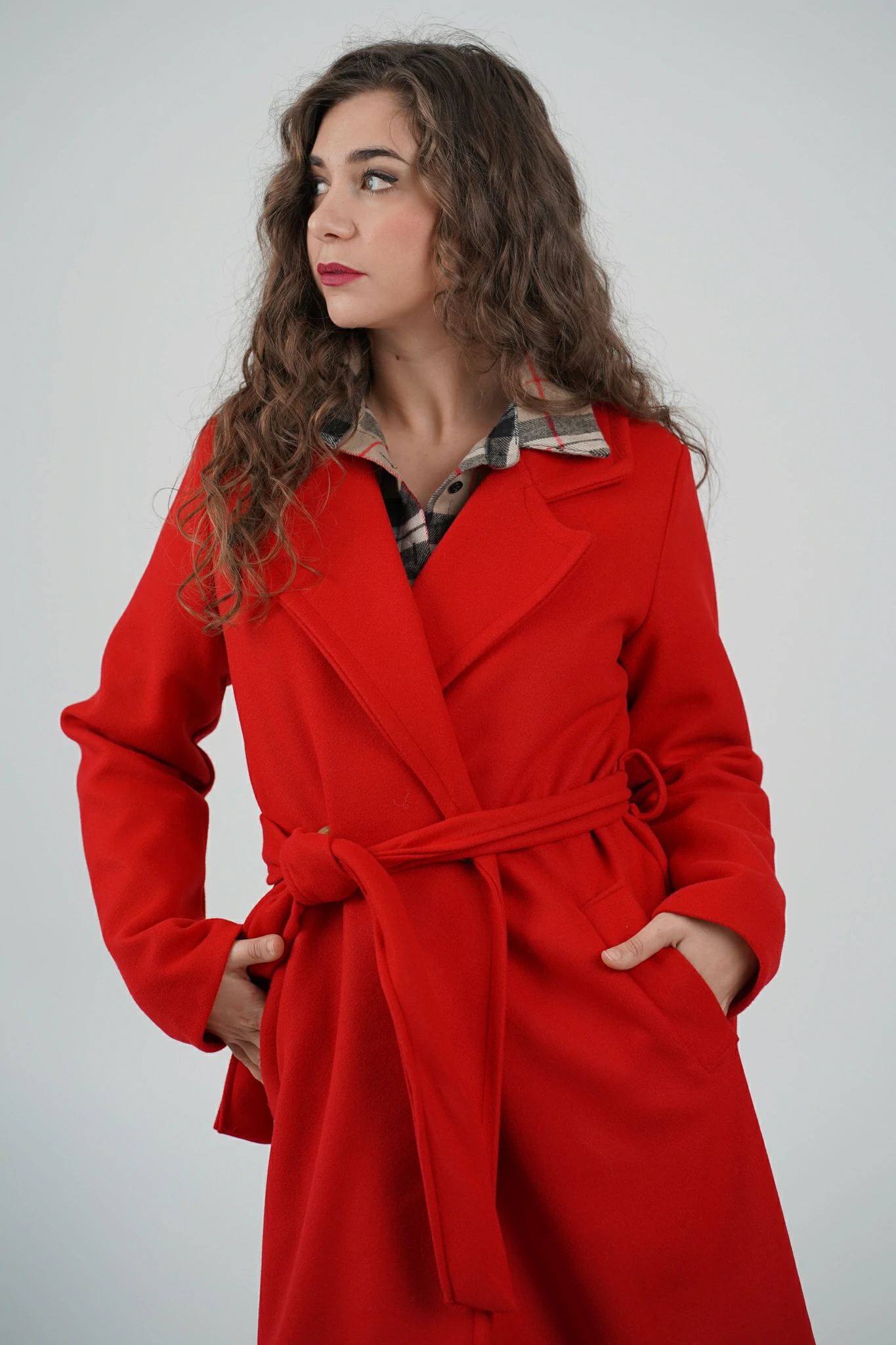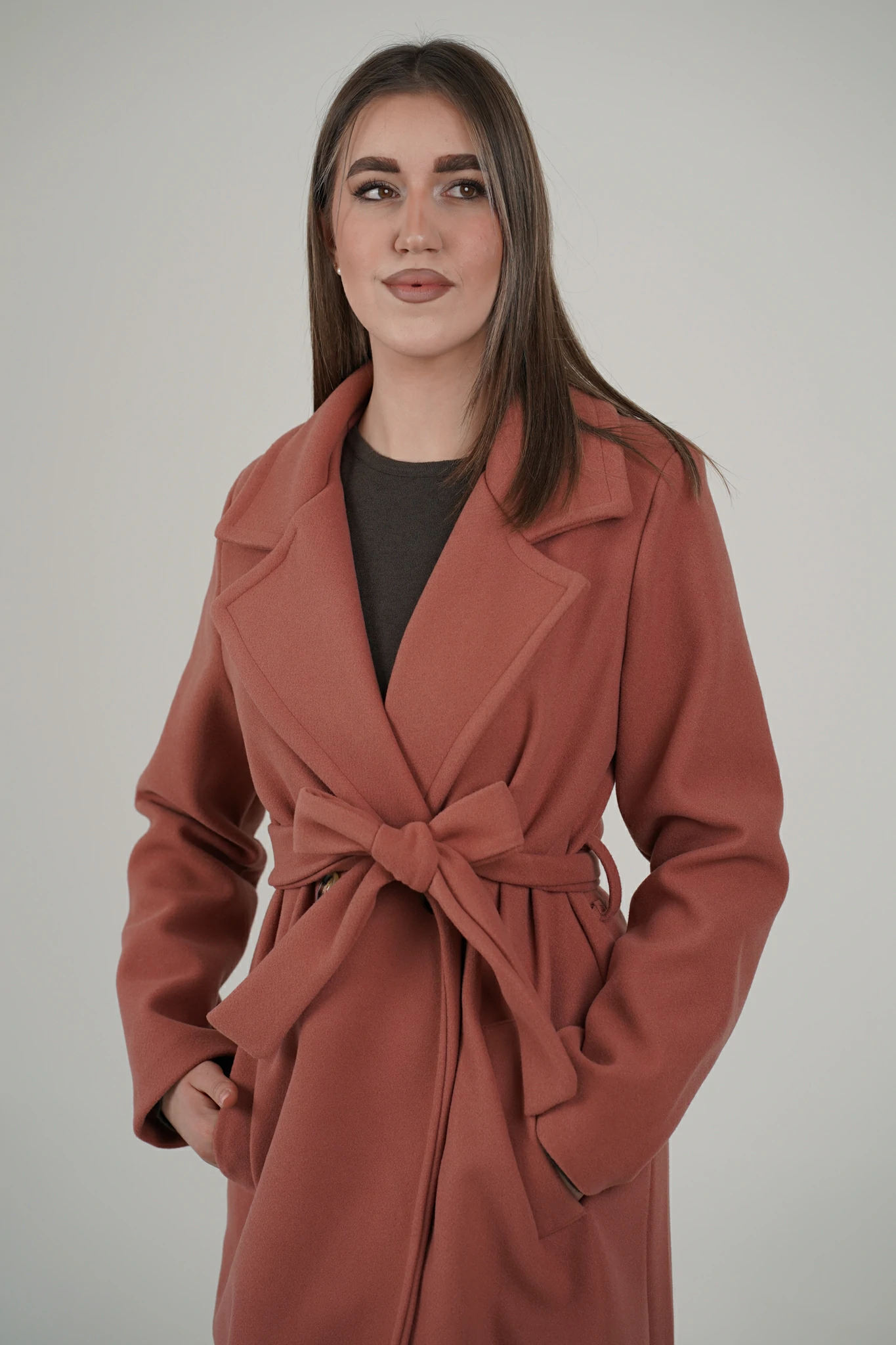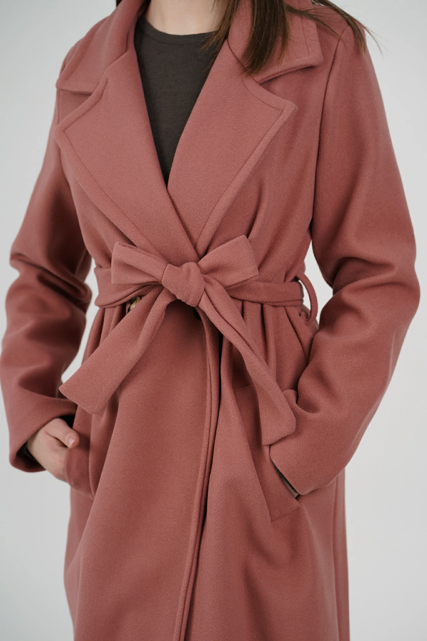 Modello con scollo revers, chiusura a doppio petto con bottoni, cintura in panno tono su tono da stringere sul punto vita e spallina leggermente imbottita