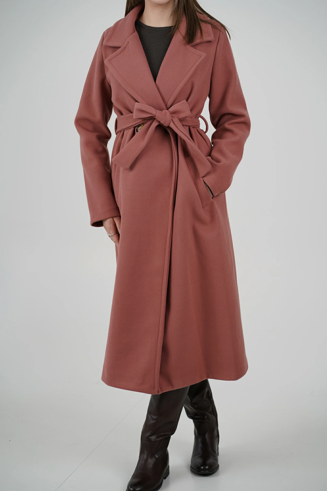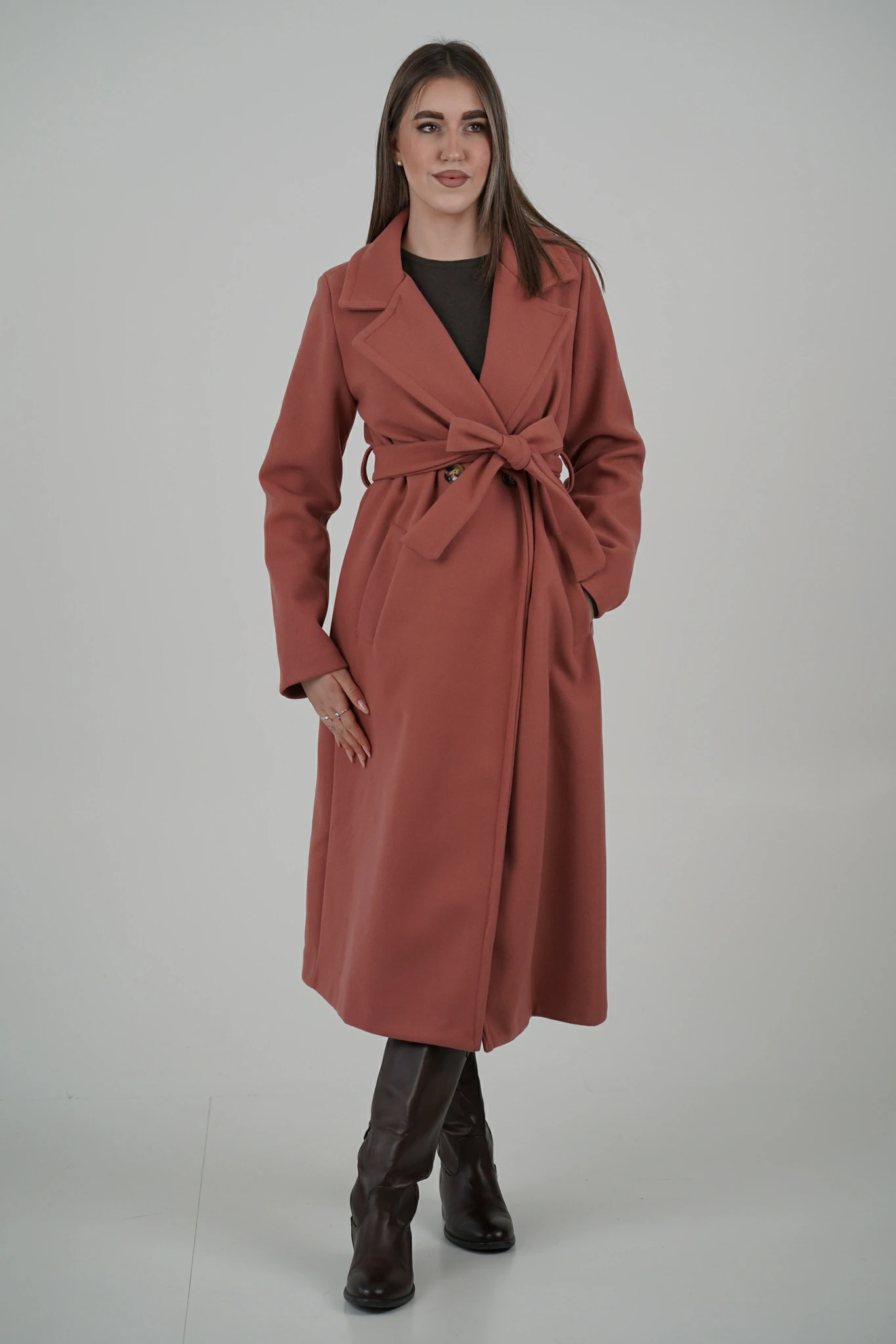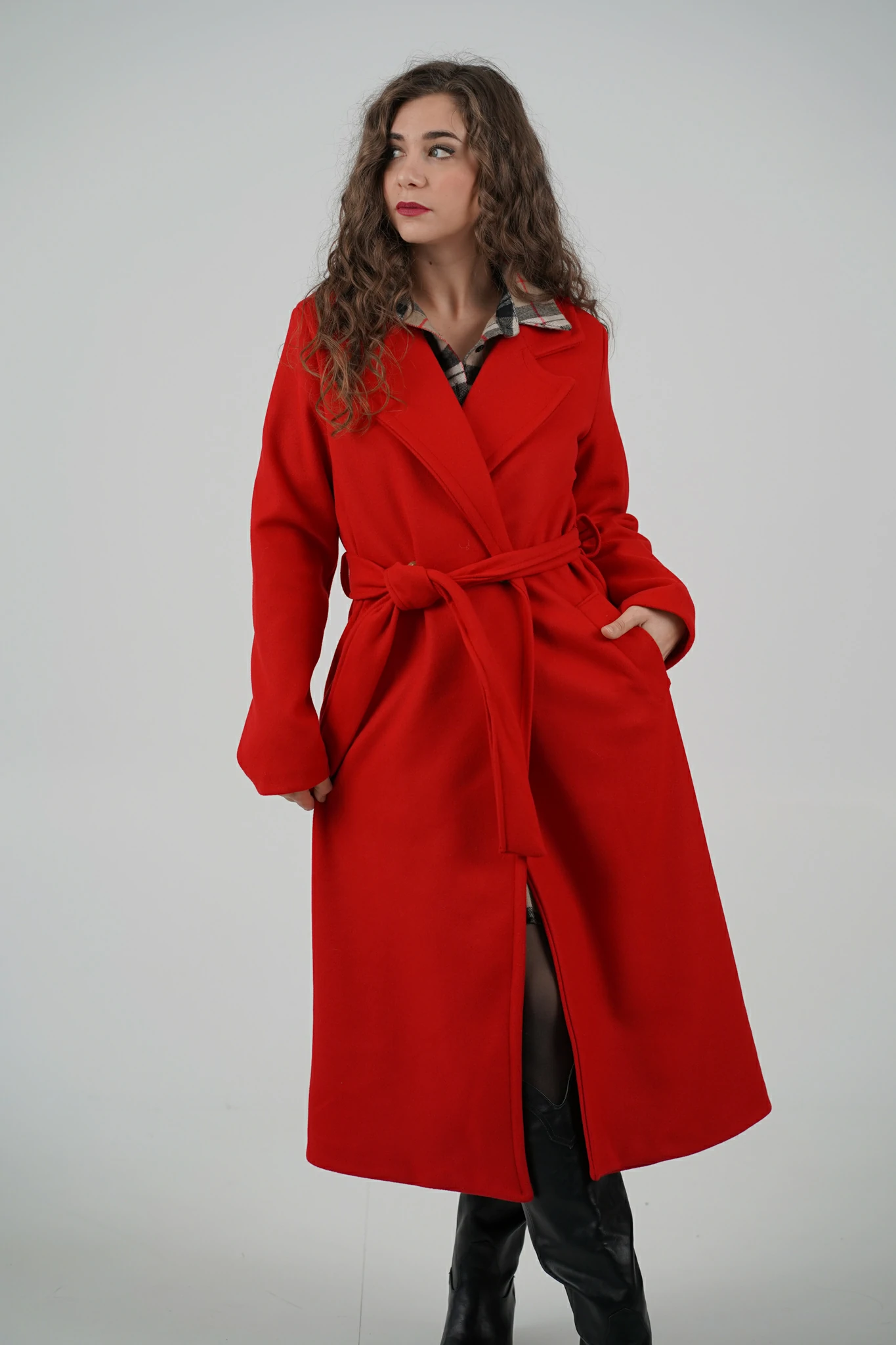 Modello con scollo revers, chiusura a doppio petto con bottoni, cintura in panno tono su tono da stringere sul punto vita e spallina leggermente imbottita