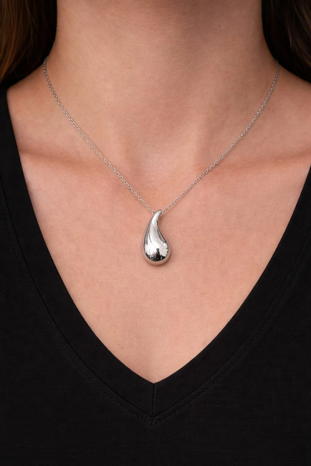 Linee fluide e design essenziale: questa collana con pendente a goccia effetto “liquido” è l’emblema dell’eleganza contemporanea. La superficie liscia e specchiata riflette la luce con delicatezza, creando un effetto luminoso ma sofisticato.