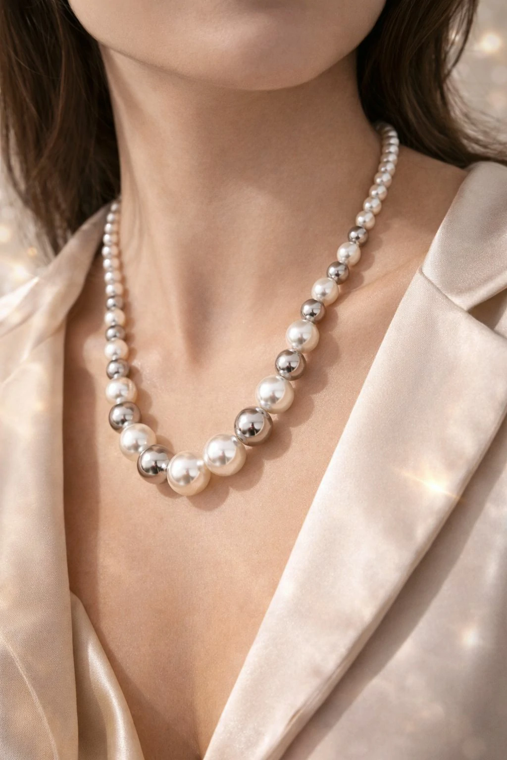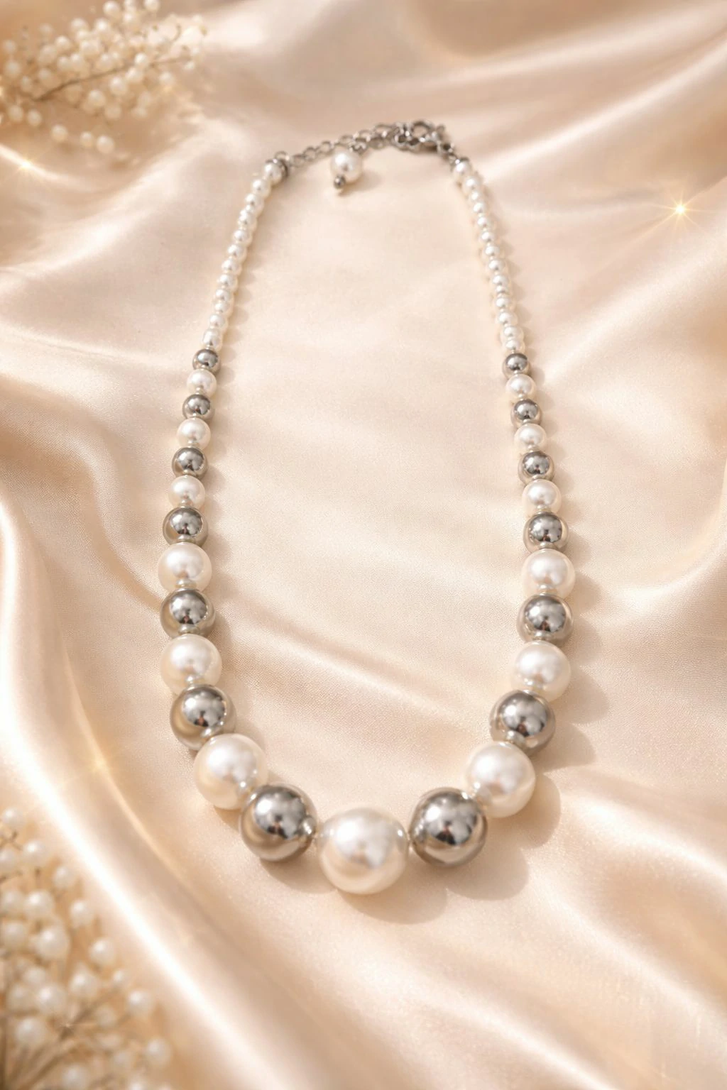 Collana dal design elegante e armonioso, caratterizzata da un’alternanza di perle luminose e sfere metalliche che creano un raffinato gioco di contrasti.