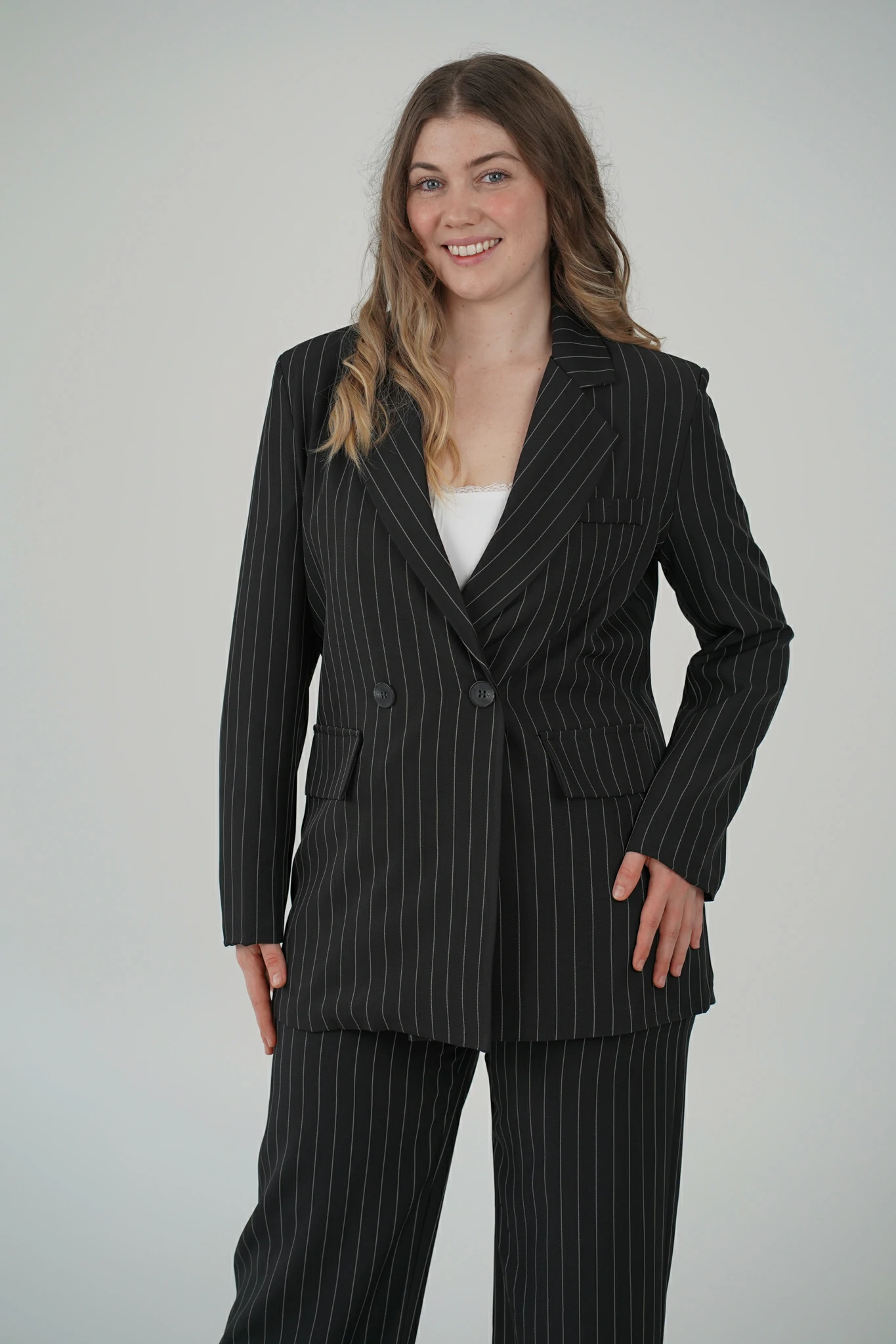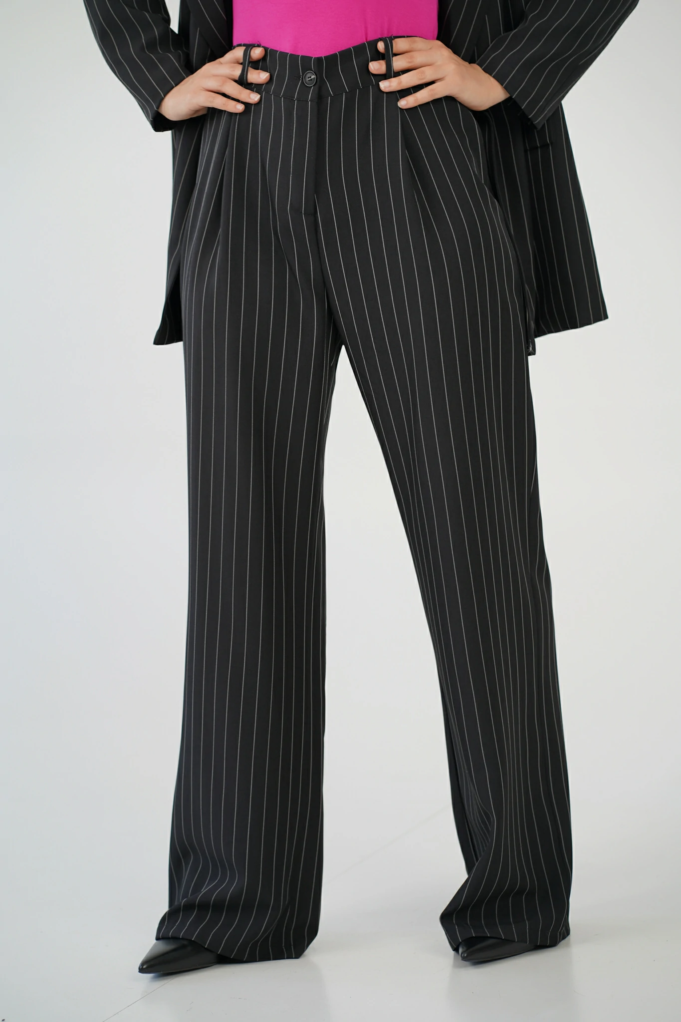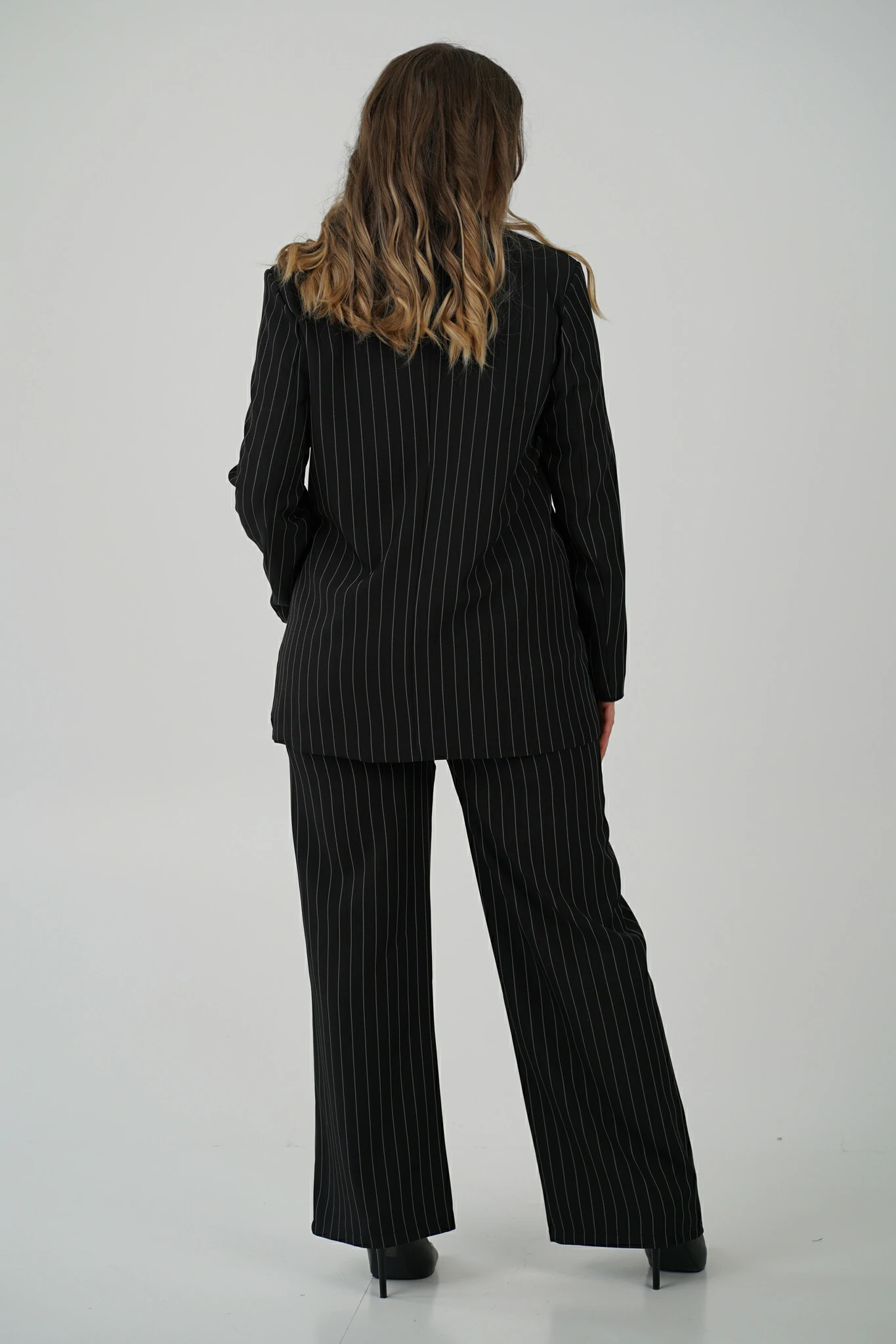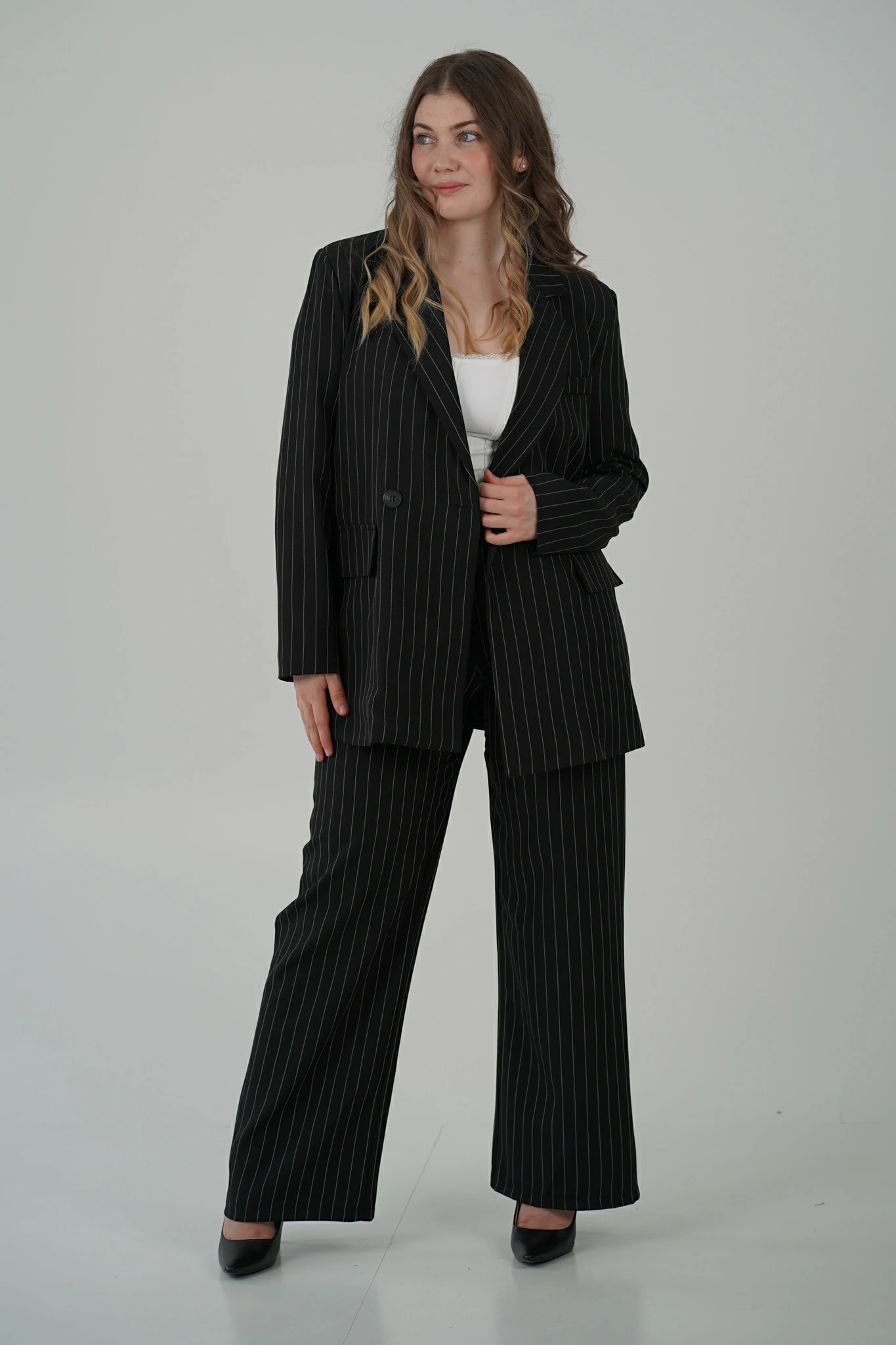 Indossi il completo Icon, e ogni dettaglio, la linea verticale, il tessuto che accarezza il movimento, il contrasto tra il bianco e il nero della texture, ti ricordano la donna che sei.