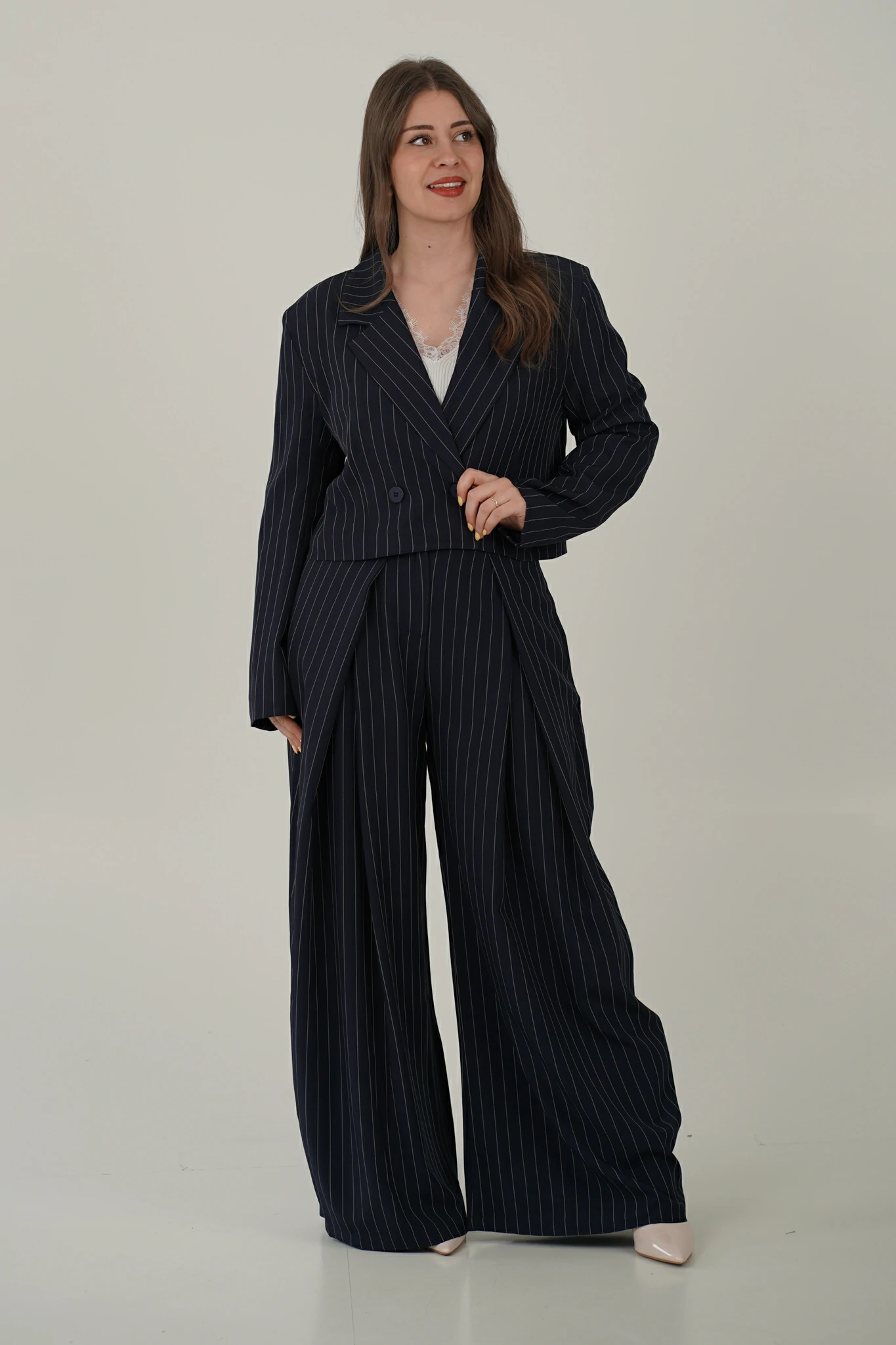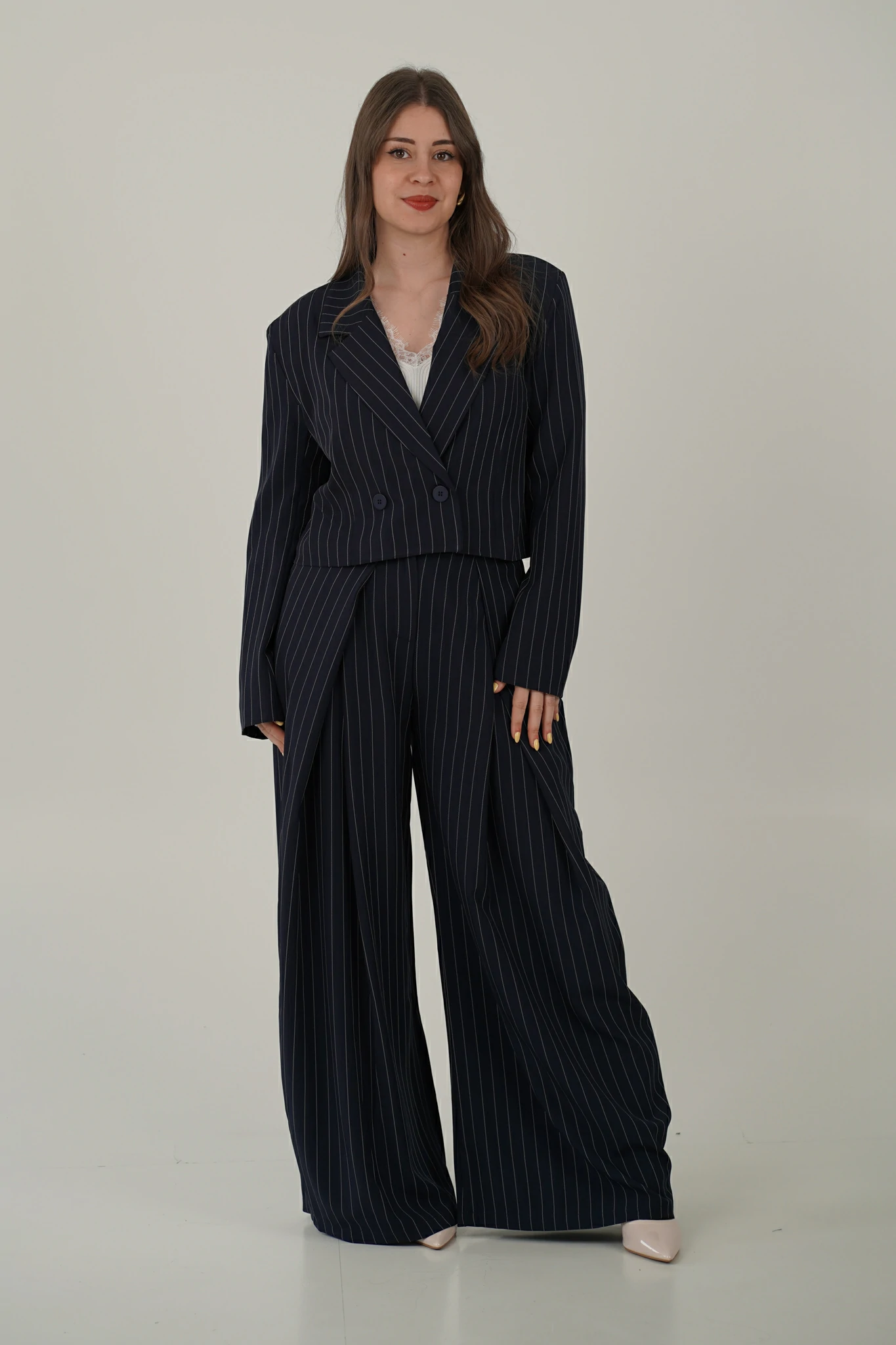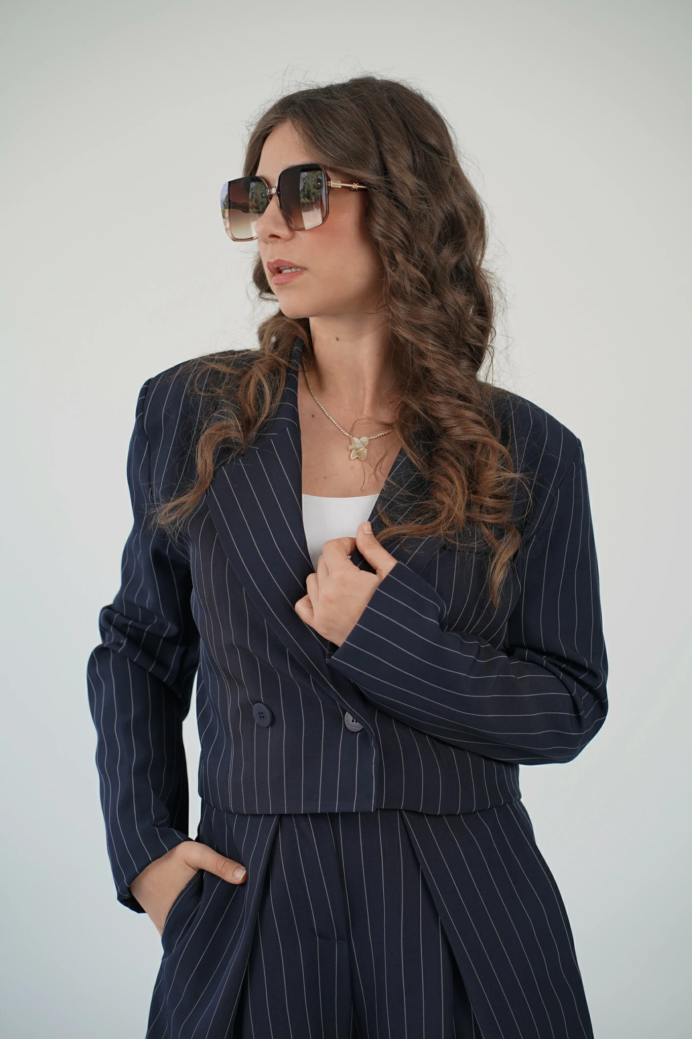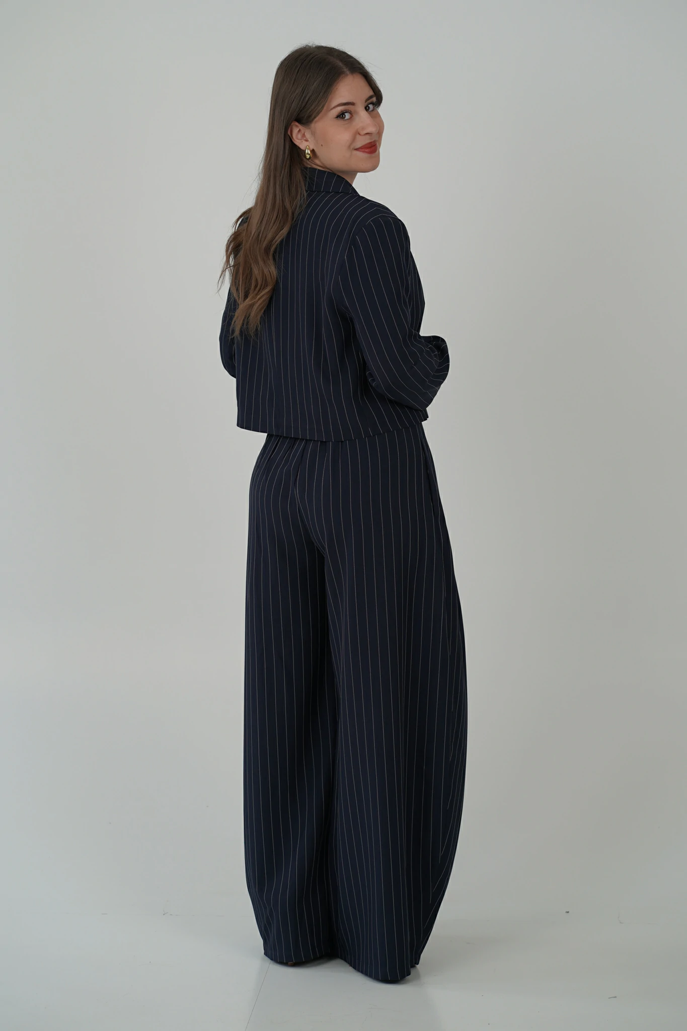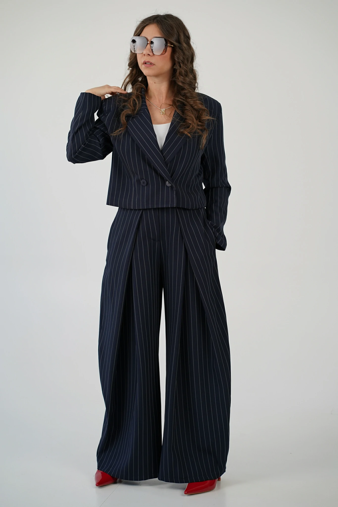 La giacca, leggermente corta e strutturata, accompagna con naturalezza i movimenti, mentre i pantaloni ampi e dinamici fluiscono come una promessa di libertà. Il gessato sottile allunga la figura e sottolinea l’equilibrio tra rigore e grazia, forza e leggerezza. È un abito pensato per la donna che non ha bisogno di chiedere spazio, perché lo occupa con stile.