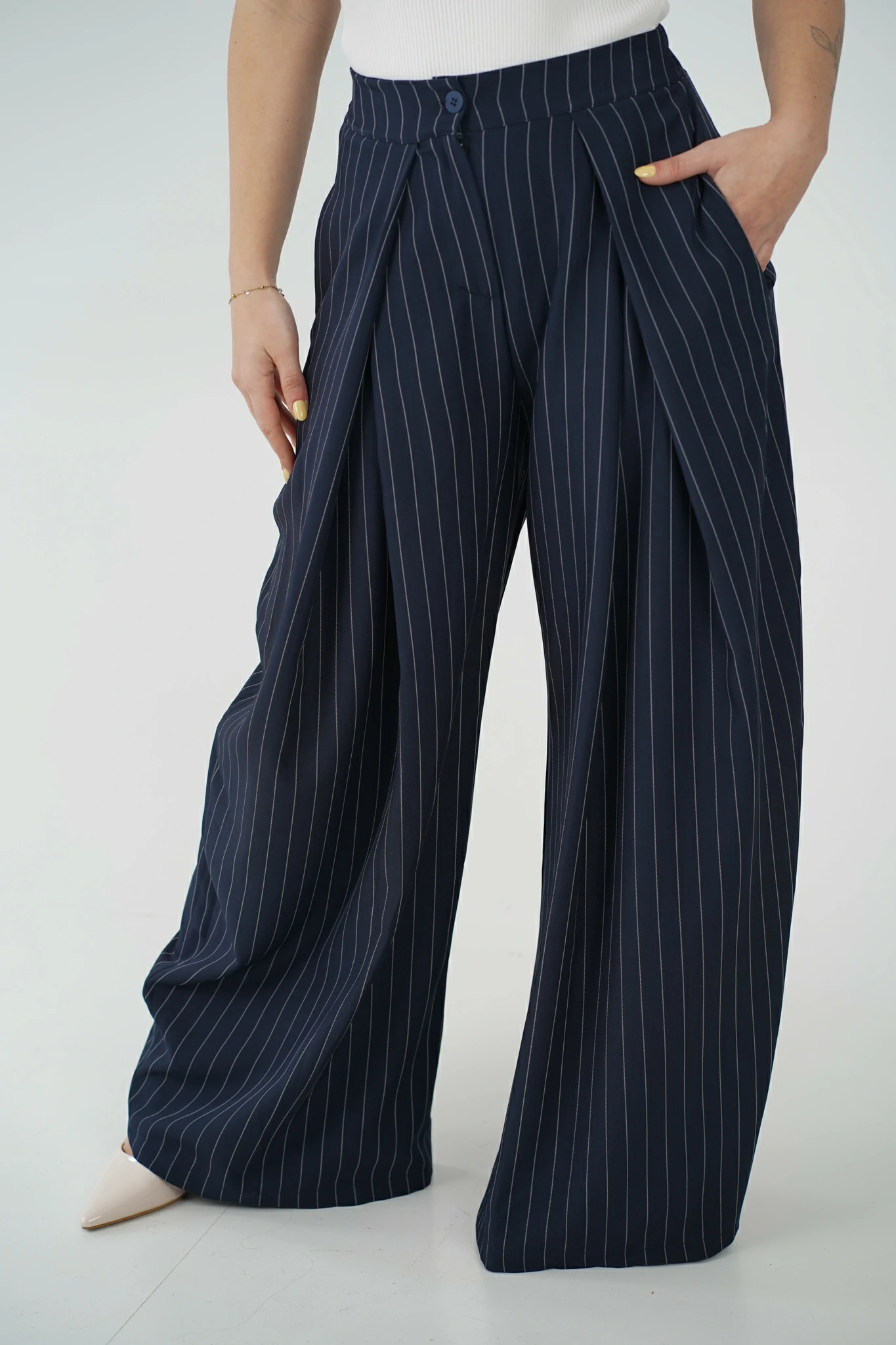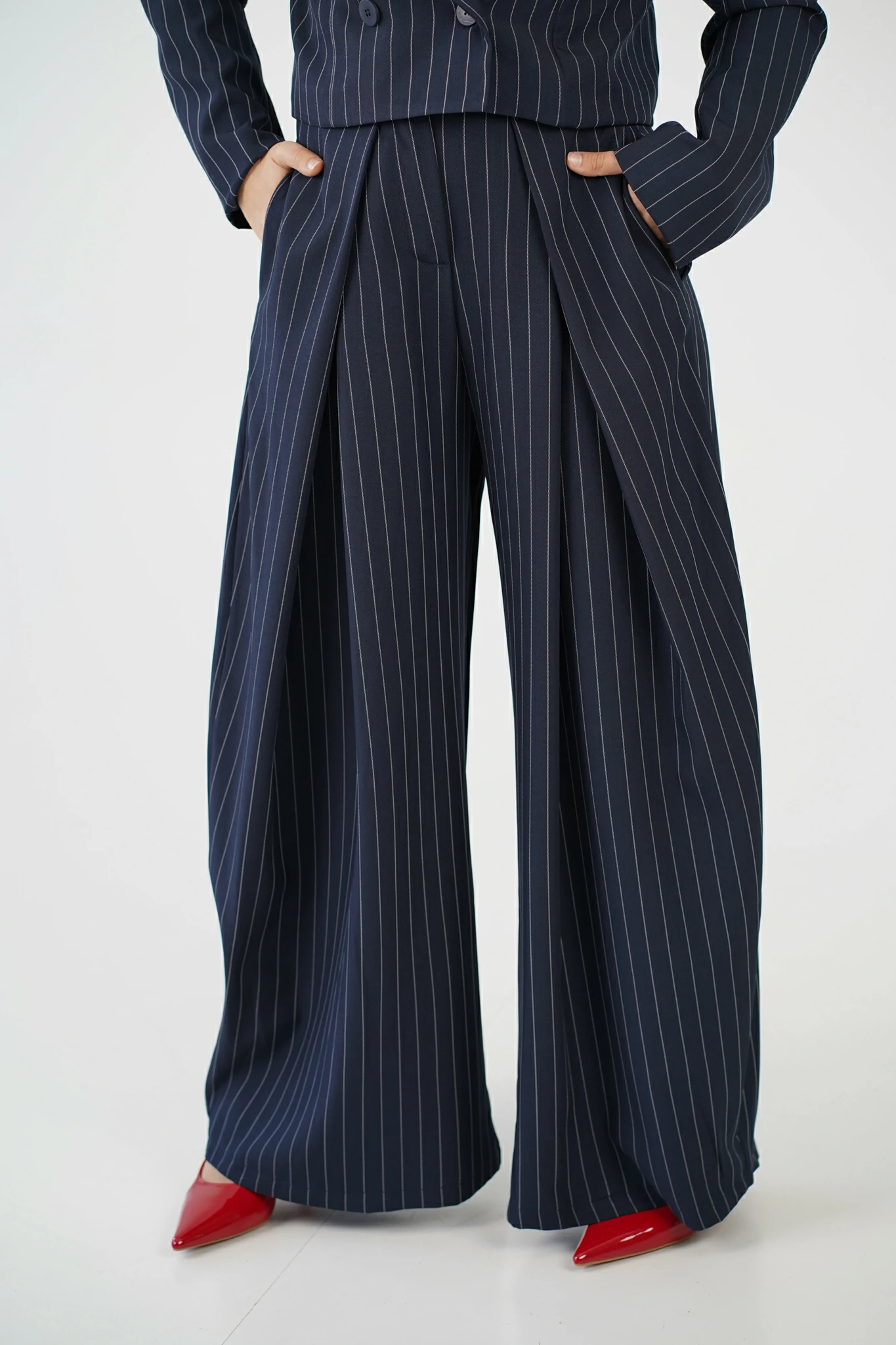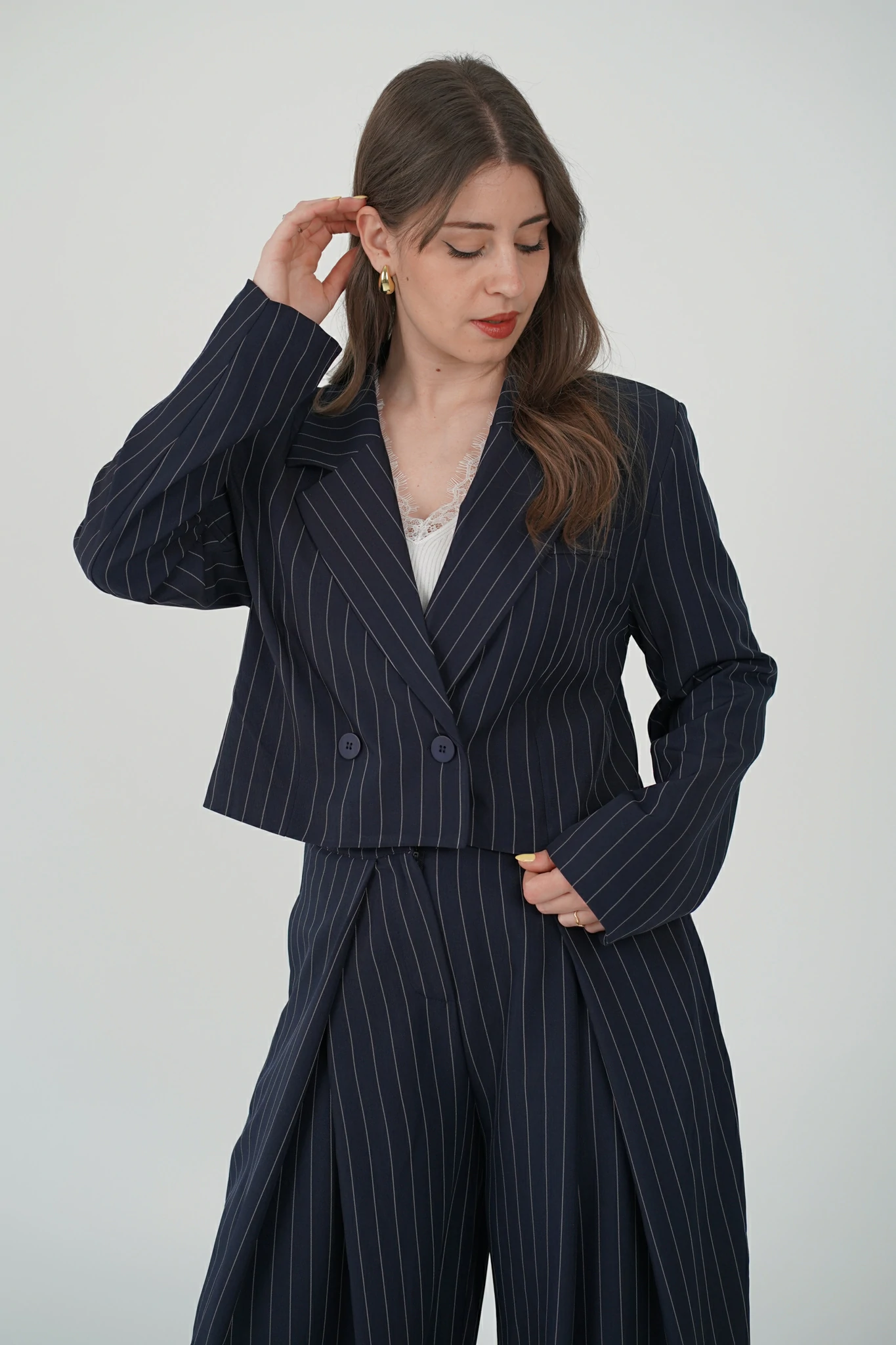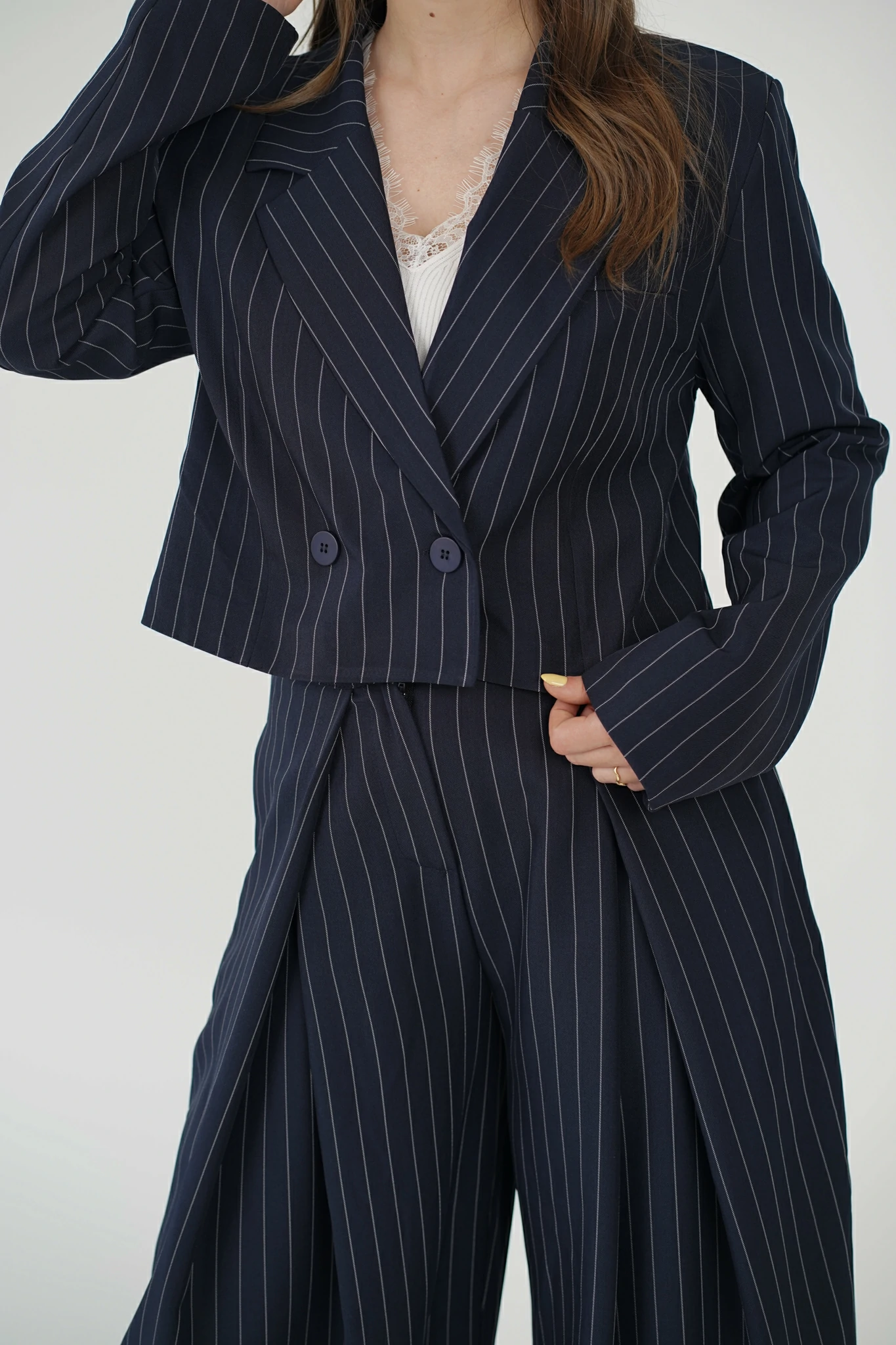 La giacca, leggermente corta e strutturata, accompagna con naturalezza i movimenti, mentre i pantaloni ampi e dinamici fluiscono come una promessa di libertà. Il gessato sottile allunga la figura e sottolinea l’equilibrio tra rigore e grazia, forza e leggerezza. È un abito pensato per la donna che non ha bisogno di chiedere spazio, perché lo occupa con stile.