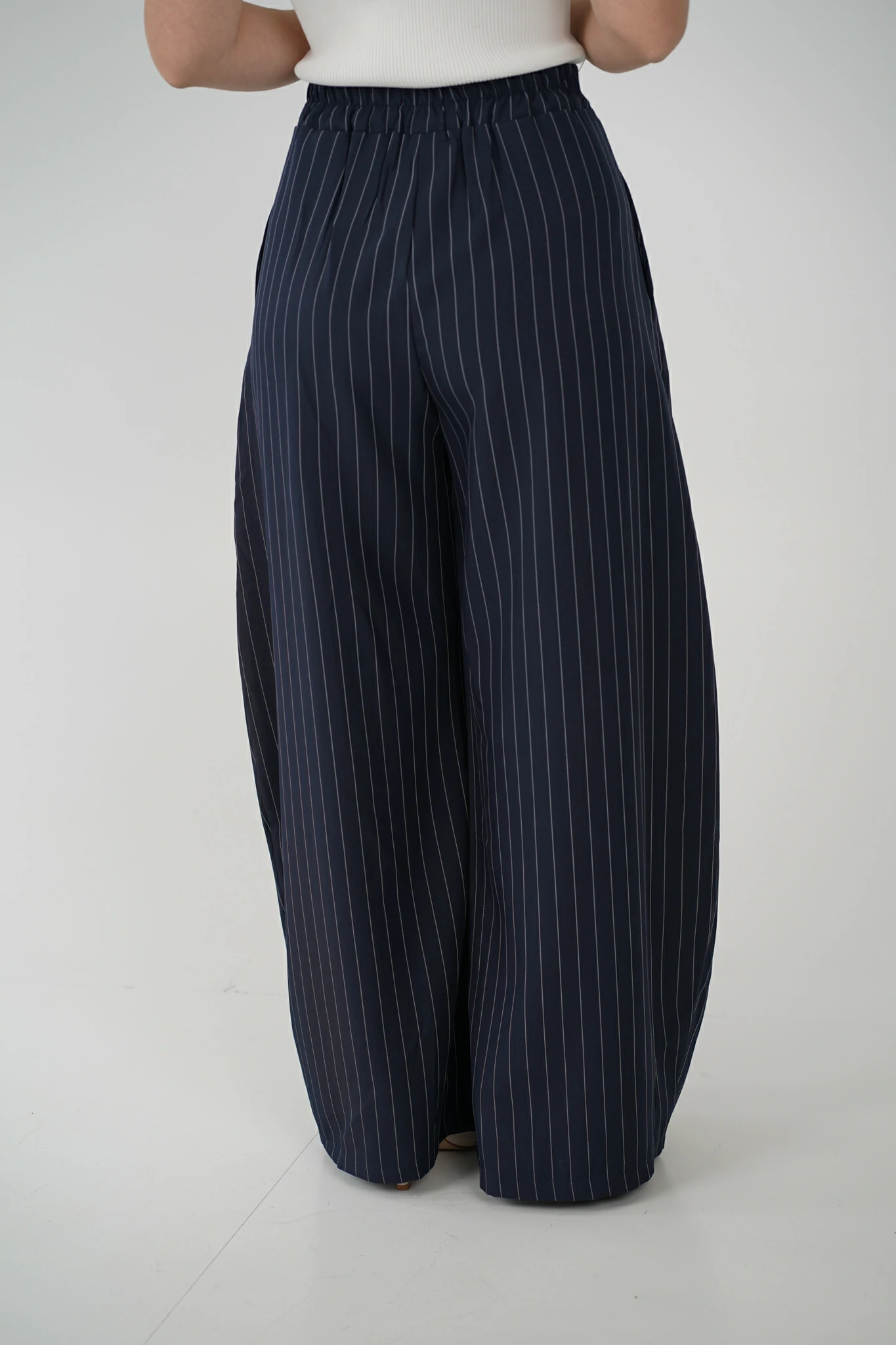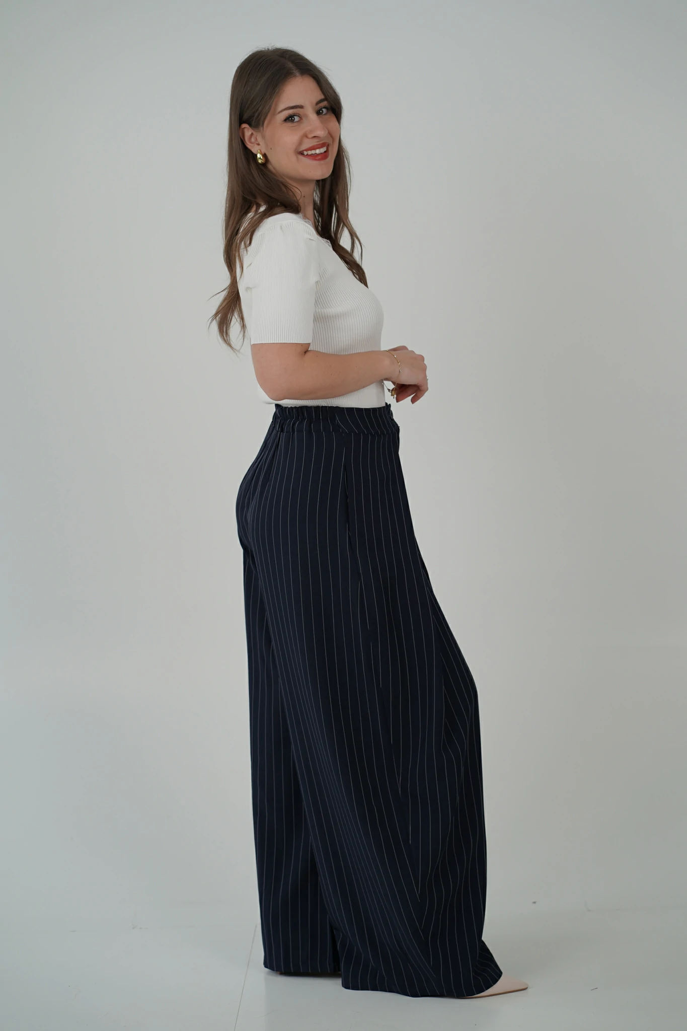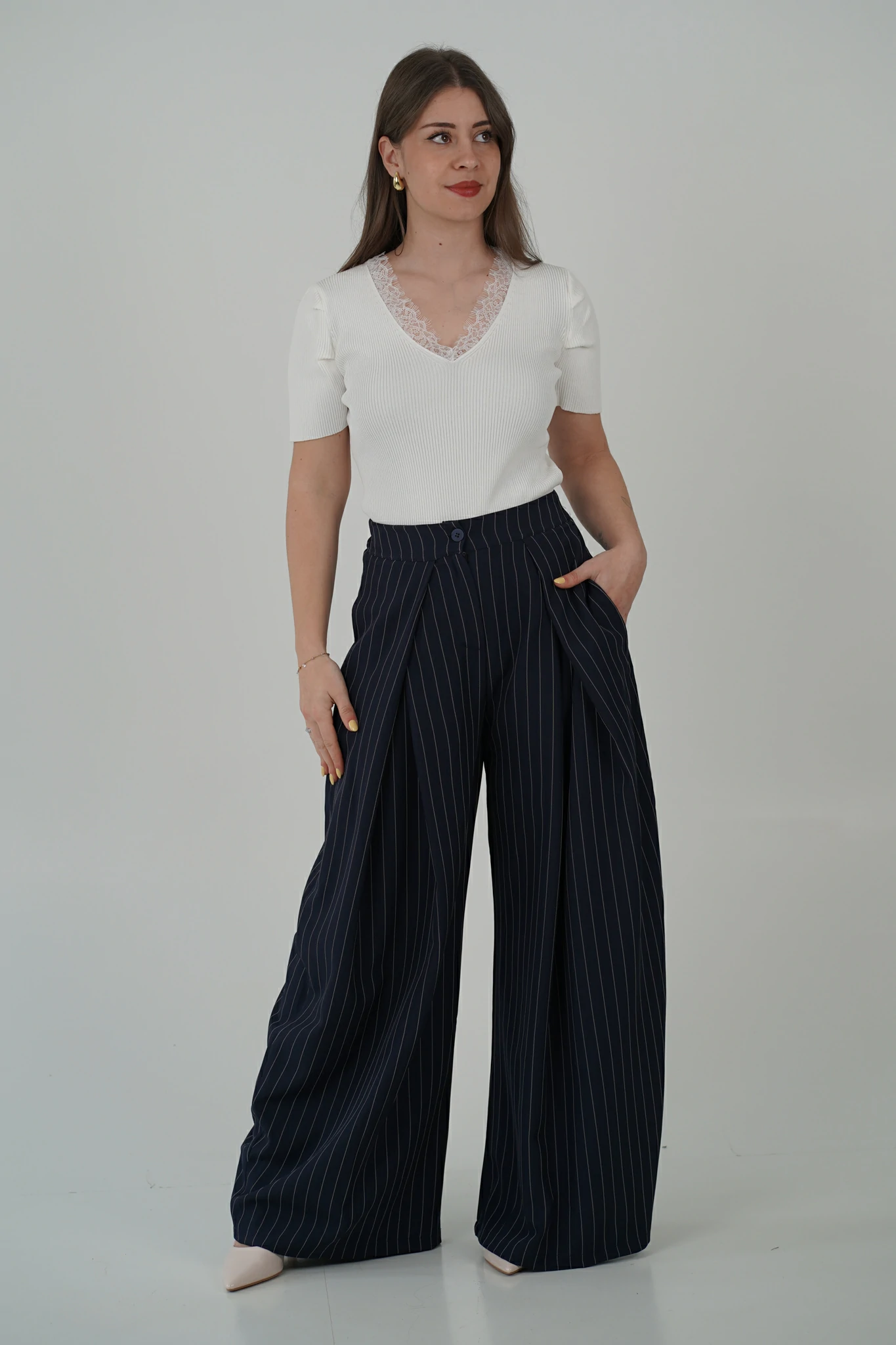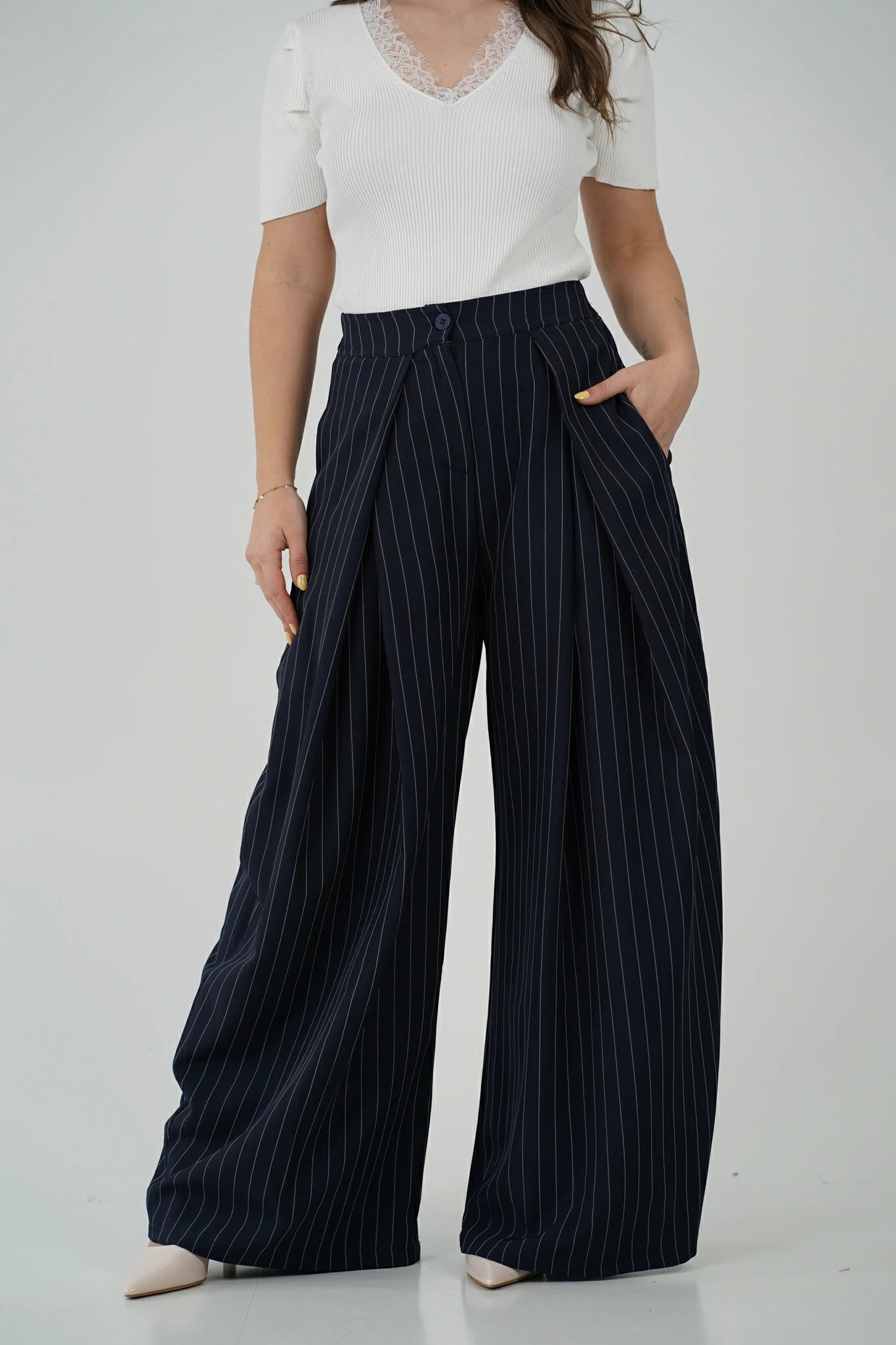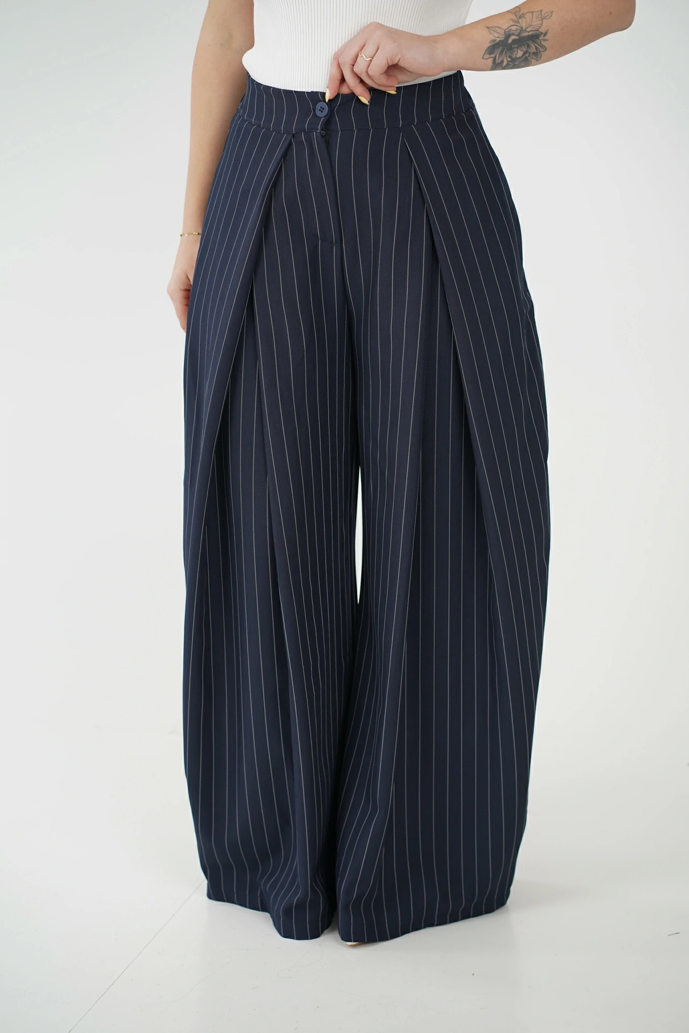 La giacca, leggermente corta e strutturata, accompagna con naturalezza i movimenti, mentre i pantaloni ampi e dinamici fluiscono come una promessa di libertà. Il gessato sottile allunga la figura e sottolinea l’equilibrio tra rigore e grazia, forza e leggerezza. È un abito pensato per la donna che non ha bisogno di chiedere spazio, perché lo occupa con stile.