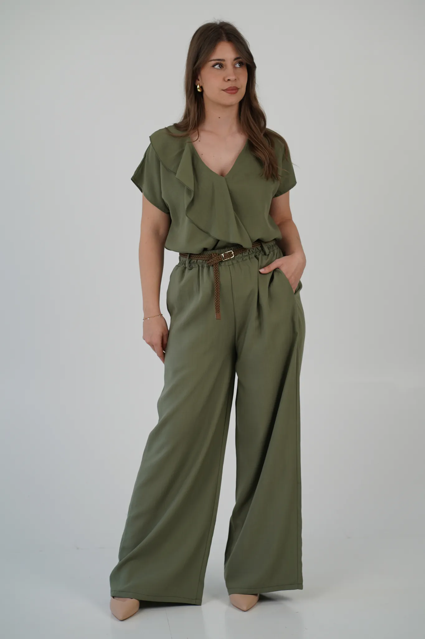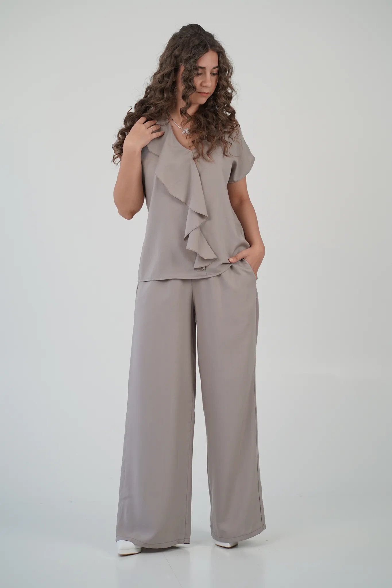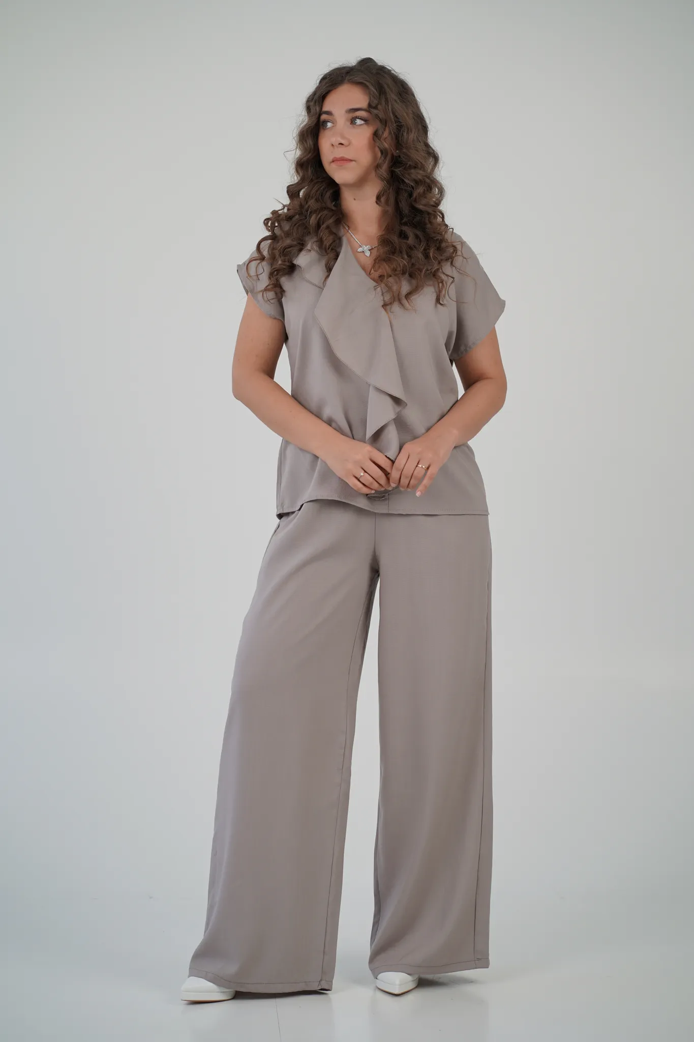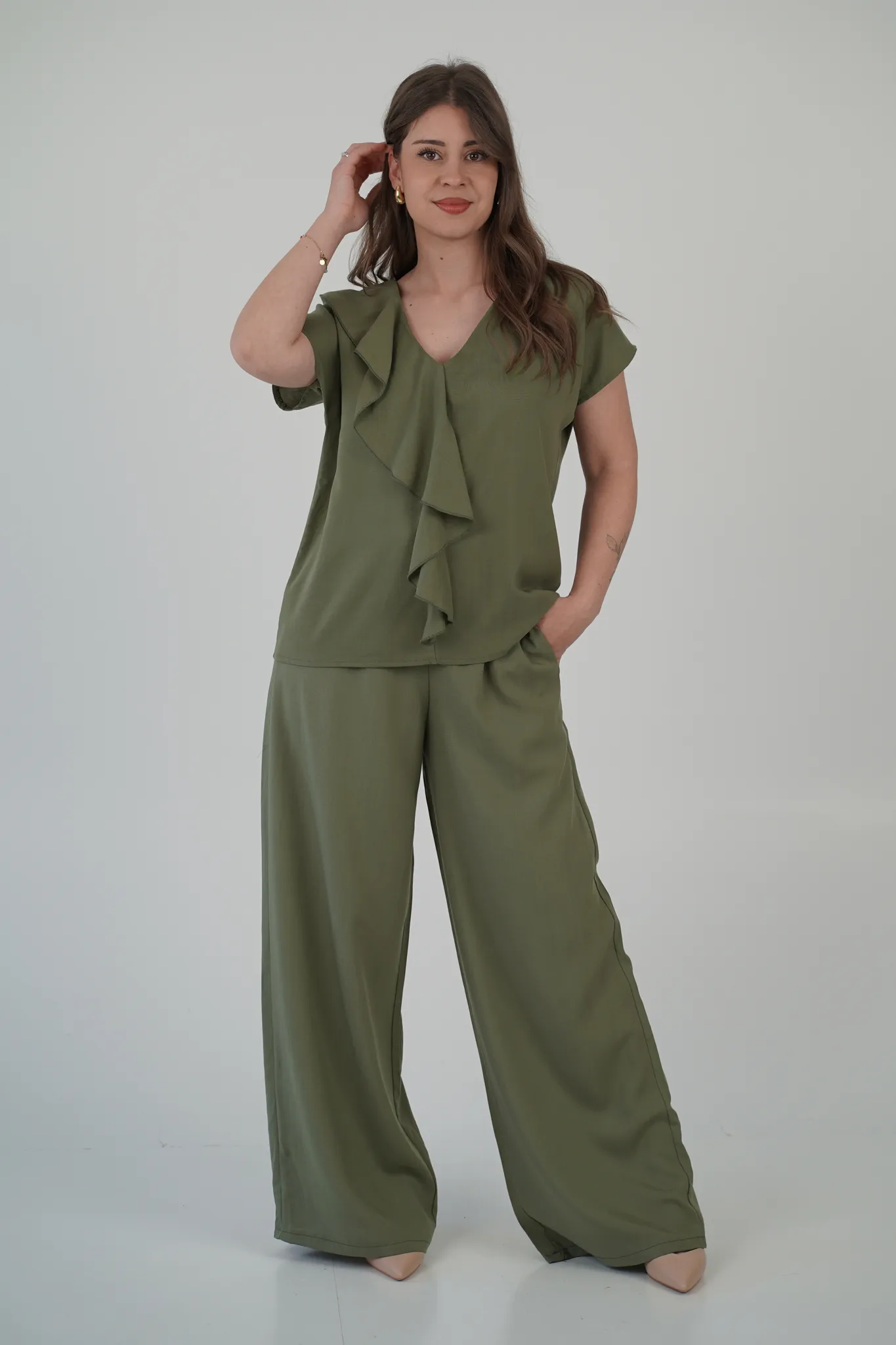 Il top con scollo a V e dettaglio morbido sul davanti aggiunge movimento e femminilità, senza risultare eccessivo, mentre il pantalone ampio con vita elasticizzata garantisce comfort e vestibilità impeccabile.
