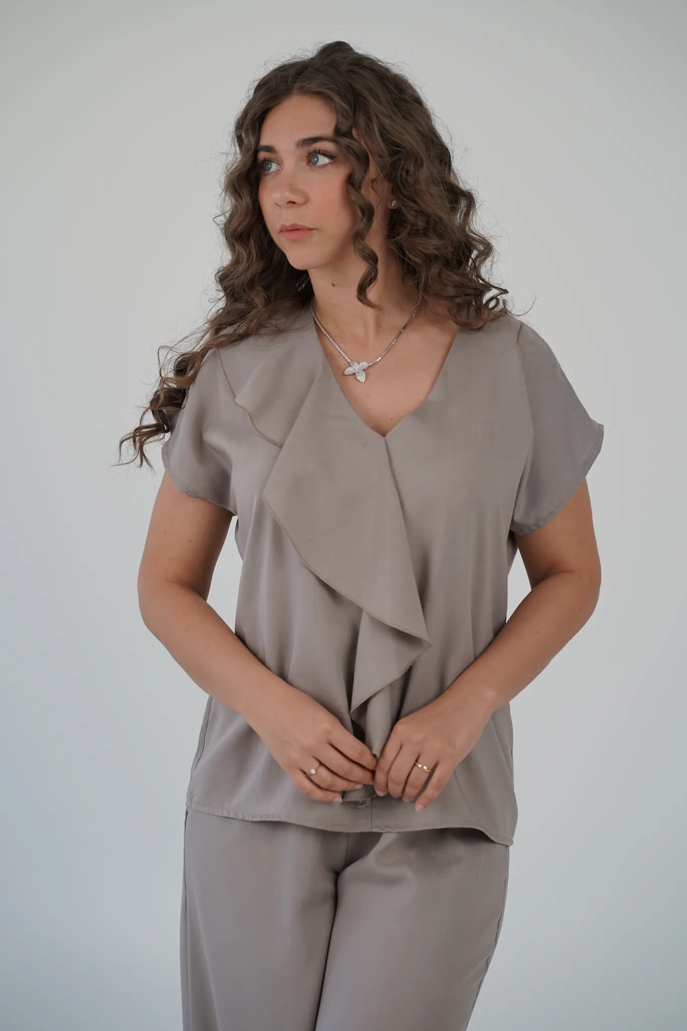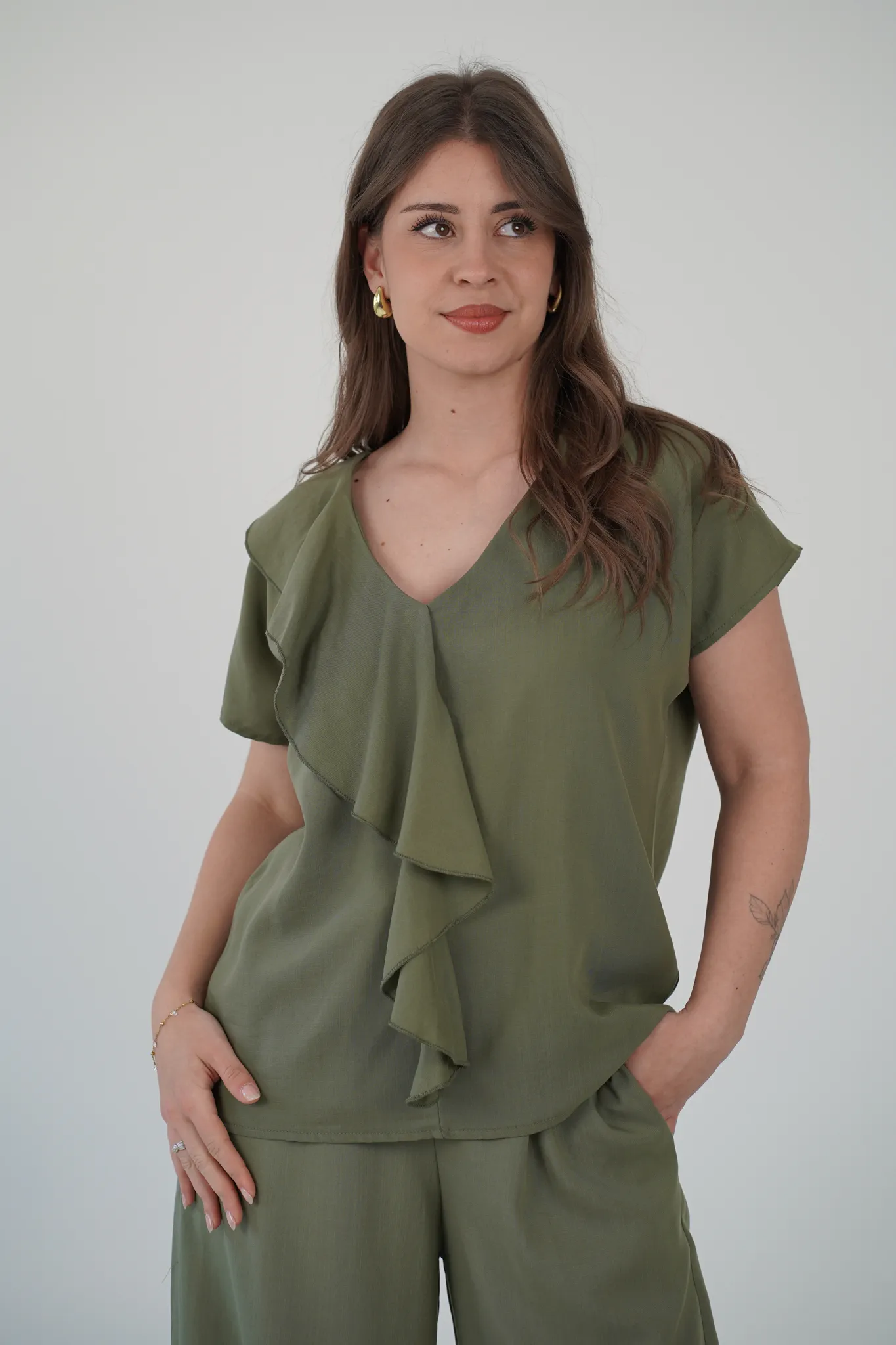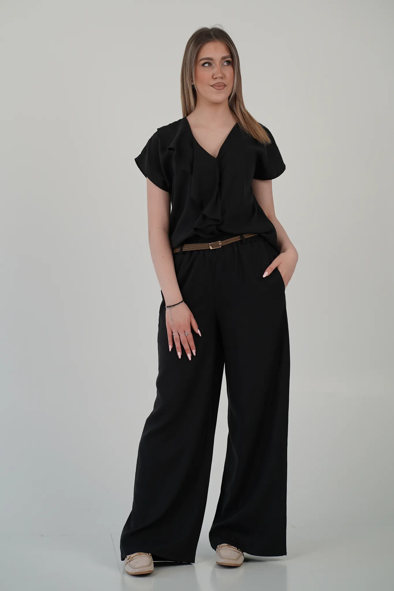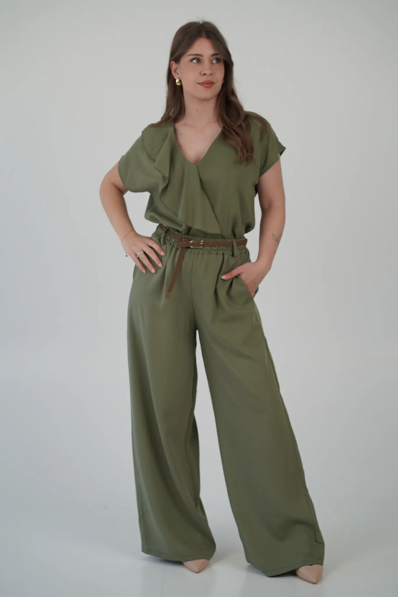 Il top con scollo a V e dettaglio morbido sul davanti aggiunge movimento e femminilità, senza risultare eccessivo, mentre il pantalone ampio con vita elasticizzata garantisce comfort e vestibilità impeccabile.