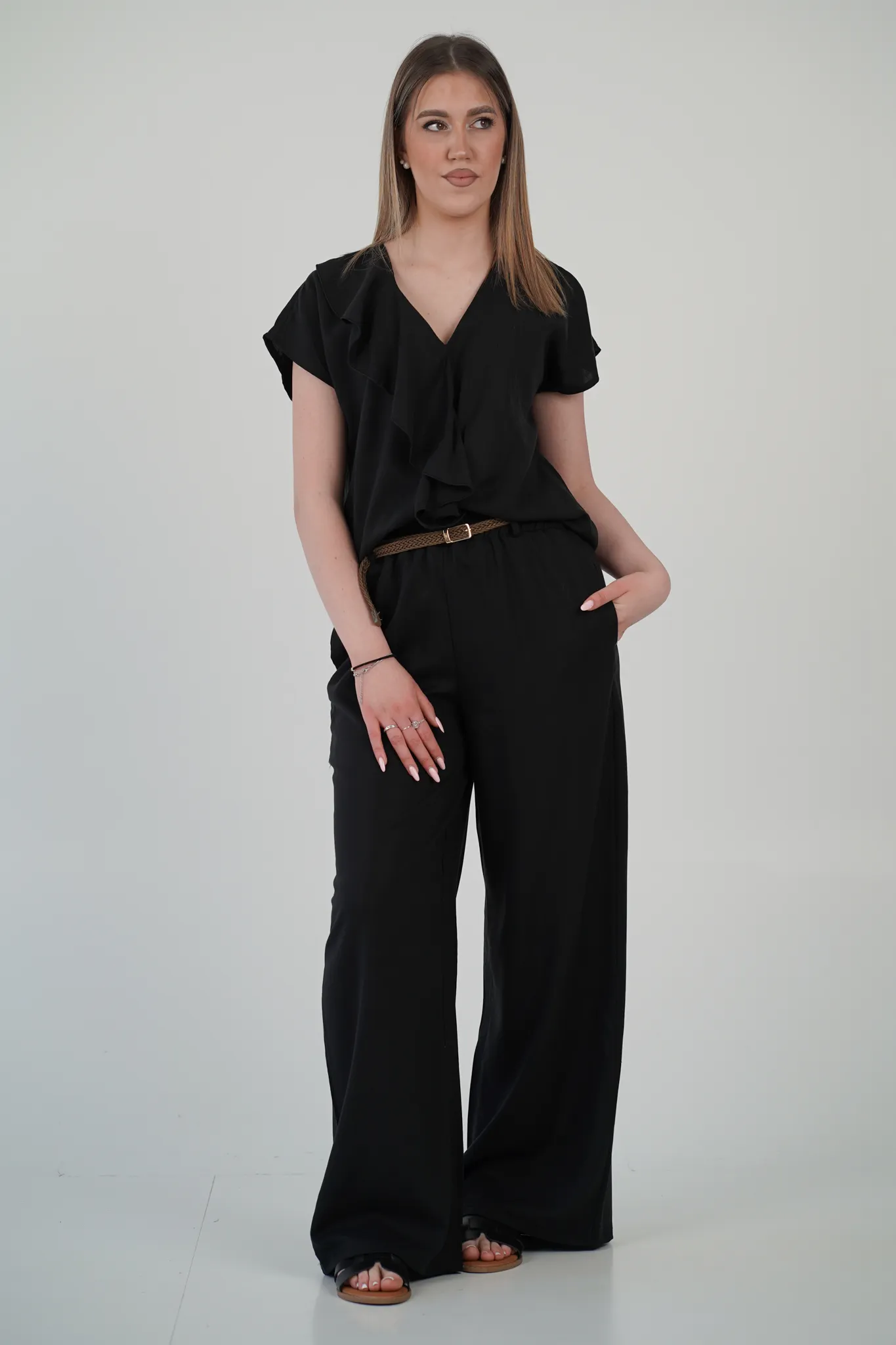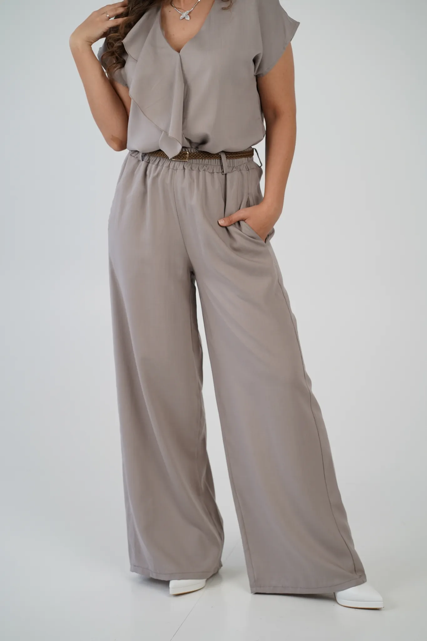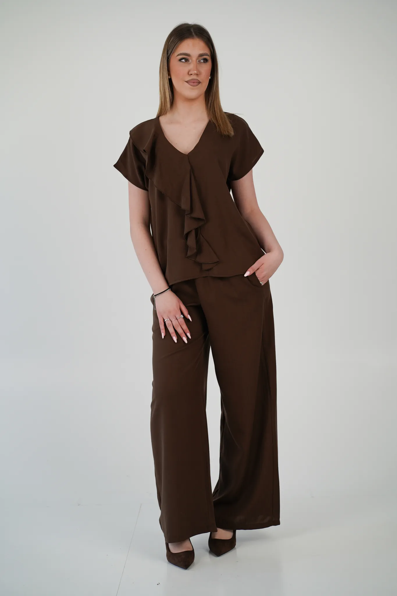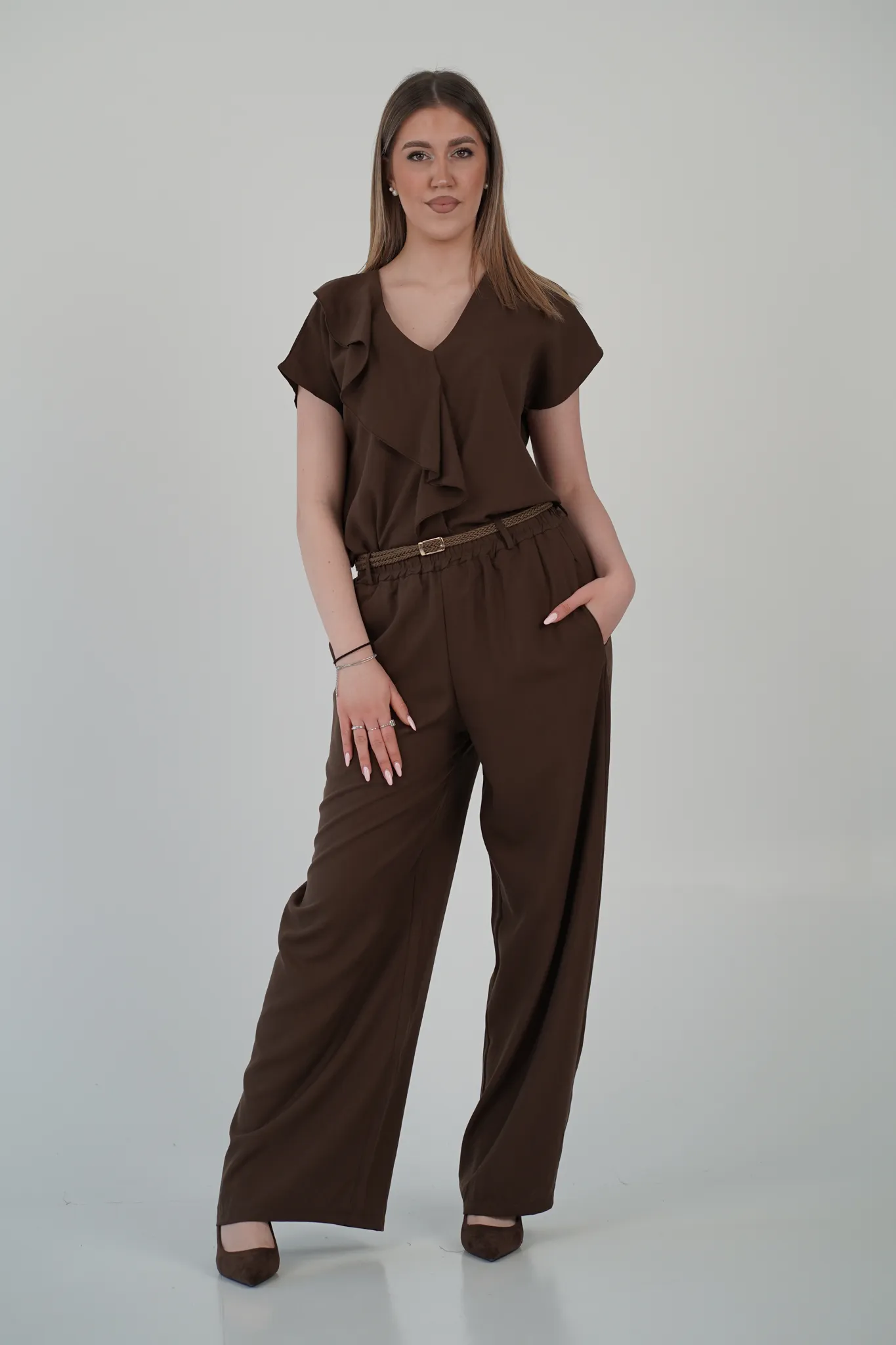 Il top con scollo a V e dettaglio morbido sul davanti aggiunge movimento e femminilità, senza risultare eccessivo, mentre il pantalone ampio con vita elasticizzata garantisce comfort e vestibilità impeccabile.