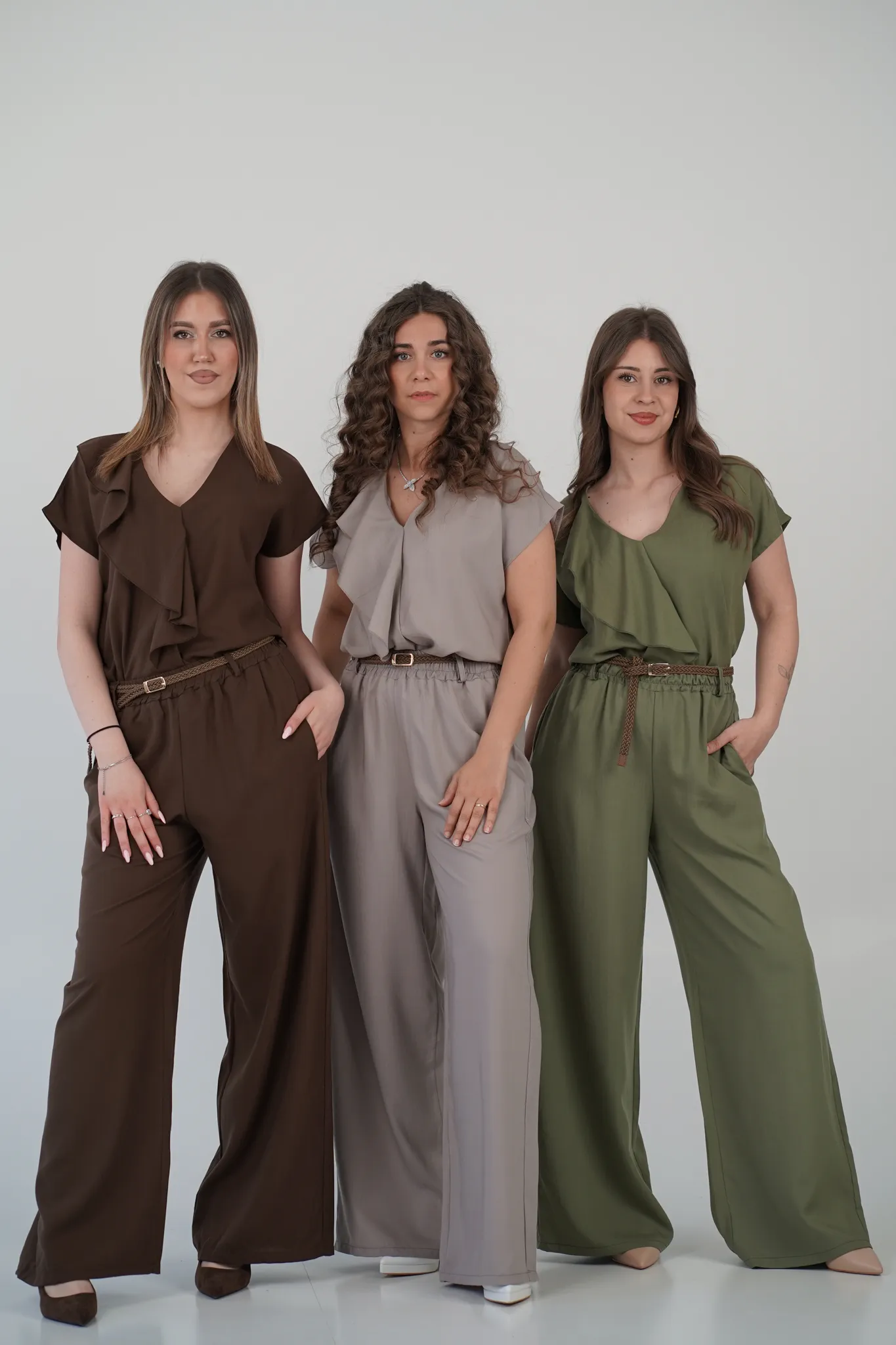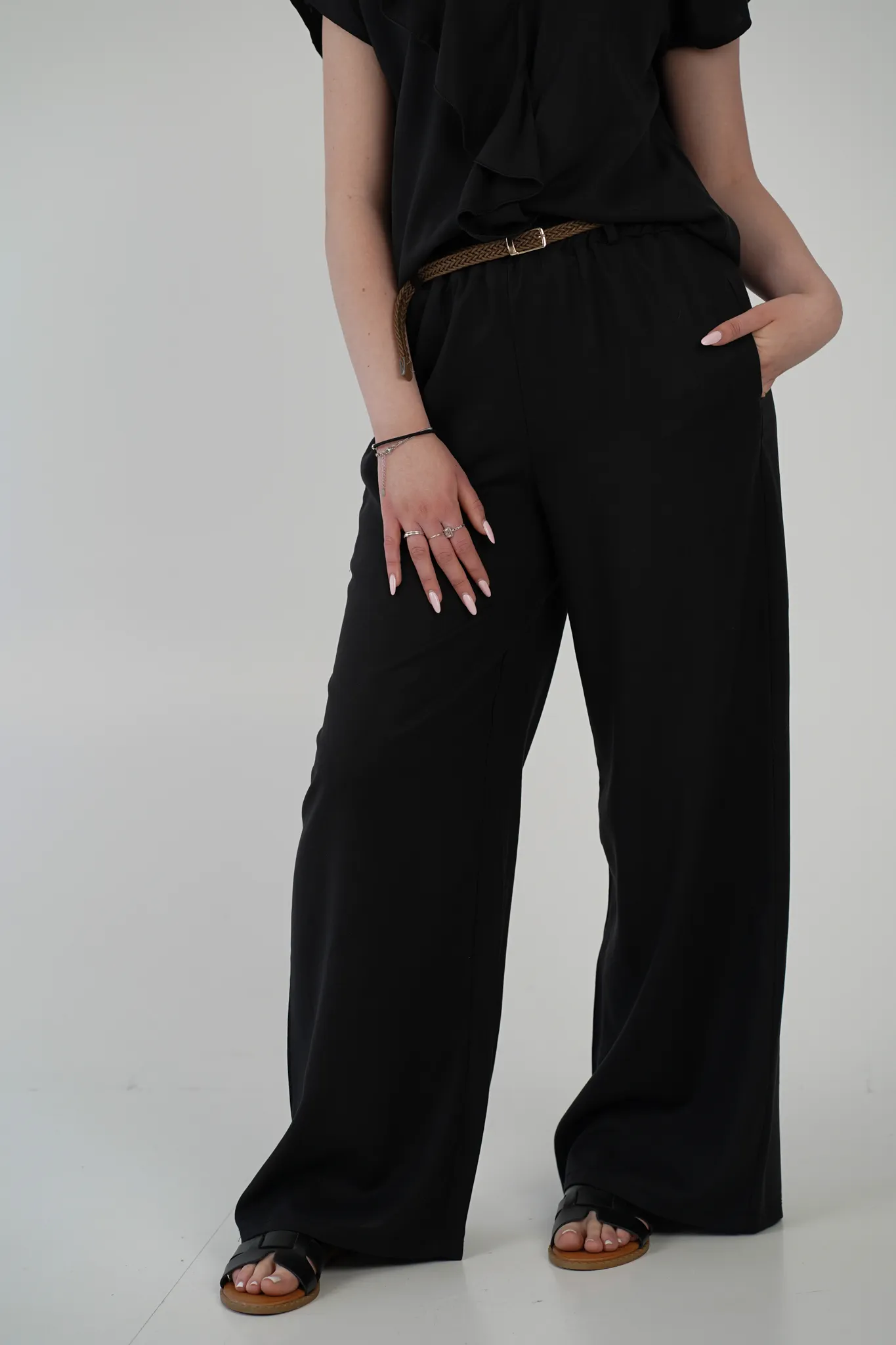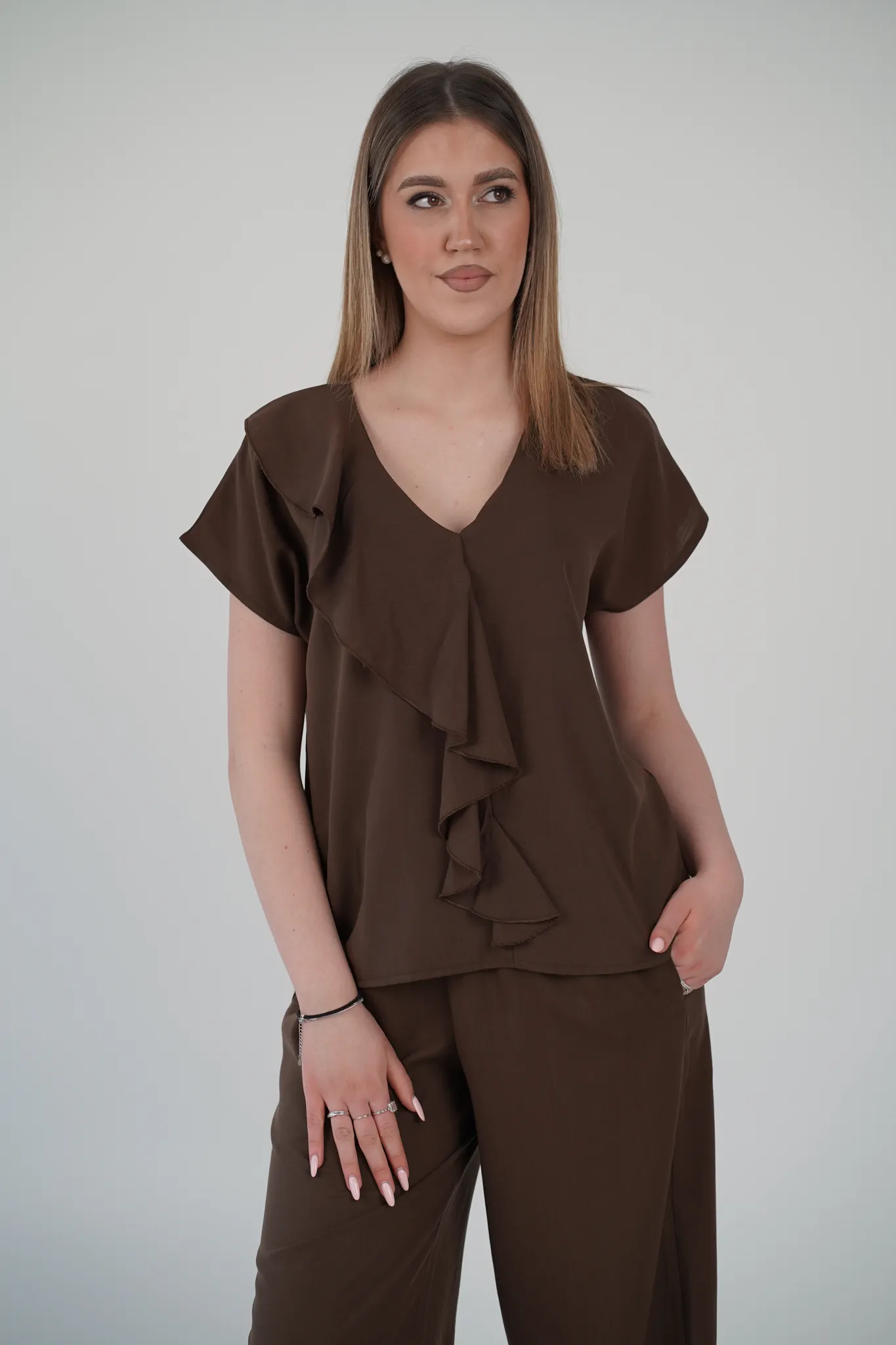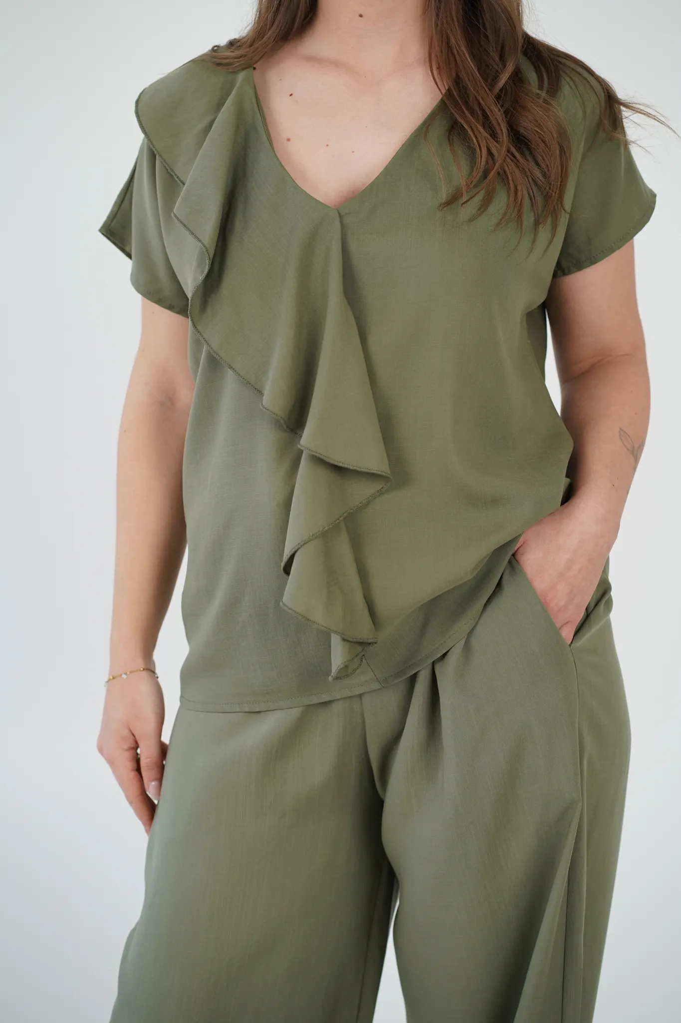 Il top con scollo a V e dettaglio morbido sul davanti aggiunge movimento e femminilità, senza risultare eccessivo, mentre il pantalone ampio con vita elasticizzata garantisce comfort e vestibilità impeccabile.