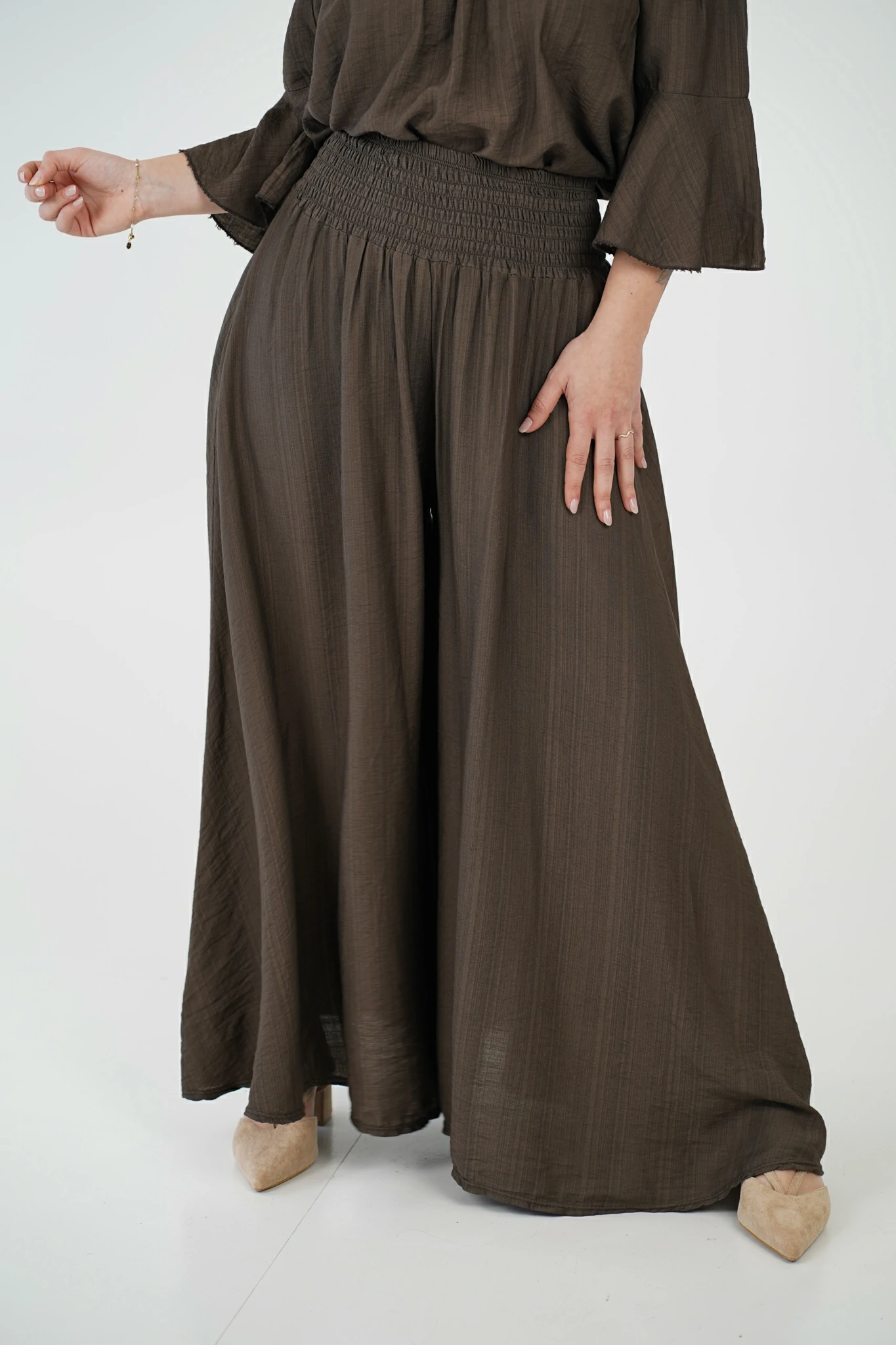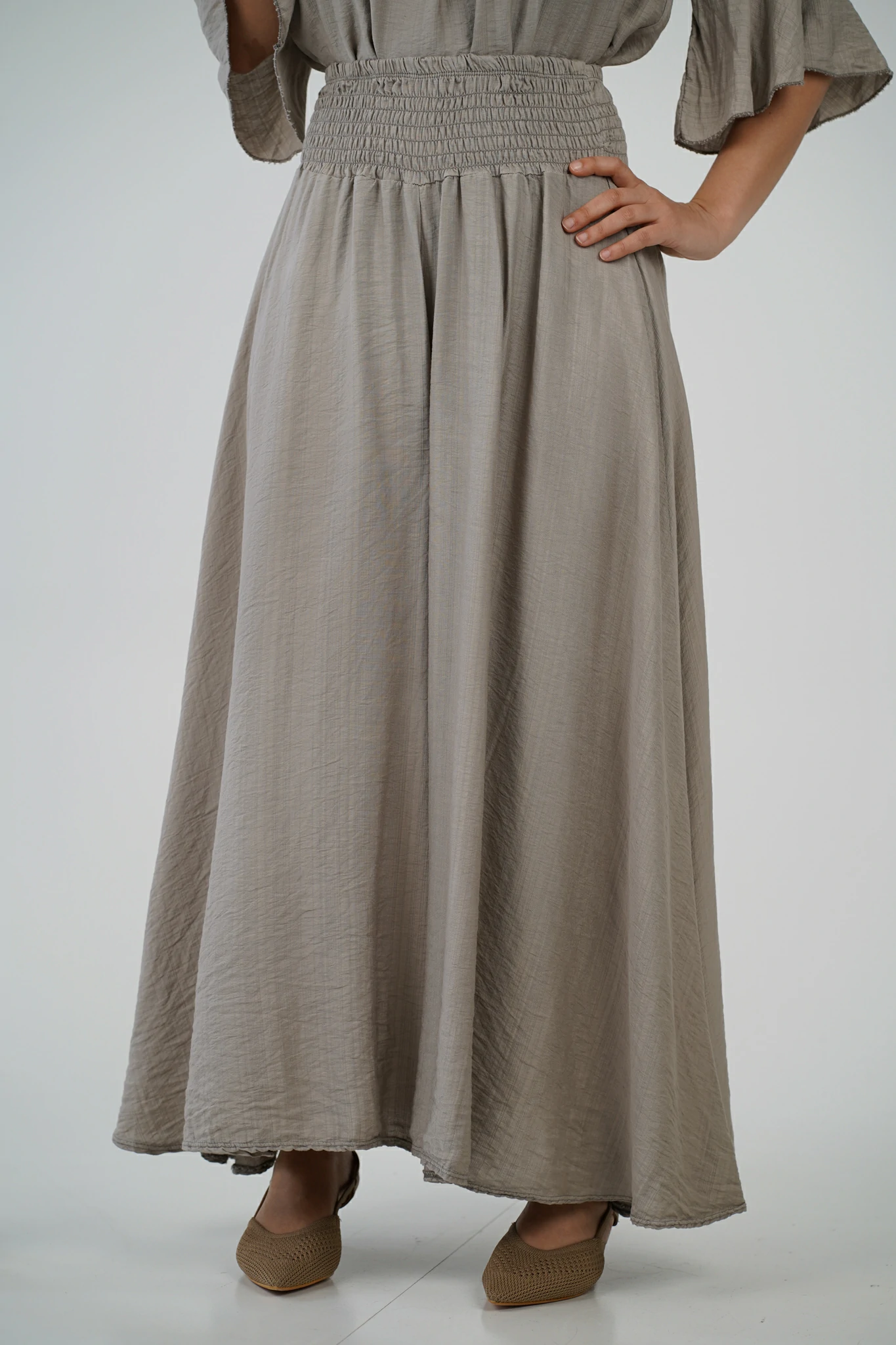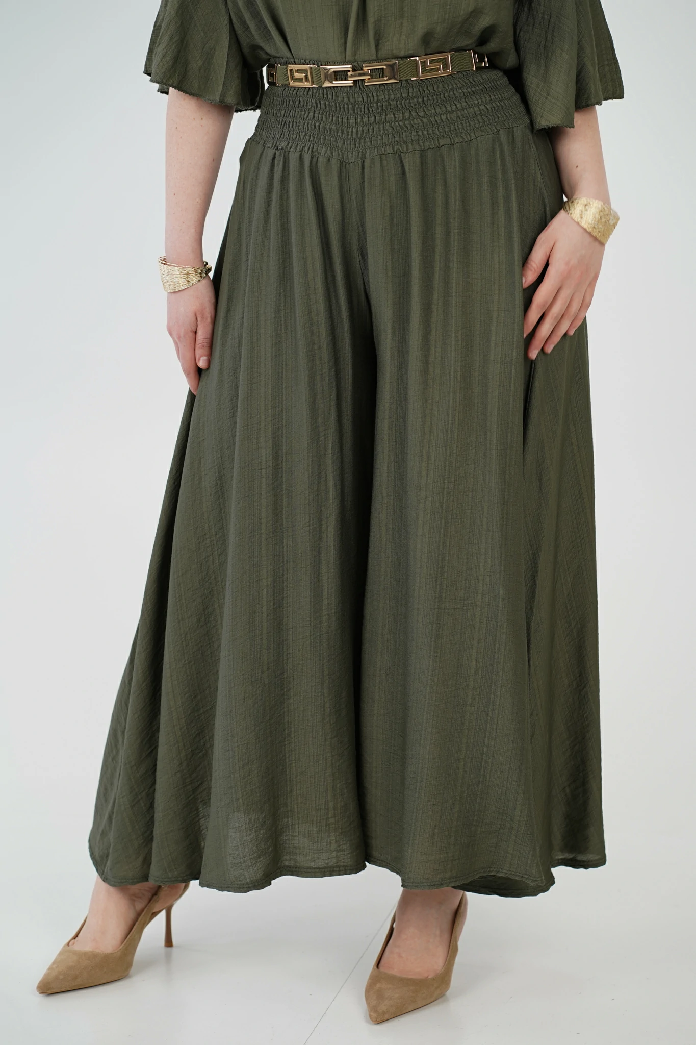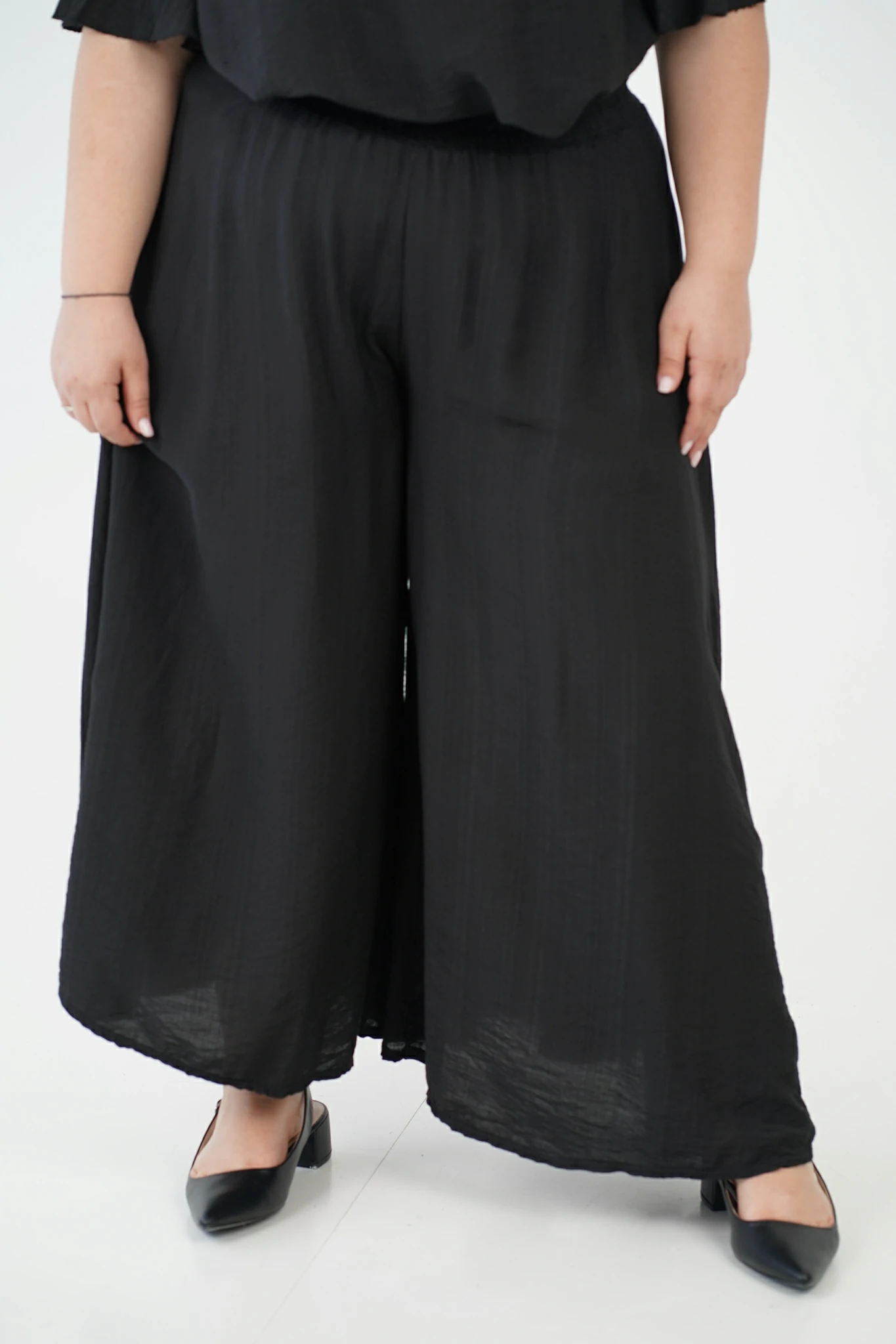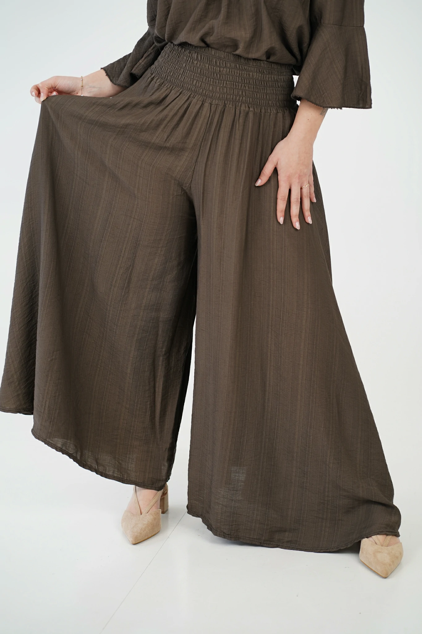 Il pantalone a linea trapezio slancia la figura, mentre la fascia elastica arricciata in vita garantisce una vestibilità comoda e valorizzante.
