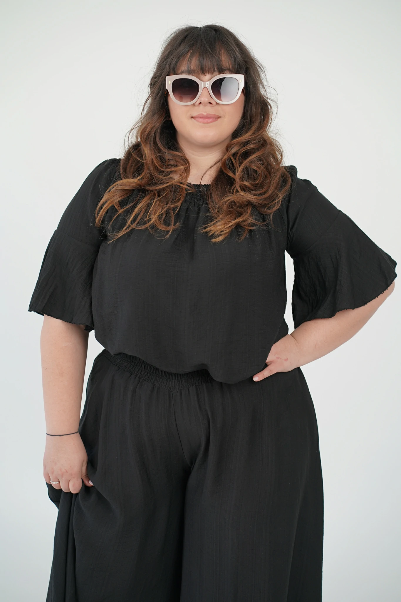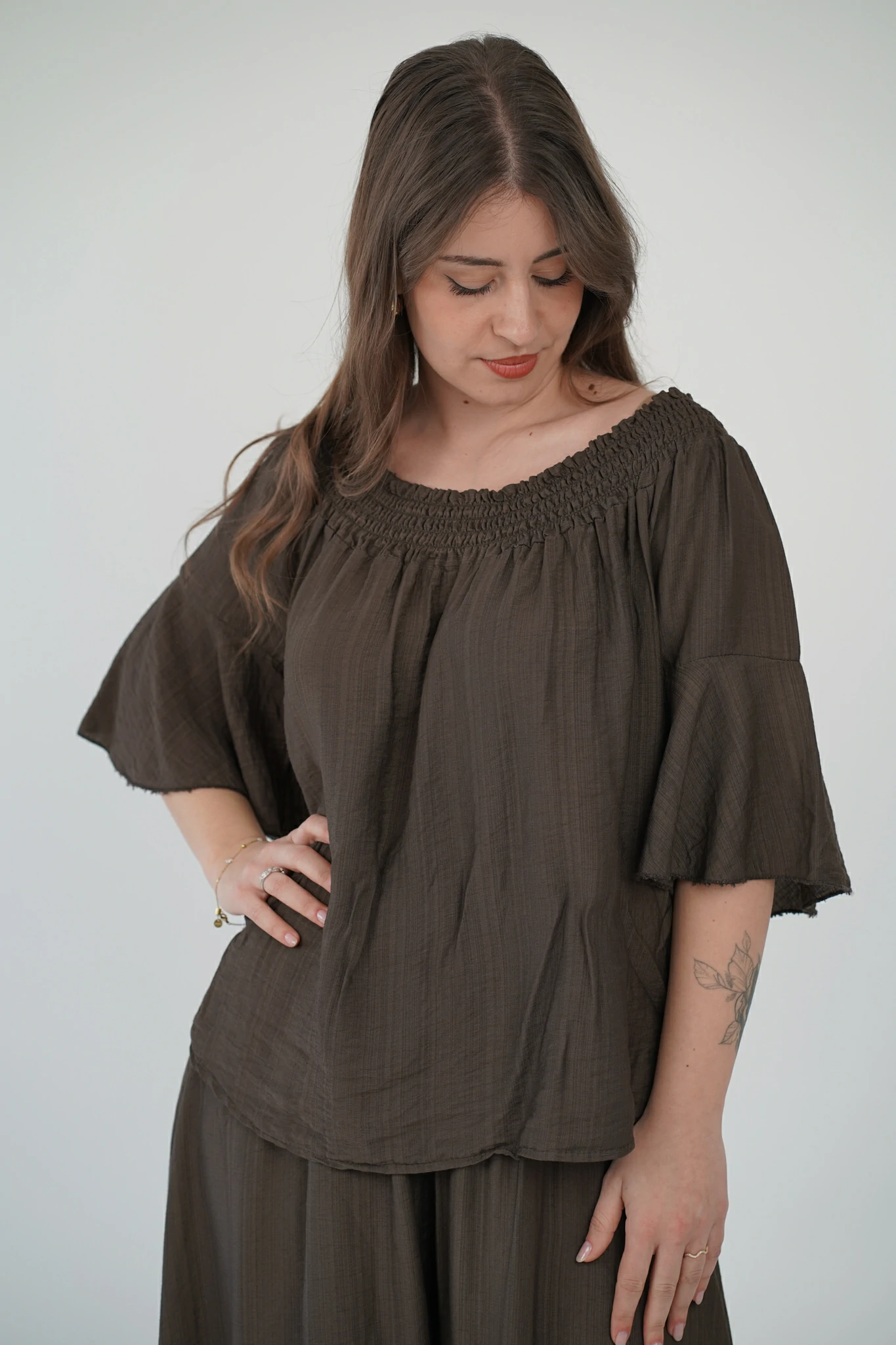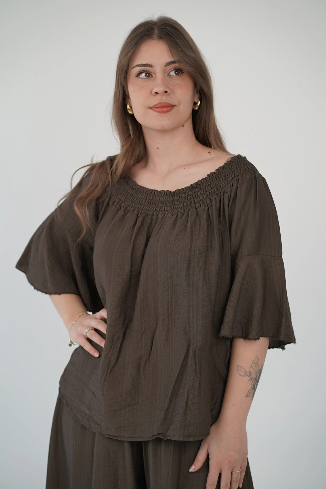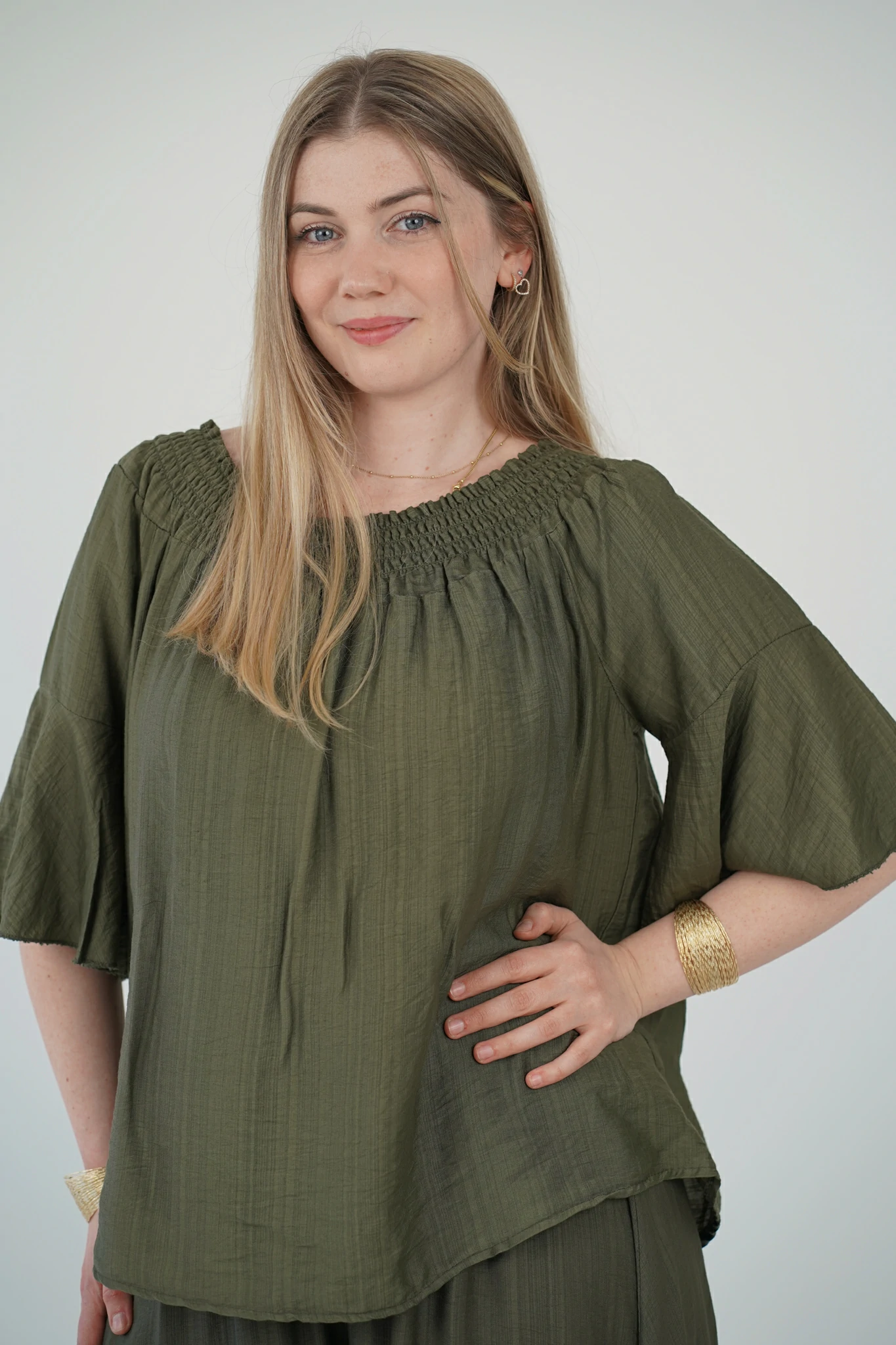 La maglia, con fascia arricciata sullo scollo, può essere indossata sia a spalle coperte che scoperte per adattarsi al tuo mood: più casual di giorno, più sensuale di sera. Le maniche a tre quarti e il tessuto in viscosa fresca, leggera e traspirante la rendono perfetta per la stagione 🌿