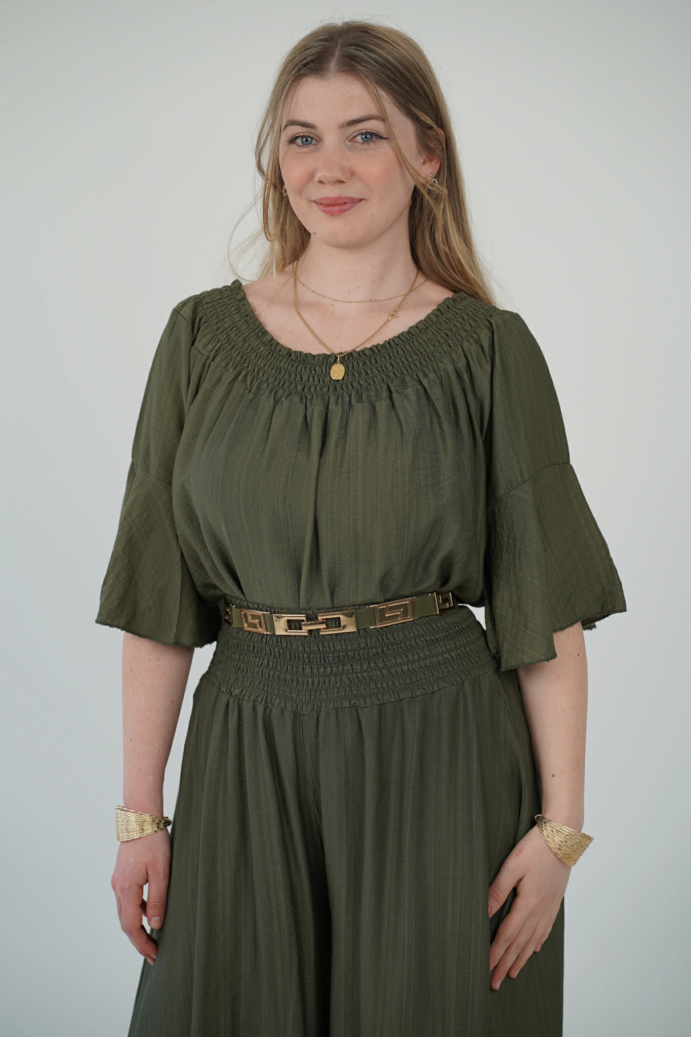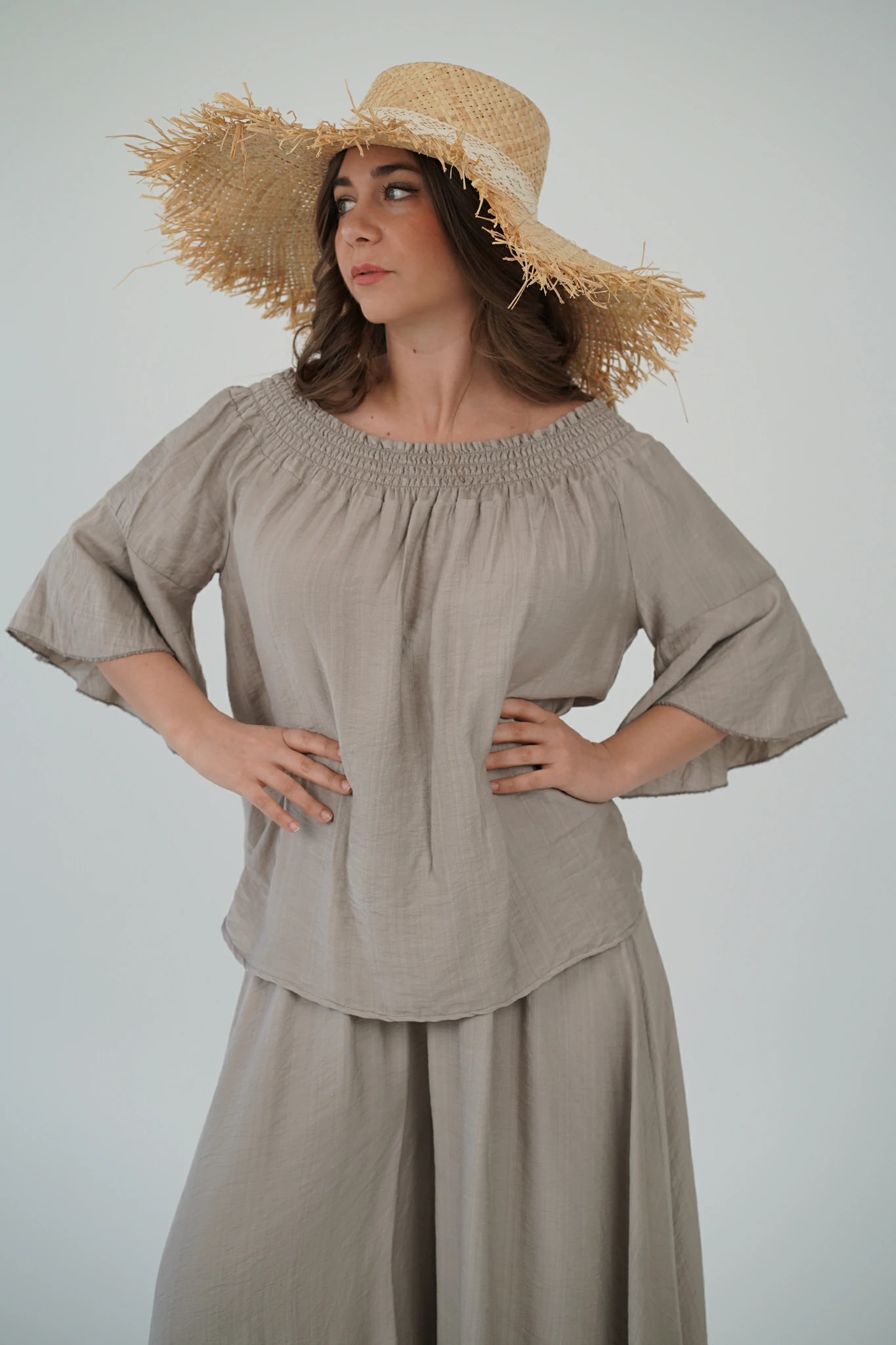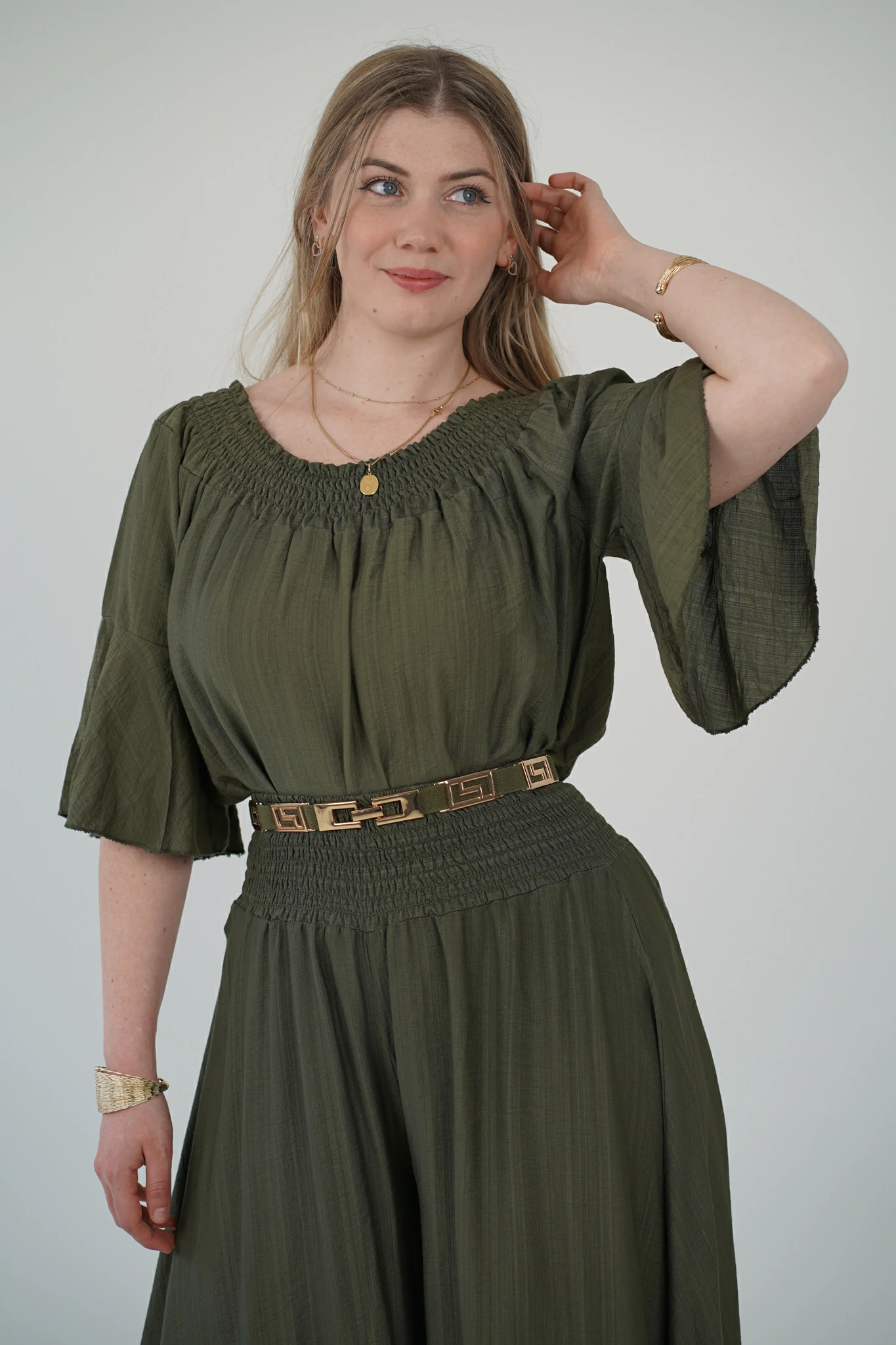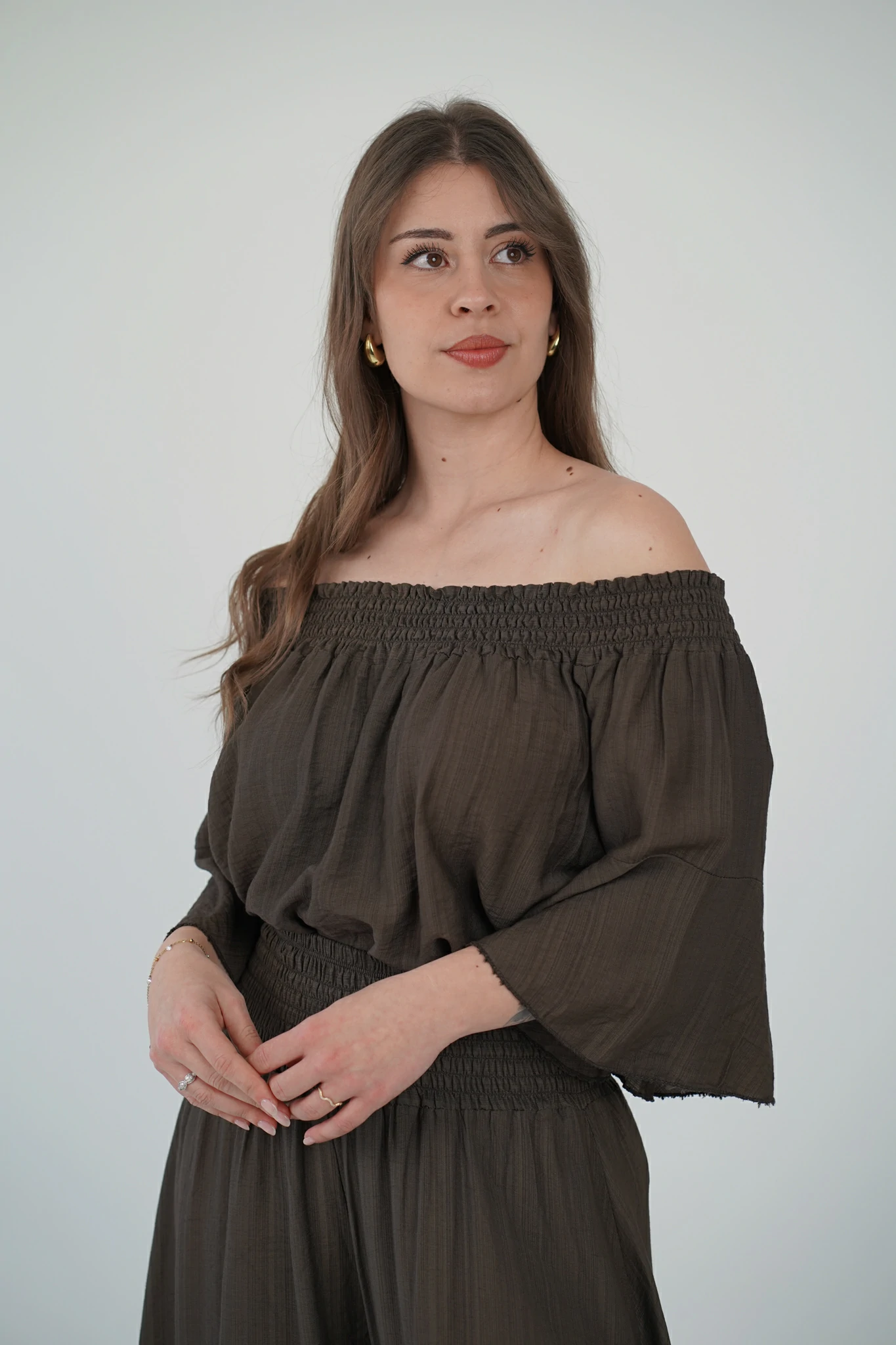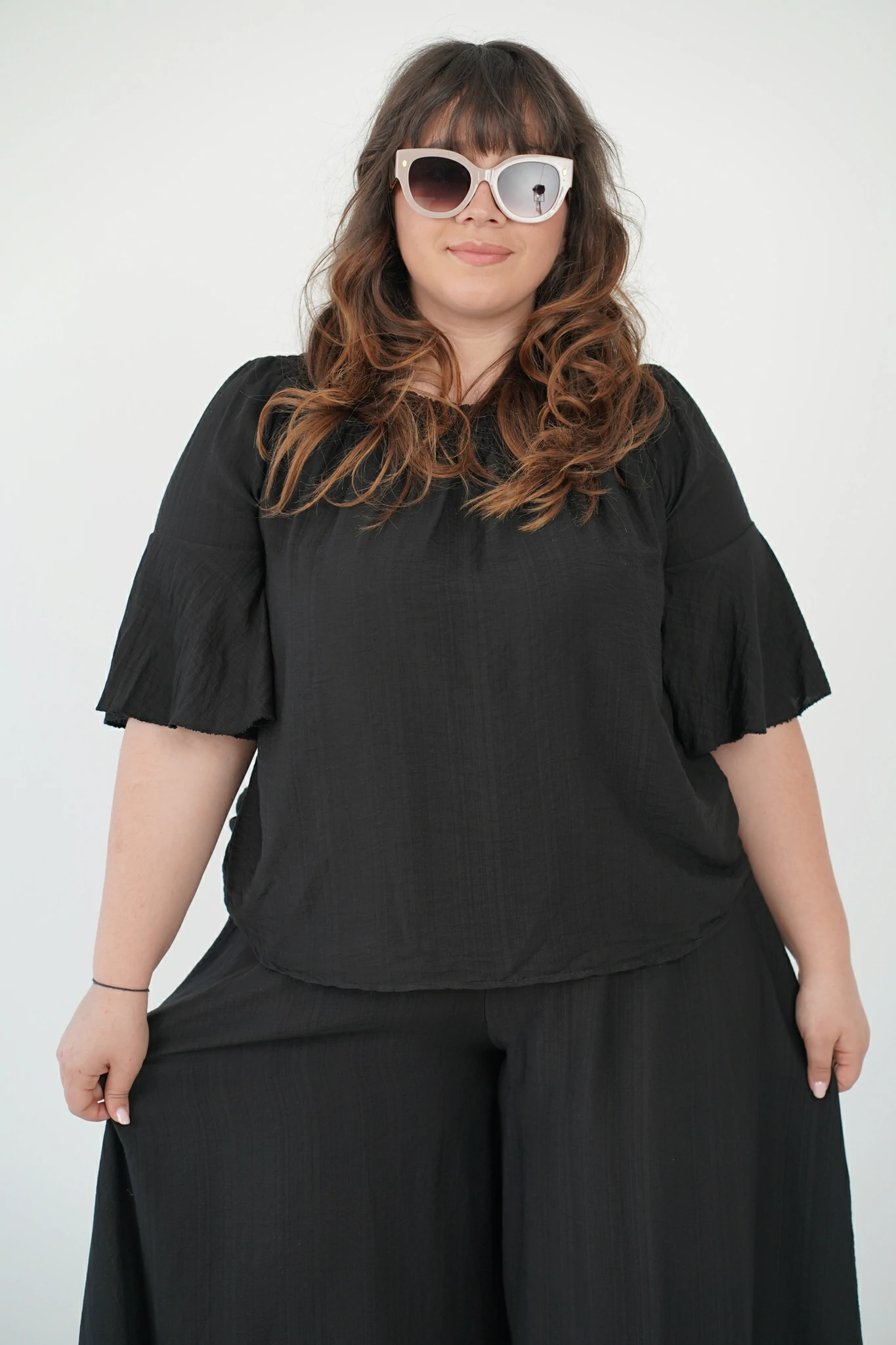 La maglia, con fascia arricciata sullo scollo, può essere indossata sia a spalle coperte che scoperte per adattarsi al tuo mood: più casual di giorno, più sensuale di sera. Le maniche a tre quarti e il tessuto in viscosa fresca, leggera e traspirante la rendono perfetta per la stagione 🌿