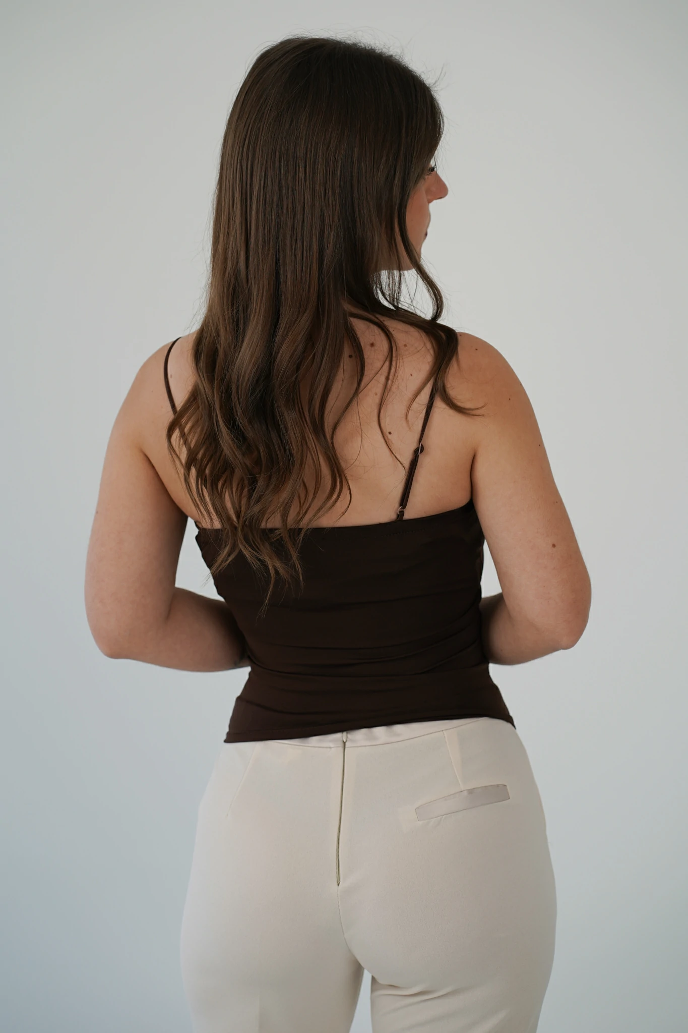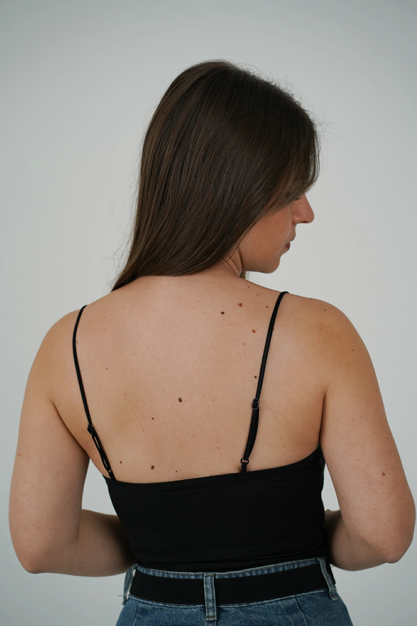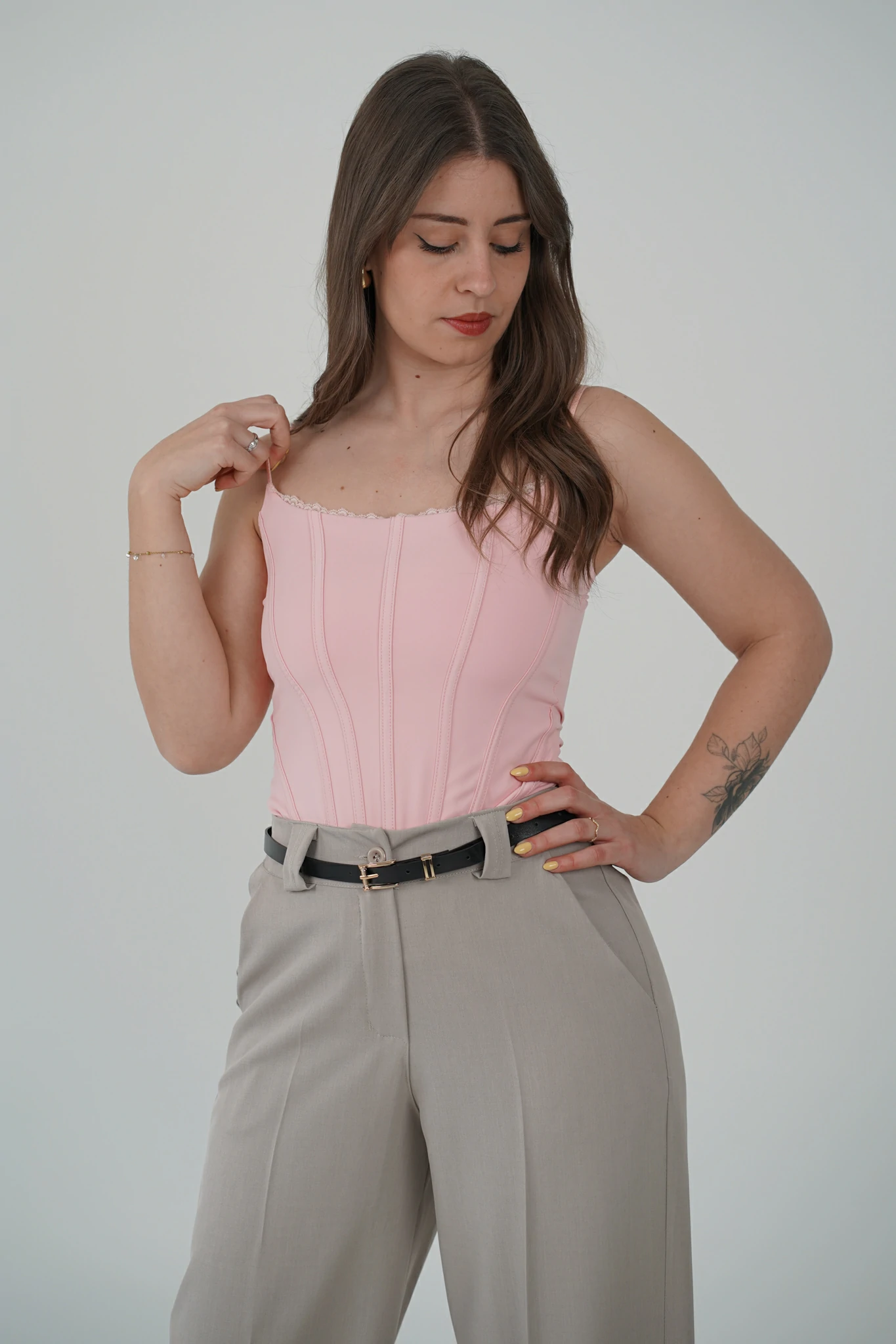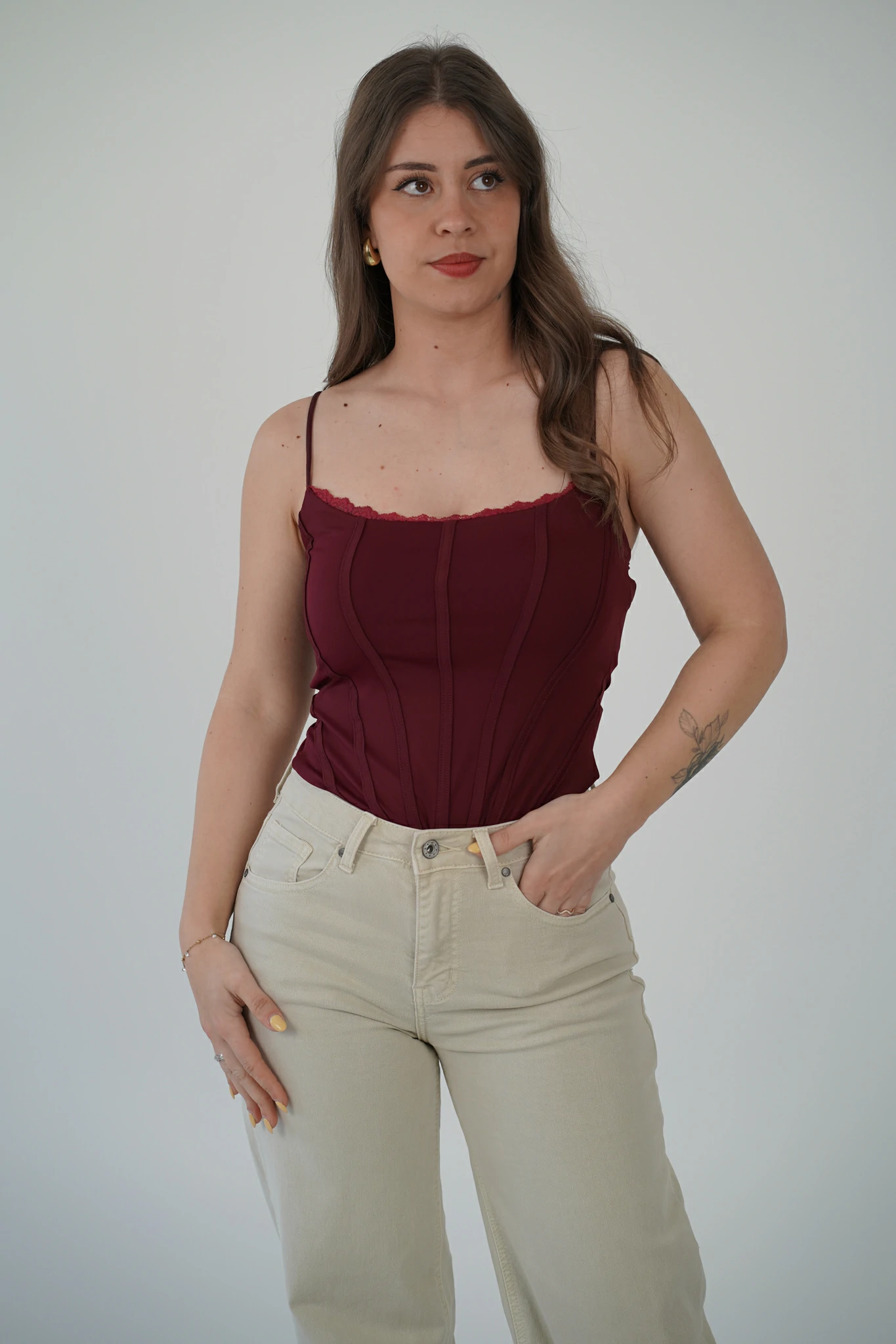 Le spalline sottili regolabili garantiscono una vestibilità personalizzata, mentre il bordino in pizzo sulla scollatura aggiunge un tocco romantico e raffinato. Il tessuto stretch avvolge la silhouette esaltandola, senza rinunciare al comfort.