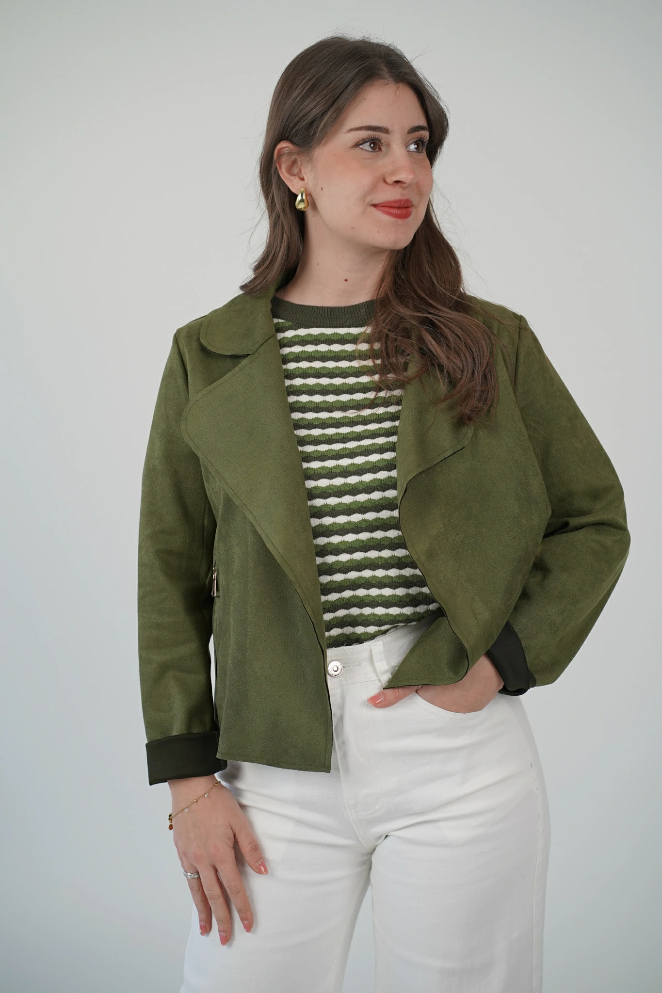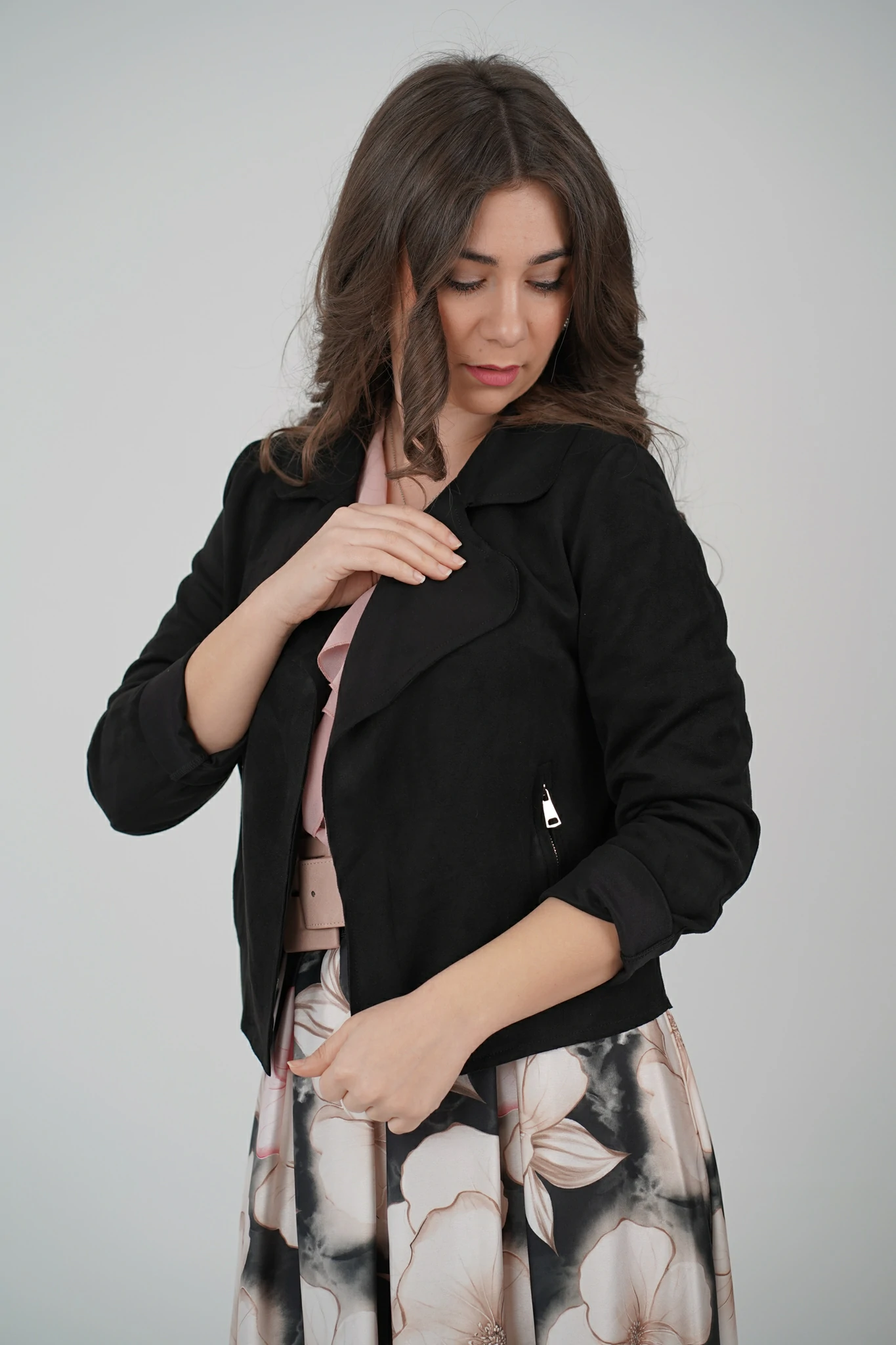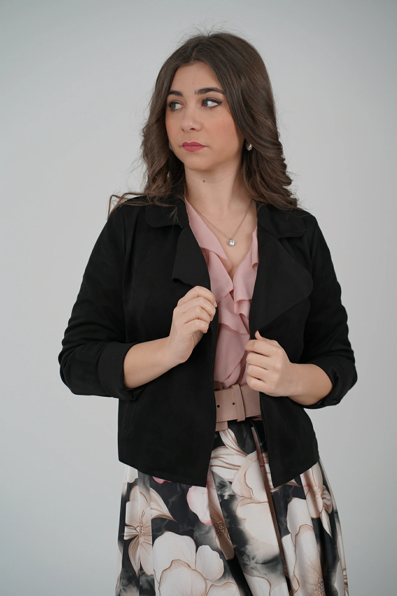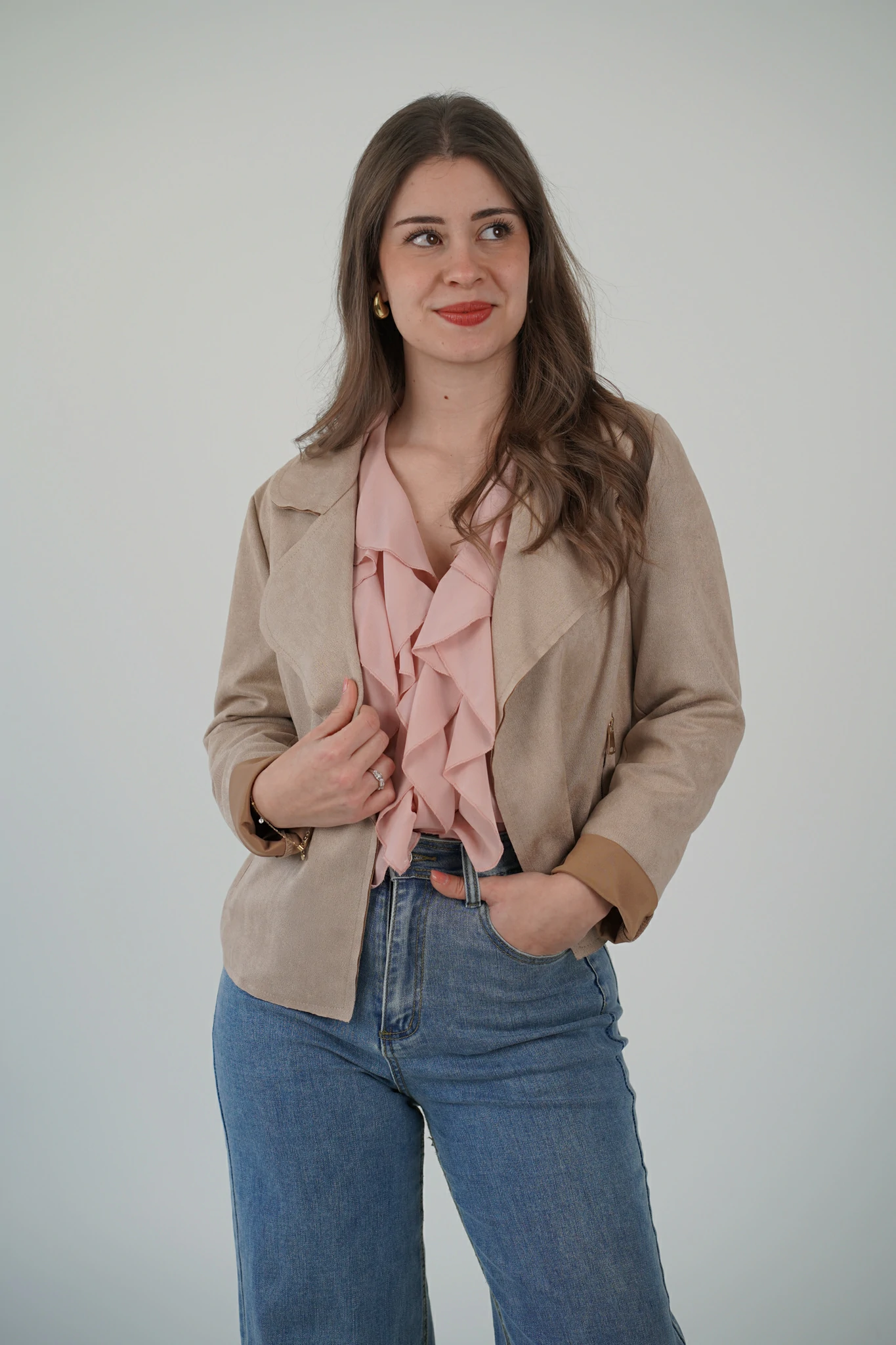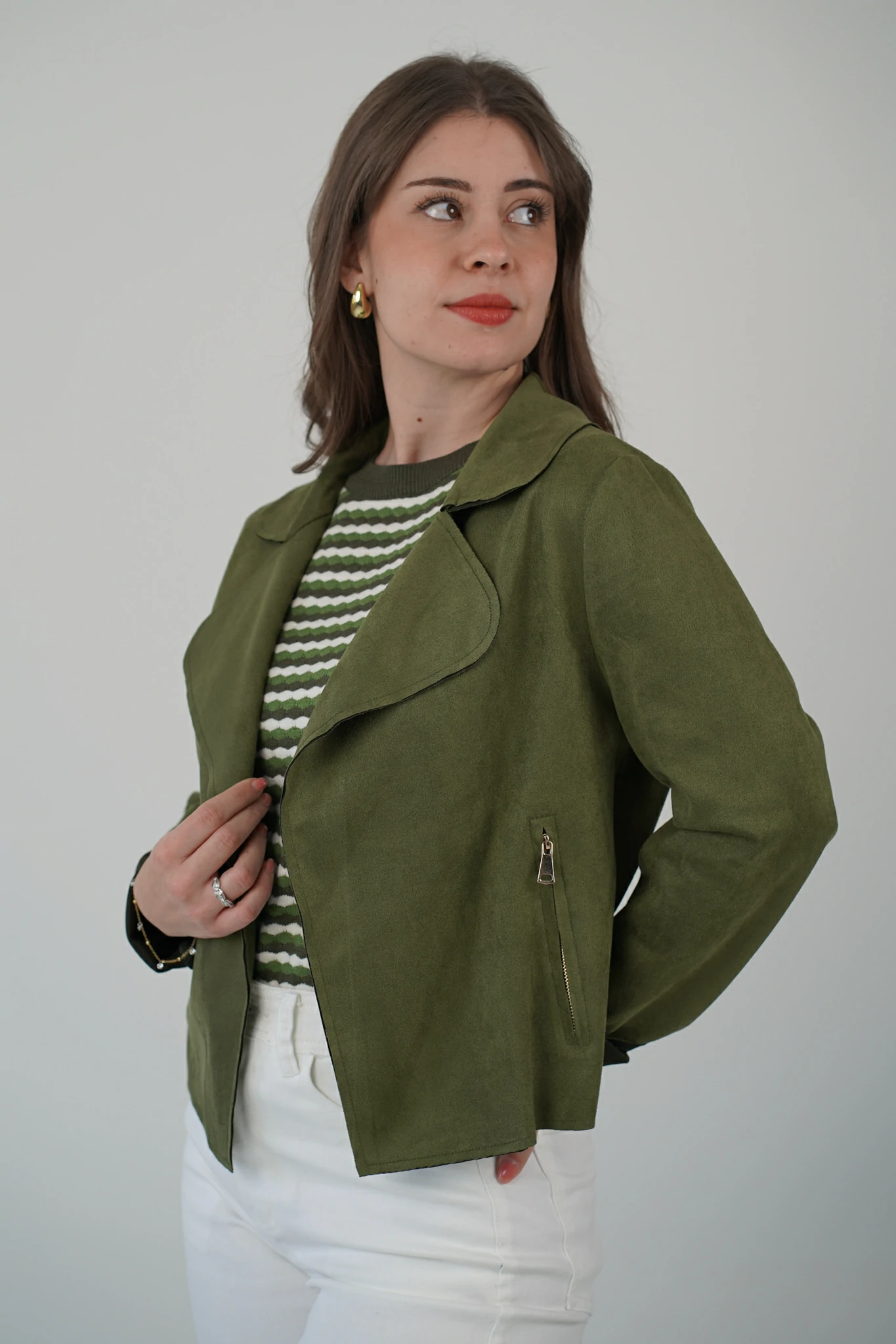 Descrizione: Questo giacchino corto in simil pelle scamosciata è ideale per completare i tuoi outfit