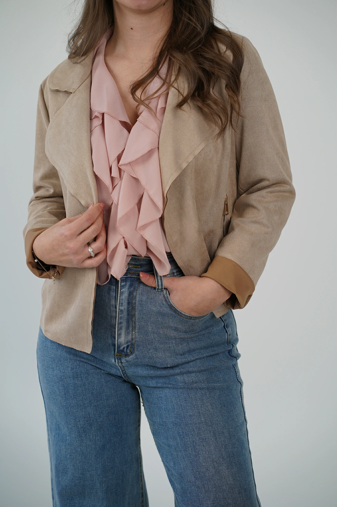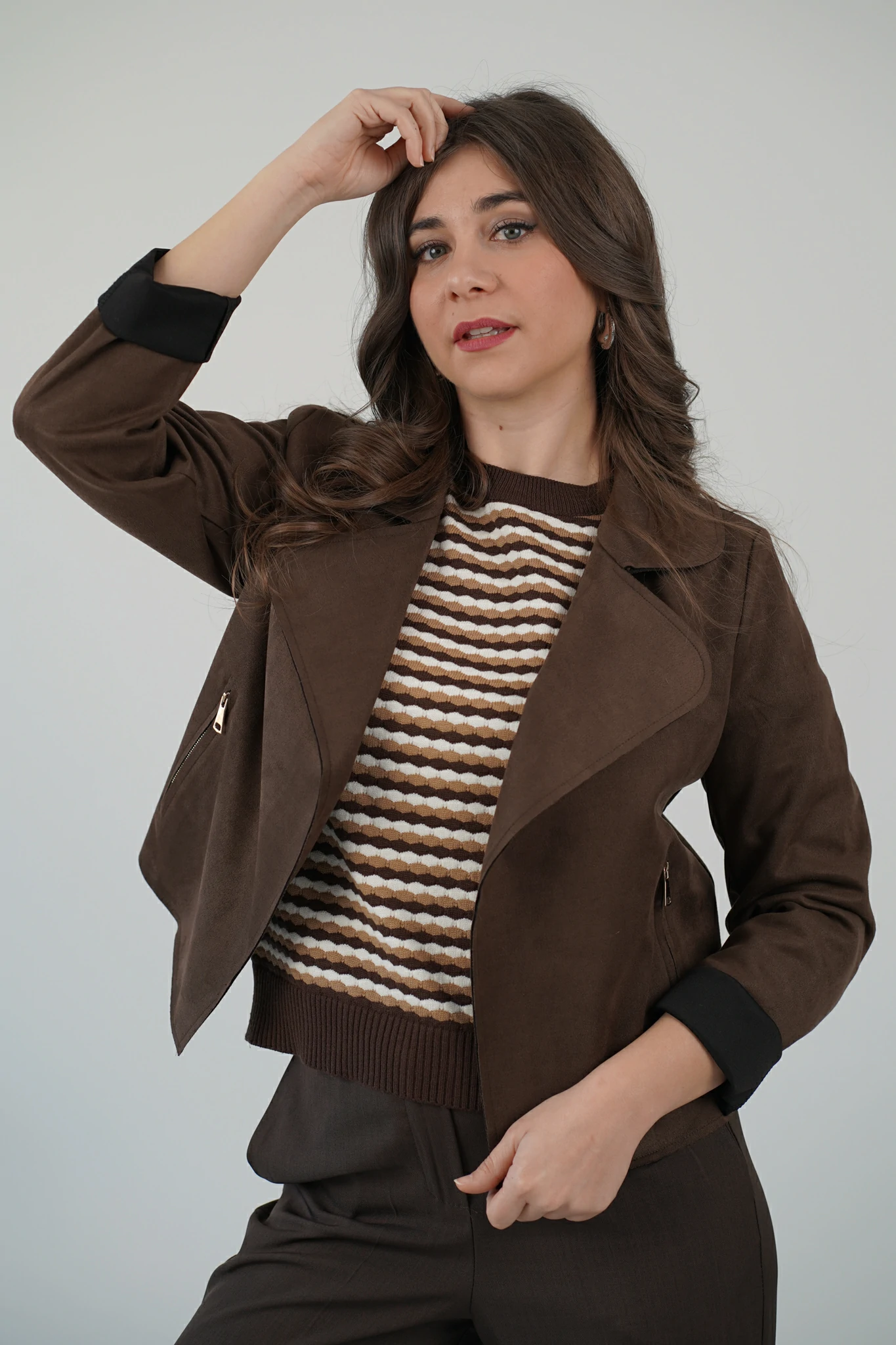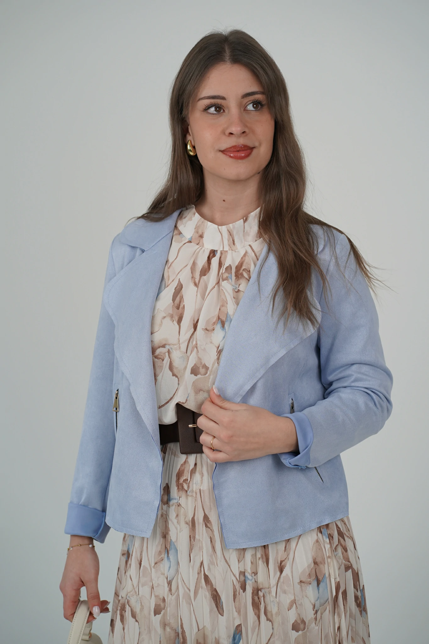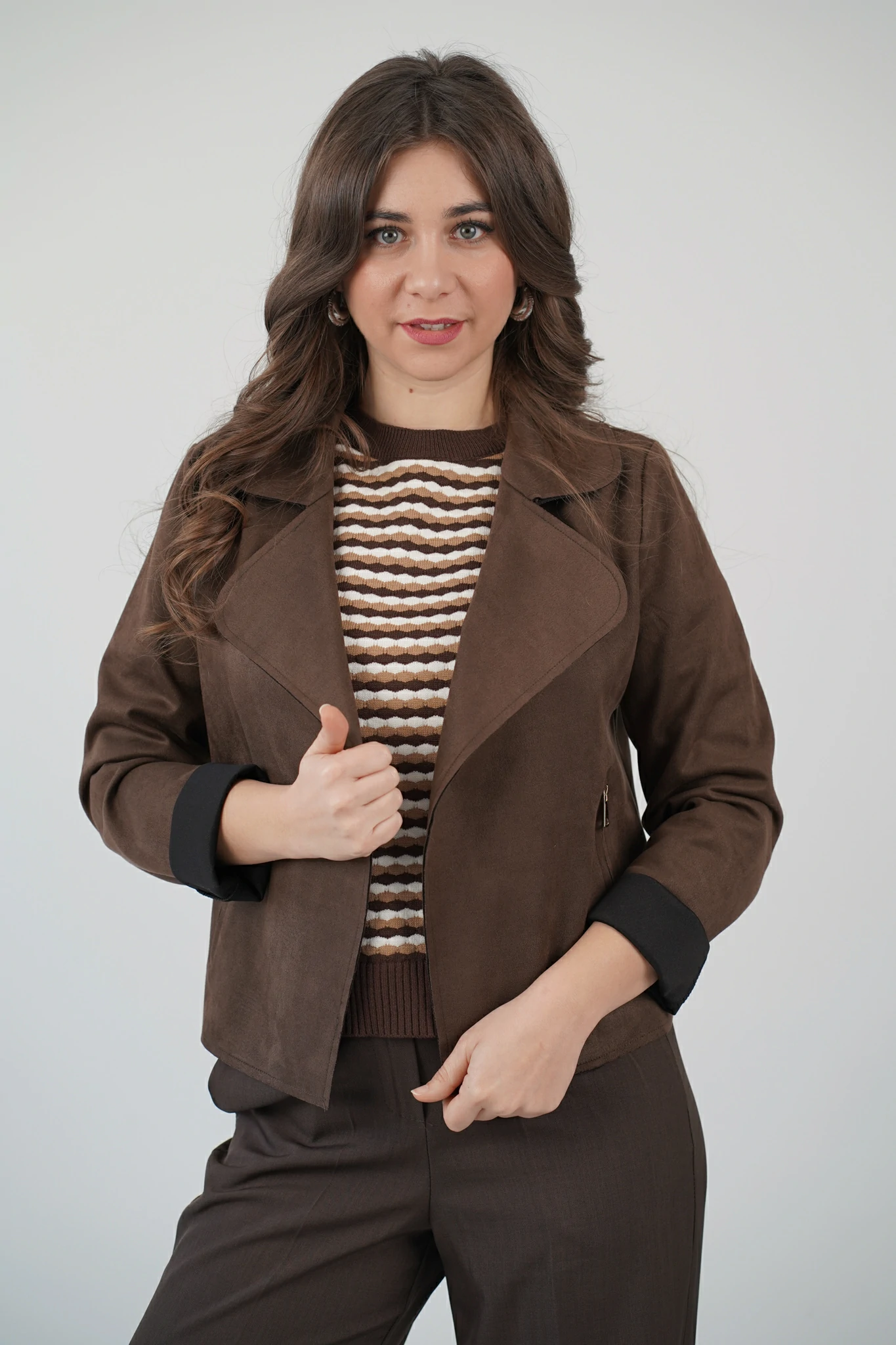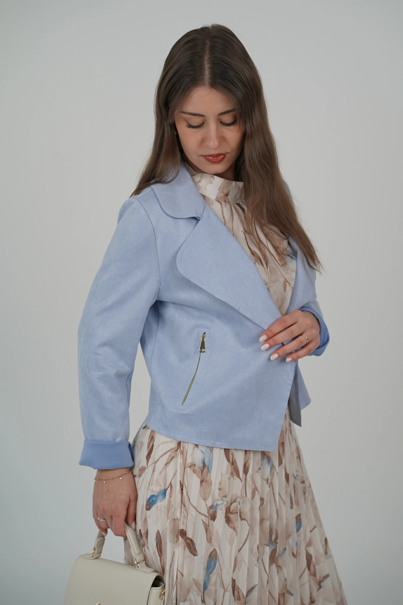 Descrizione: Questo giacchino corto in simil pelle scamosciata è ideale per completare i tuoi outfit