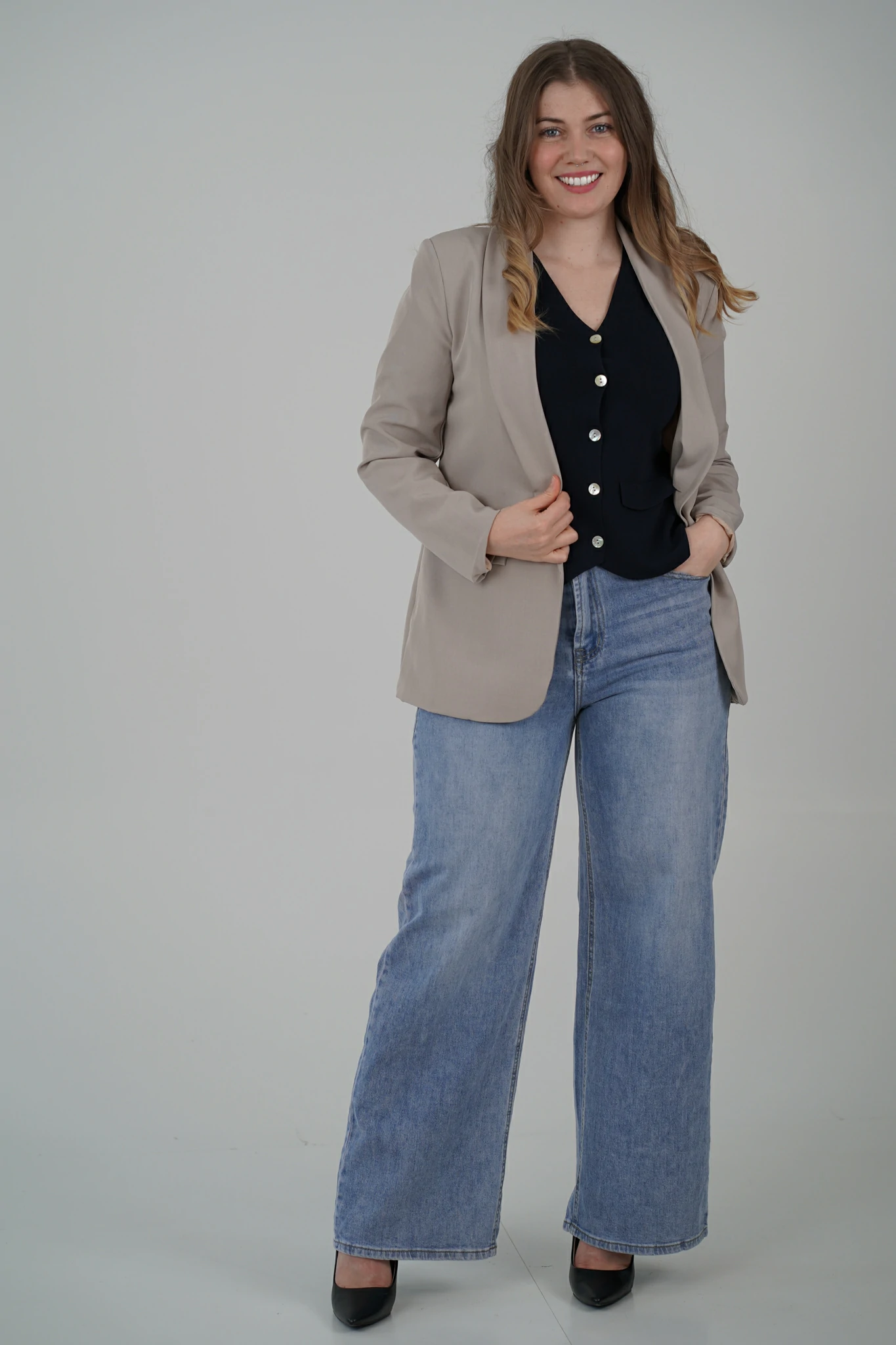 Il modello è impreziosito da bottoncini effetto madreperla, luminosi e raffinati, e da due taschine decorative che aggiungono carattere e struttura al design.