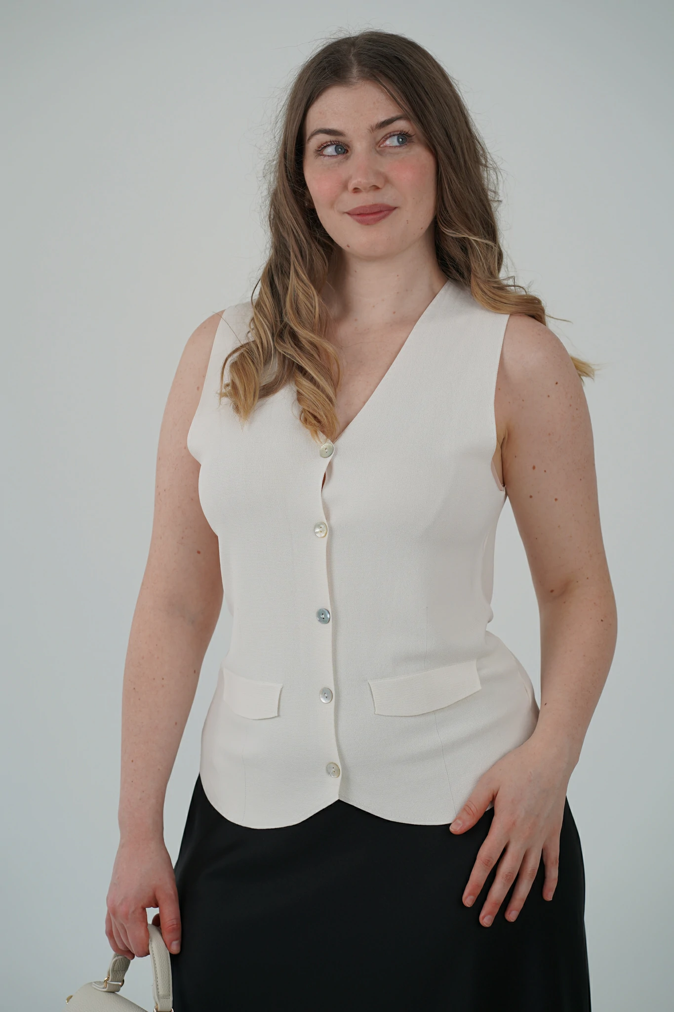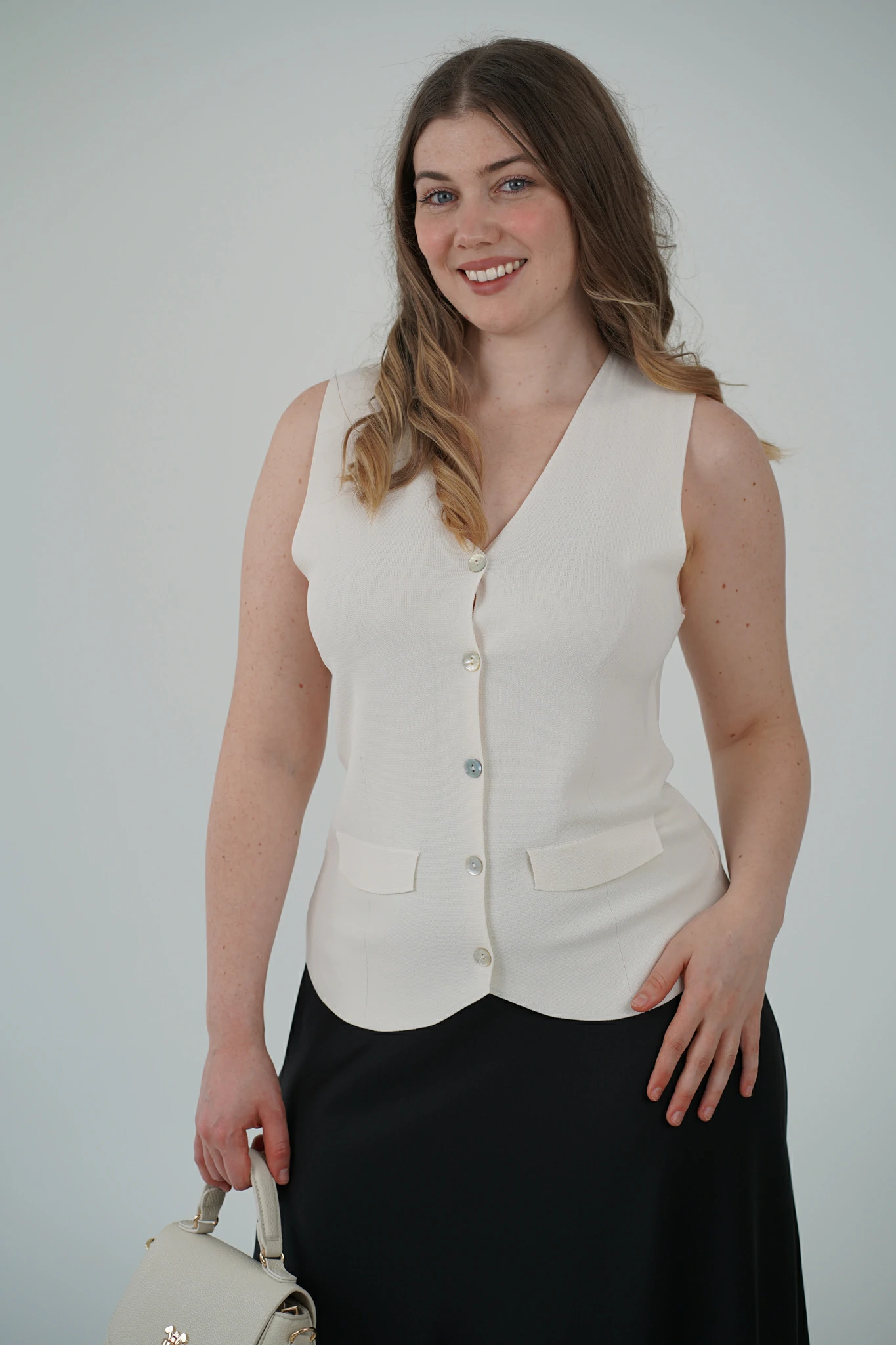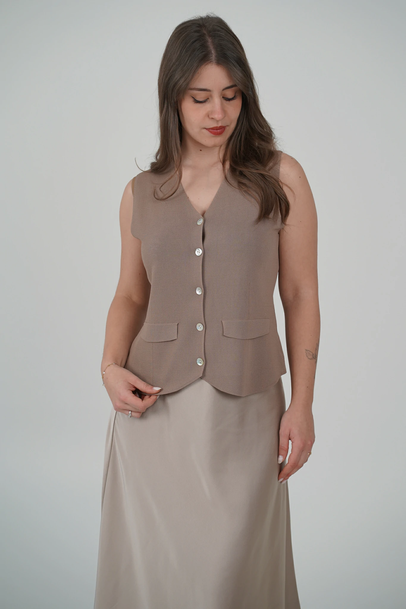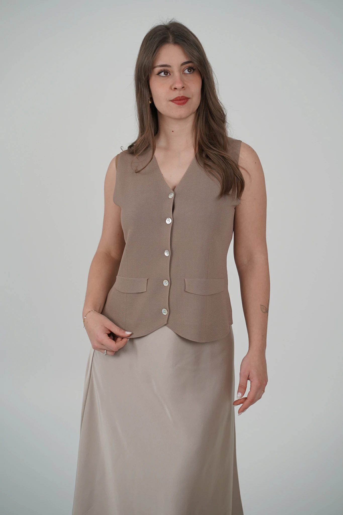 Descrizione: Gilet con Scollo a V e Bottoni Effetto Madreperla – Il Dettaglio Chic che Fa la Differenza ✨