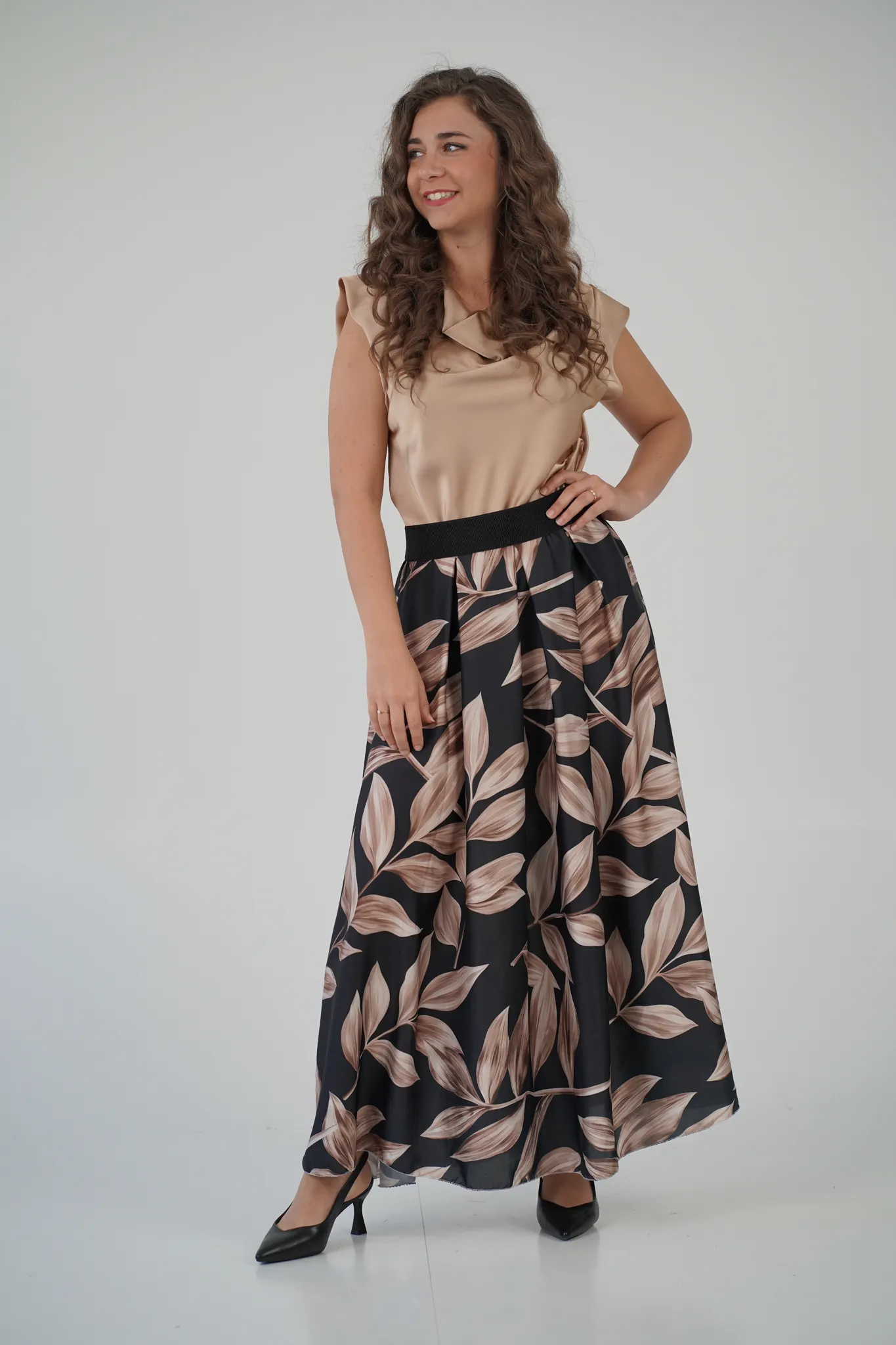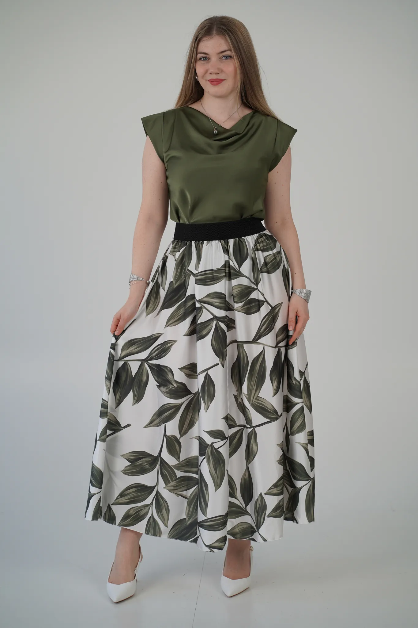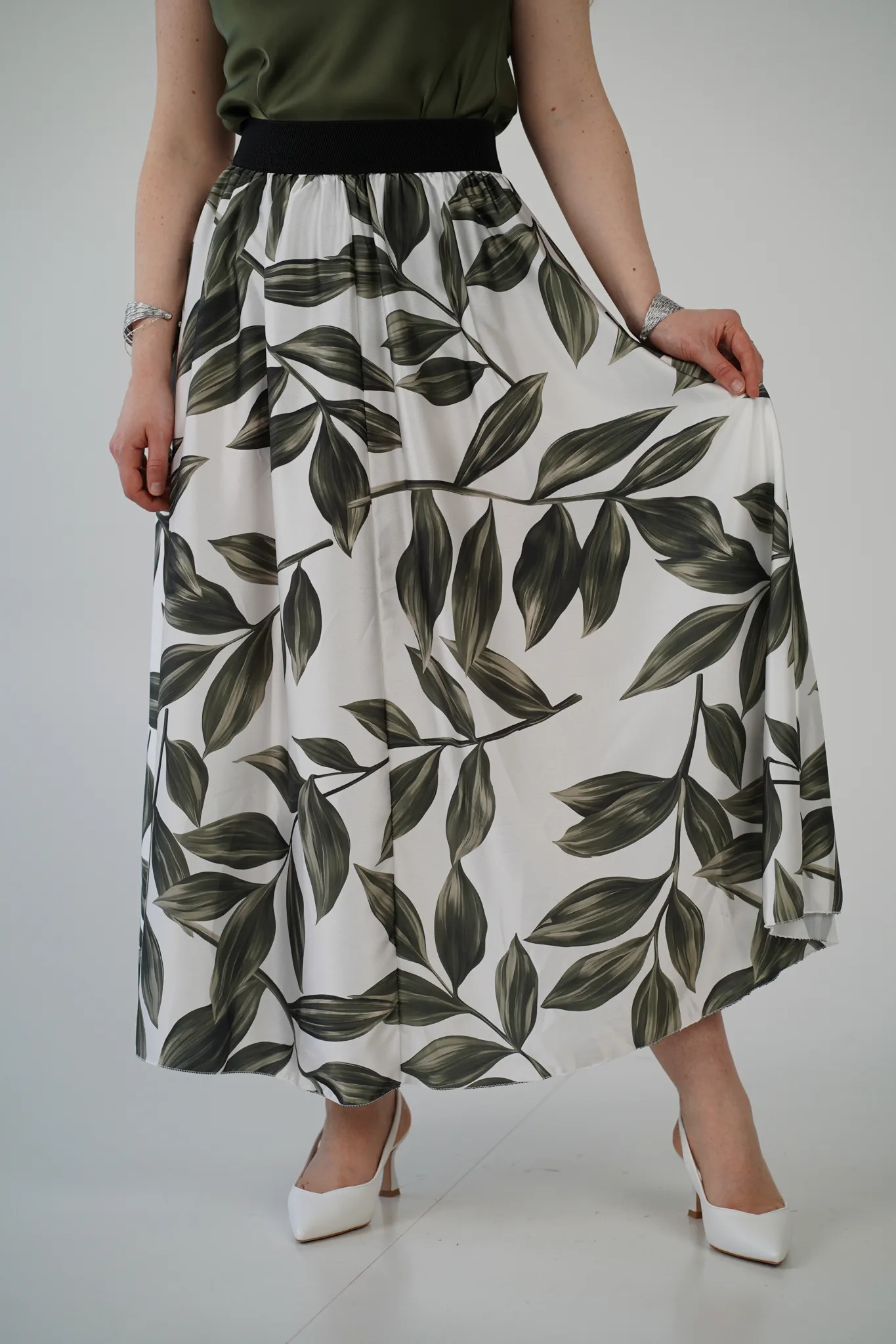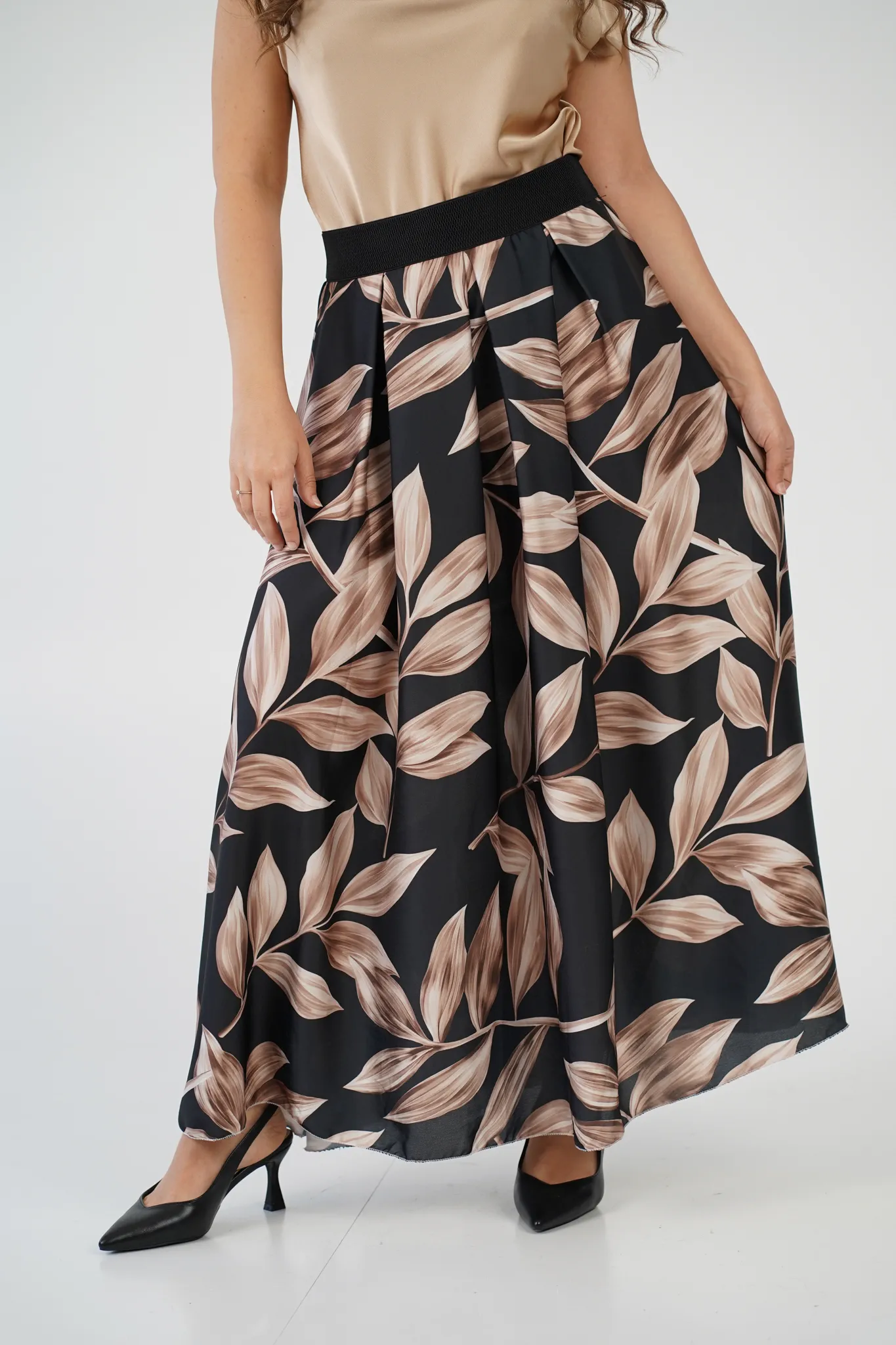 Descrizione: Gonna Lunga in Satin con Elastico in Vita e Fantasia a Foglie 🍃
