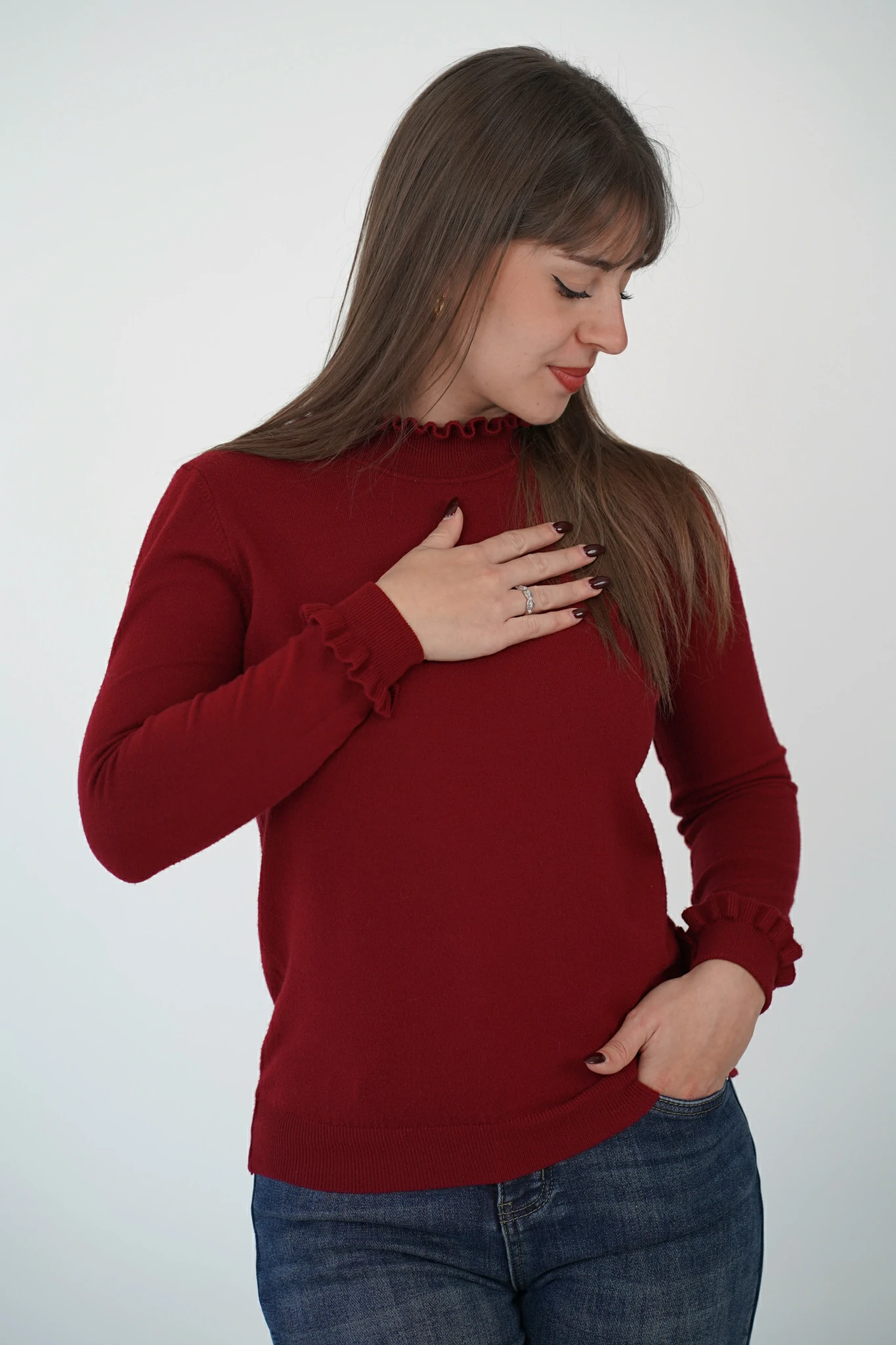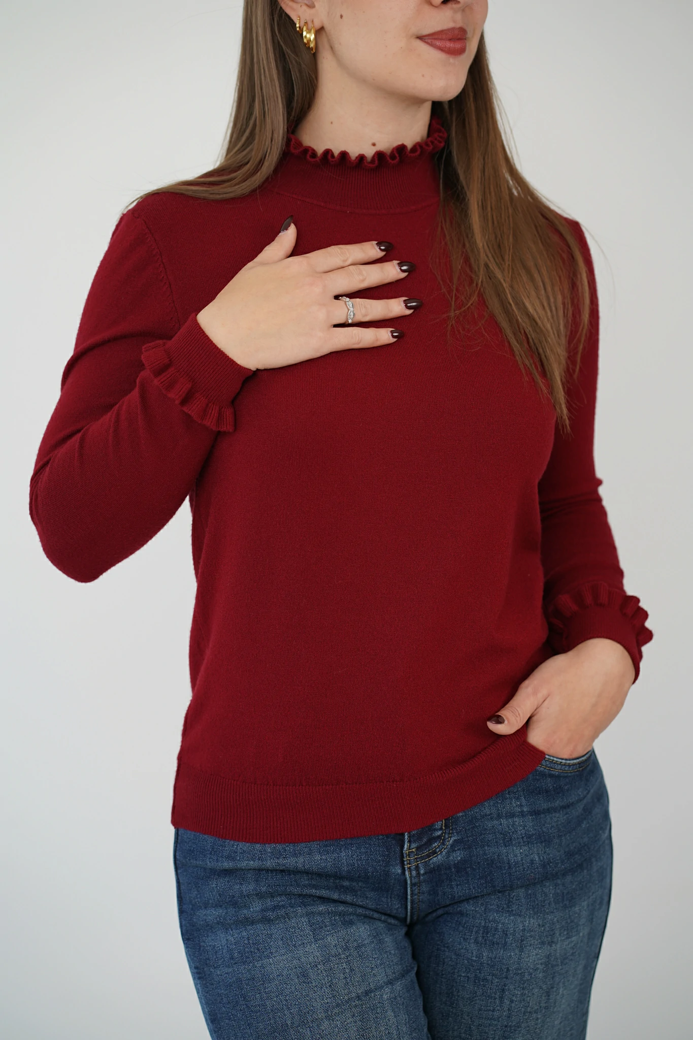 Romantico, essenziale, mai banale. Questo lupetto basico conquista con i suoi delicati dettagli in rouge applicati sulle maniche e lungo lo scollo, per un tocco raffinato che esalta la femminilità con discrezione.