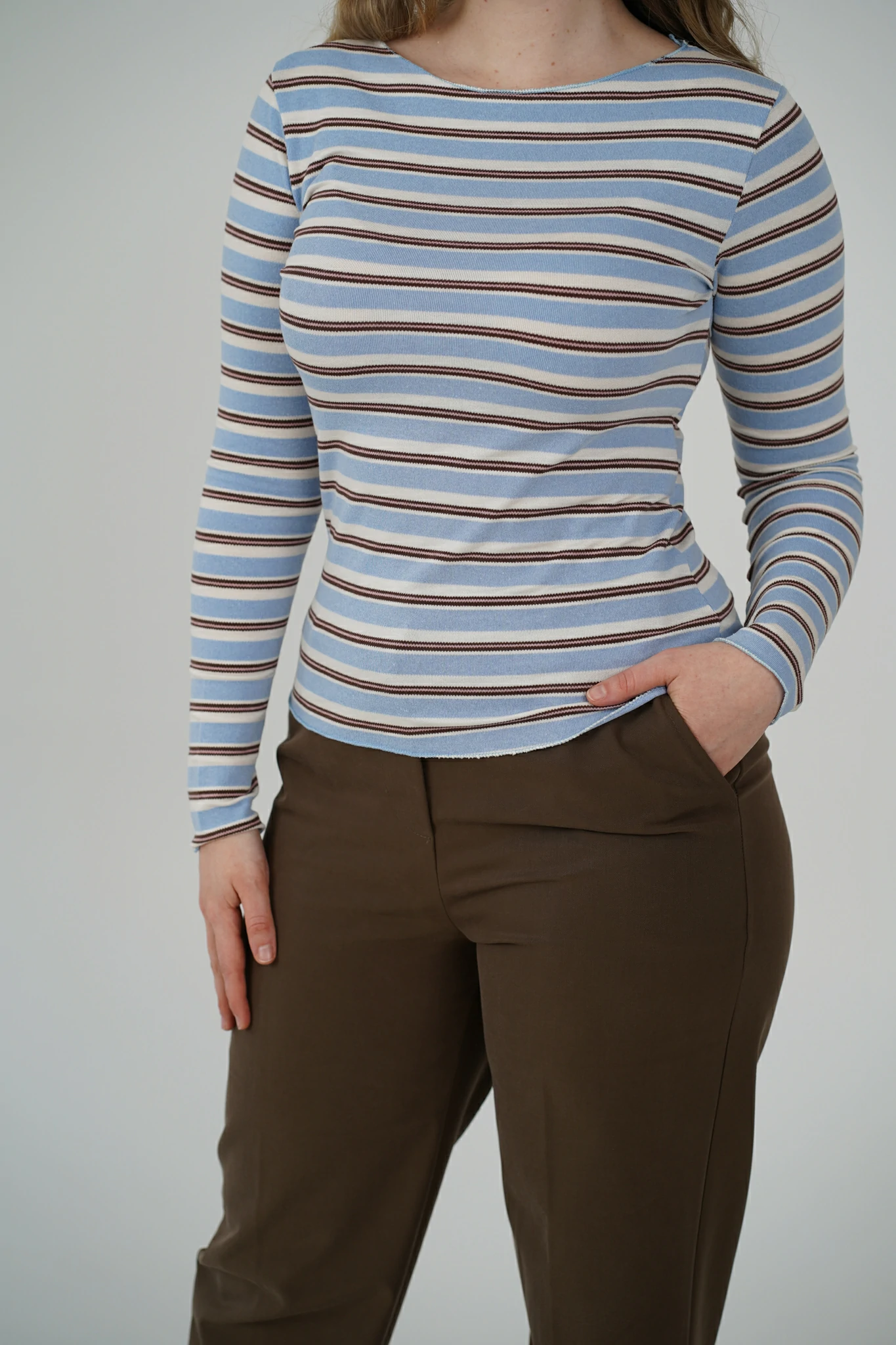 Lo scollo a barchetta valorizza delicatamente collo e spalle, donando luce al viso e un tocco raffinato anche agli outfit più semplici. Le righe, intramontabili e sempre attuali, slanciano la figura e rendono il look immediatamente curato.