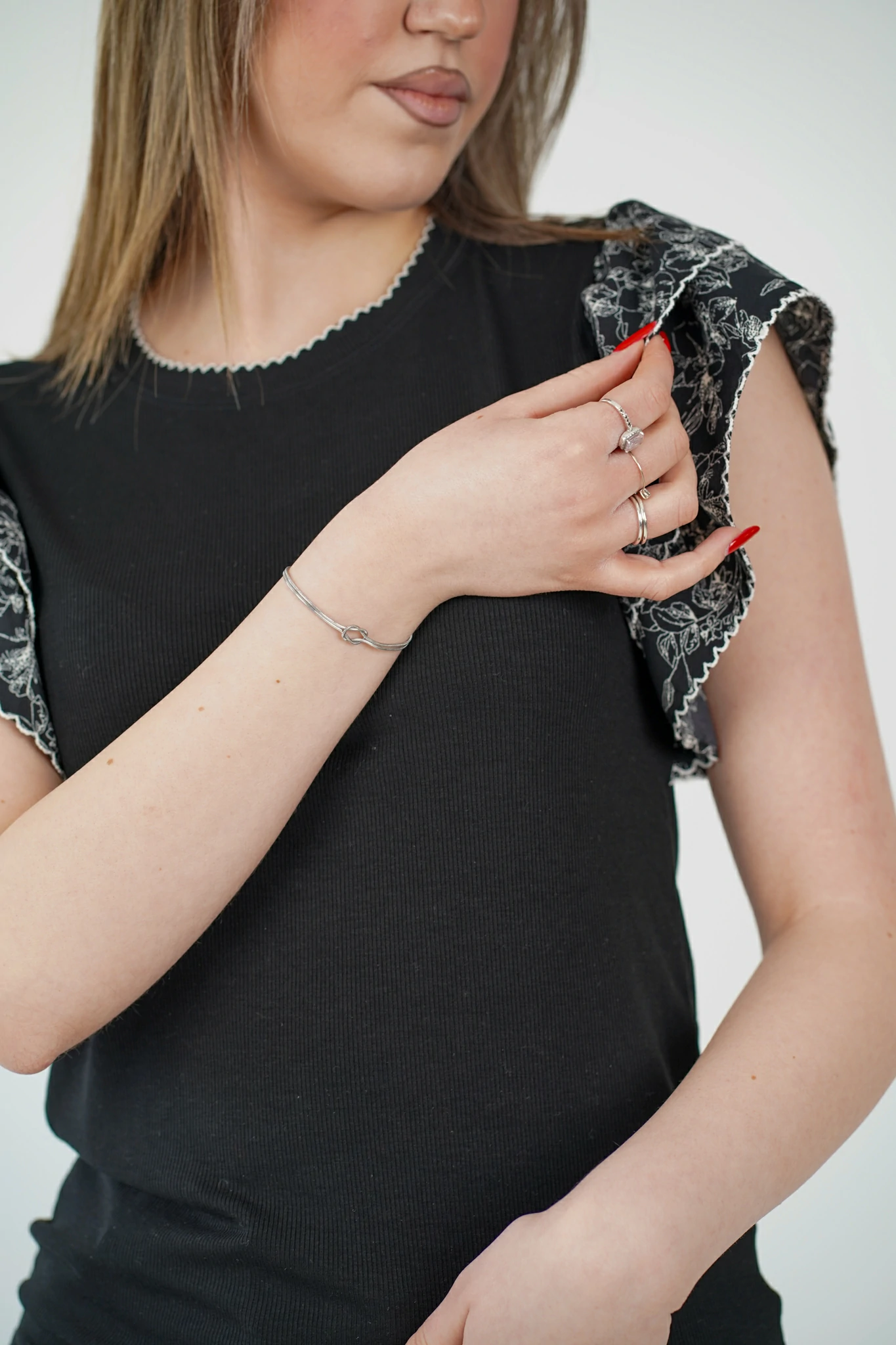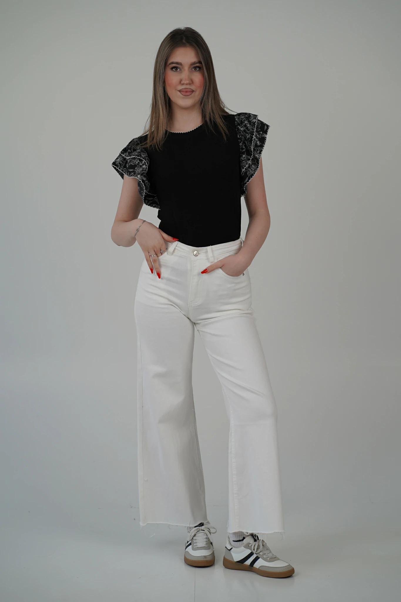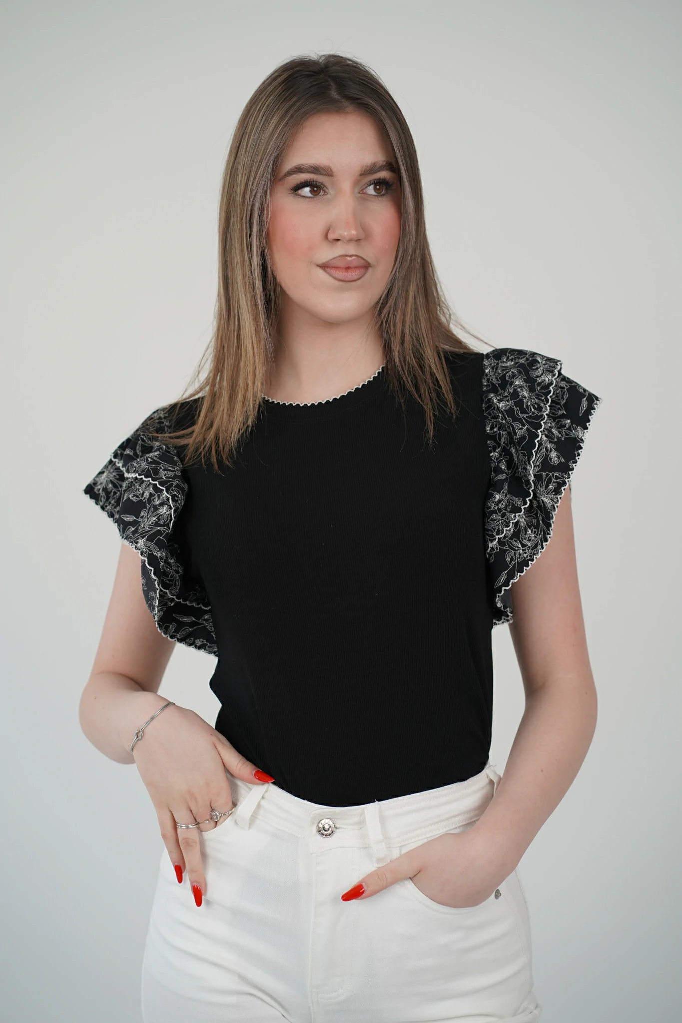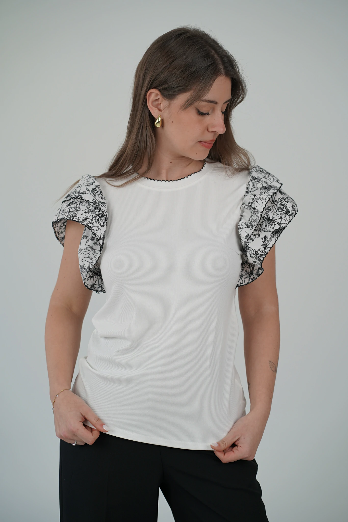 Descrizione: Un capo passe-partout che unisce femminilità e comfort, perfetto per valorizzare ogni outfit con un tocco delicato e di carattere. Le maniche corte a volant donano movimento al look. Lo scollo tondo la rende versatile e facilissima da abbinare, ideale per accompagnarti dalla mattina alla sera.