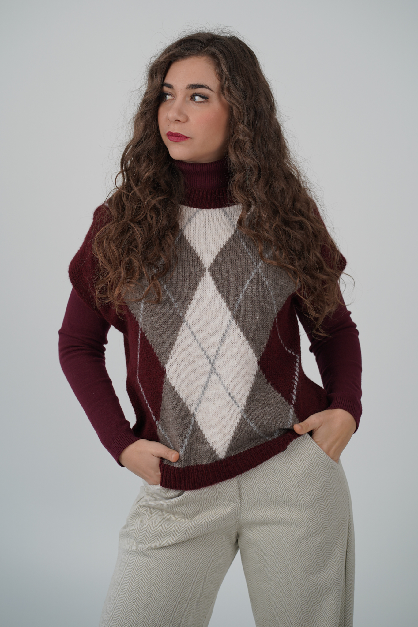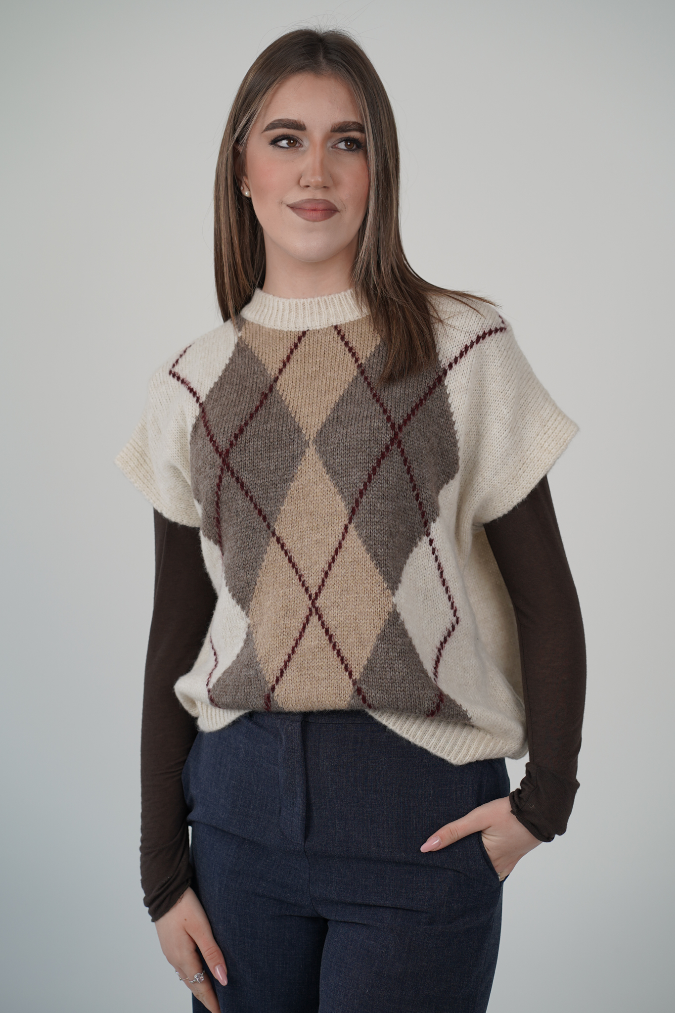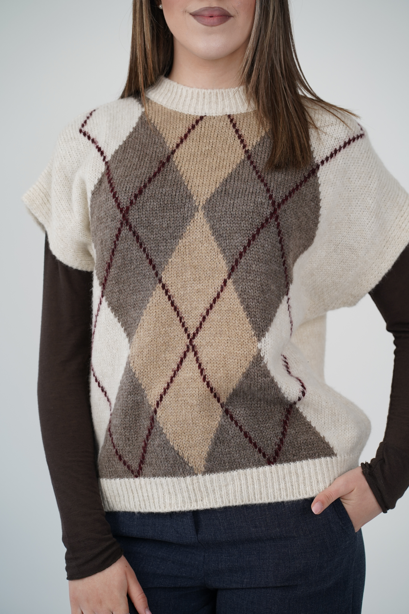 Avvolgiti nel comfort e nello stile con questo maglioncino a rombi, dal design essenziale ma ricercato