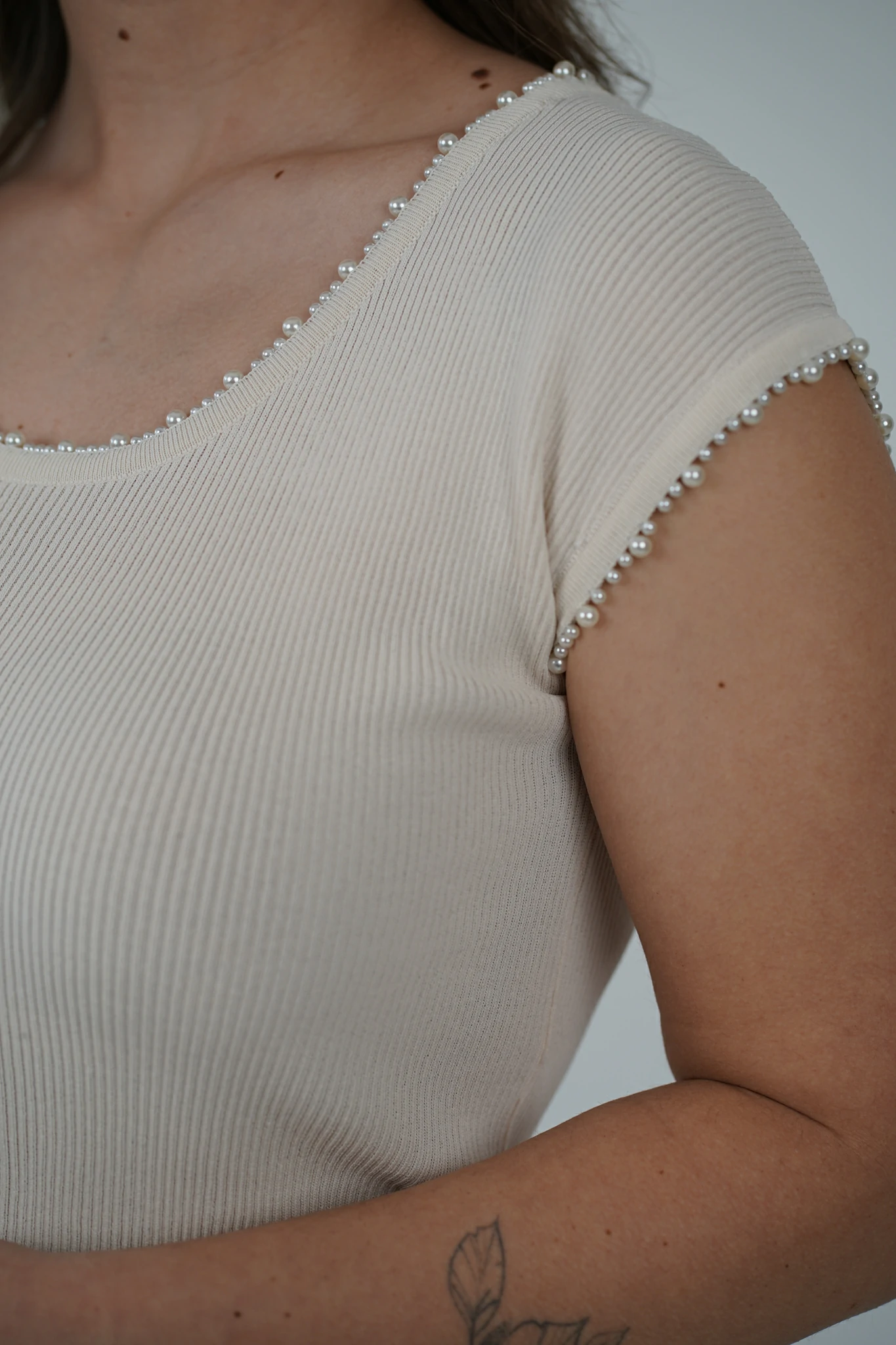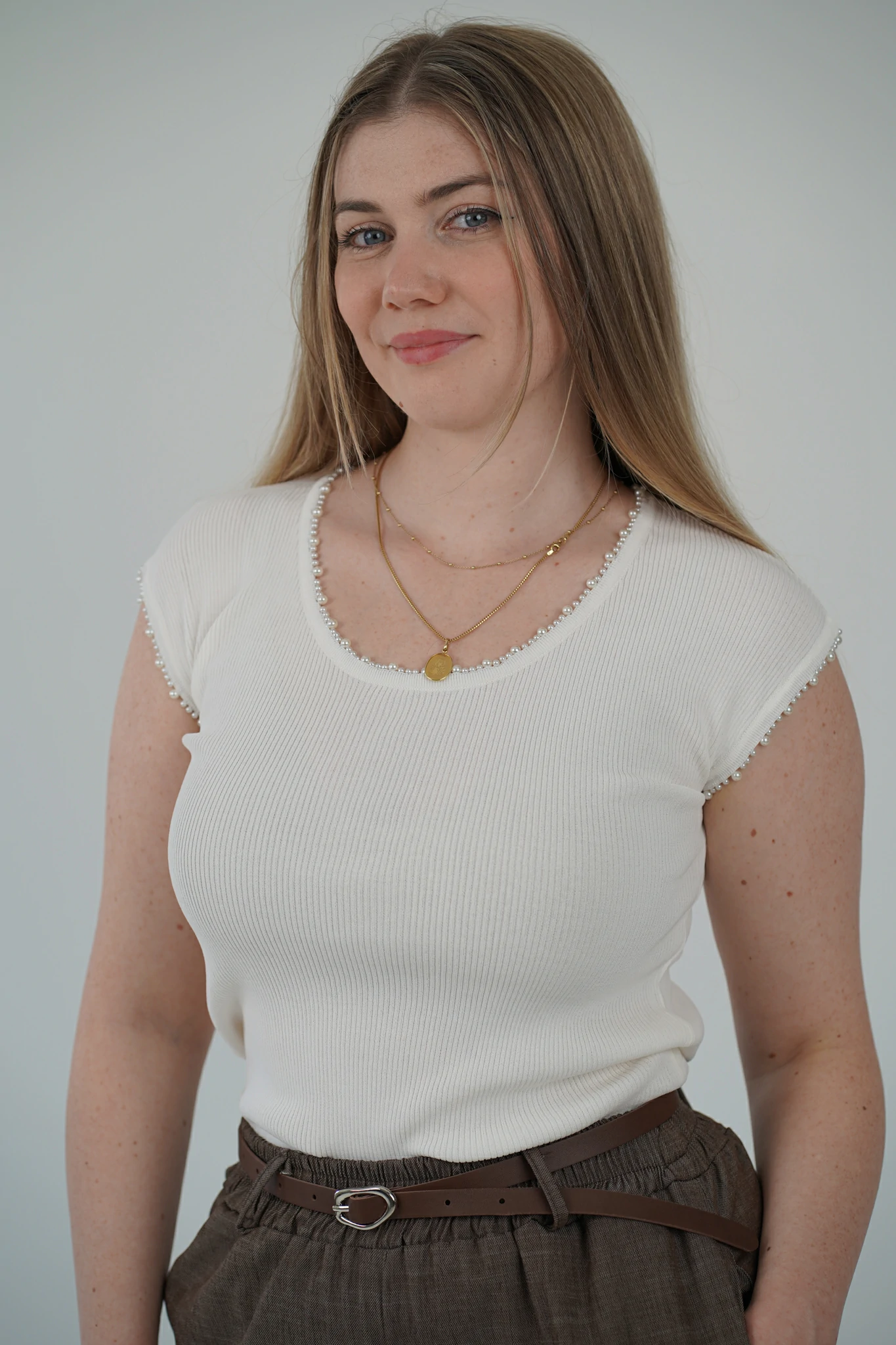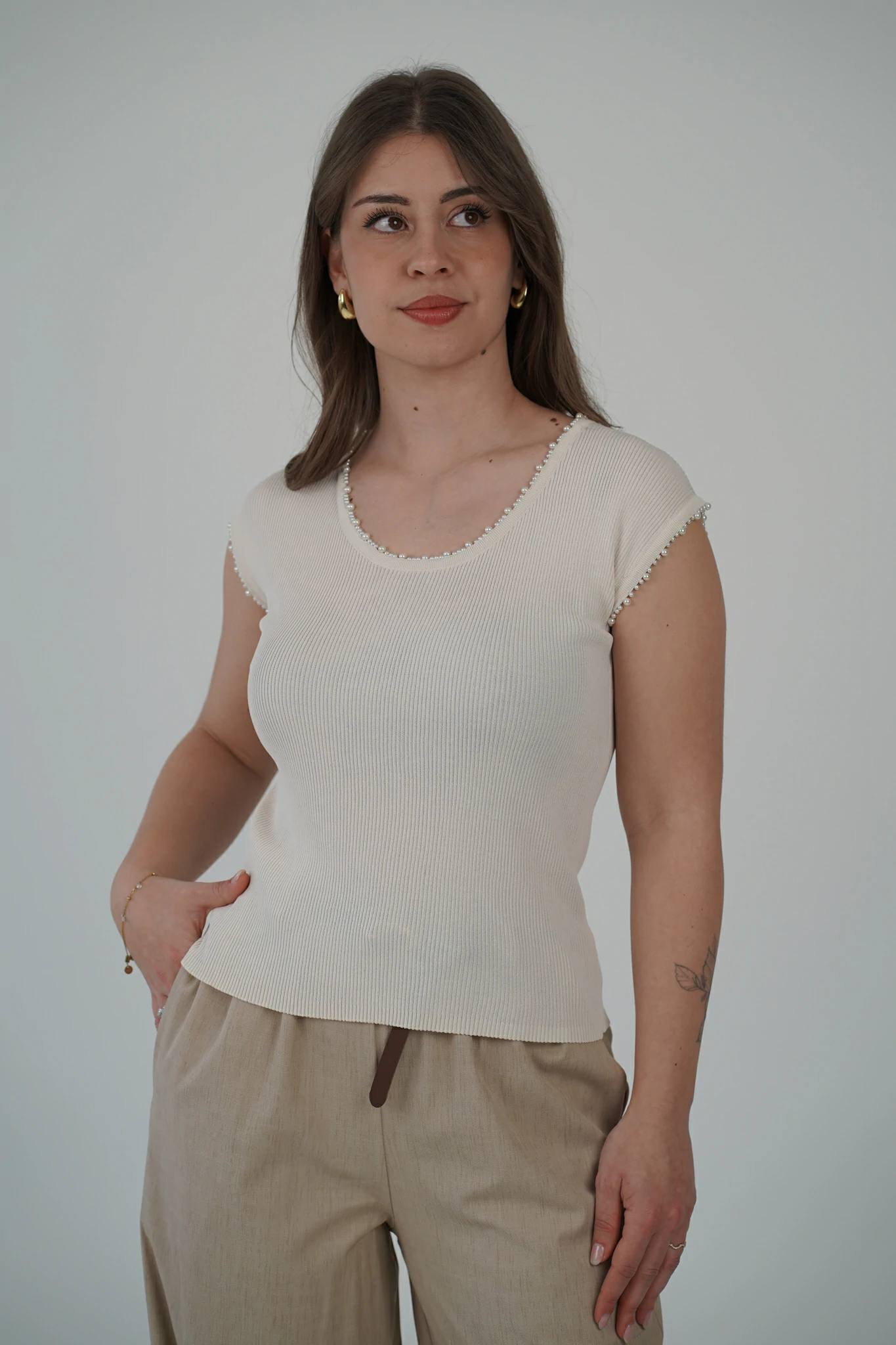 Questa maglia a costine sottili avvolge la silhouette con delicatezza, mentre le piccole perline su girocollo e giromanica aggiungono un tocco raffinato e femminile, perfetto per elevare anche il look più semplice.