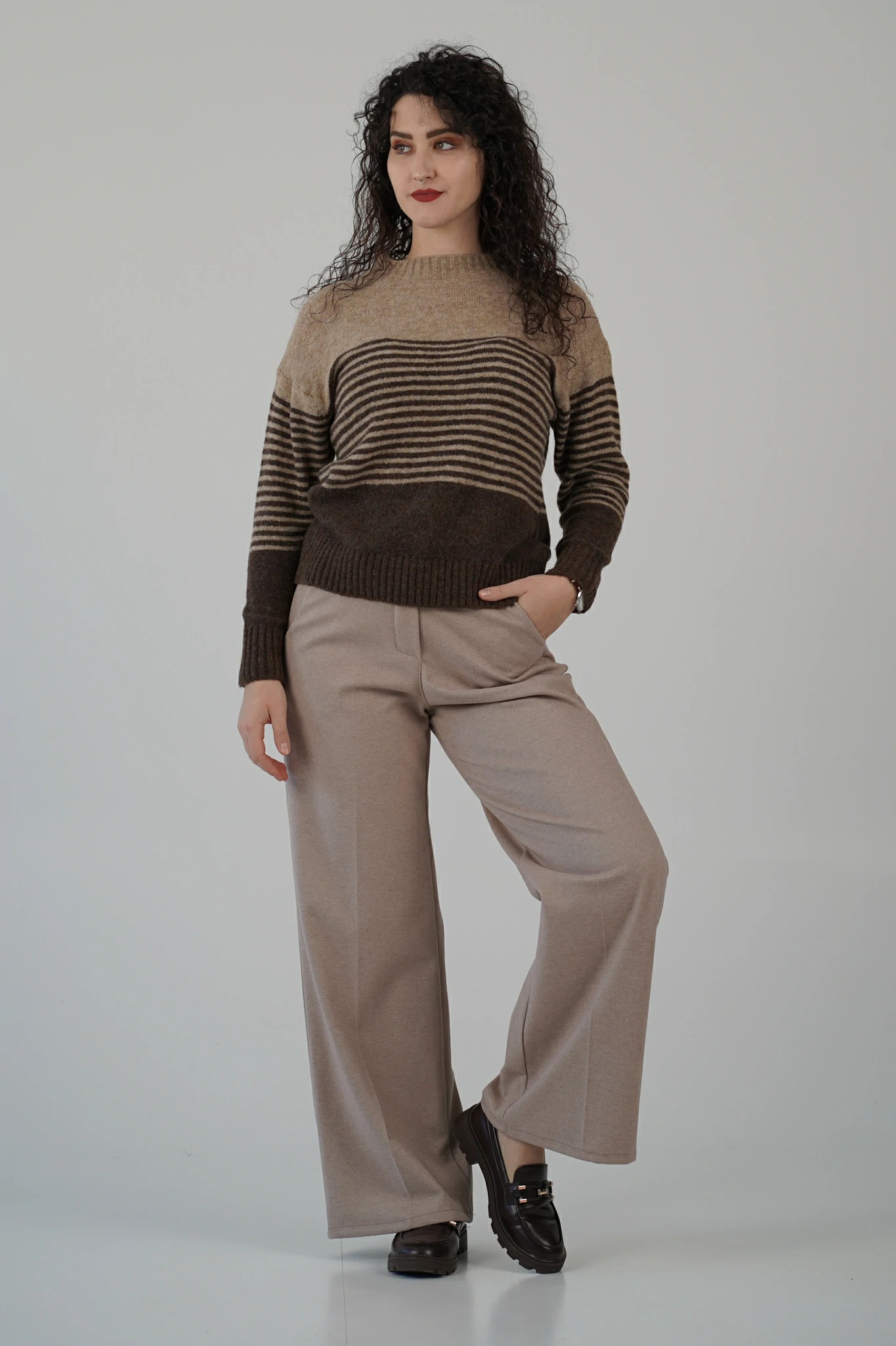 Con pantaloni palazzo e mocassini per un look chic da giorno