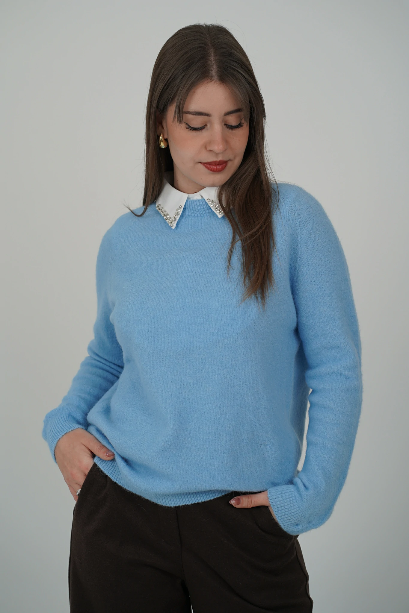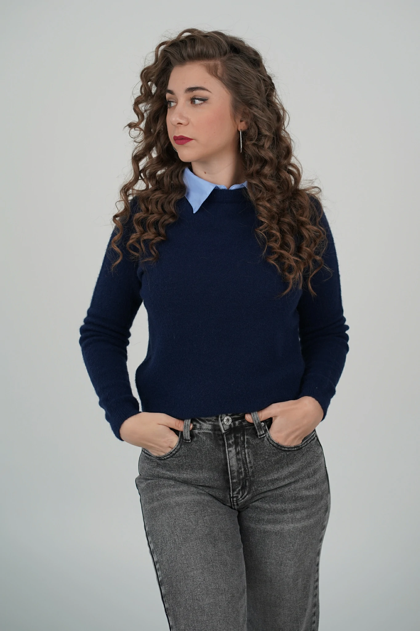Lo scollo tondo le dona un’aria semplice e raffinata, mentre la texture mélange aggiunge un tocco delicato e romantico al tuo outfit ✨