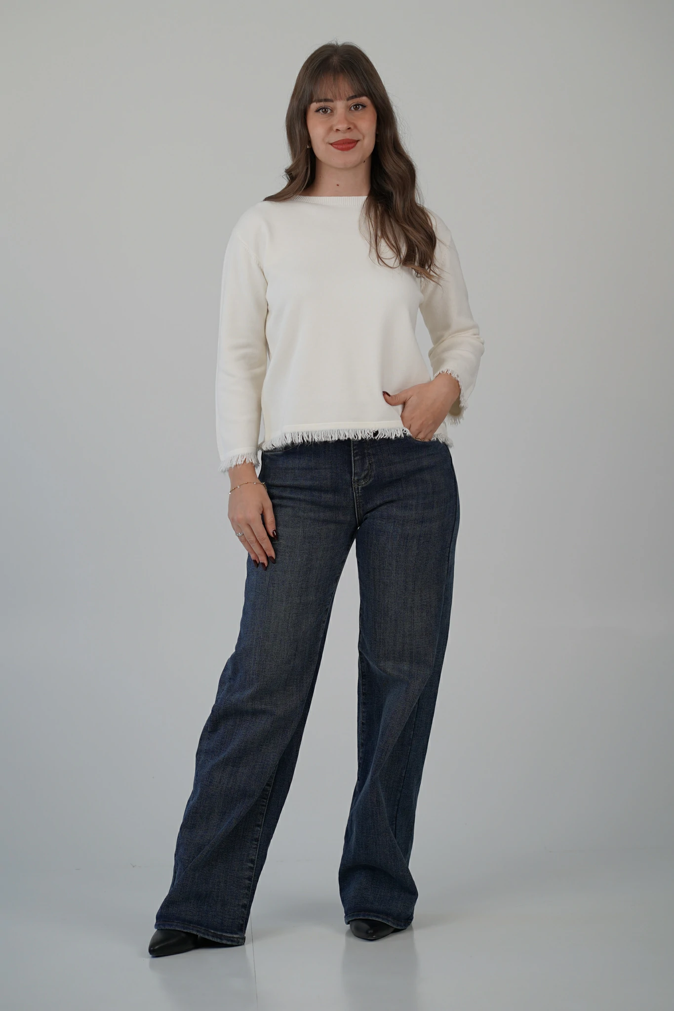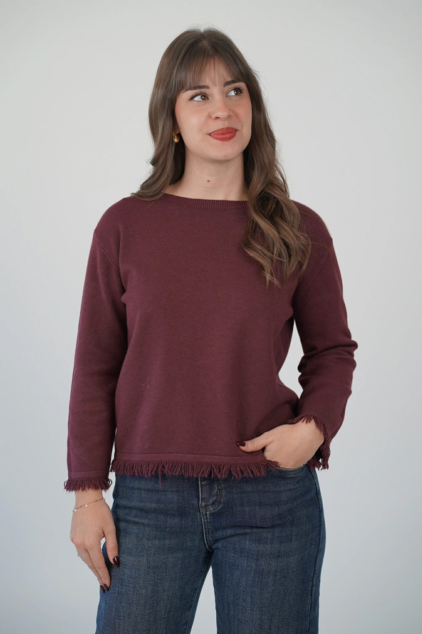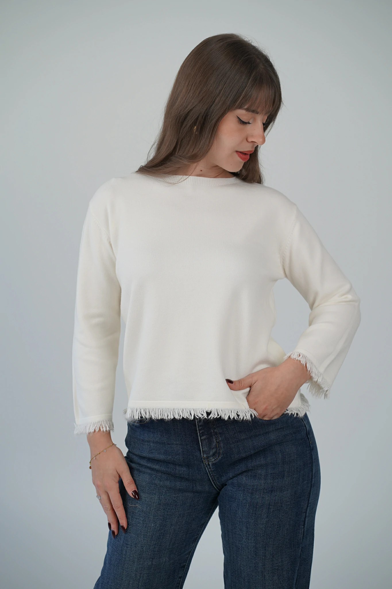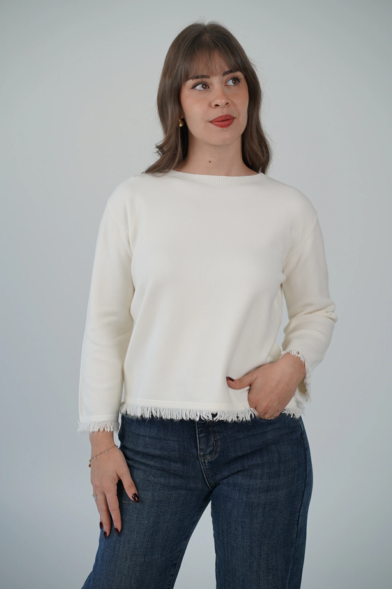 Descrizione: Maglioncino con scollo a barchetta e dettagli sfrangiati