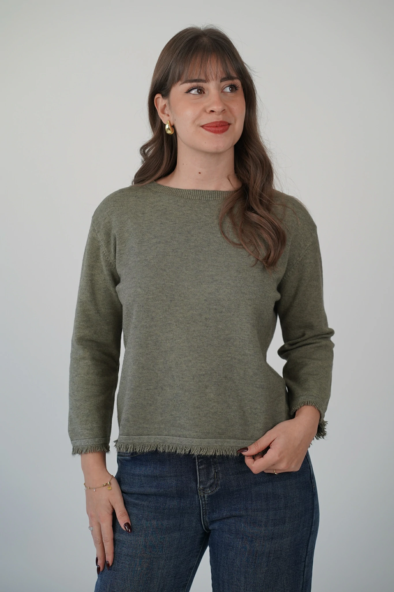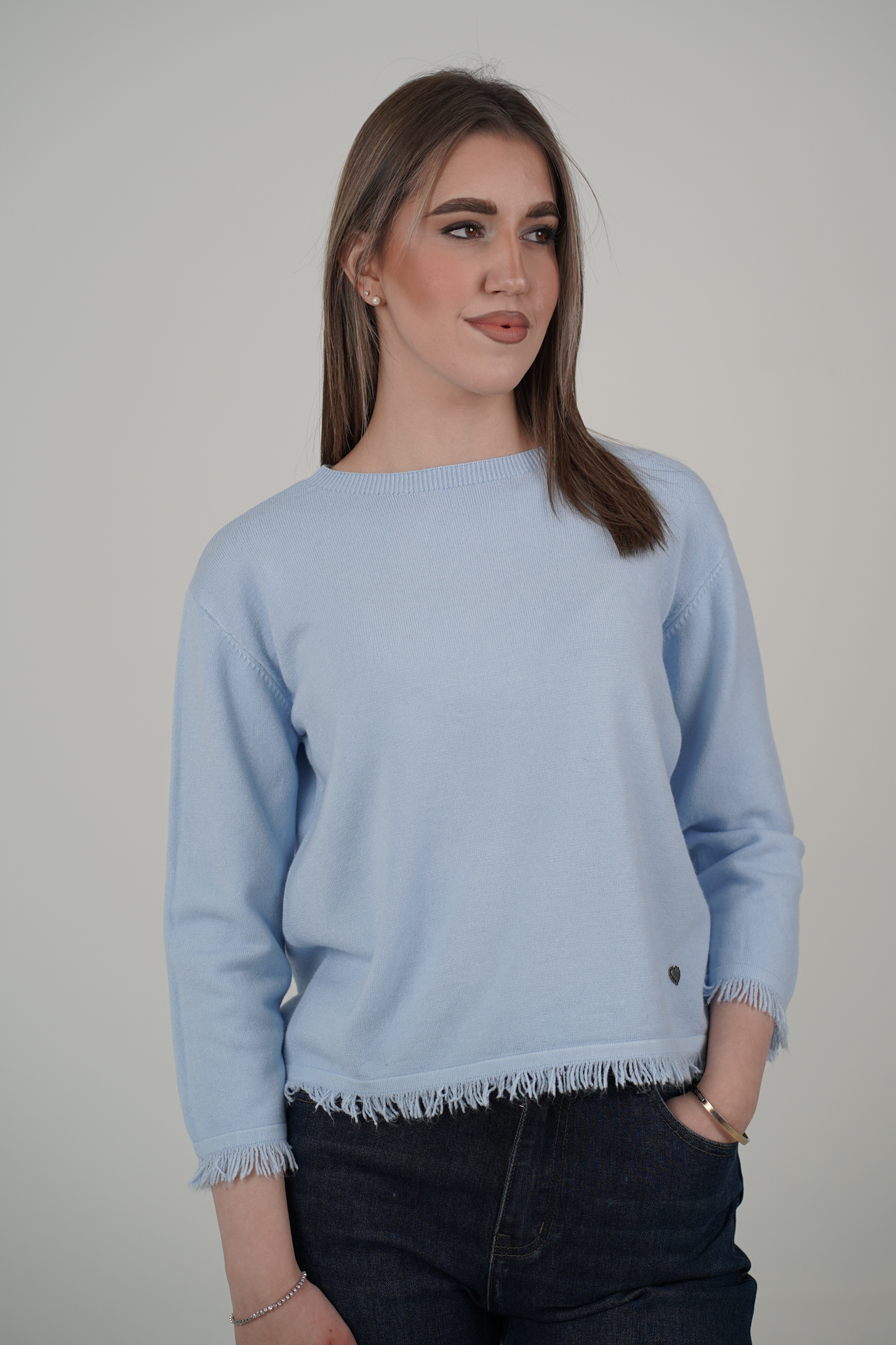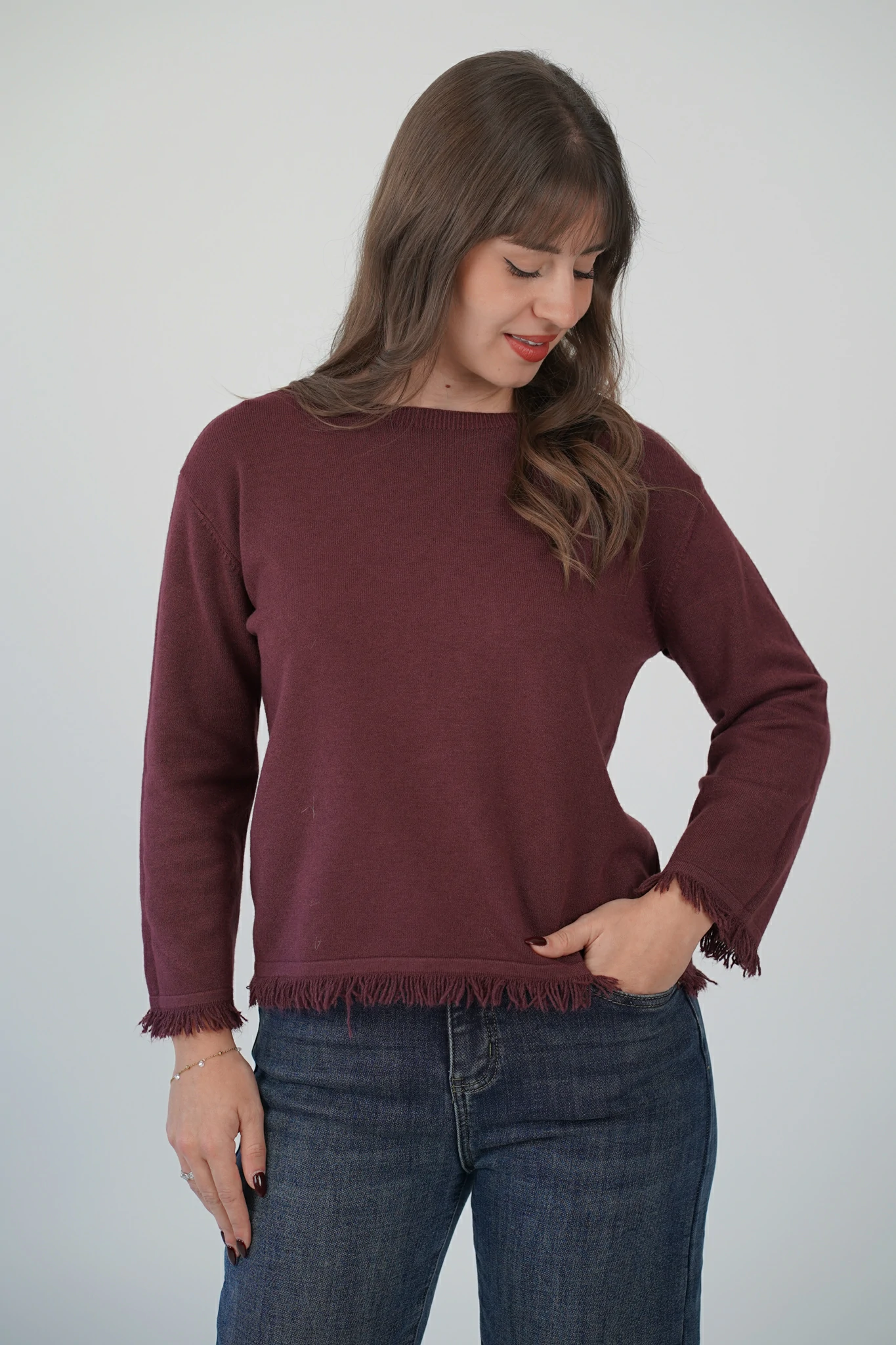 Descrizione: Maglioncino con scollo a barchetta e dettagli sfrangiati