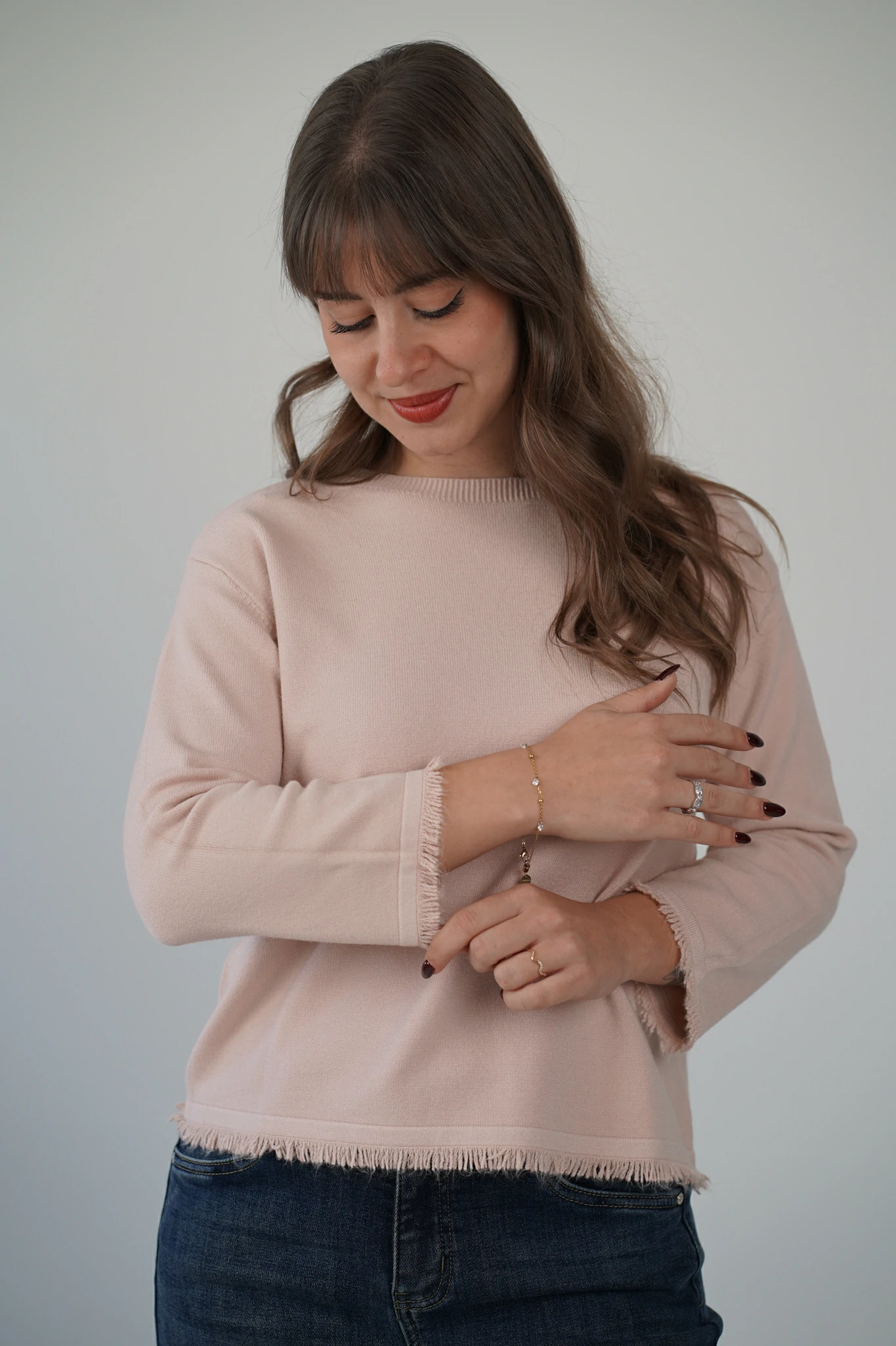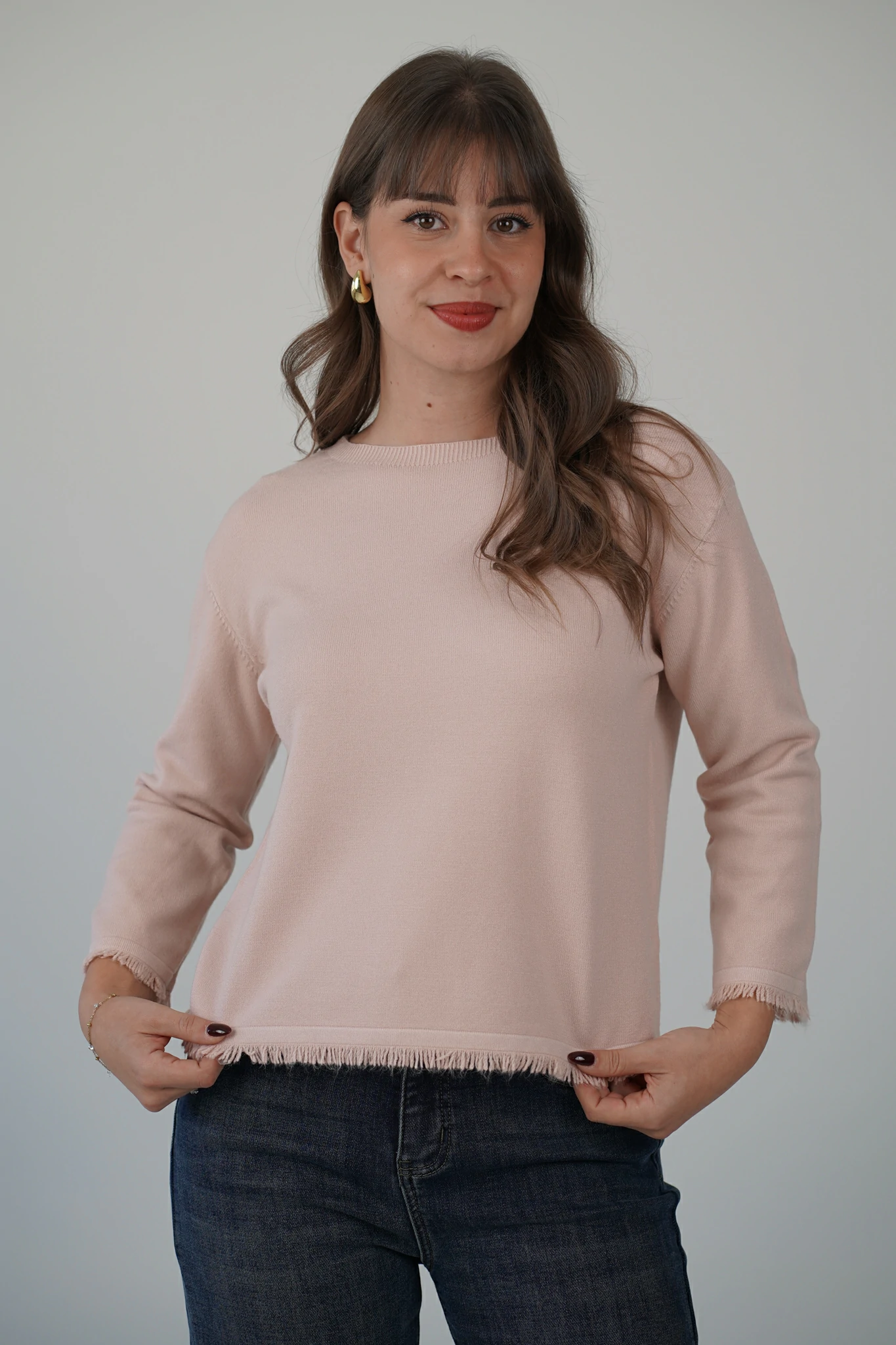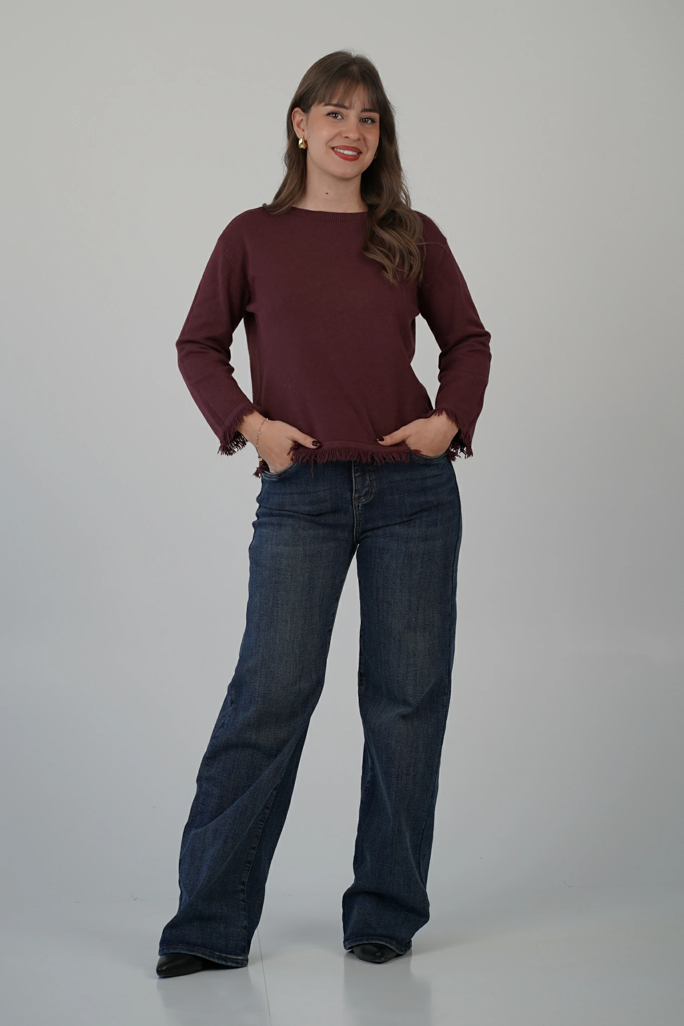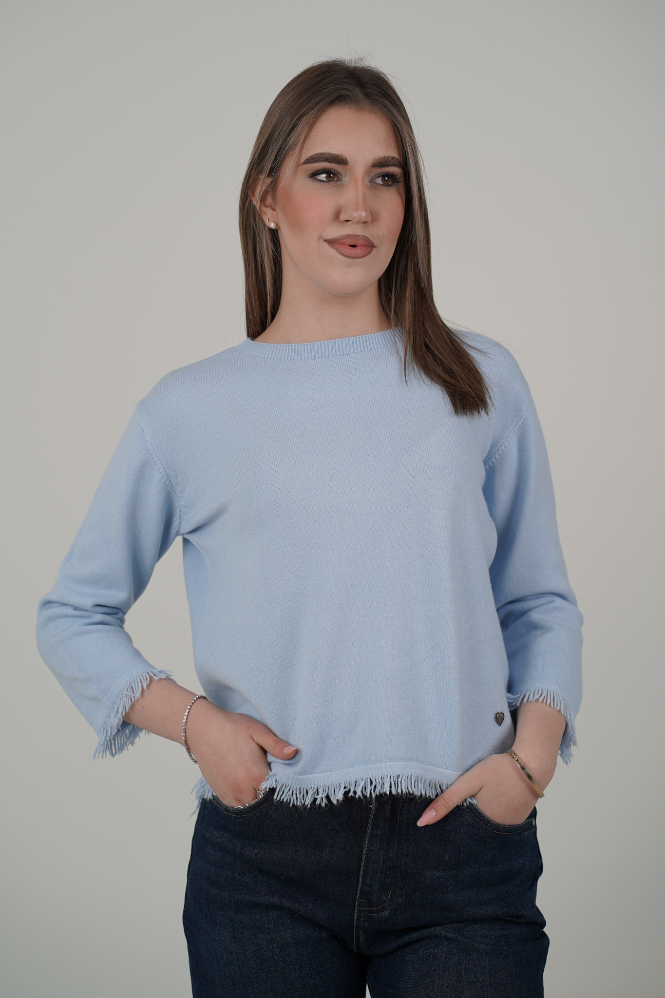 Descrizione: Maglioncino con scollo a barchetta e dettagli sfrangiati